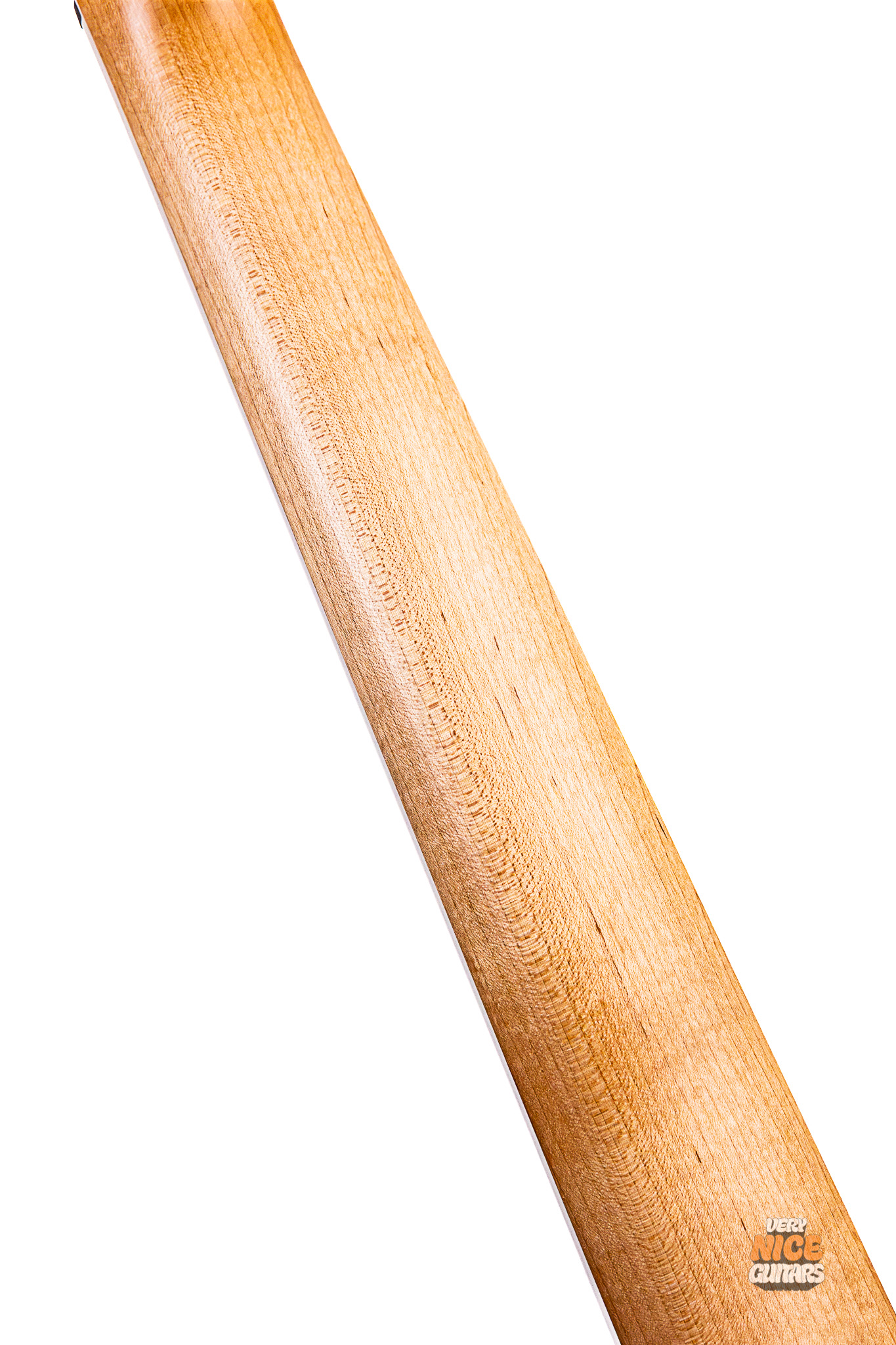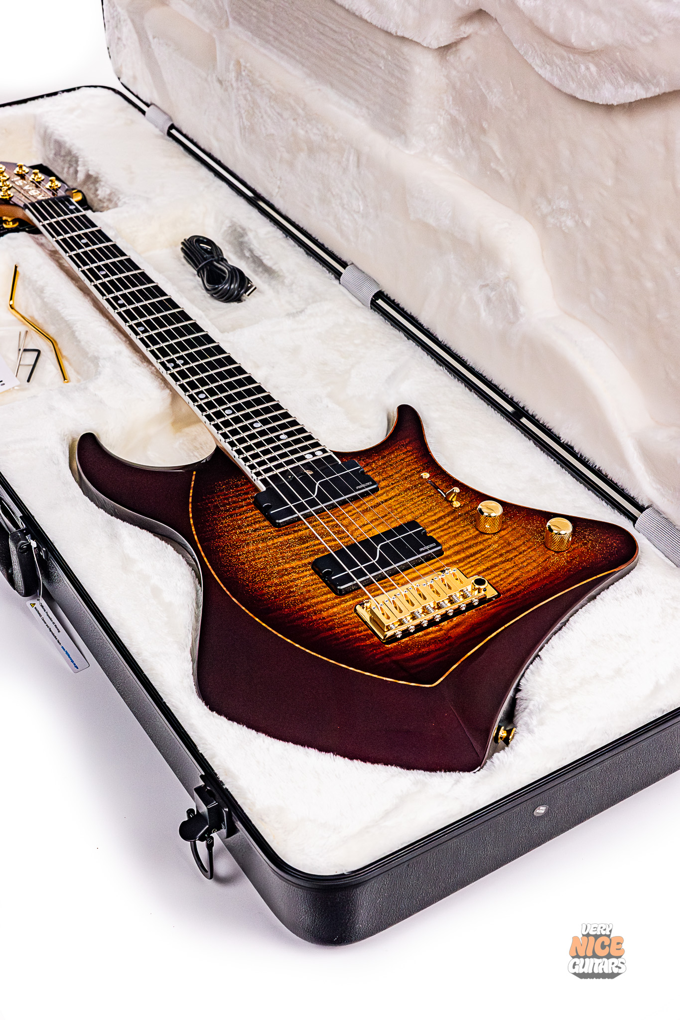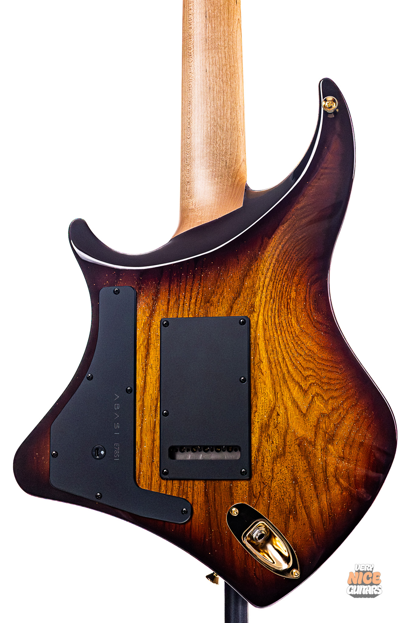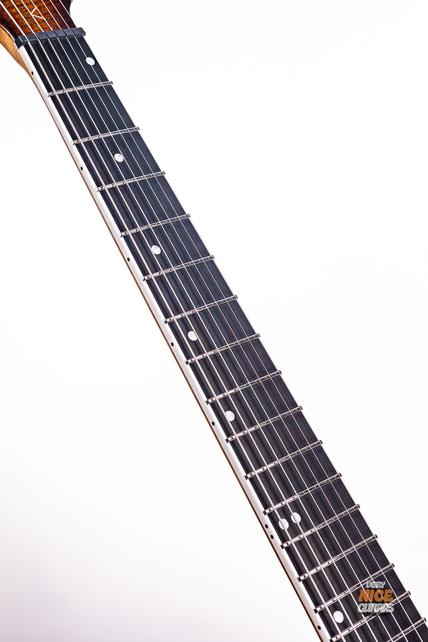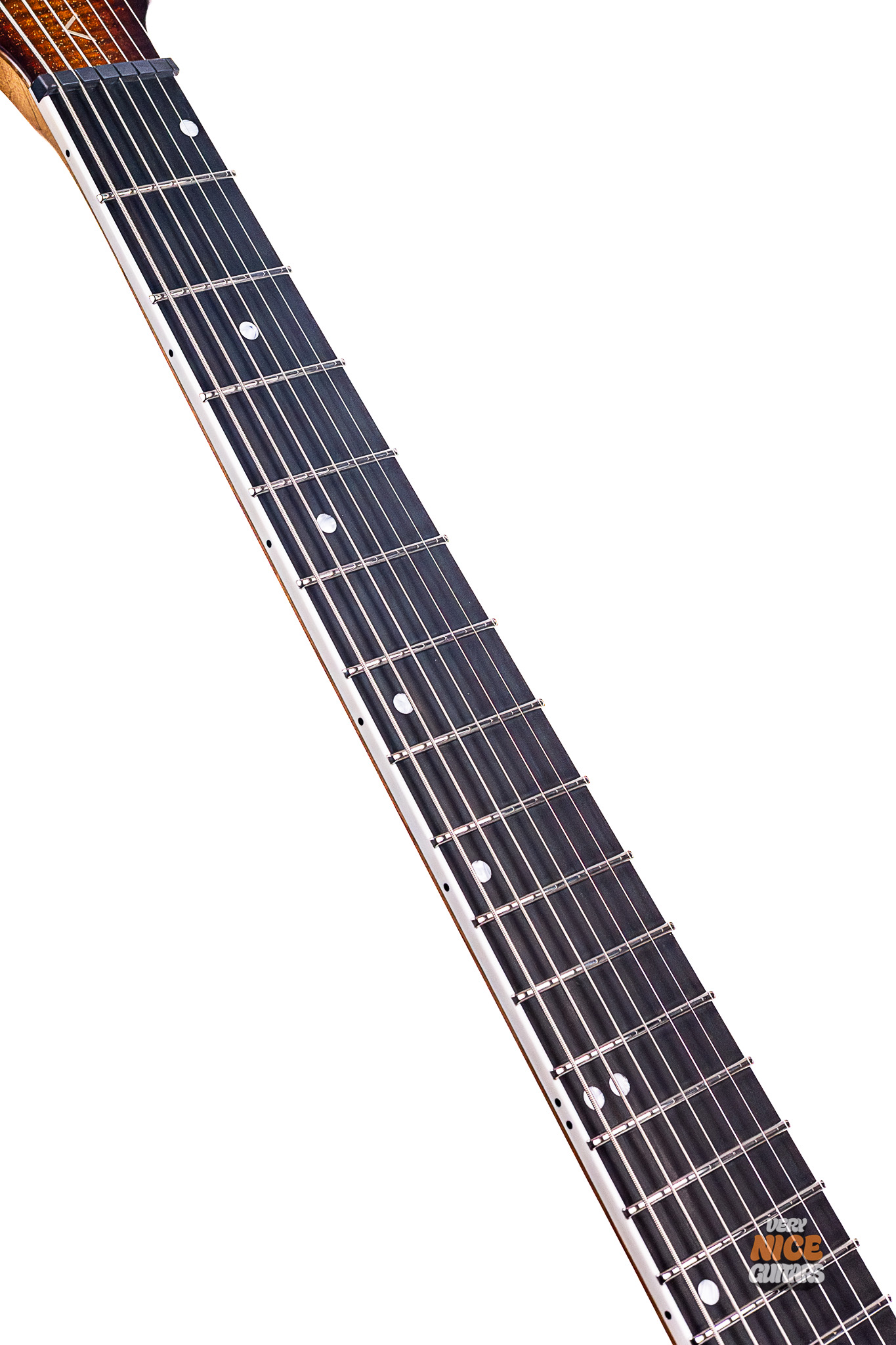 The guitar features a set-neck construction with a roasted swamp ash body and a flame maple top with natural binding. Each piece of wood is individually selected to meet specific targets for weight, resonance, and overall tonal response, resulting in a well-balanced and highly responsive instrument. A roasted maple neck with Abasi’s Oviform +- profile is paired with an ebony fingerboard with white binding. The 25.5” scale, 20” radius, and Jescar stainless steel frets provide a fast, flat playing surface suited to modern, technical styles. Hardware includes a Gotoh 510 tremolo and Hipshot locking tuners, offering smooth operation and reliable tuning stability. Electronics are handled by a set of Fishman Fluence Tosin Abasi pickups in the neck and bridge, delivering high clarity, extended frequency response, and multiple voicings. Controls include master volume, master tone, and a 5-way selector switch for a wide range of tonal options.