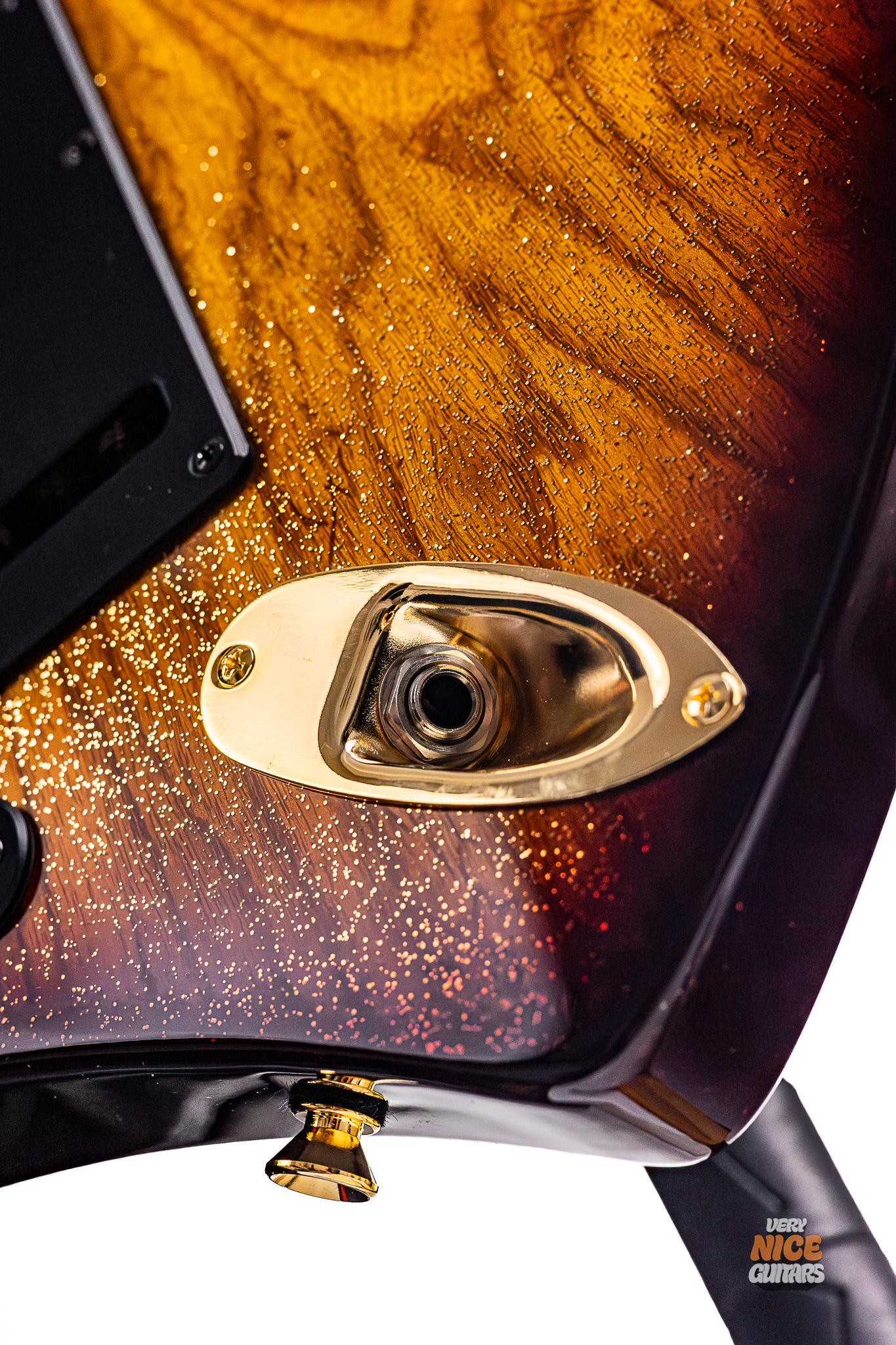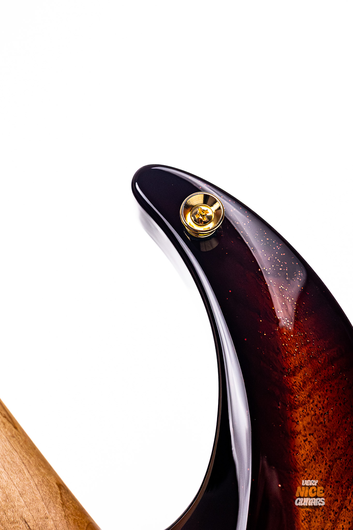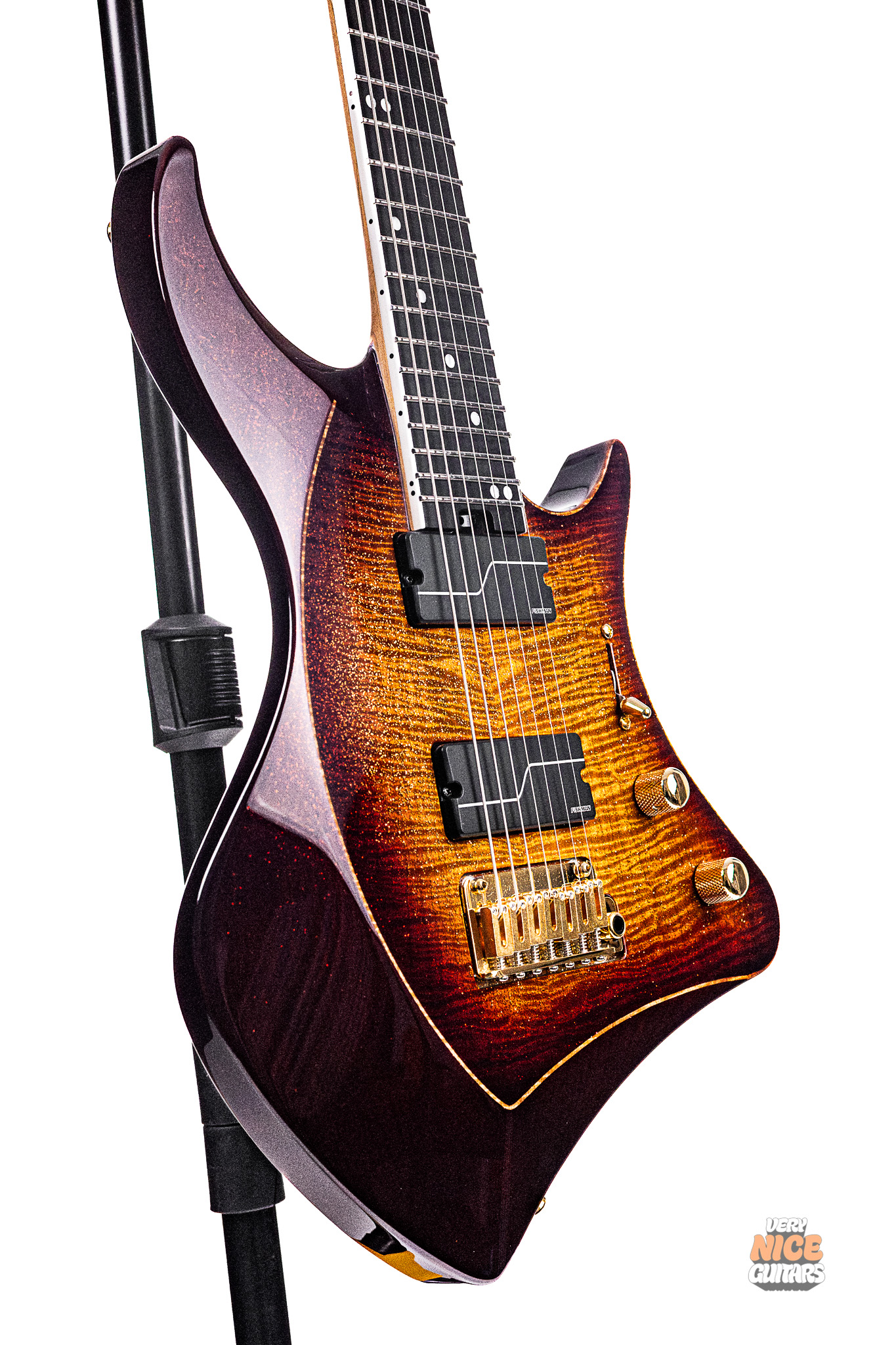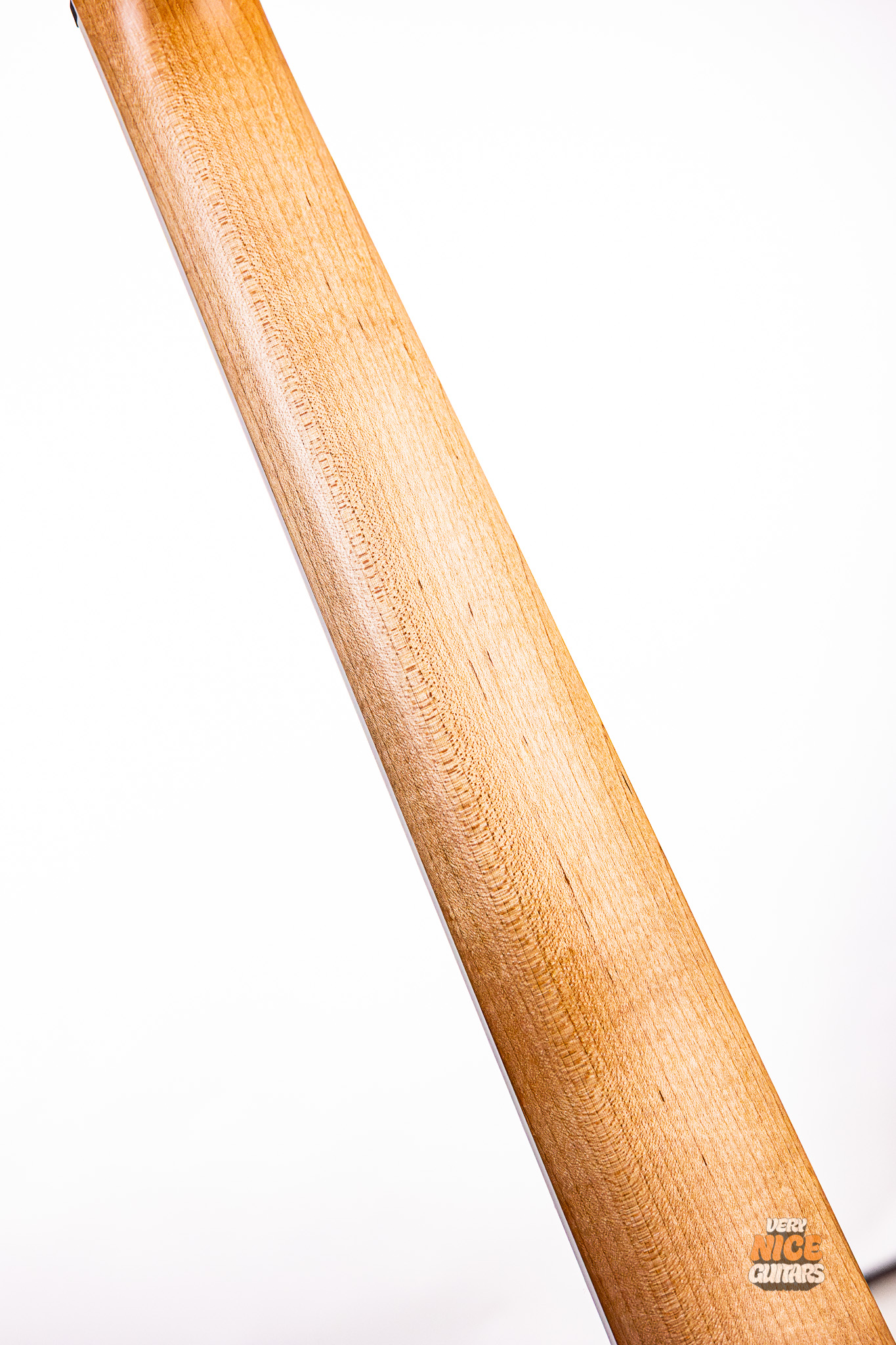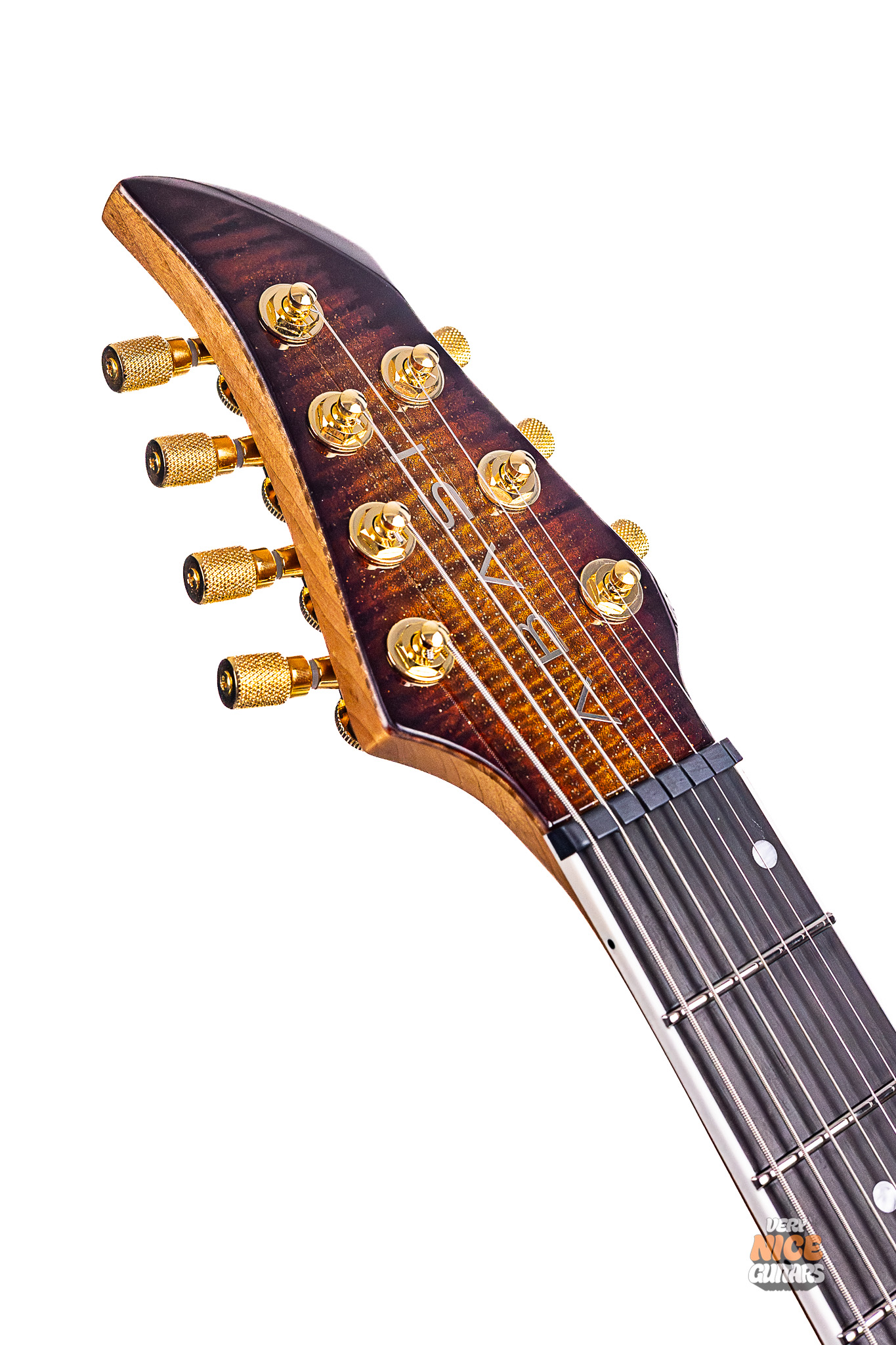 The guitar features a set-neck construction with a roasted swamp ash body and a flame maple top with natural binding. Each piece of wood is individually selected to meet specific targets for weight, resonance, and overall tonal response, resulting in a well-balanced and highly responsive instrument. A roasted maple neck with Abasi’s Oviform +- profile is paired with an ebony fingerboard with white binding. The 25.5” scale, 20” radius, and Jescar stainless steel frets provide a fast, flat playing surface suited to modern, technical styles. Hardware includes a Gotoh 510 tremolo and Hipshot locking tuners, offering smooth operation and reliable tuning stability. Electronics are handled by a set of Fishman Fluence Tosin Abasi pickups in the neck and bridge, delivering high clarity, extended frequency response, and multiple voicings. Controls include master volume, master tone, and a 5-way selector switch for a wide range of tonal options.