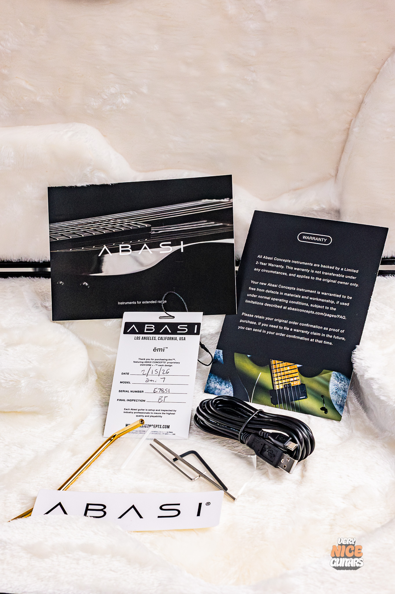 Includes: Abasi hardshell case, Fishman rechargeable battery pack, tremolo arm, Abasi sticker, warranty card, tags.