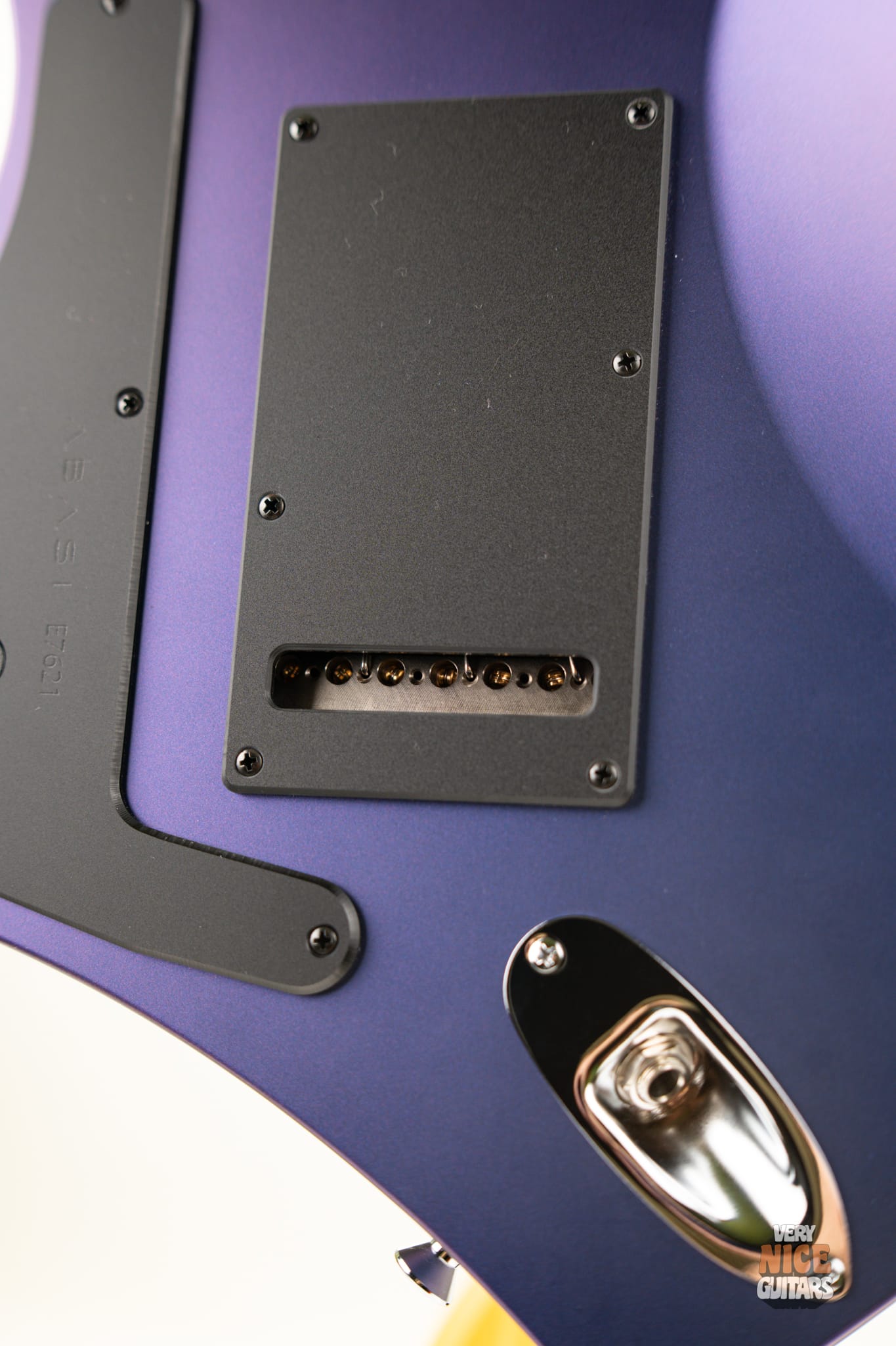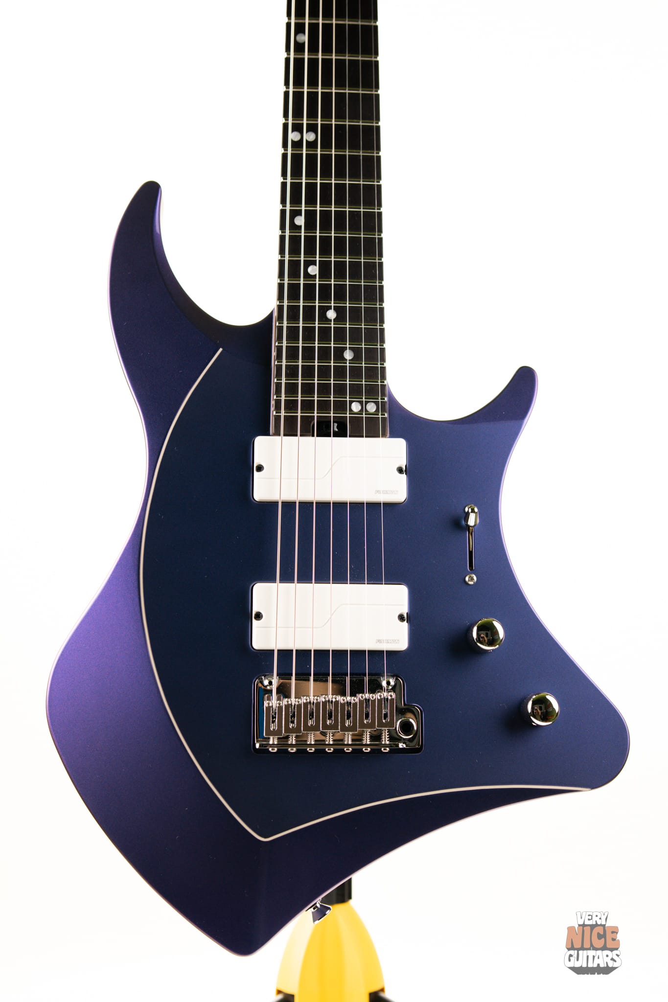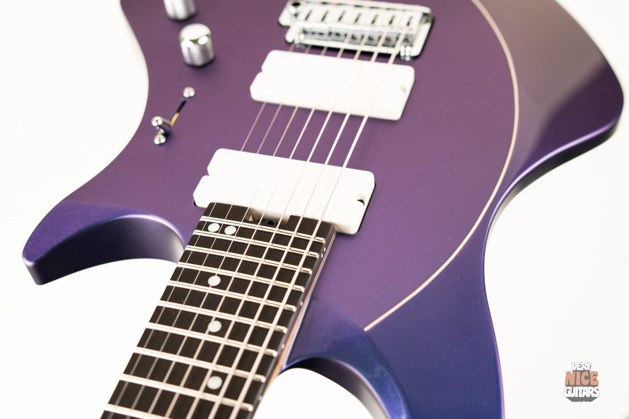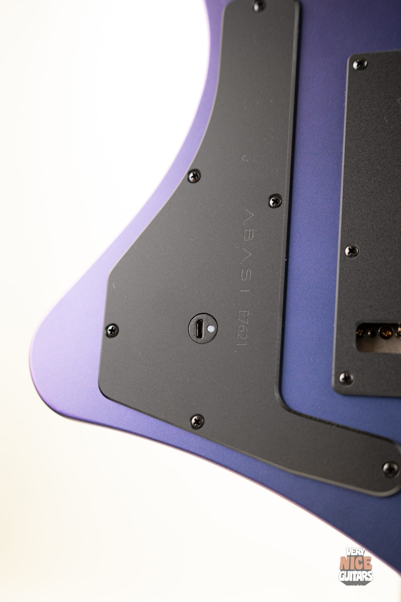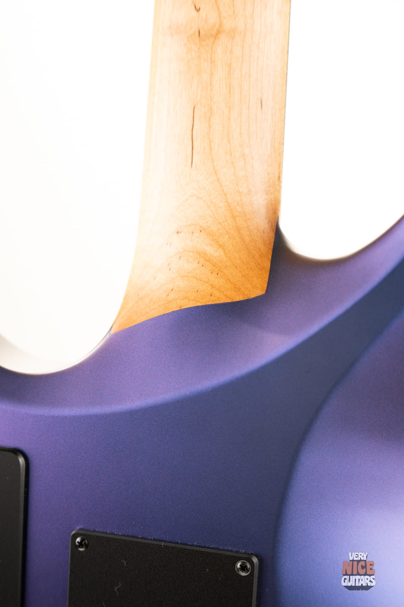 The neck features the signature OVIFORM+– profile – an asymmetrical, slightly teardrop-shaped carve that supports natural hand positioning and reduces fatigue across extended playing sessions. Unlike the multi-scale and individual bridge setup found on some Abasi models, the EMI 7 uses a standard scale length and comes equipped with a Gotoh 510 floating tremolo. Electronics include a set of Fishman Fluence Tosin Abasi humbuckers, offering multiple voicings and a wide tonal range. Hardware includes a GraphTech nut, Hipshot tuners, and Jescar stainless steel frets. This beast features a two-sheen “Dat PVRP!” finish, which shifts between deep blue and purple hues depending on the angle and lighting.