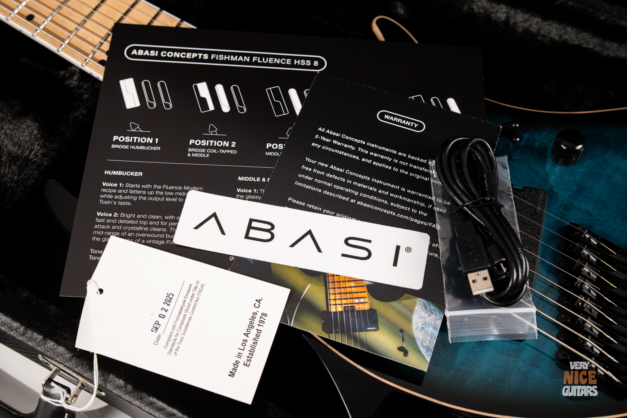 Includes: Original Abasi Hardcase, Full case candy, Fishman charger cable, Truss rod adjustment tool, Allen wrench, Sticker.
