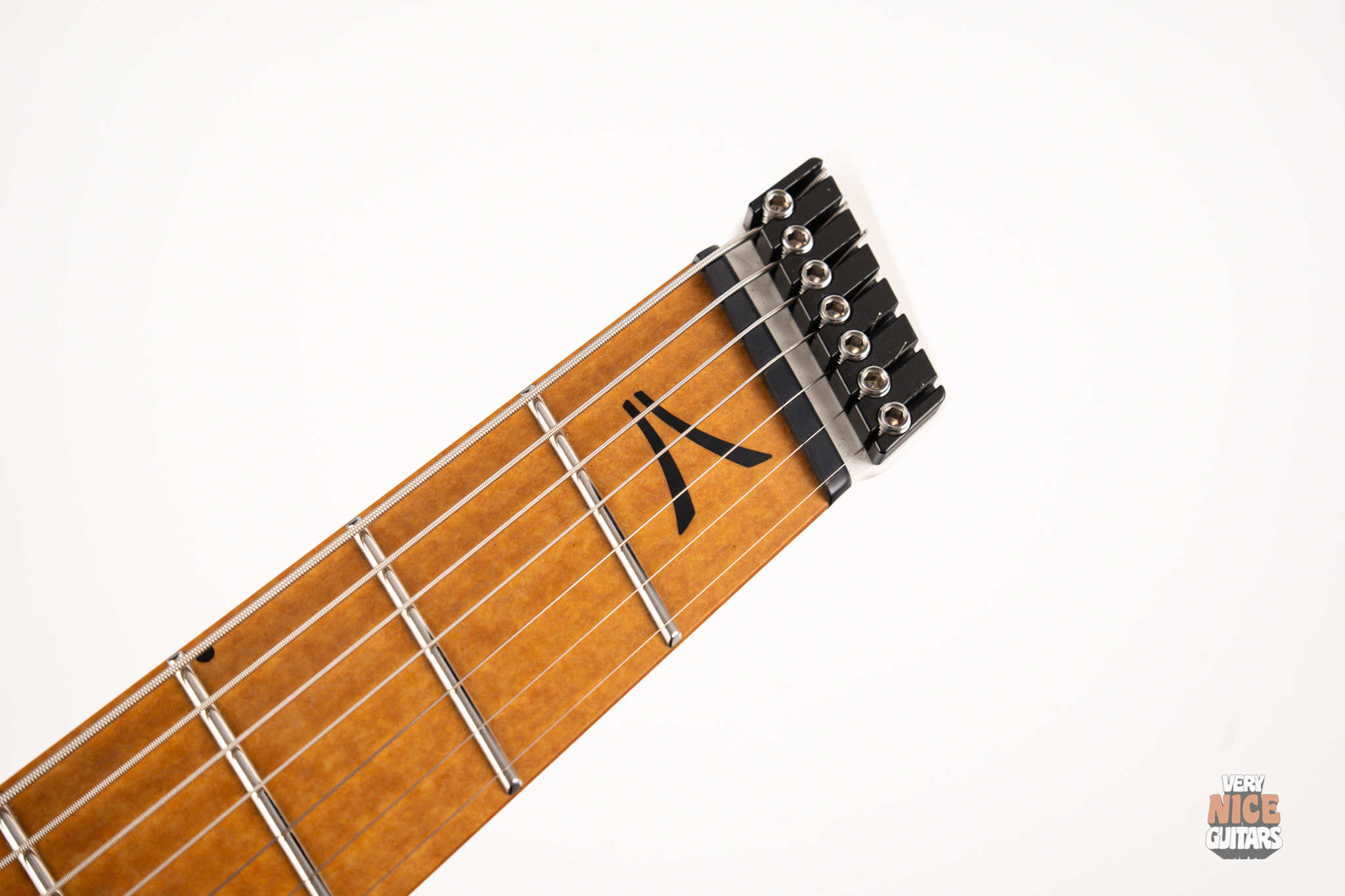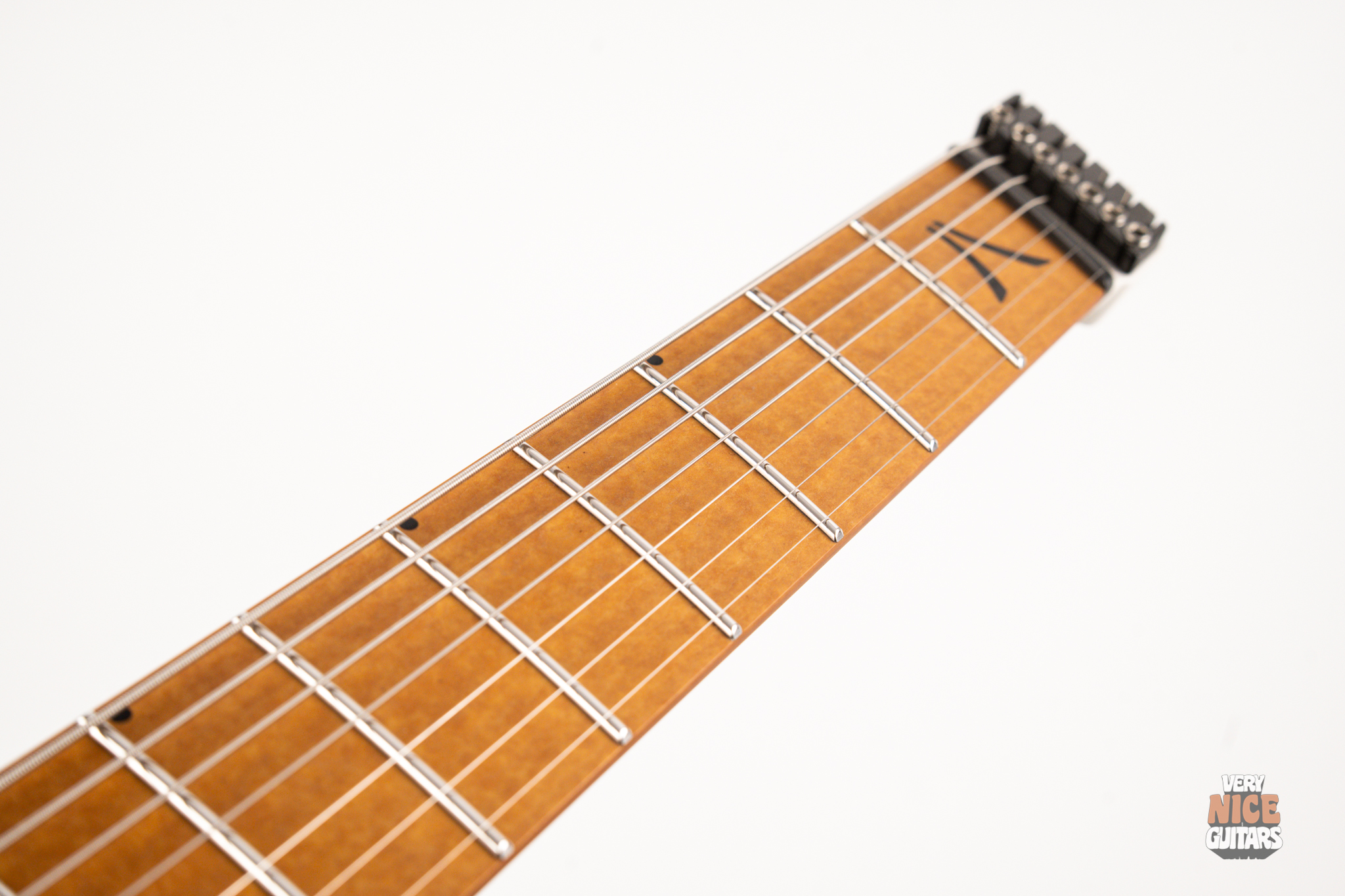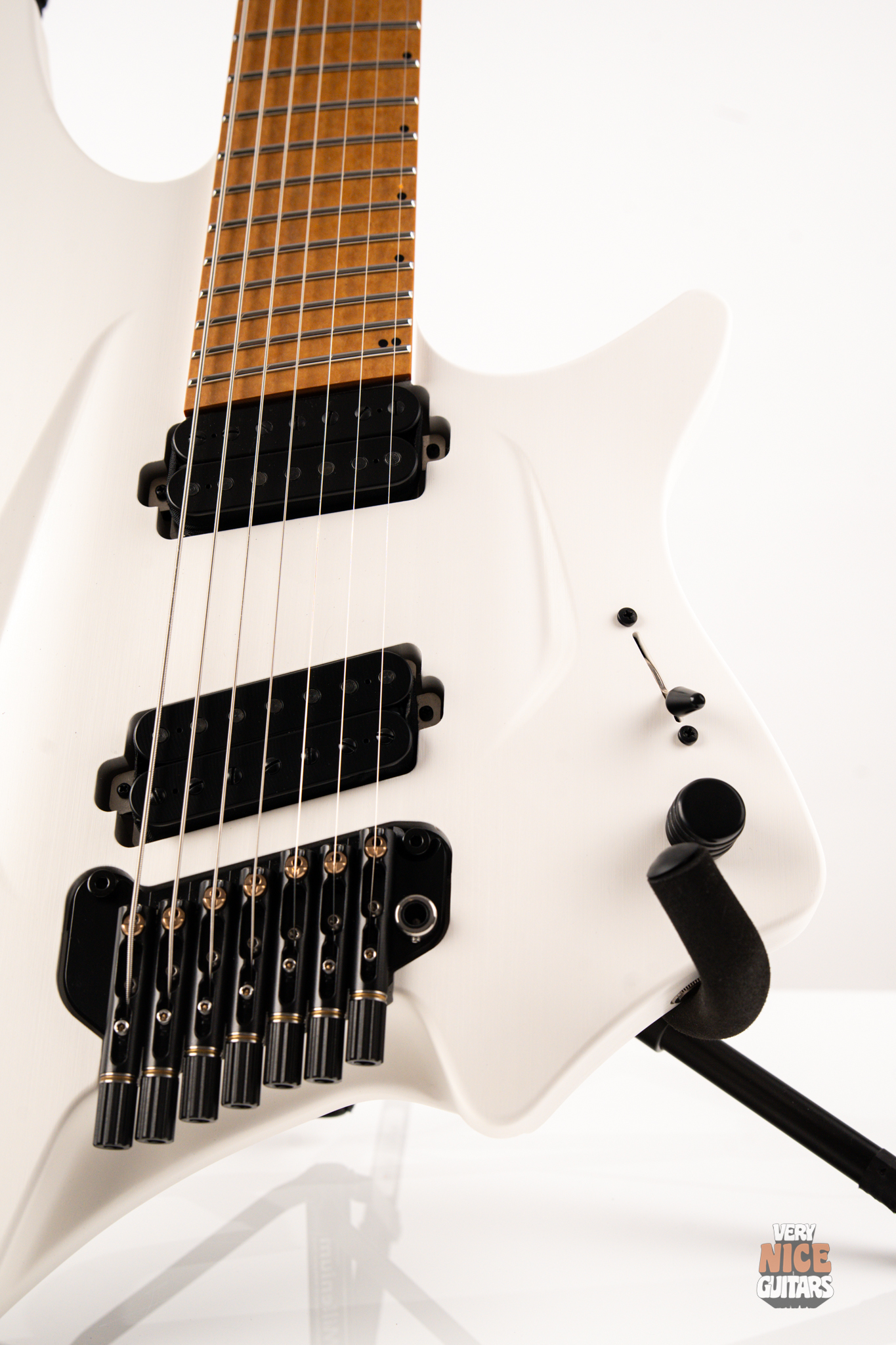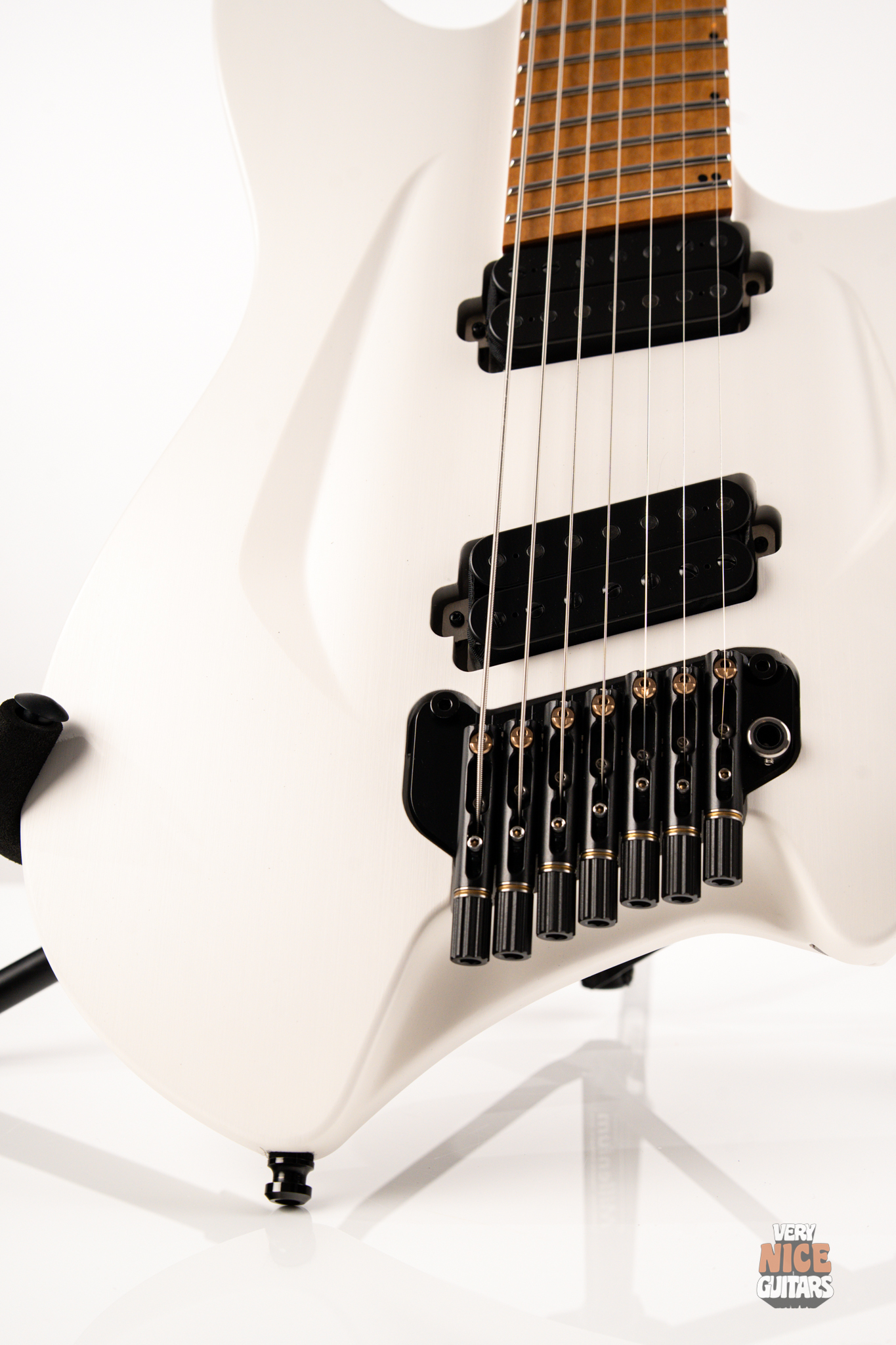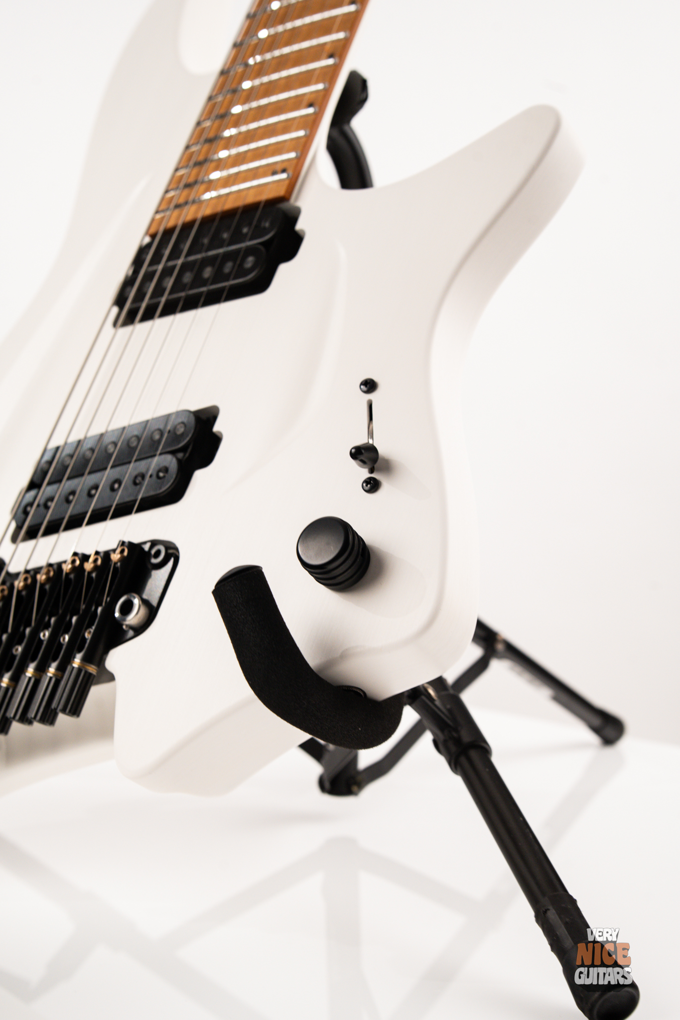 This 7-string is made of the sophisticated Arium composite material developed by Arisitides themselves for the maximum tuning stability, no matter the conditions. The fingerboard of this beast is light richlite with a compound 12”-16” radius, fitted with 24 Jescar stainless steel frets.This particular headless features Aristides designed and made tremolo system that stays perfectly in tune even after heavy use. This guitar was also equipped with a set of great sounding Bare Knuckle pickups, the Nailbomb and VHII. For controls you get a 5 way selector switch and a single volume knob.