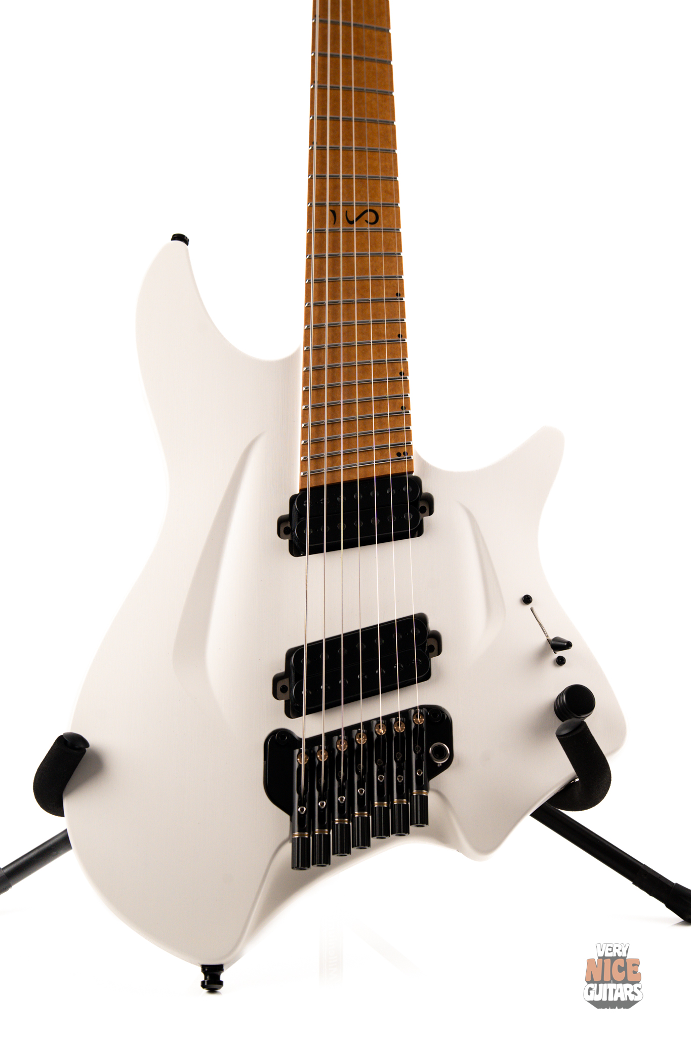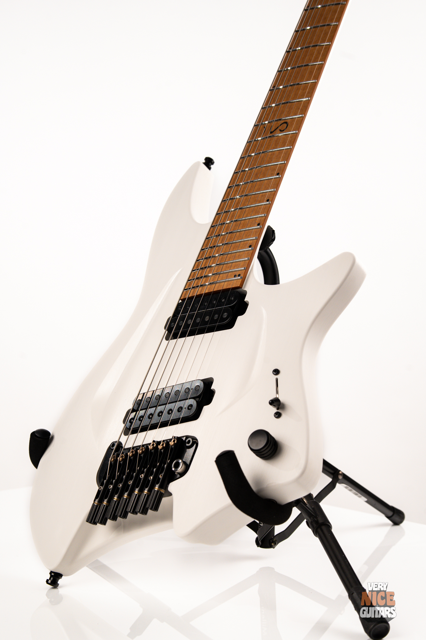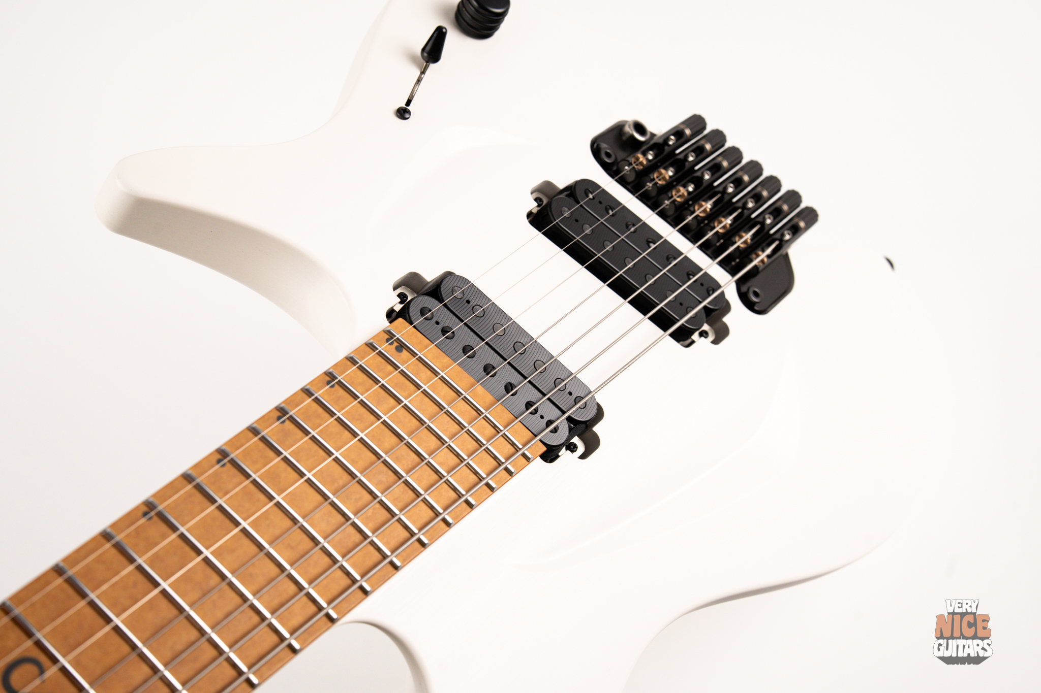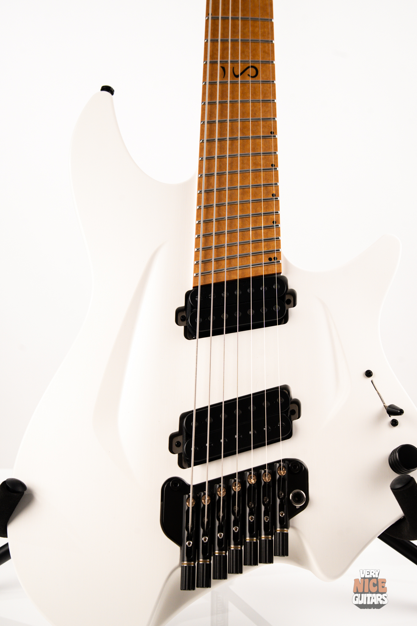 This 7-string is made of the sophisticated Arium composite material developed by Arisitides themselves for the maximum tuning stability, no matter the conditions. The fingerboard of this beast is light richlite with a compound 12”-16” radius, fitted with 24 Jescar stainless steel frets.This particular headless features Aristides designed and made tremolo system that stays perfectly in tune even after heavy use. This guitar was also equipped with a set of great sounding Bare Knuckle pickups, the Nailbomb and VHII. For controls you get a 5 way selector switch and a single volume knob.