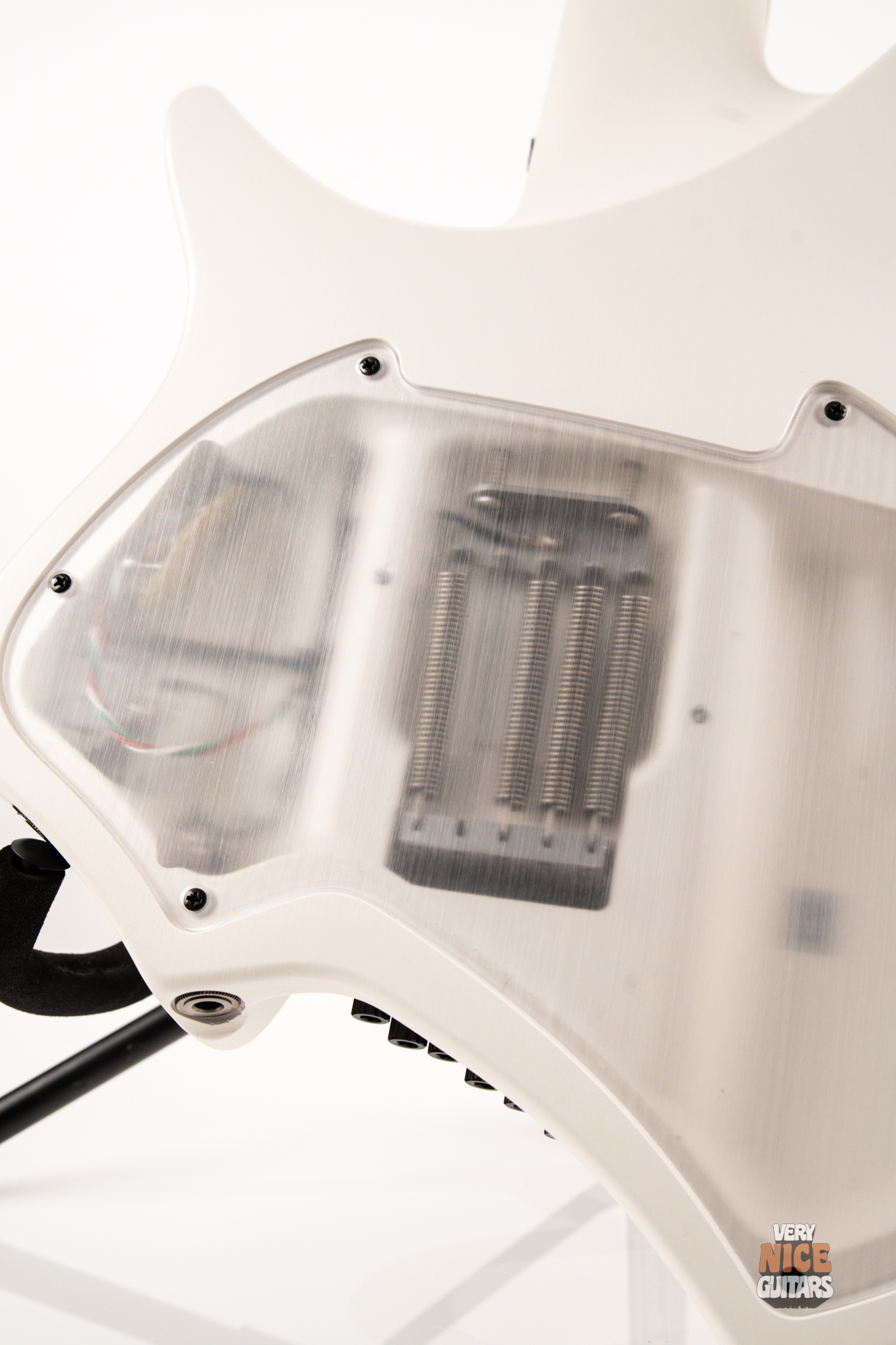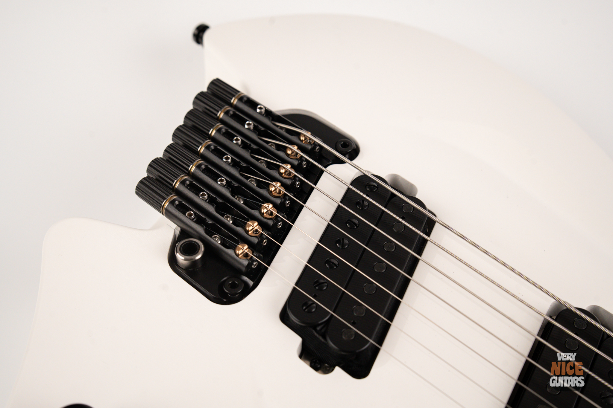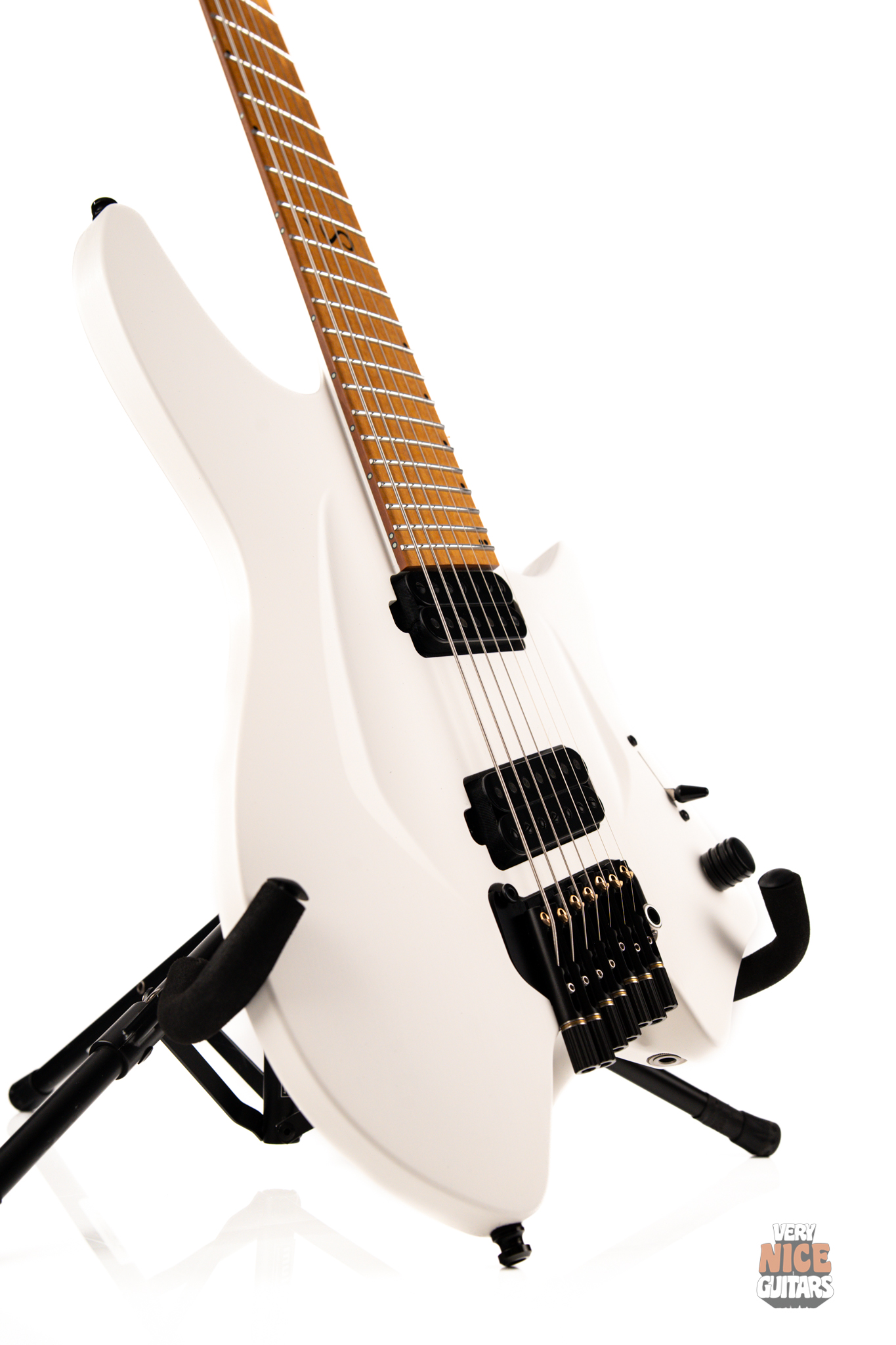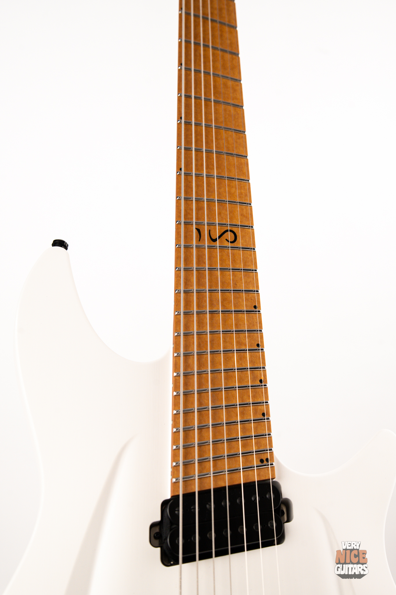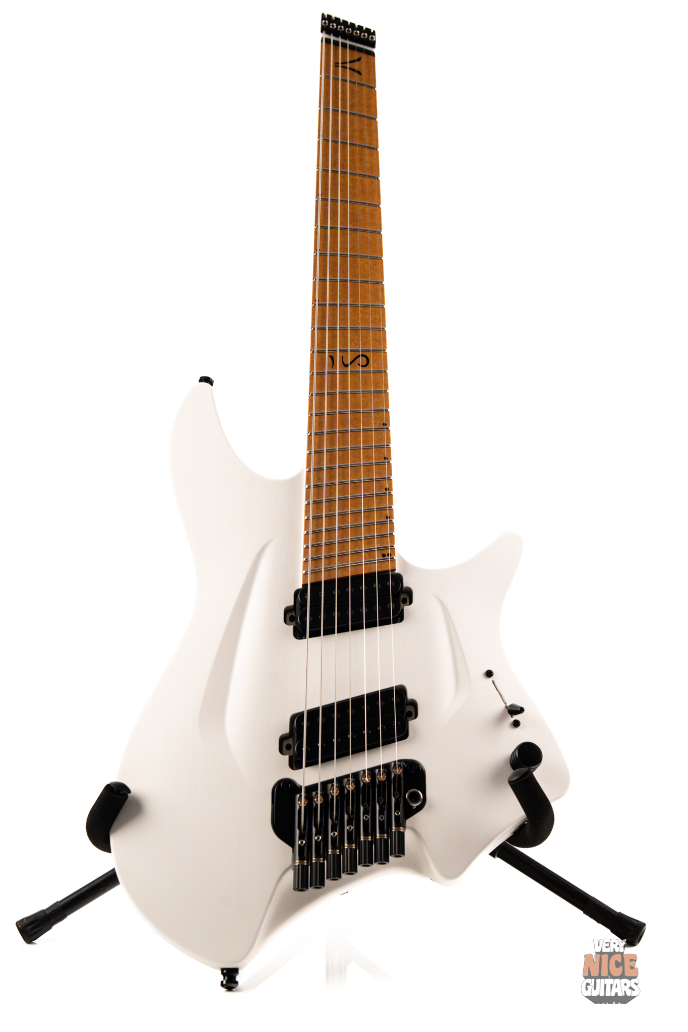 This 7-string is made of the sophisticated Arium composite material developed by Arisitides themselves for the maximum tuning stability, no matter the conditions. The fingerboard of this beast is light richlite with a compound 12”-16” radius, fitted with 24 Jescar stainless steel frets.This particular headless features Aristides designed and made tremolo system that stays perfectly in tune even after heavy use. This guitar was also equipped with a set of great sounding Bare Knuckle pickups, the Nailbomb and VHII. For controls you get a 5 way selector switch and a single volume knob.