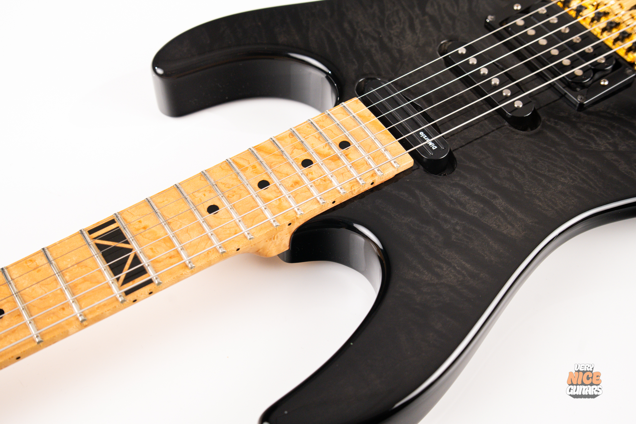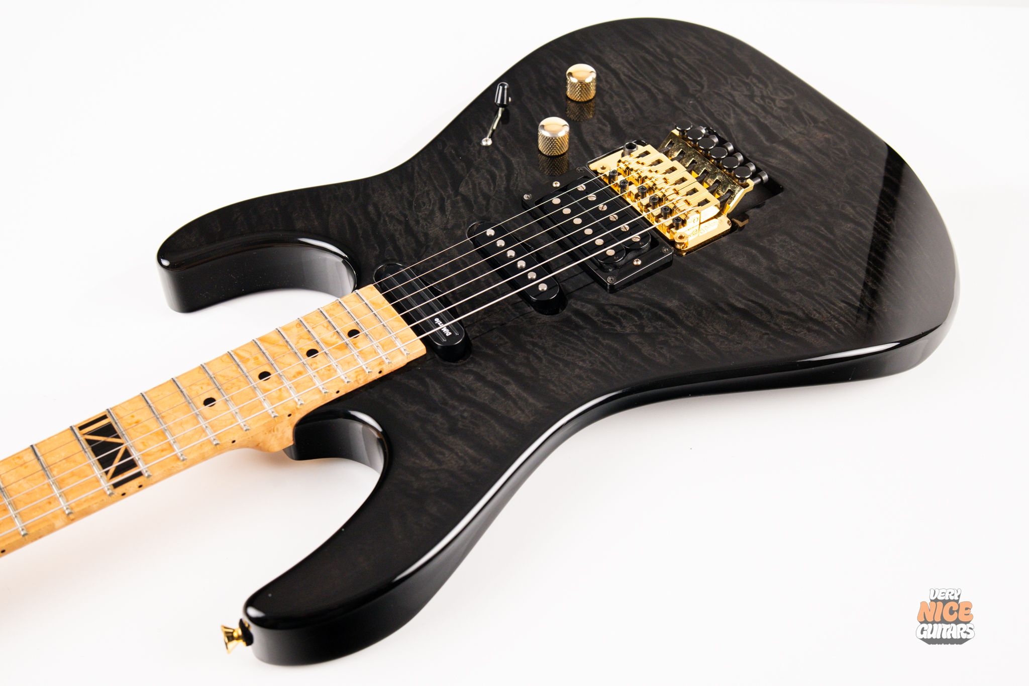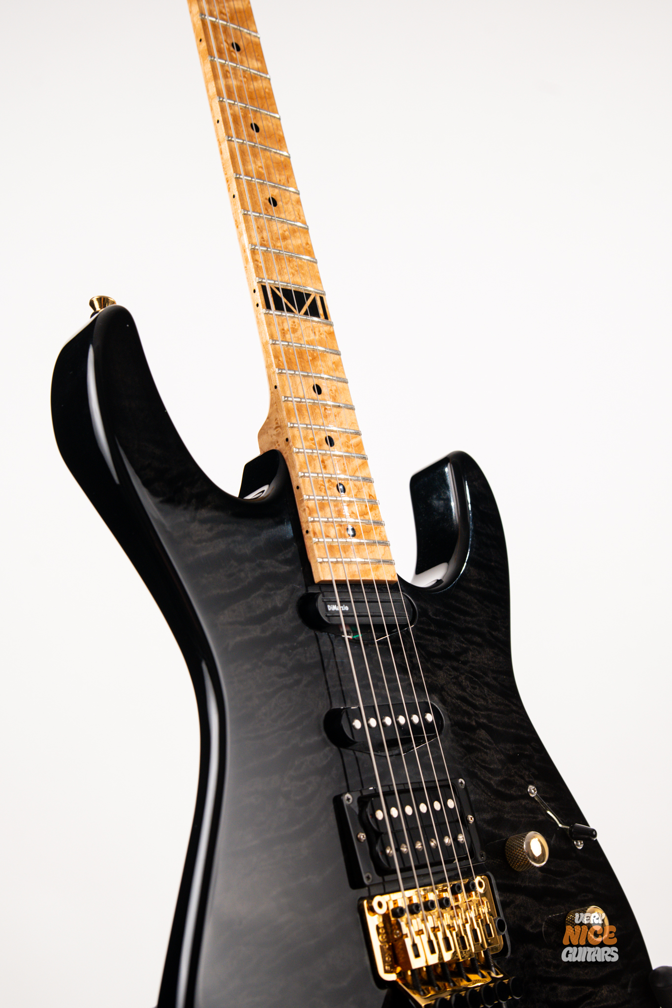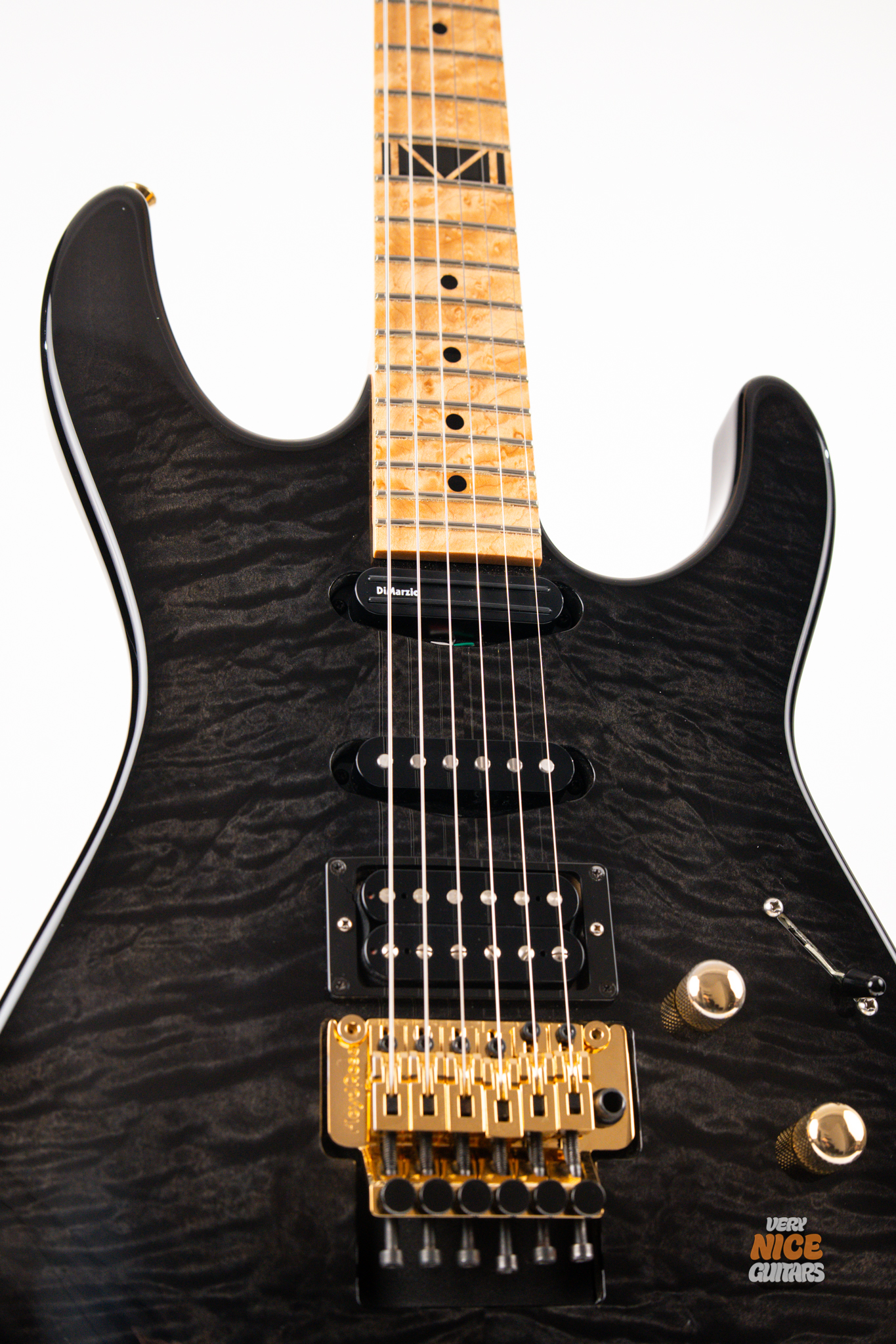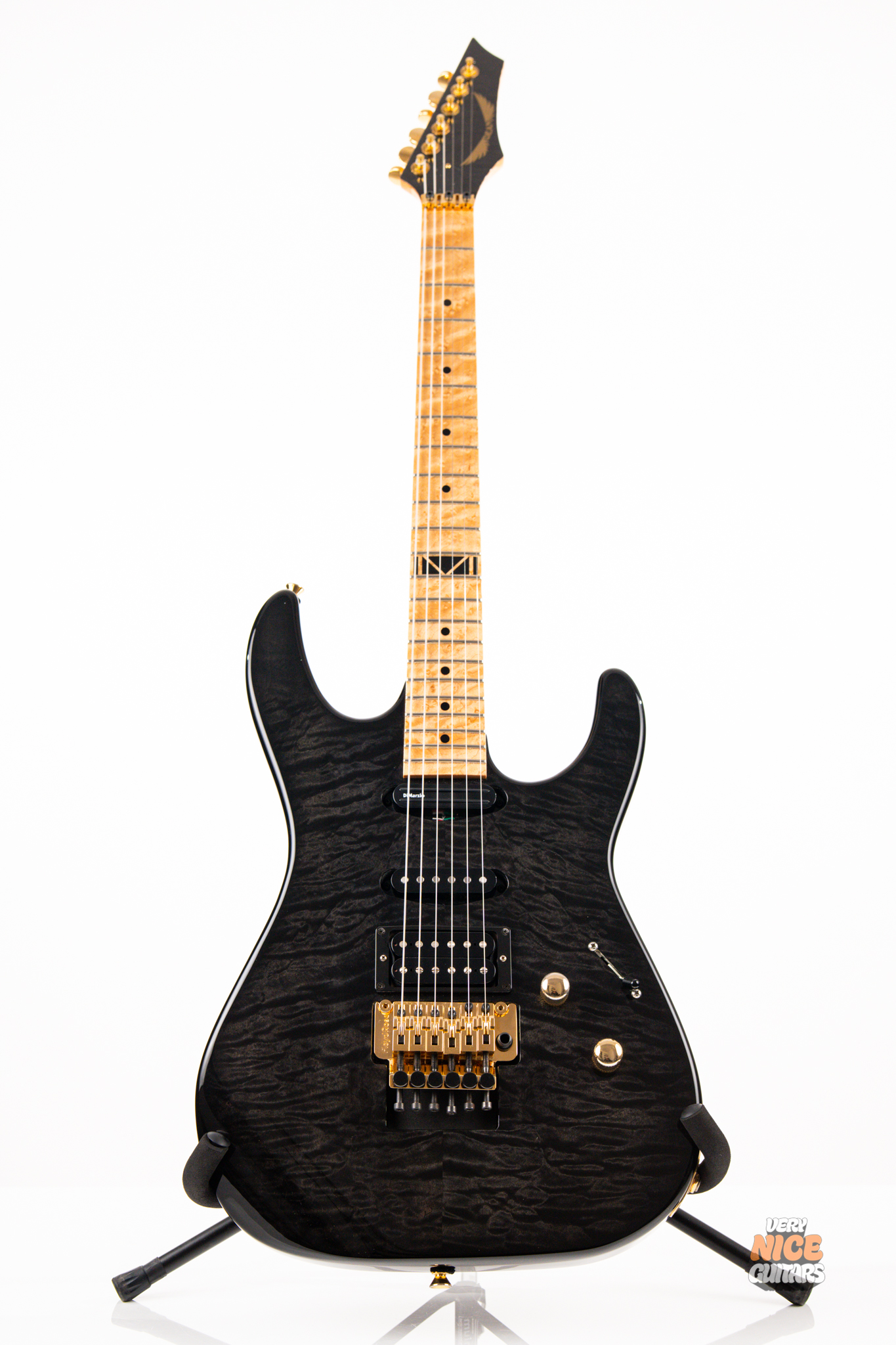 This american made super strat features and alder body with a stunning 5A grade quilted maple top. Its neck is made of 5 piece birdseye maple and walnut combination, with a birdseye maple fingerboard. It’s a 12 inch radius and it’s fitted with 22 jumbo frets. The guitar is equipped with a Floyd Rose Original floating tremolo paired with a locking nut. For the pickups it has Dean USA made Vinnie Moore’s signature Shredhead humbucker in the bridge, DiMarzio Vintage Blues in the middle and DiMarzio Fast Track single coil sized humbucker in the neck position. For controls it features a simple master volume, master tone and a 5 way pickup selector switch.
