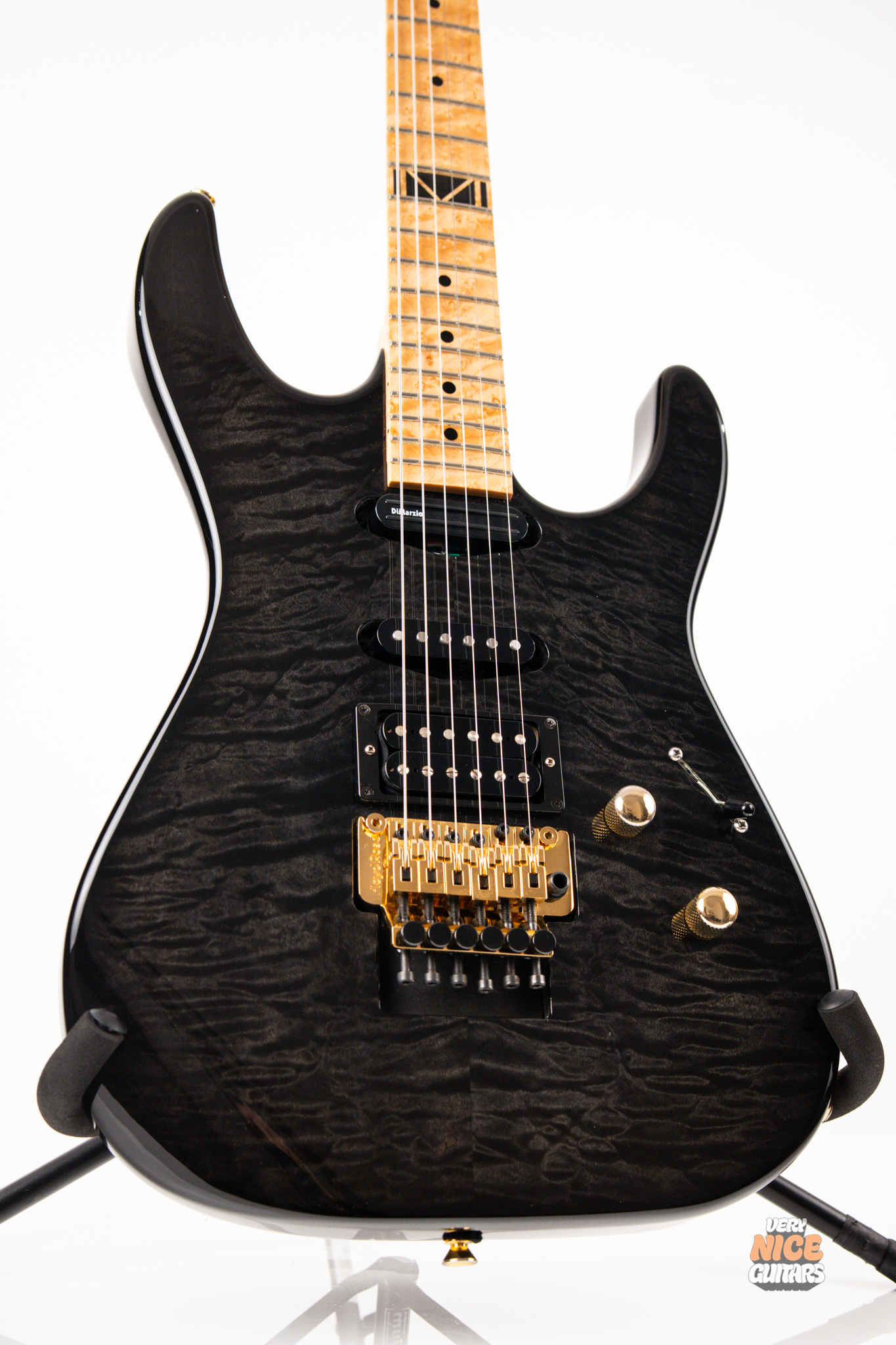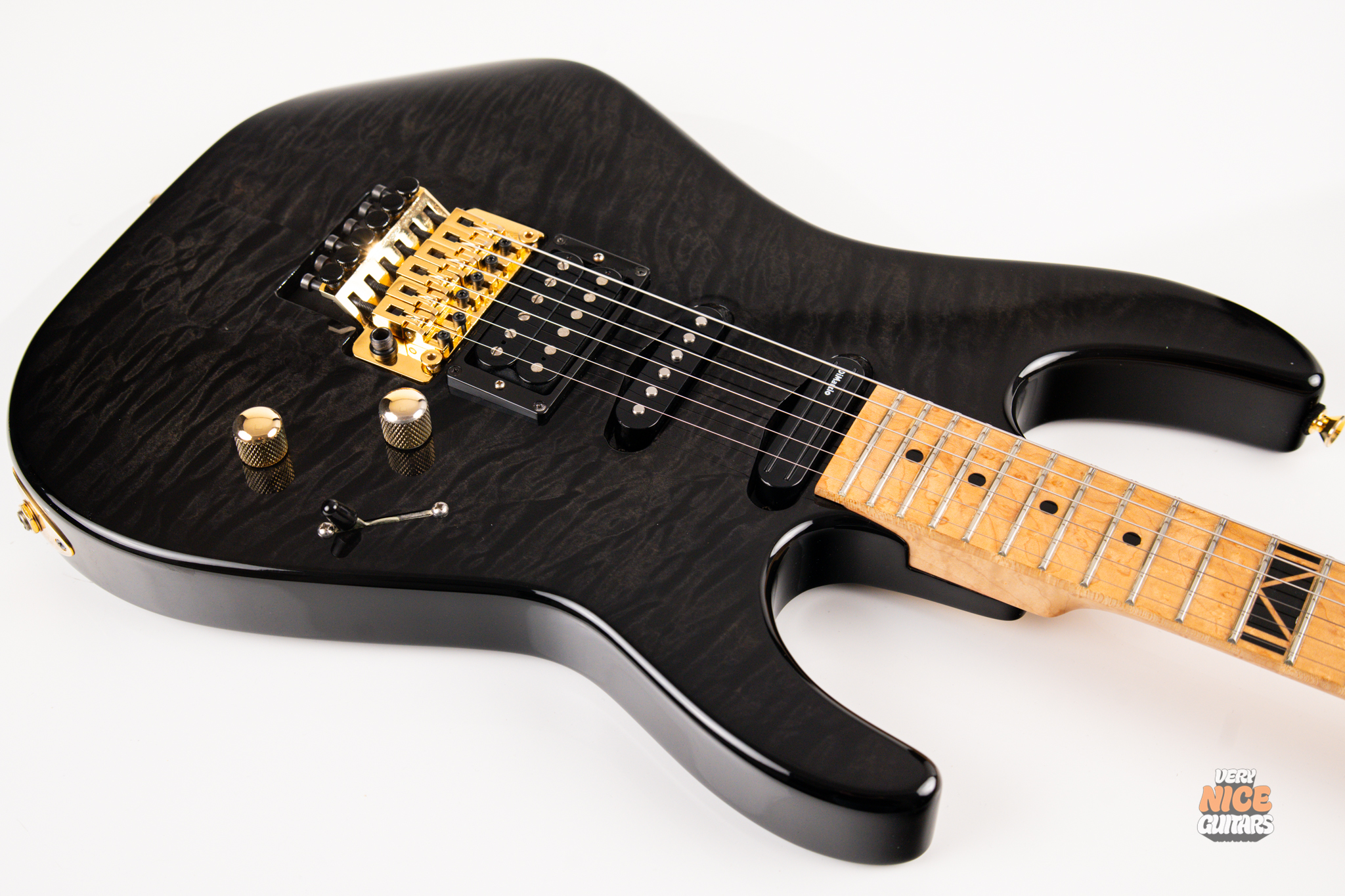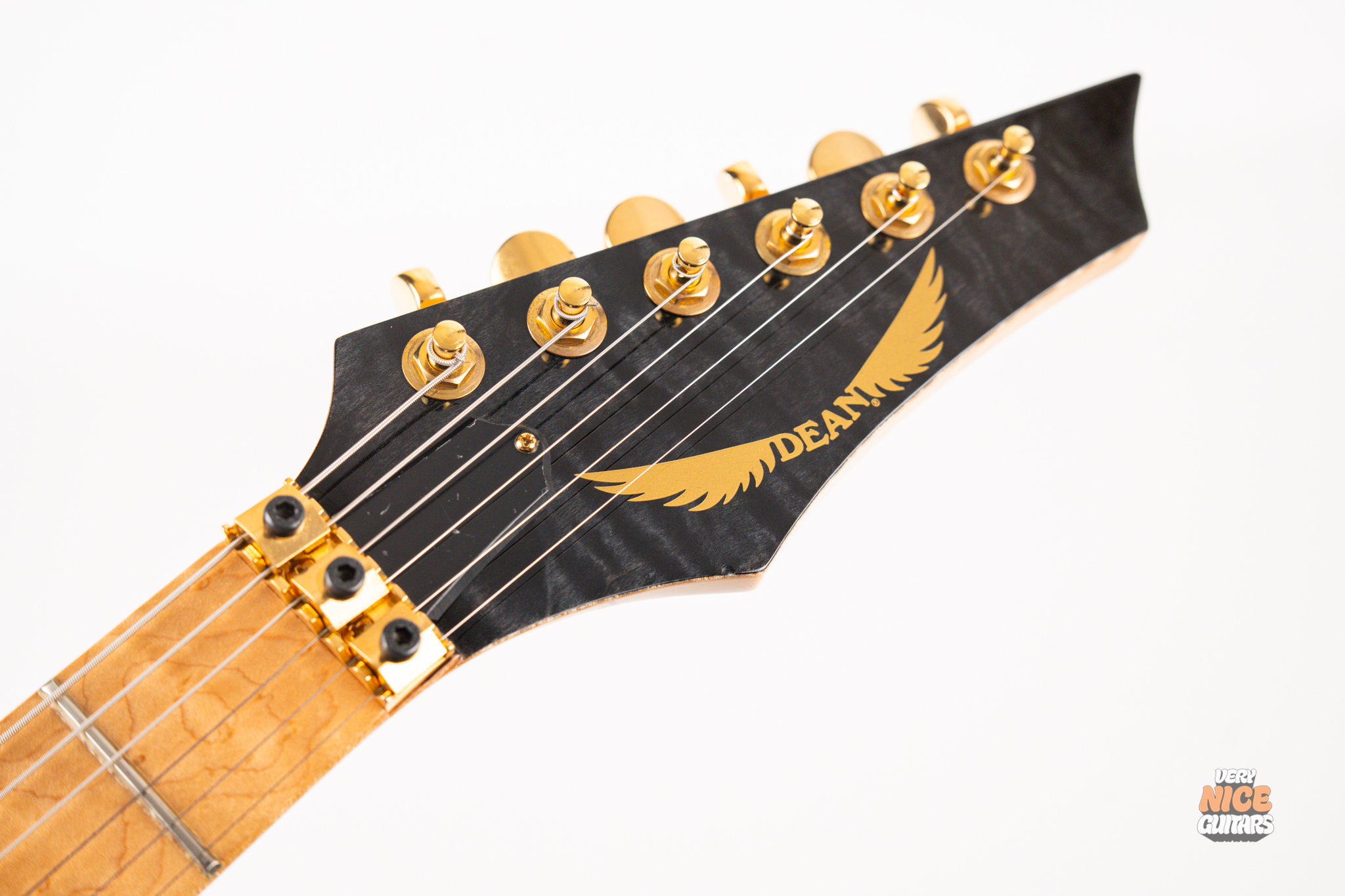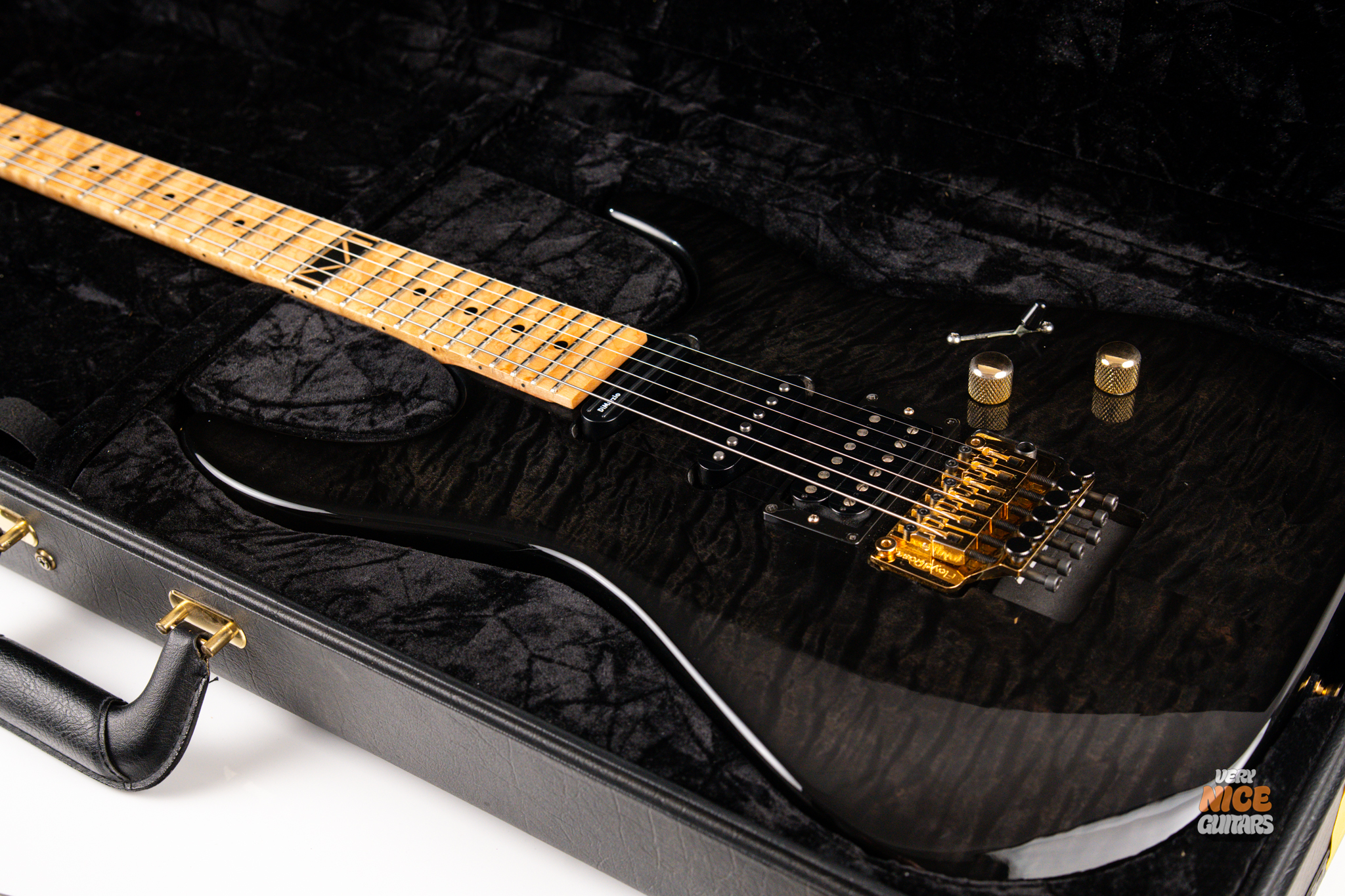 This american made super strat features and alder body with a stunning 5A grade quilted maple top. Its neck is made of 5 piece birdseye maple and walnut combination, with a birdseye maple fingerboard. It’s a 12 inch radius and it’s fitted with 22 jumbo frets. The guitar is equipped with a Floyd Rose Original floating tremolo paired with a locking nut. For the pickups it has Dean USA made Vinnie Moore’s signature Shredhead humbucker in the bridge, DiMarzio Vintage Blues in the middle and DiMarzio Fast Track single coil sized humbucker in the neck position. For controls it features a simple master volume, master tone and a 5 way pickup selector switch.