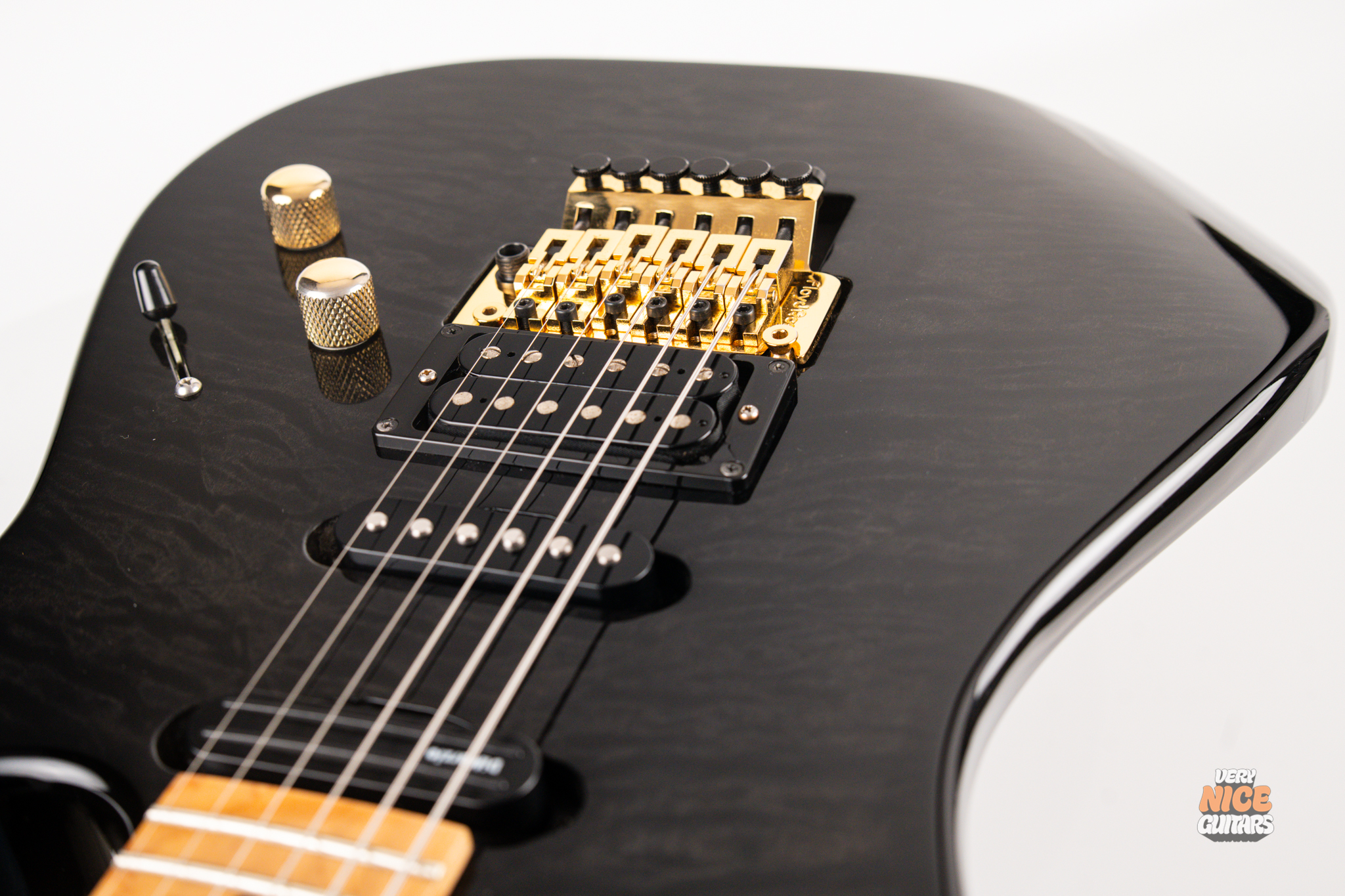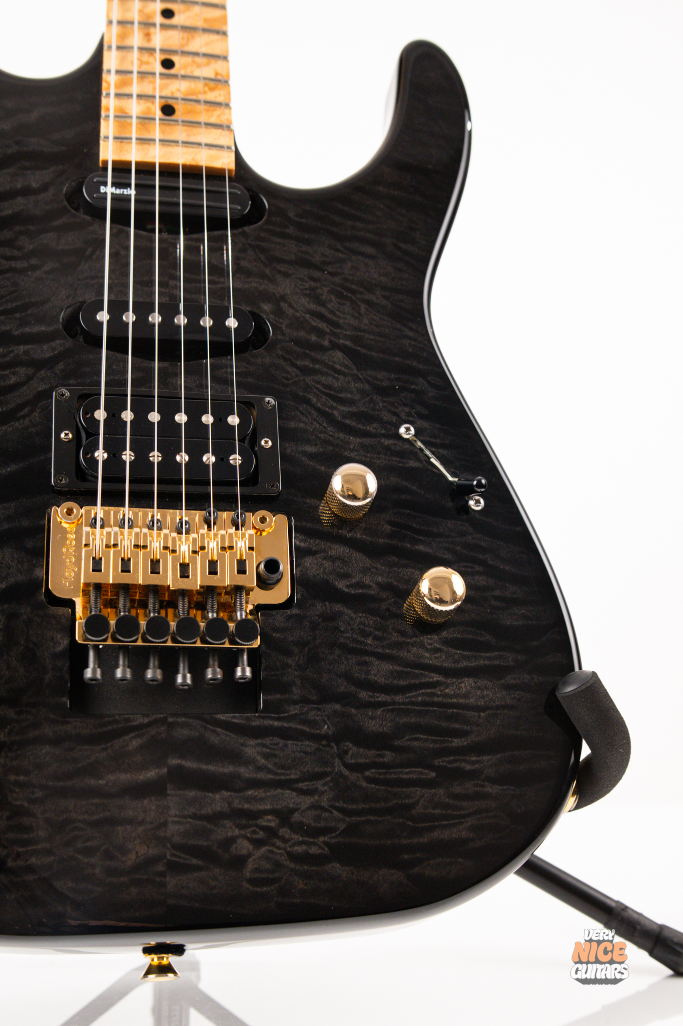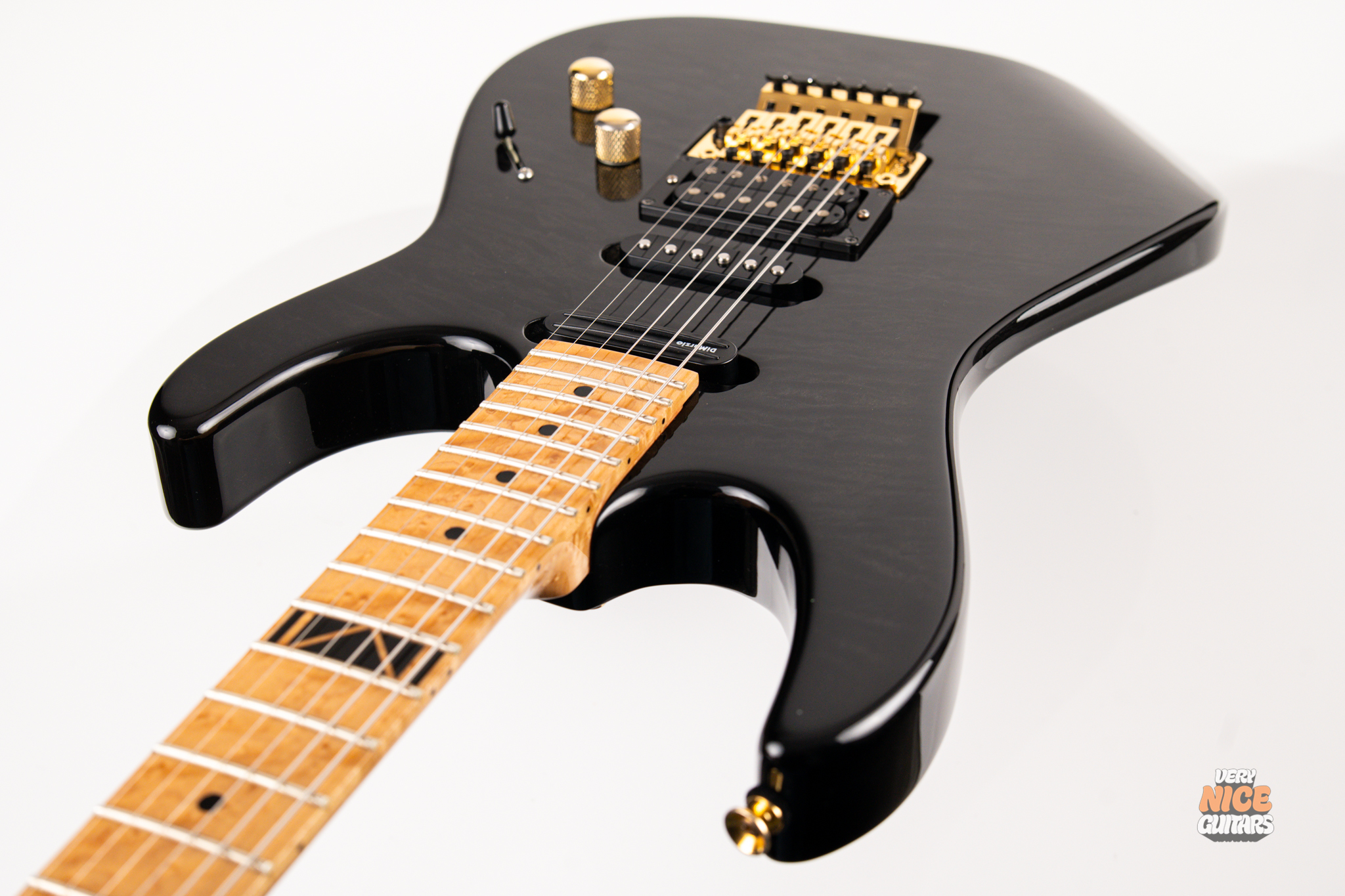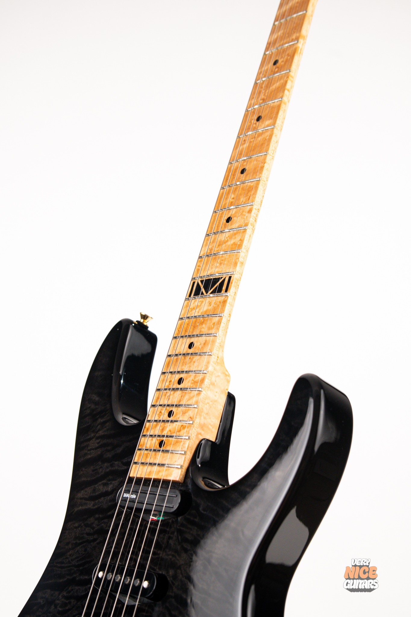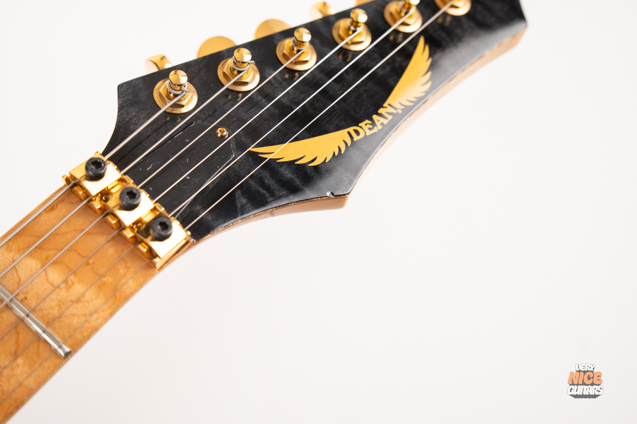 This american made super strat features and alder body with a stunning 5A grade quilted maple top. Its neck is made of 5 piece birdseye maple and walnut combination, with a birdseye maple fingerboard. It’s a 12 inch radius and it’s fitted with 22 jumbo frets. The guitar is equipped with a Floyd Rose Original floating tremolo paired with a locking nut. For the pickups it has Dean USA made Vinnie Moore’s signature Shredhead humbucker in the bridge, DiMarzio Vintage Blues in the middle and DiMarzio Fast Track single coil sized humbucker in the neck position. For controls it features a simple master volume, master tone and a 5 way pickup selector switch.