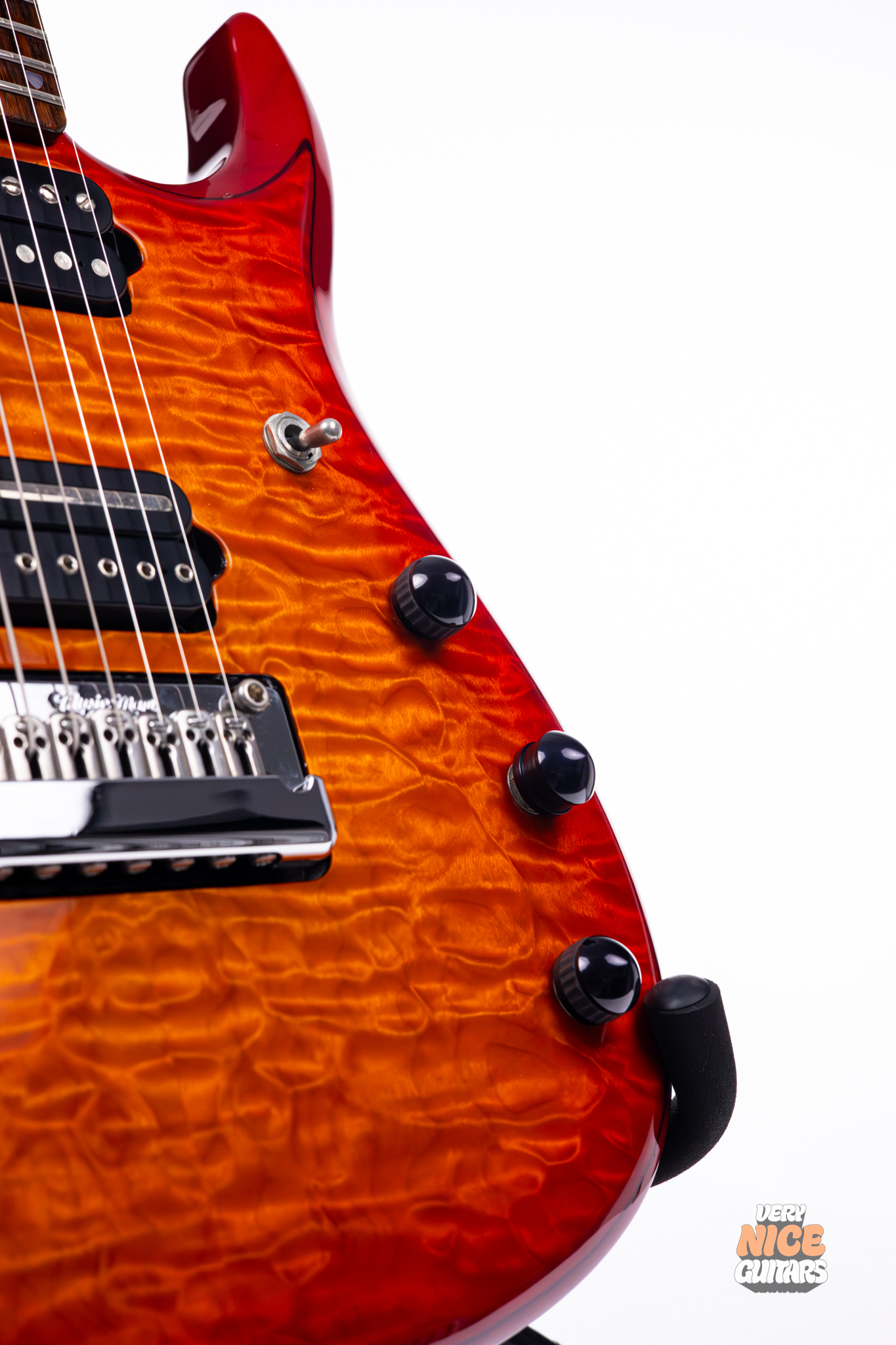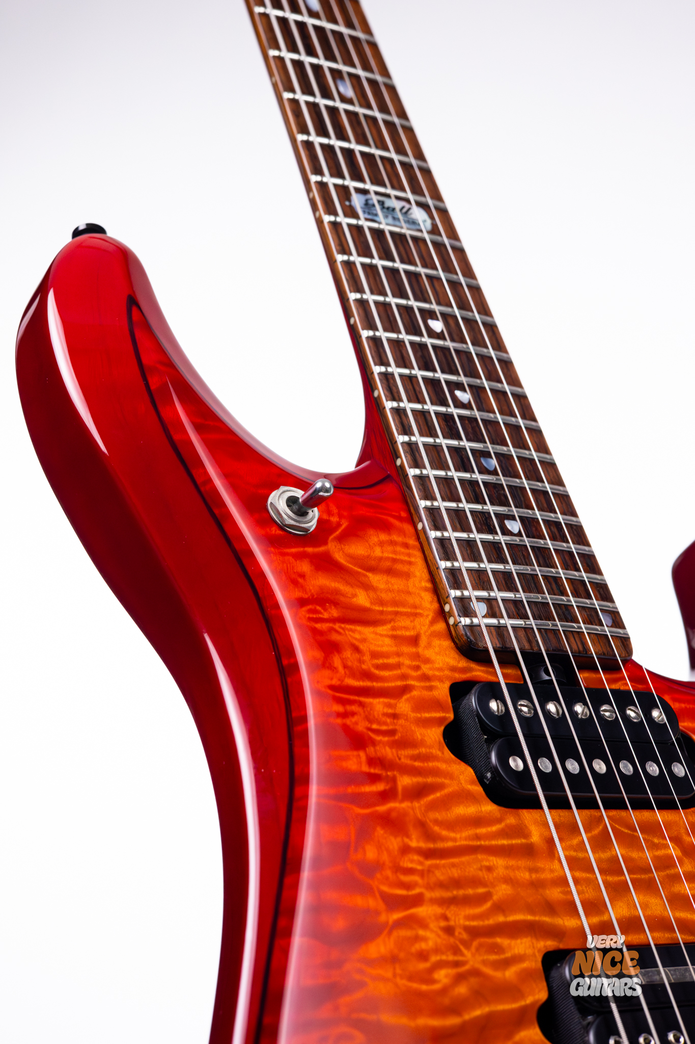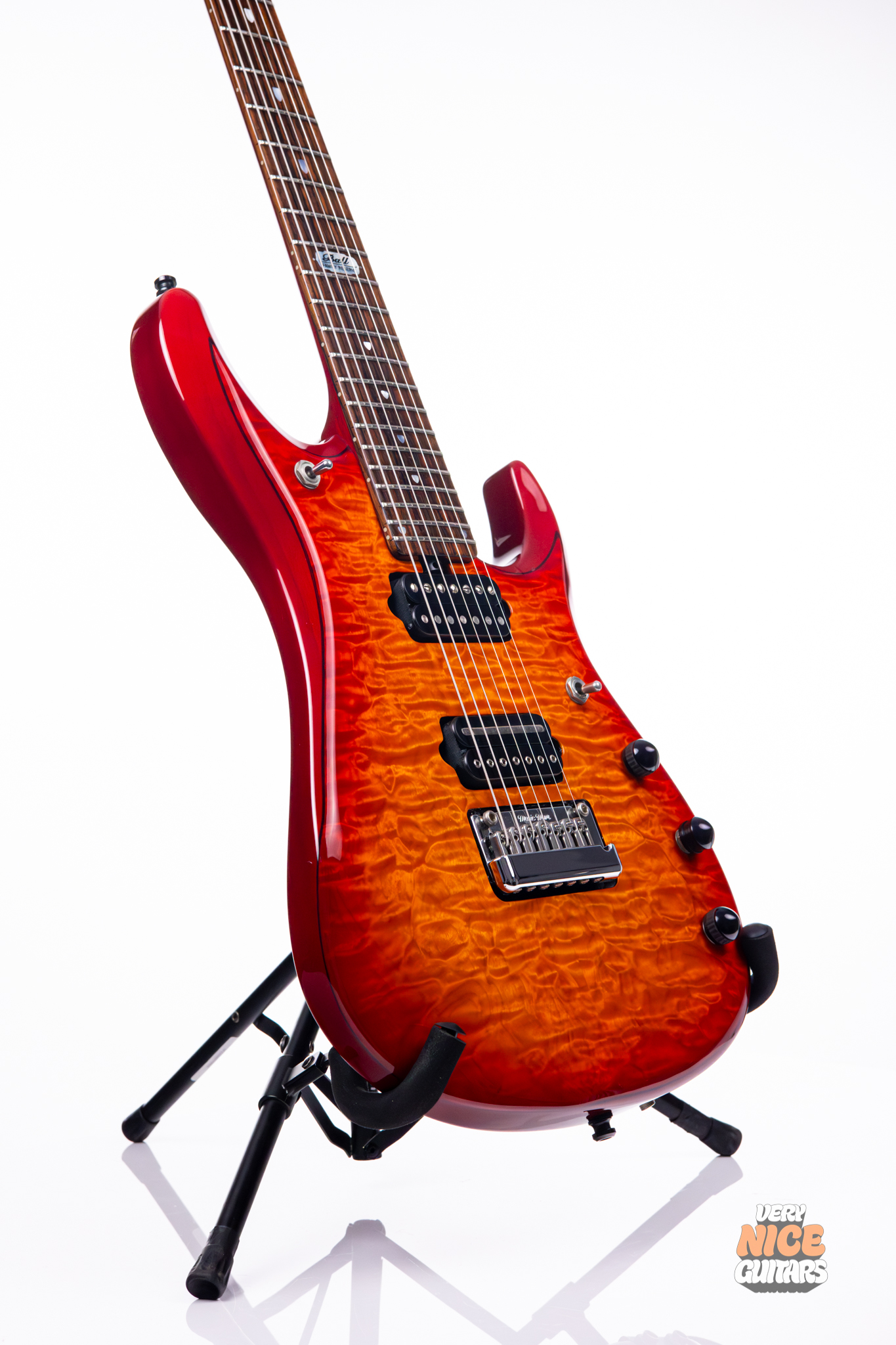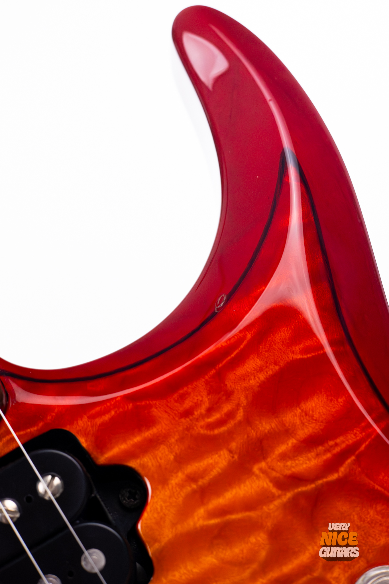 This eye-grabbing instrument features a Alder body with a Mahogany Tone Block and quilted maple top, mahogany bolt-on neck with a 15” radius ebony fretboard with 24 frets. The hardware is chrome, with the exception of the pearl buttons on the Schaller M6-IND locking tuners. The bridge featured here is a Custom John Petrucci Piezo Floating Tremolo, allowing for flutters and divebombs. This guitar comes with DiMarzio Crunchlab and Liquifire pickups in the bridge and neck positions respectively, guaranteeing satisfaction even to the pickiest of players.