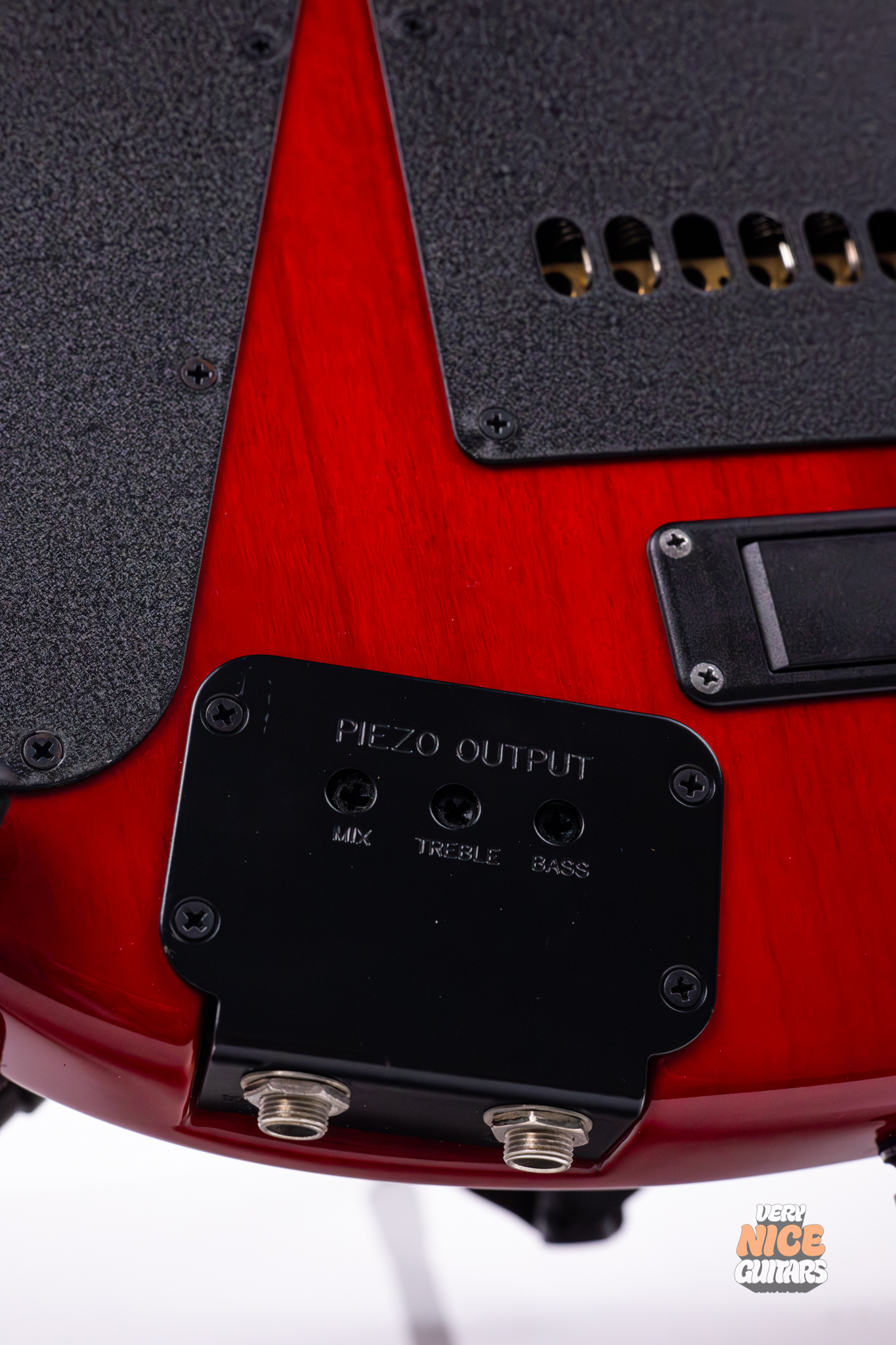 • Controls: Custom Music Man® active preamp; push/push volume for gain boost, 500kohm push/push passive tone for custom 2 pickup configurations – .022µF tone capacitor, 3-way toggle pickup selector, with custom center position configuration; 3-way toggle piezo/magnetic selector, momentary mono/stereo output knob (Piezo Volume)