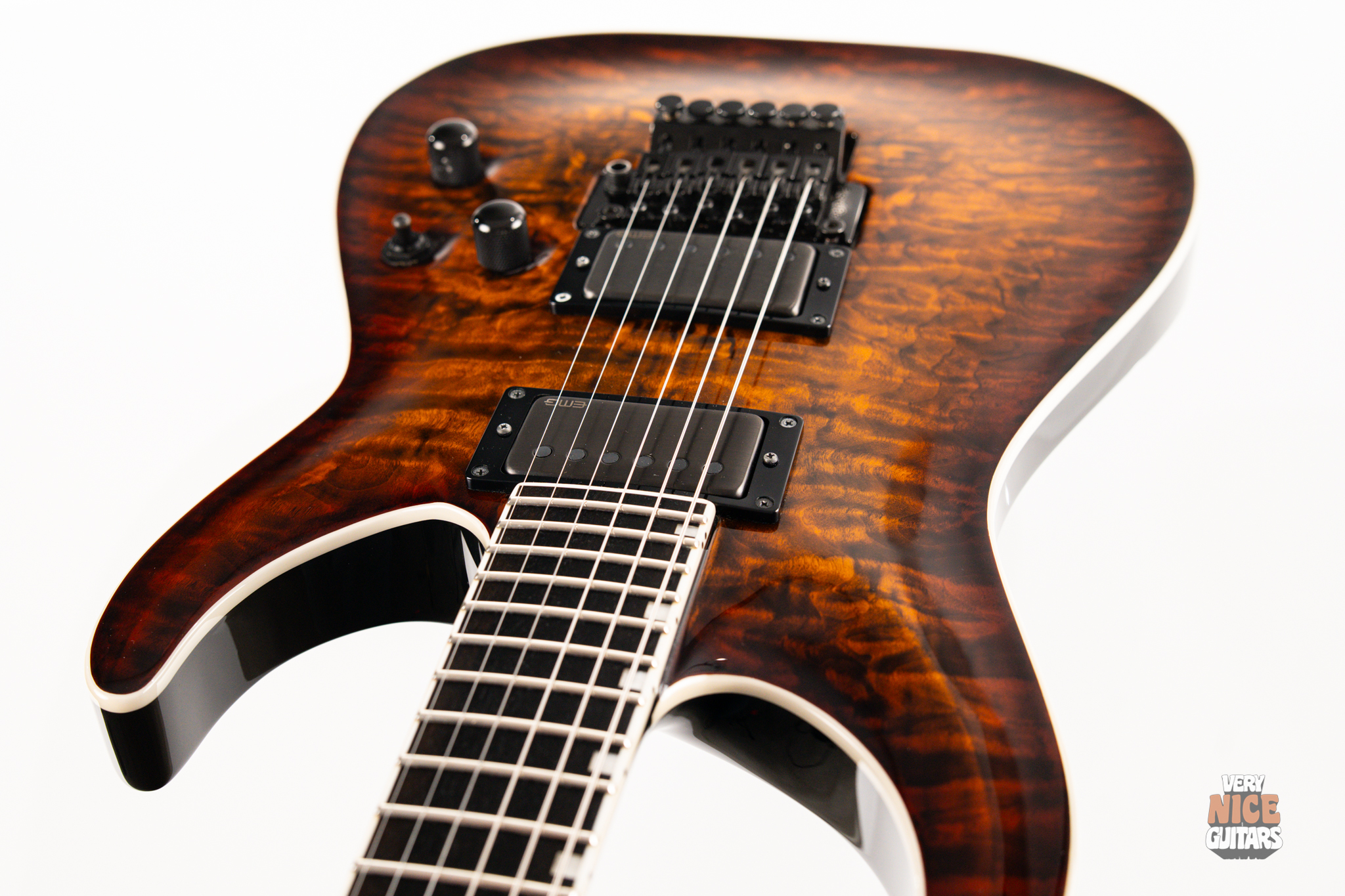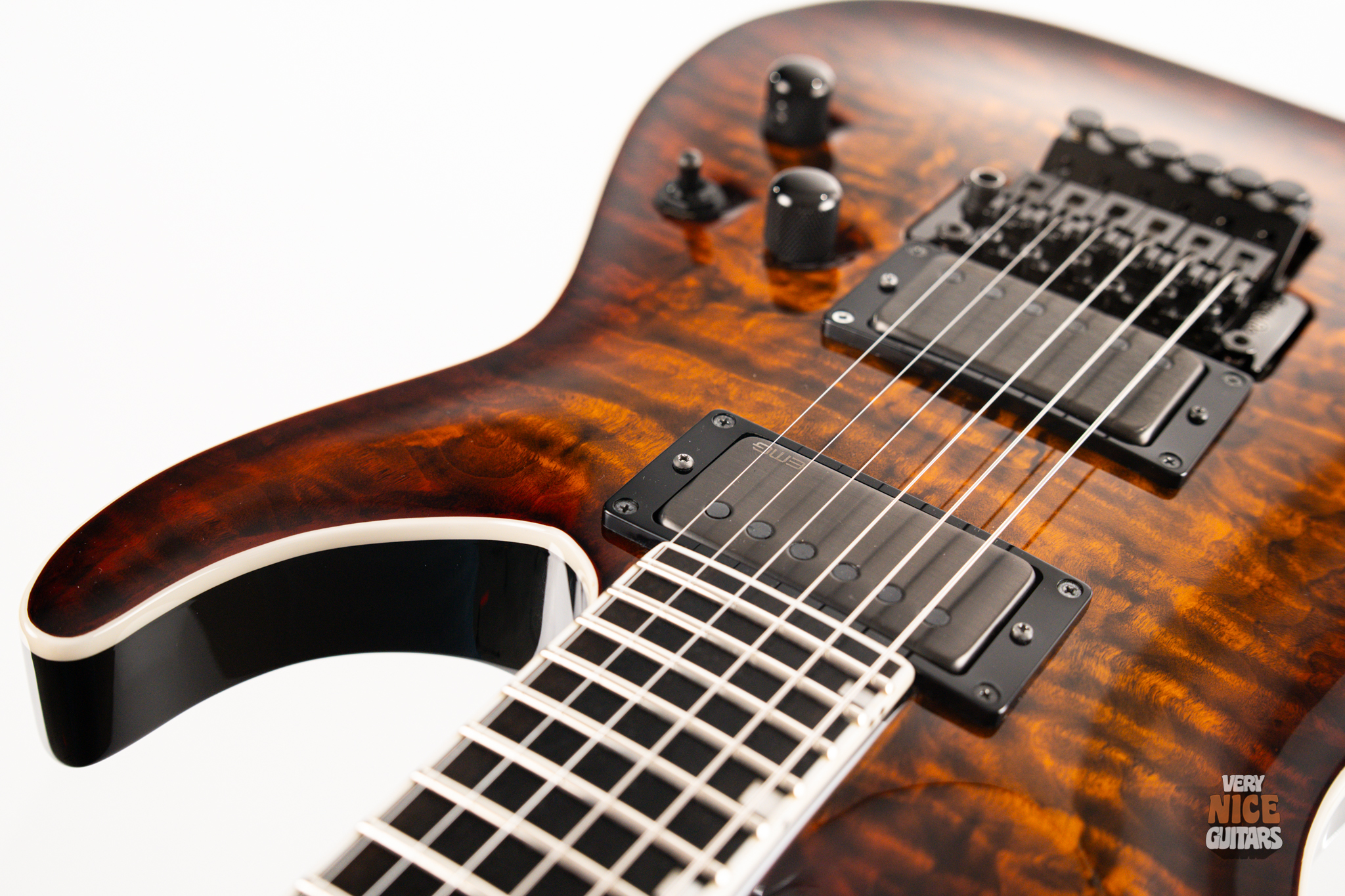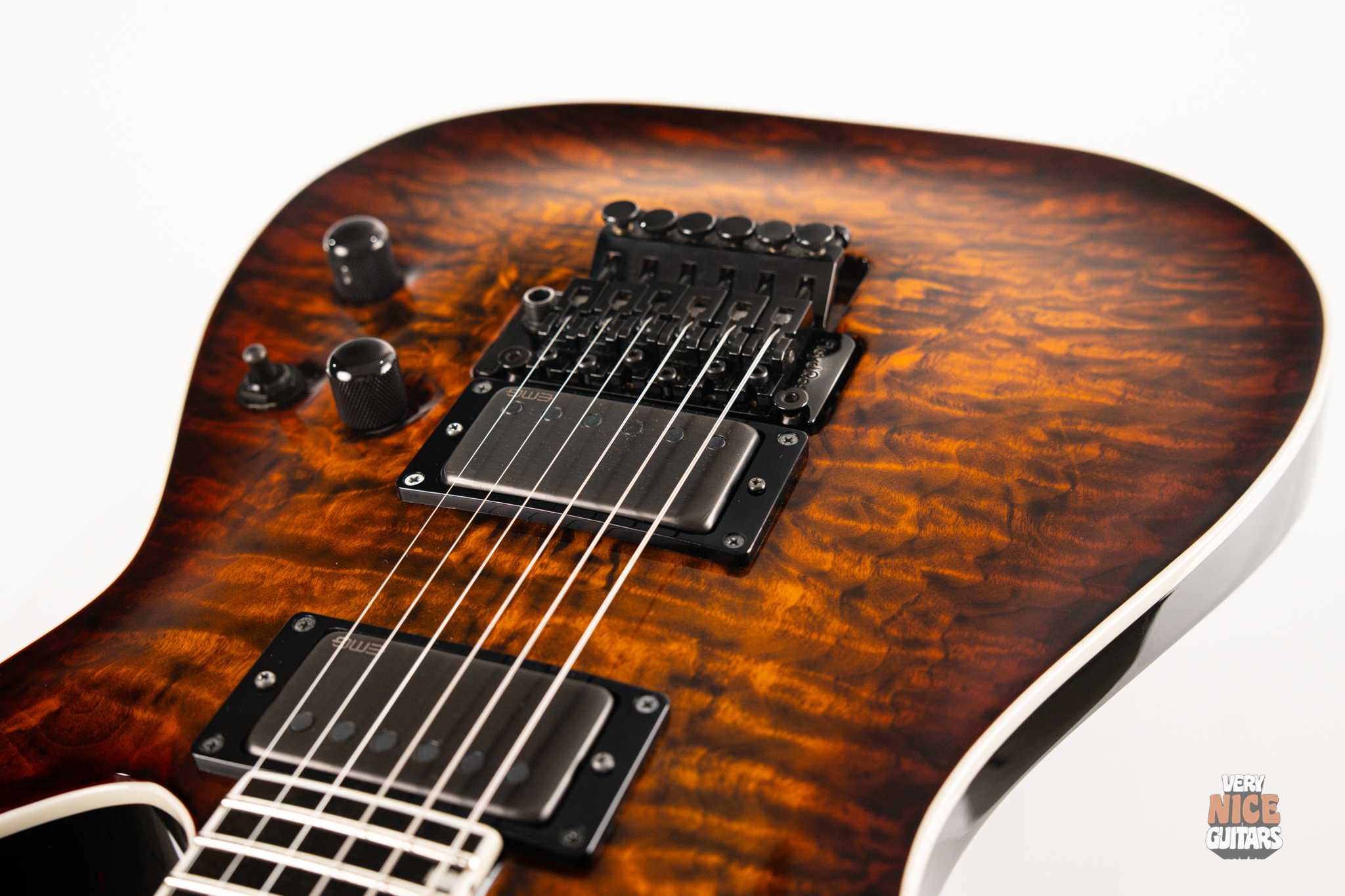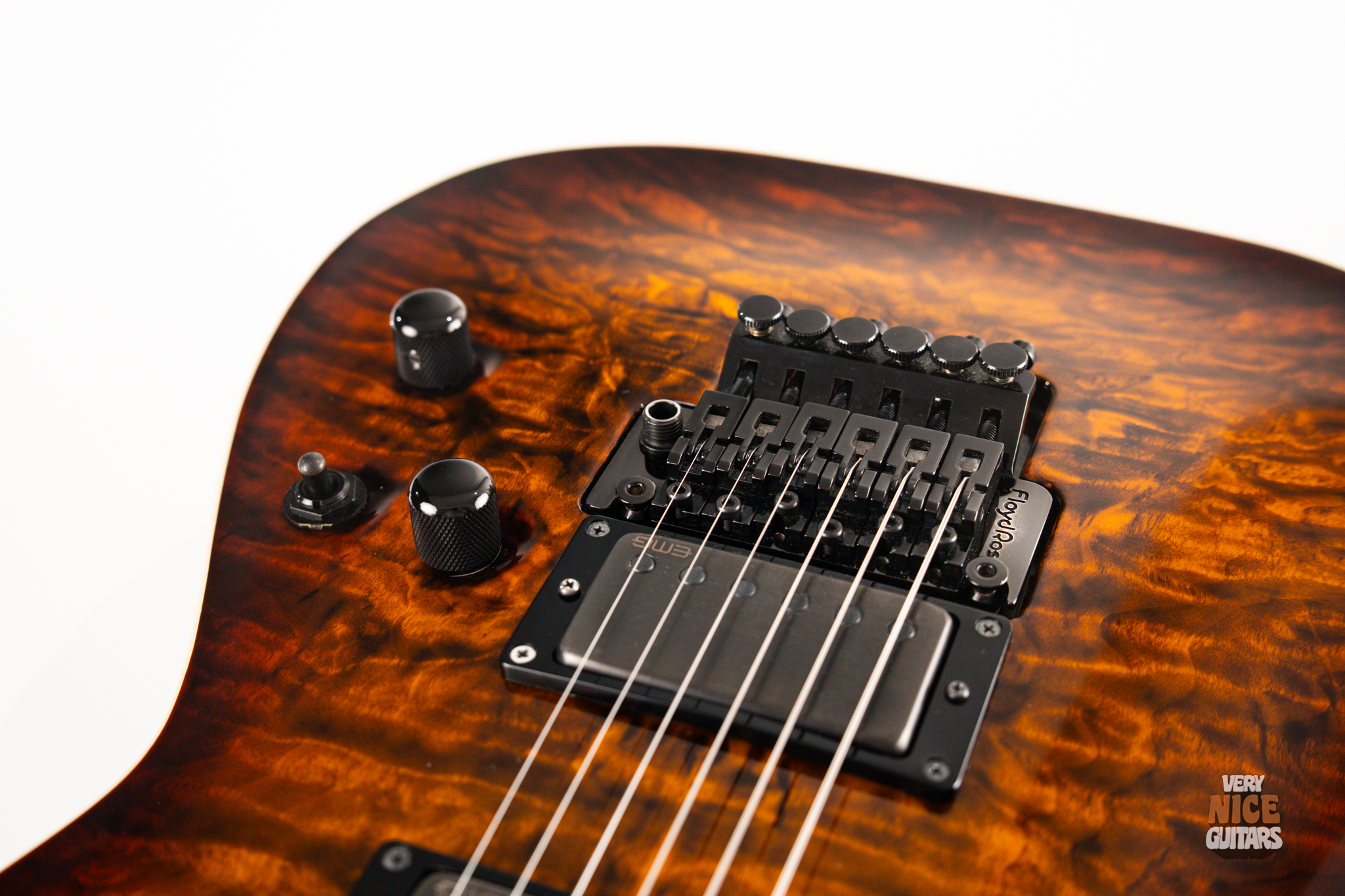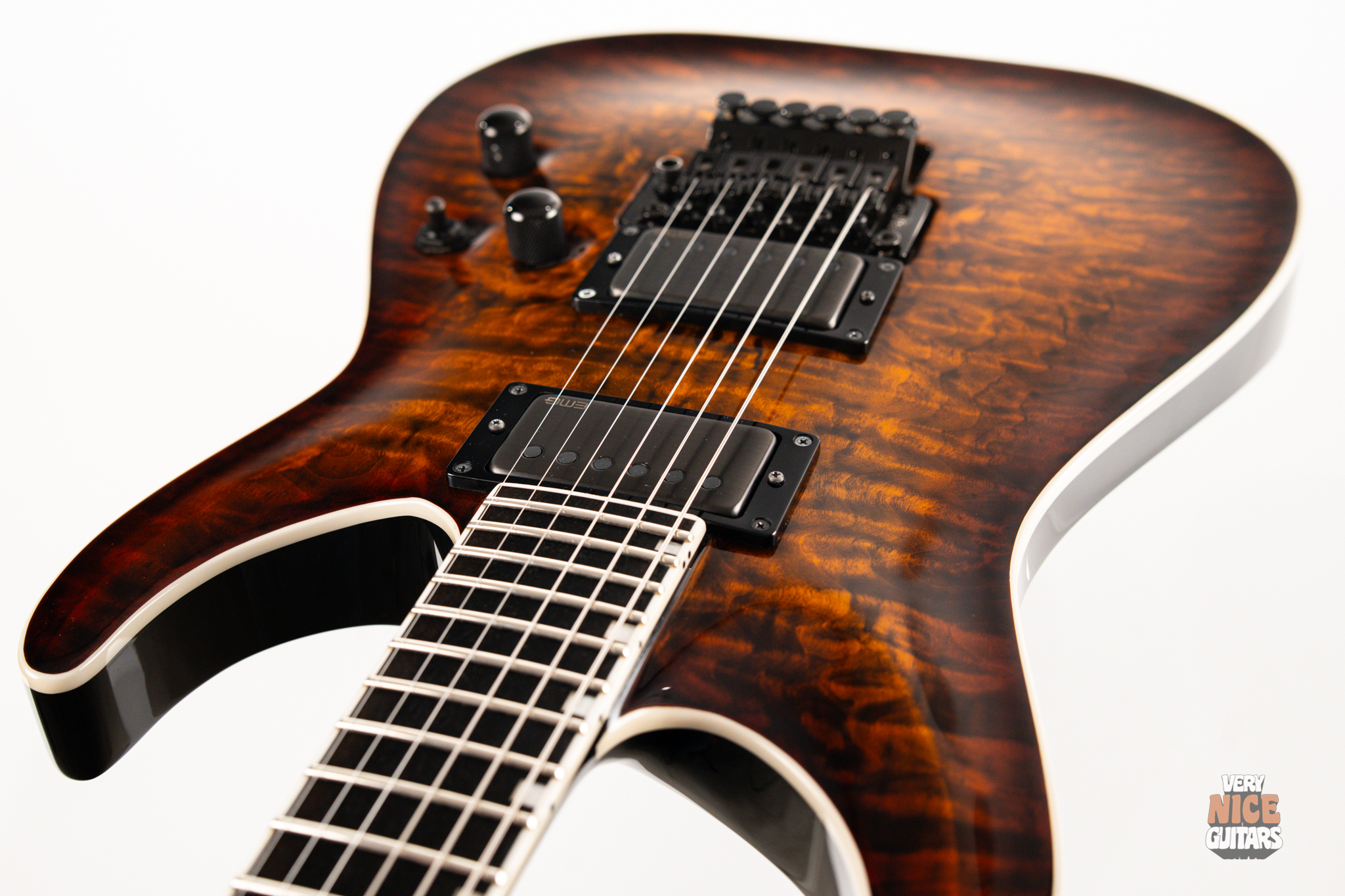 This guitar comes equipped with the top-of-the-line, German-made Floyd Rose Original, with a hardened steel baseplate and saddles along with a nickel-plated brass sustain block. The result? Exceptional durability, tuning stability and impressive sustain. Visually, the guitar’s clean, minimalist design is beautifully contrasted by a Quilted Maple top in a stunning Tiger Eye Sunburst finish. The ebony fretboard paired with a maple neck delivers a classic tonewood combination for metal – offering a snappy attack and a smooth, fast-playing feel. Subtle offset rectangular inlays add an extra touch of class. Tone-wise, it’s loaded with a set of active EMG 66 and 57 humbuckers in Brushed Black Chrome. These pickups deliver tight, heavy rhythm tones and clear, dynamic cleans, with enhanced low end and smoother highs compared to traditional active sets.
