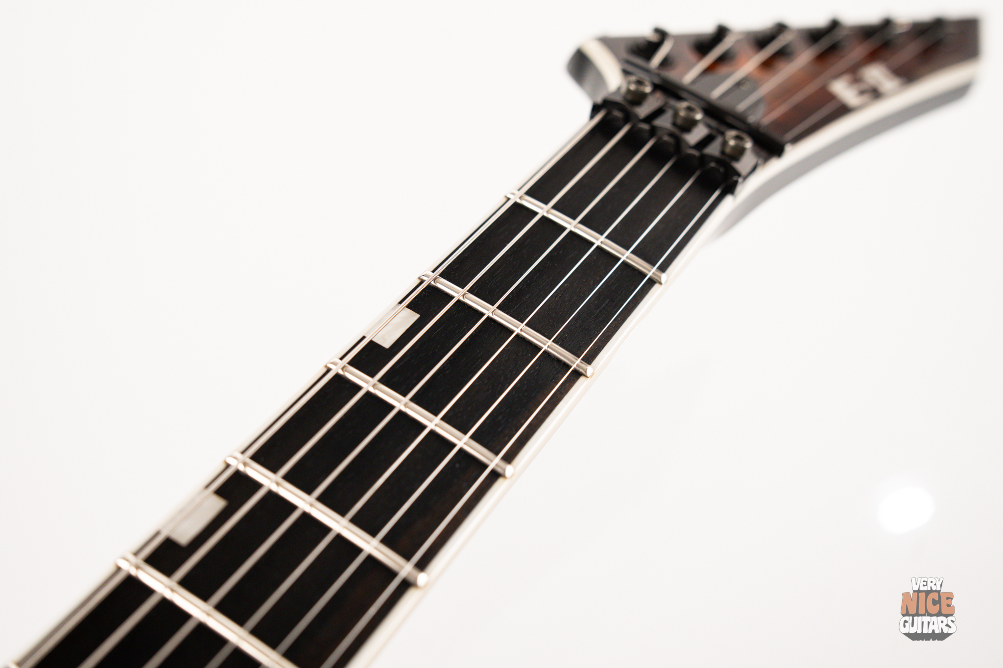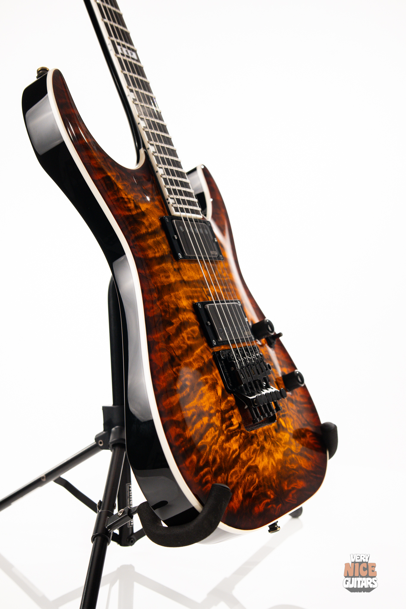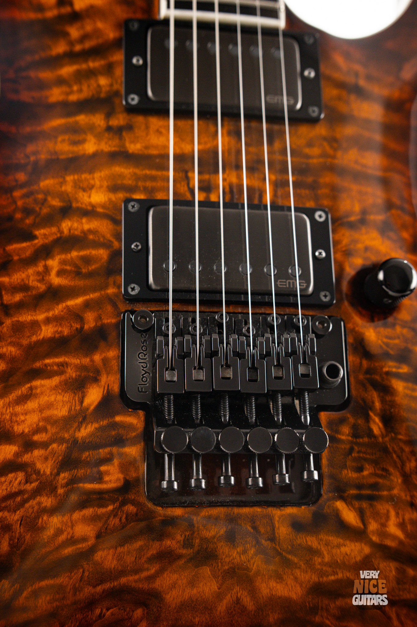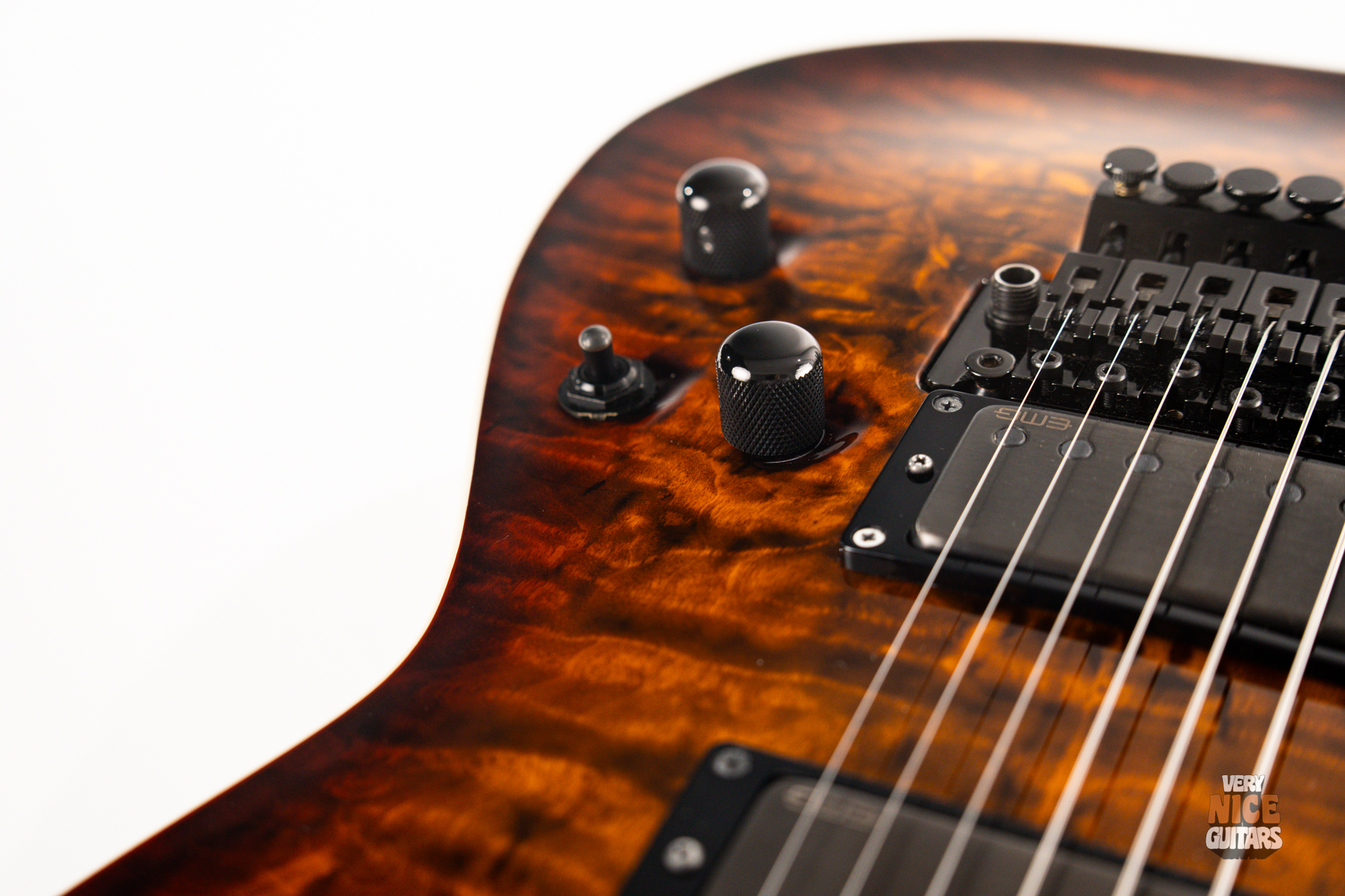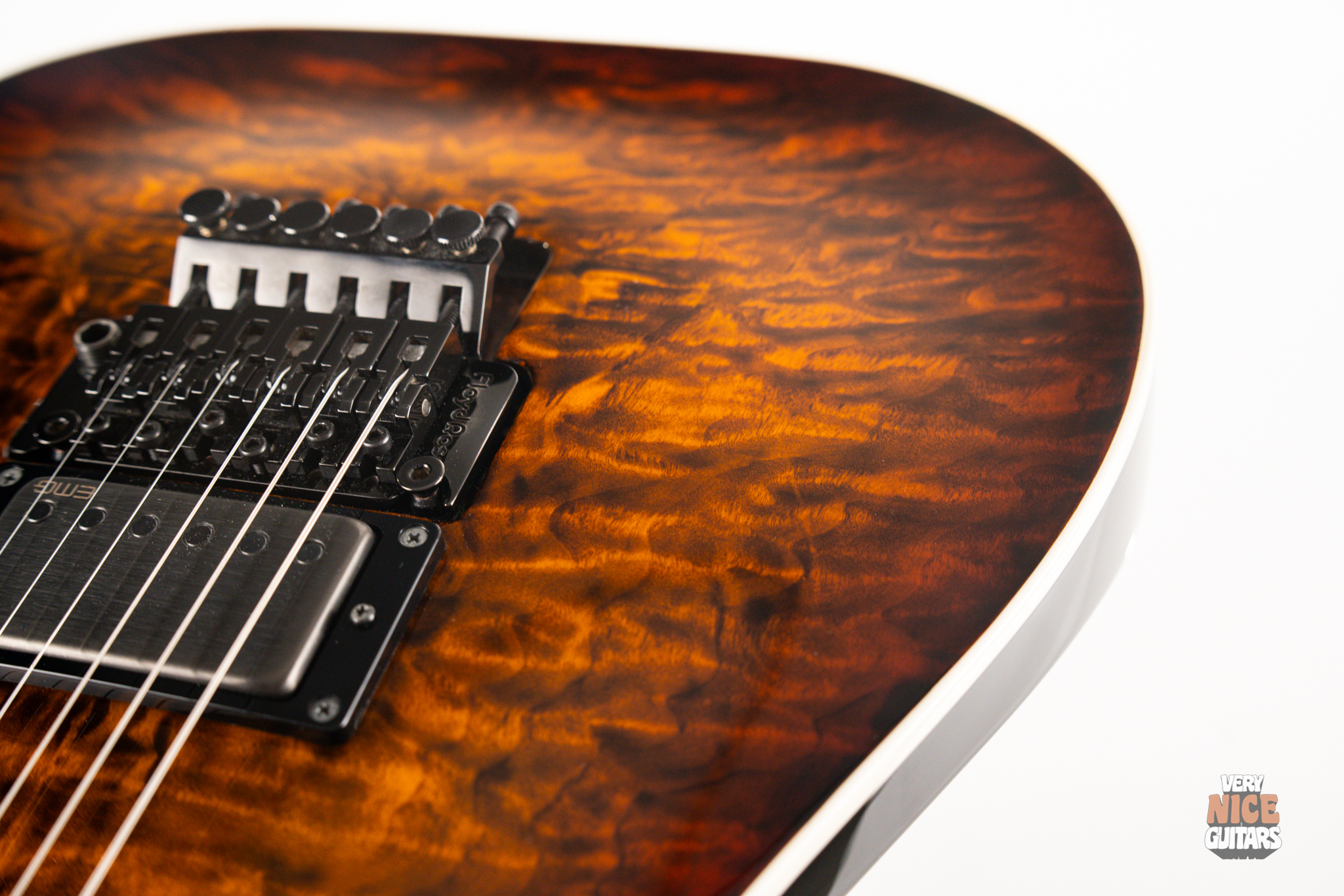 This guitar comes equipped with the top-of-the-line, German-made Floyd Rose Original, with a hardened steel baseplate and saddles along with a nickel-plated brass sustain block. The result? Exceptional durability, tuning stability and impressive sustain. Visually, the guitar’s clean, minimalist design is beautifully contrasted by a Quilted Maple top in a stunning Tiger Eye Sunburst finish. The ebony fretboard paired with a maple neck delivers a classic tonewood combination for metal – offering a snappy attack and a smooth, fast-playing feel. Subtle offset rectangular inlays add an extra touch of class. Tone-wise, it’s loaded with a set of active EMG 66 and 57 humbuckers in Brushed Black Chrome. These pickups deliver tight, heavy rhythm tones and clear, dynamic cleans, with enhanced low end and smoother highs compared to traditional active sets.