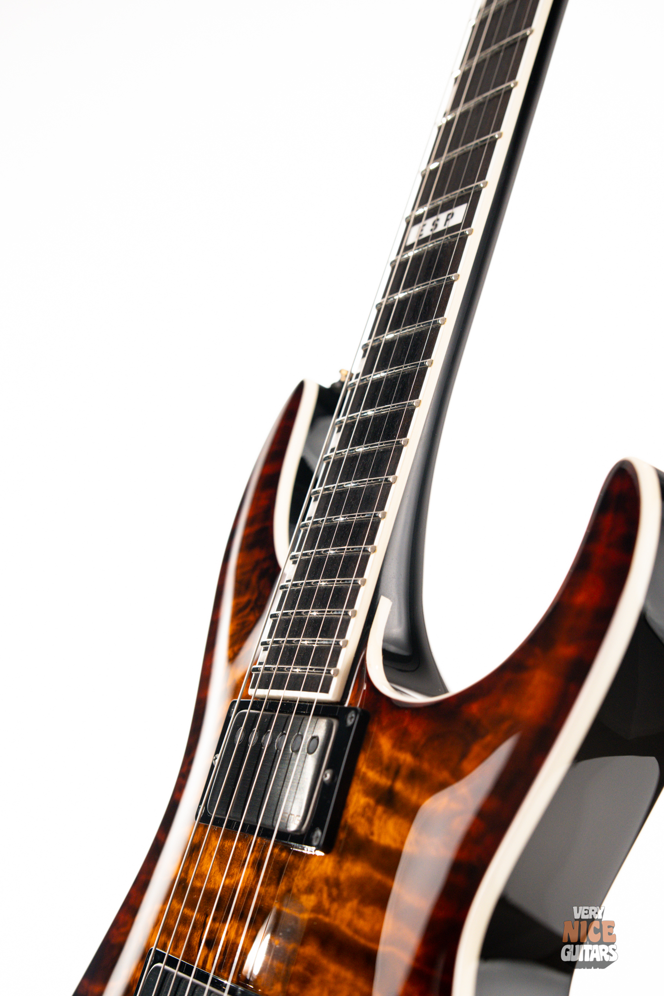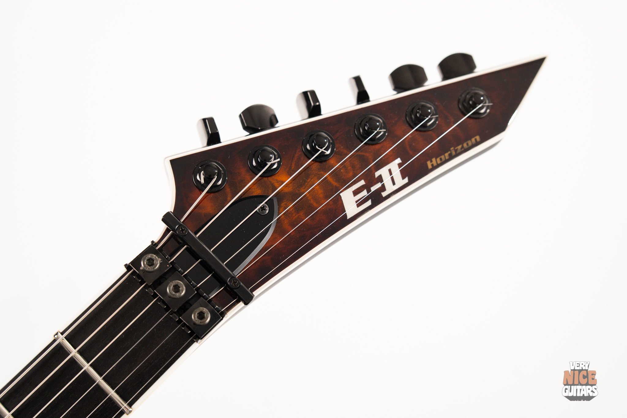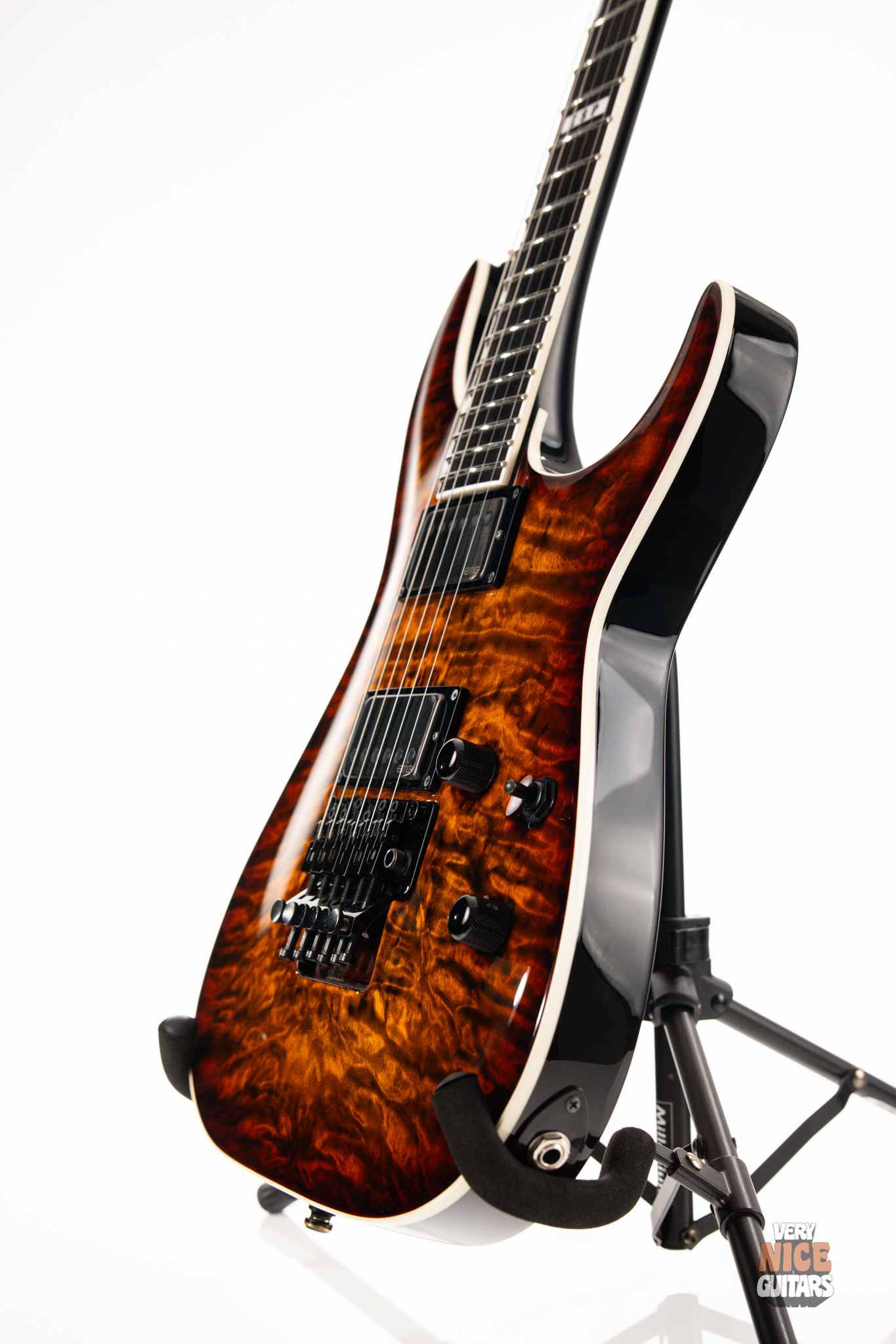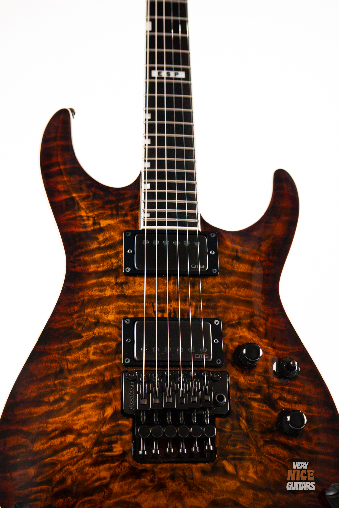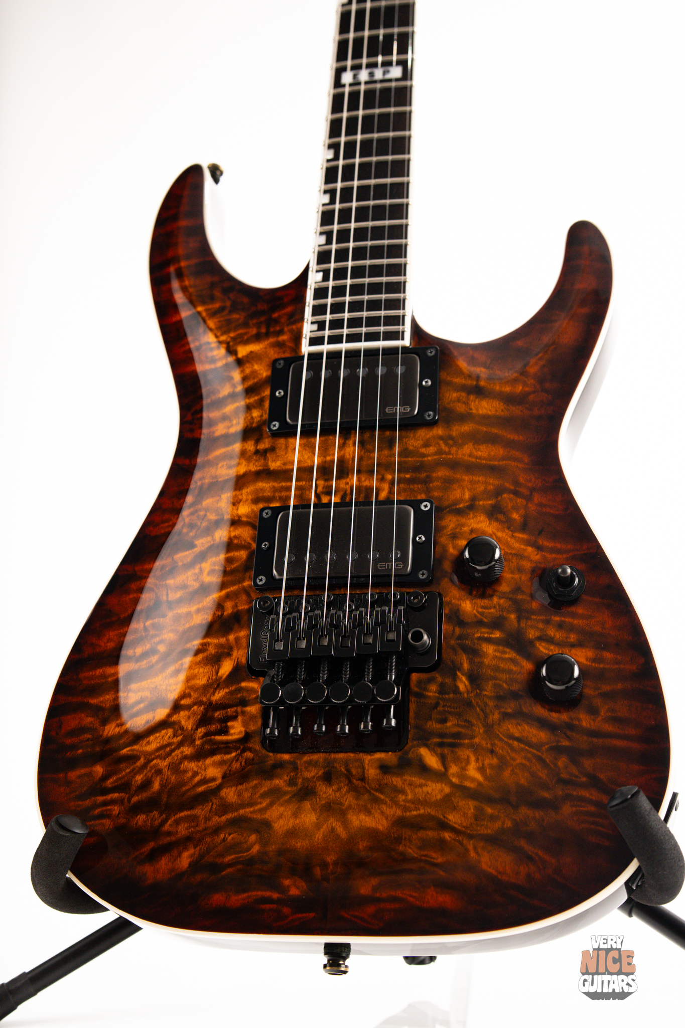 This guitar comes equipped with the top-of-the-line, German-made Floyd Rose Original, with a hardened steel baseplate and saddles along with a nickel-plated brass sustain block. The result? Exceptional durability, tuning stability and impressive sustain. Visually, the guitar’s clean, minimalist design is beautifully contrasted by a Quilted Maple top in a stunning Tiger Eye Sunburst finish. The ebony fretboard paired with a maple neck delivers a classic tonewood combination for metal – offering a snappy attack and a smooth, fast-playing feel. Subtle offset rectangular inlays add an extra touch of class. Tone-wise, it’s loaded with a set of active EMG 66 and 57 humbuckers in Brushed Black Chrome. These pickups deliver tight, heavy rhythm tones and clear, dynamic cleans, with enhanced low end and smoother highs compared to traditional active sets.