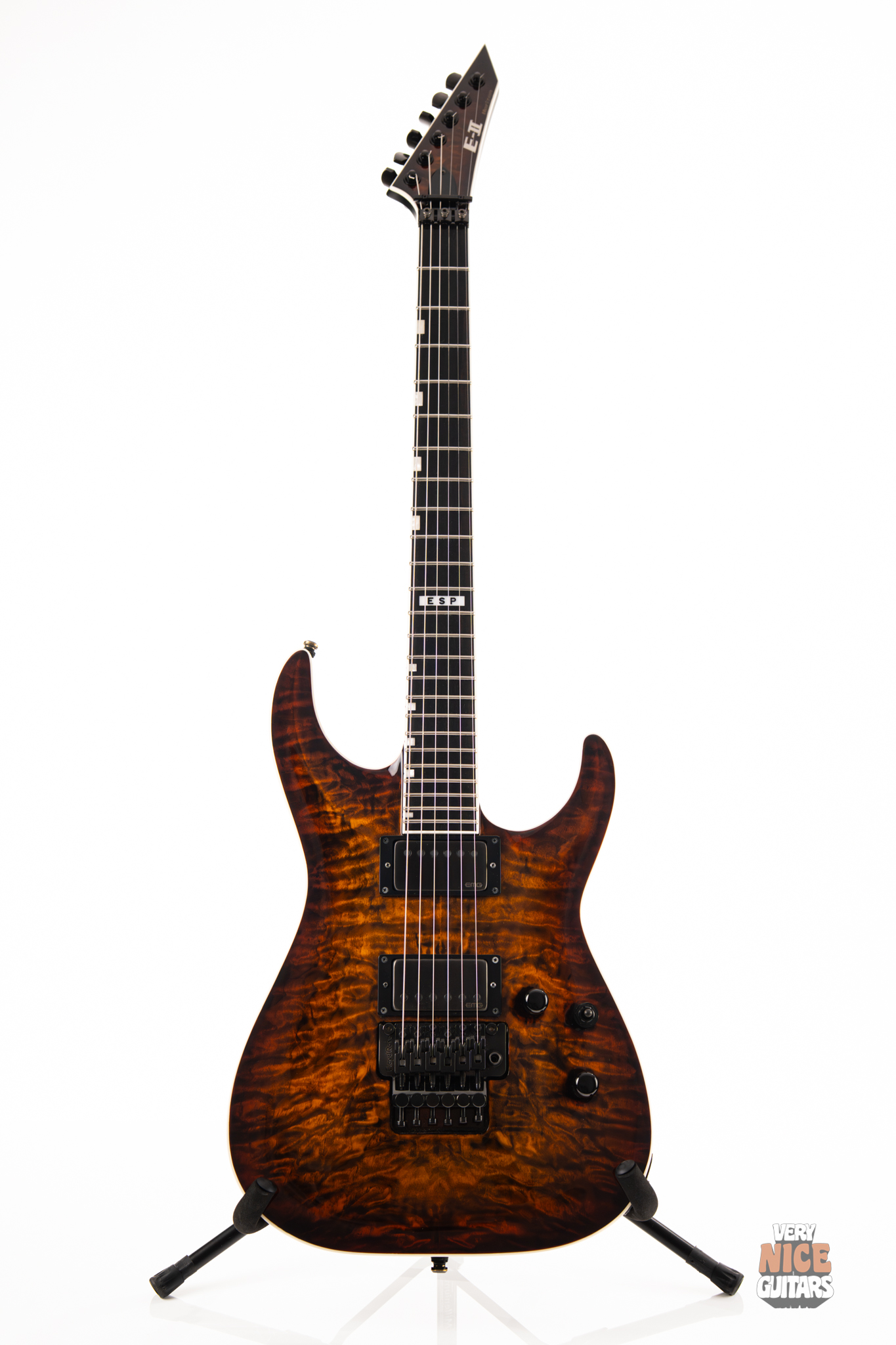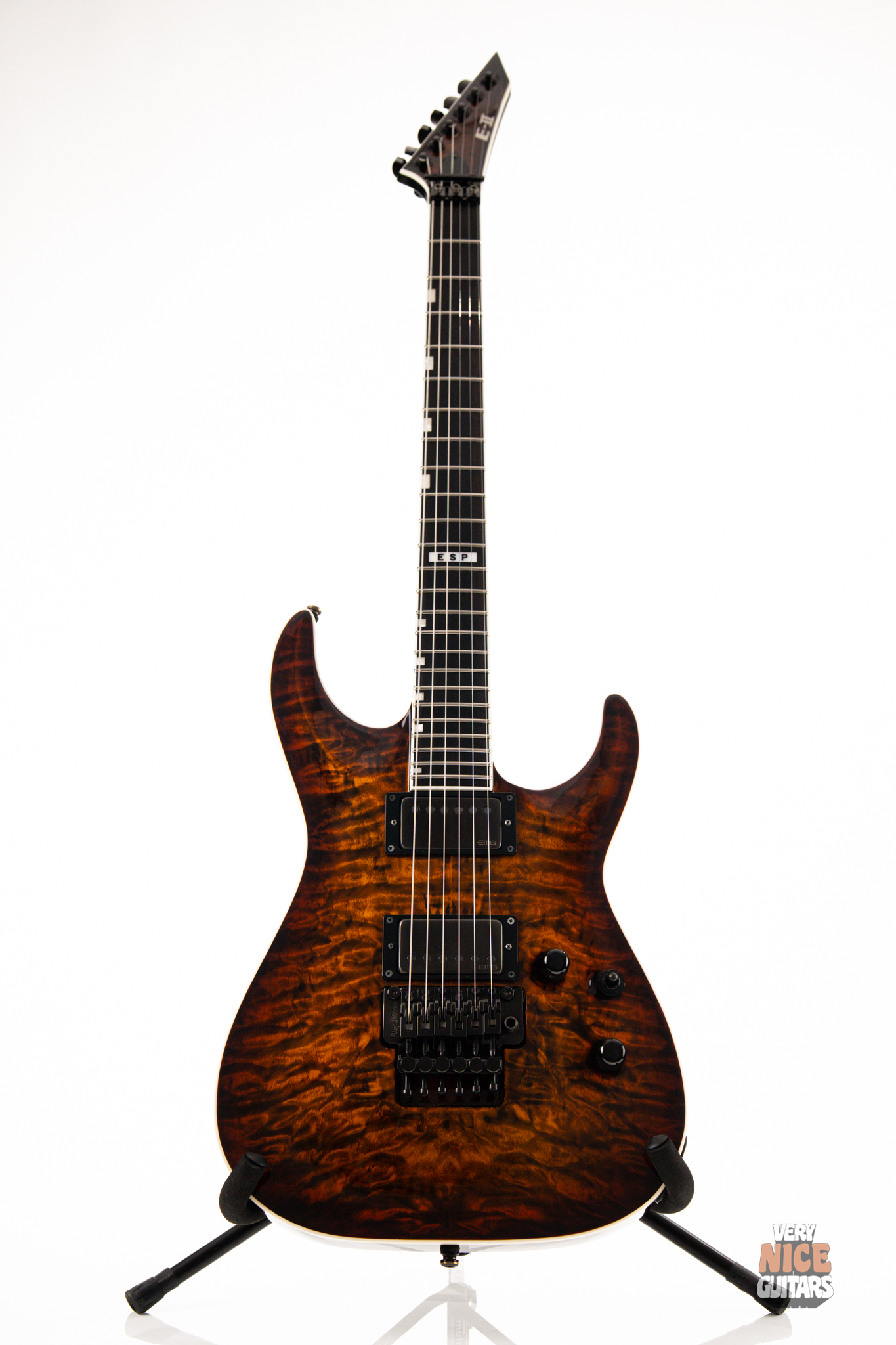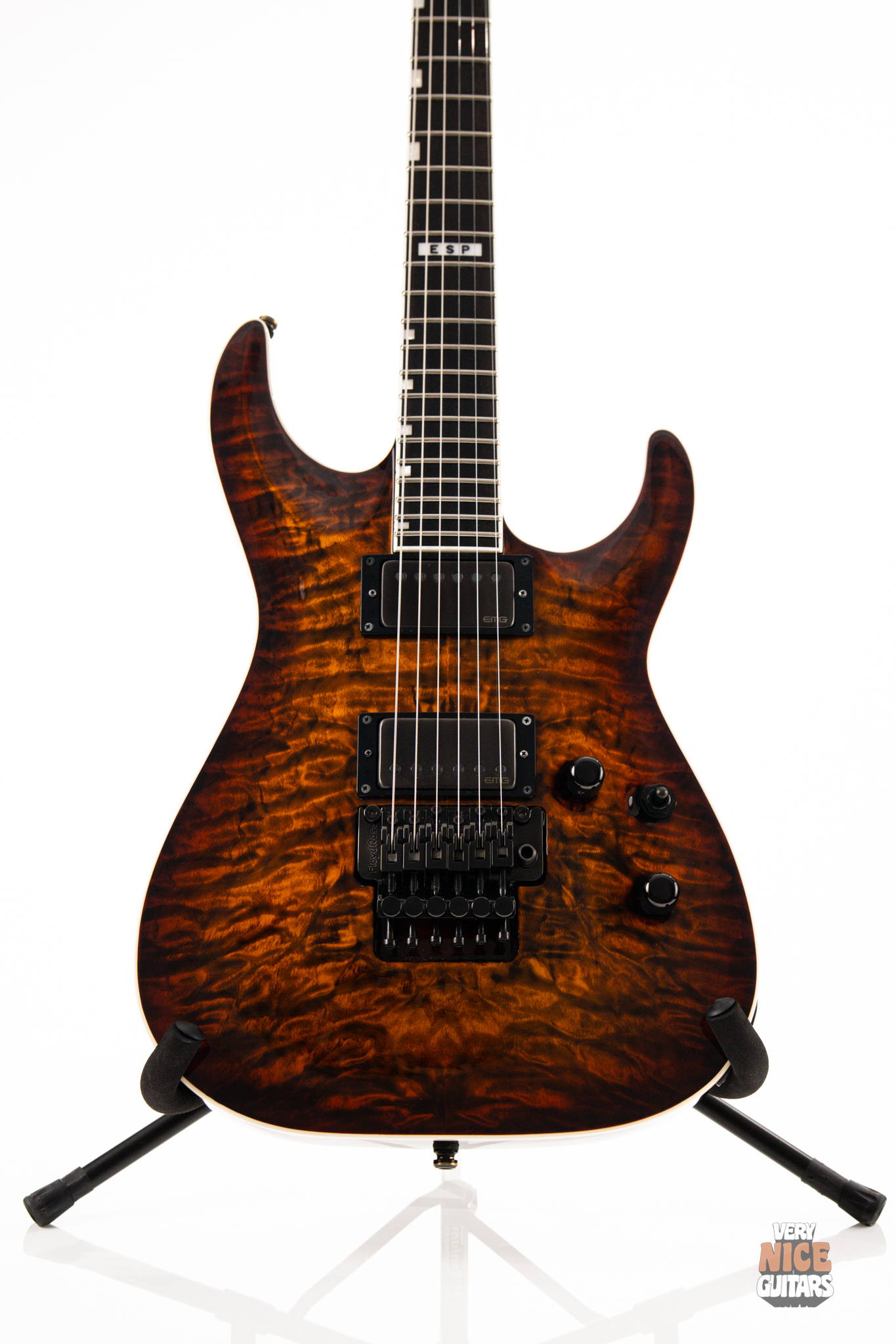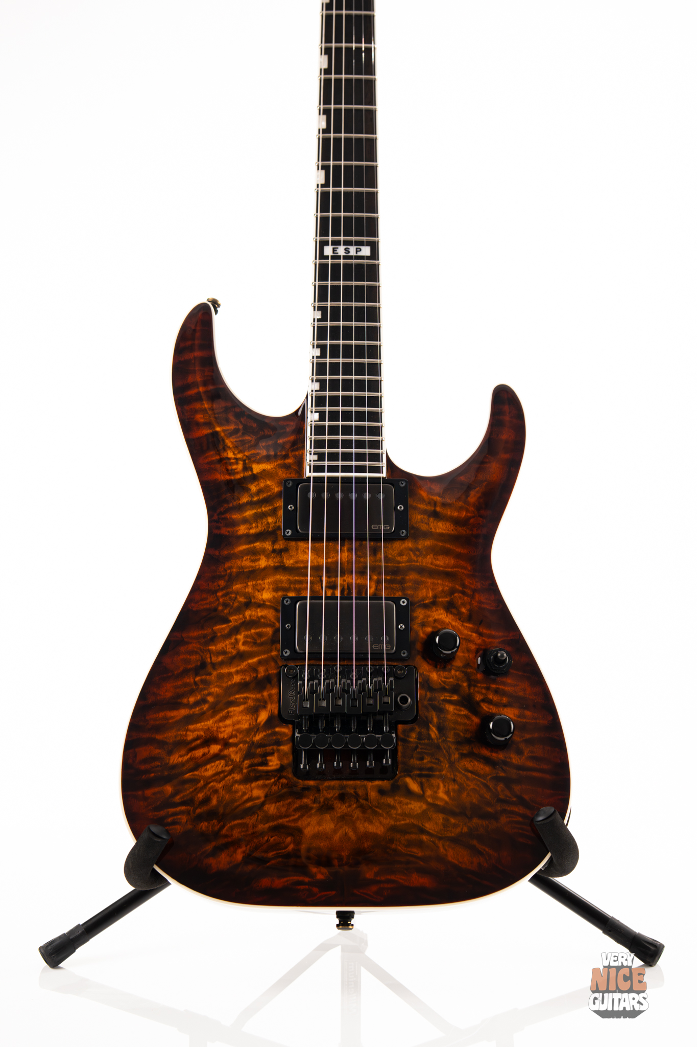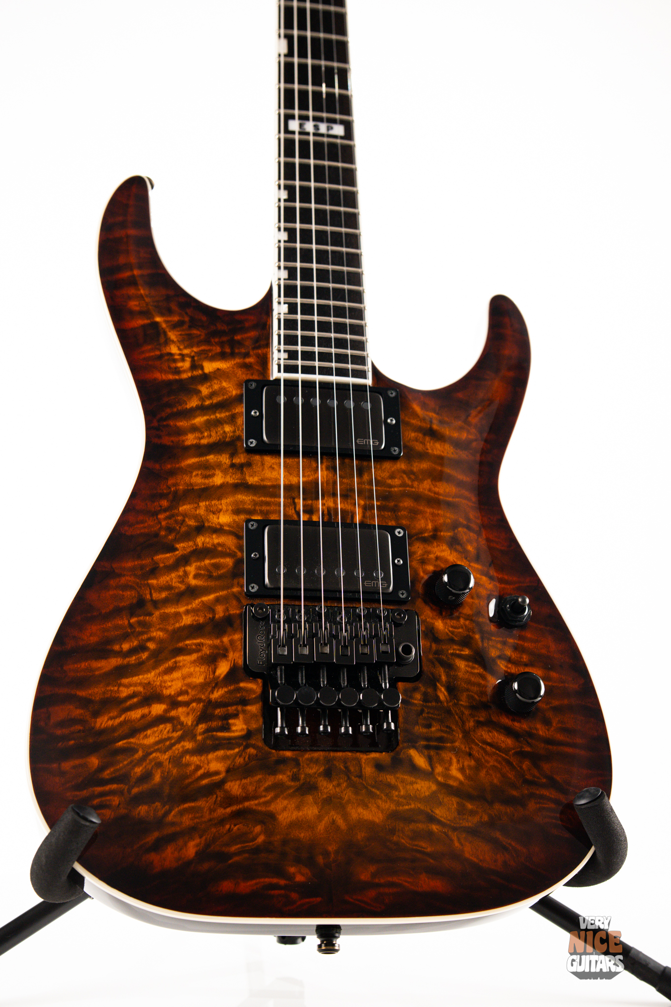 This guitar comes equipped with the top-of-the-line, German-made Floyd Rose Original, with a hardened steel baseplate and saddles along with a nickel-plated brass sustain block. The result? Exceptional durability, tuning stability and impressive sustain. Visually, the guitar’s clean, minimalist design is beautifully contrasted by a Quilted Maple top in a stunning Tiger Eye Sunburst finish. The ebony fretboard paired with a maple neck delivers a classic tonewood combination for metal – offering a snappy attack and a smooth, fast-playing feel. Subtle offset rectangular inlays add an extra touch of class. Tone-wise, it’s loaded with a set of active EMG 66 and 57 humbuckers in Brushed Black Chrome. These pickups deliver tight, heavy rhythm tones and clear, dynamic cleans, with enhanced low end and smoother highs compared to traditional active sets.