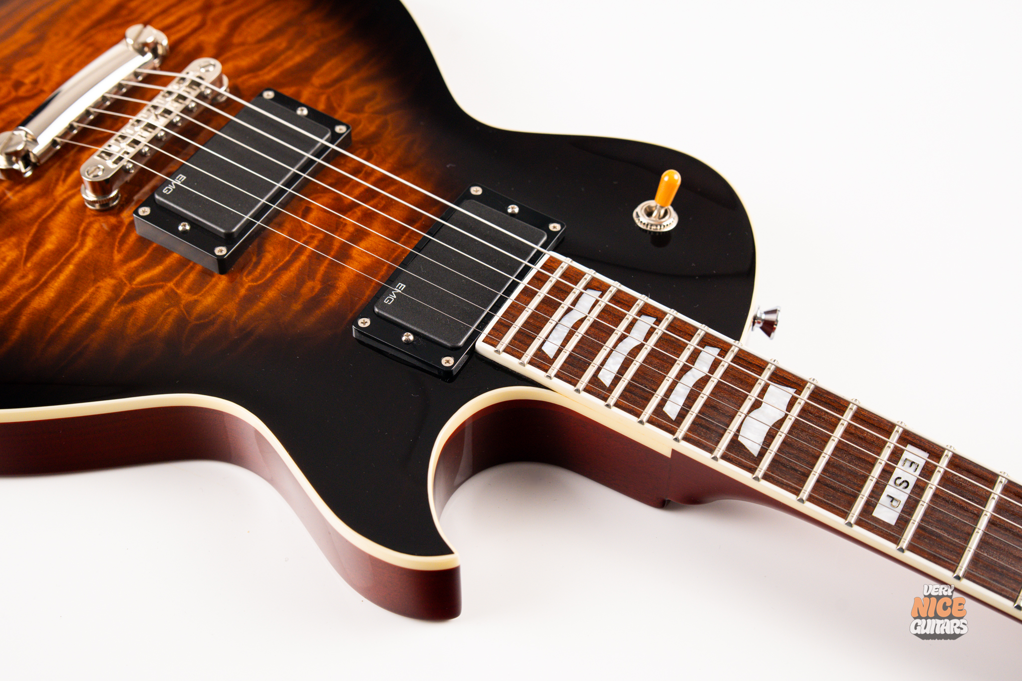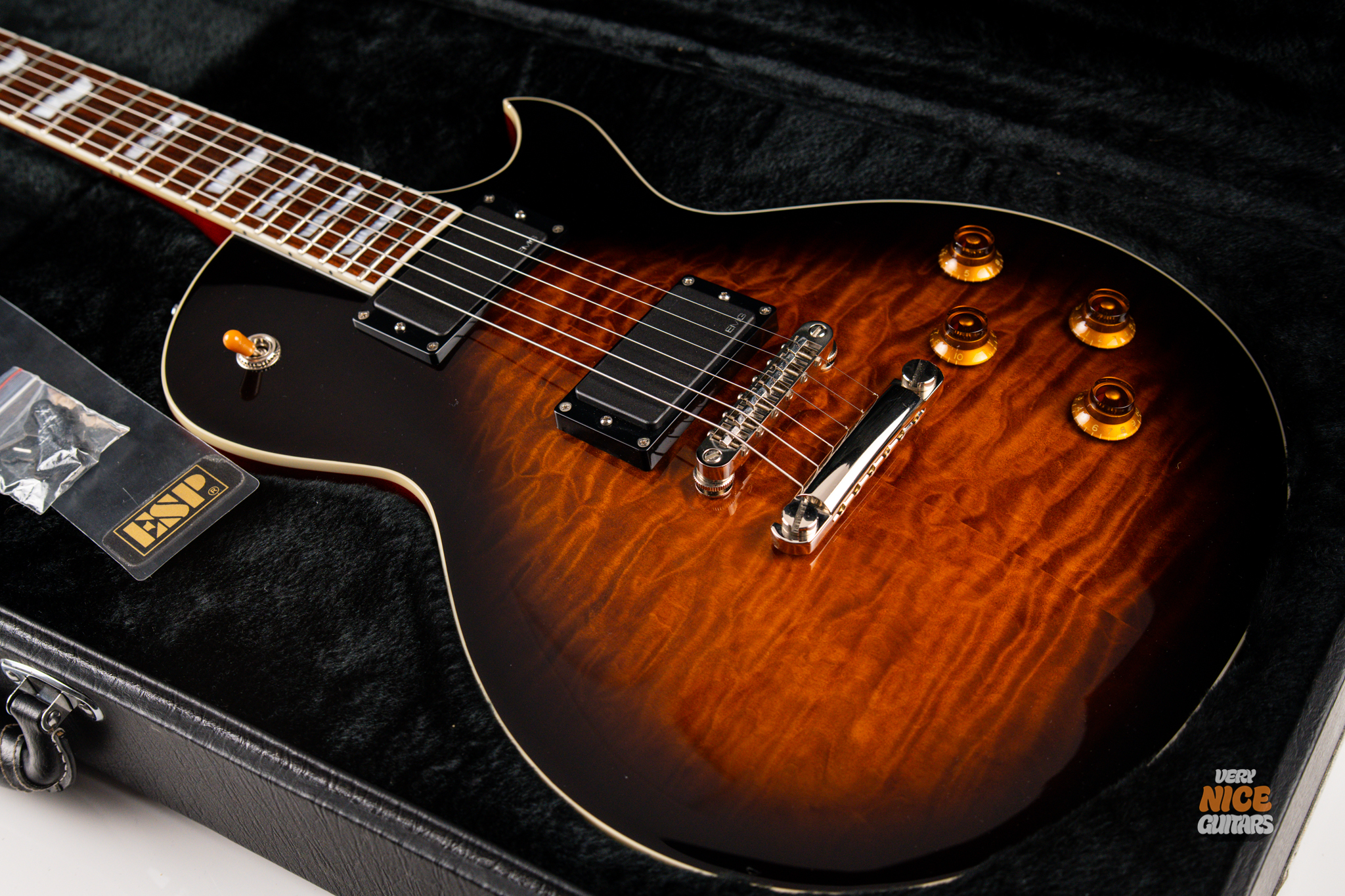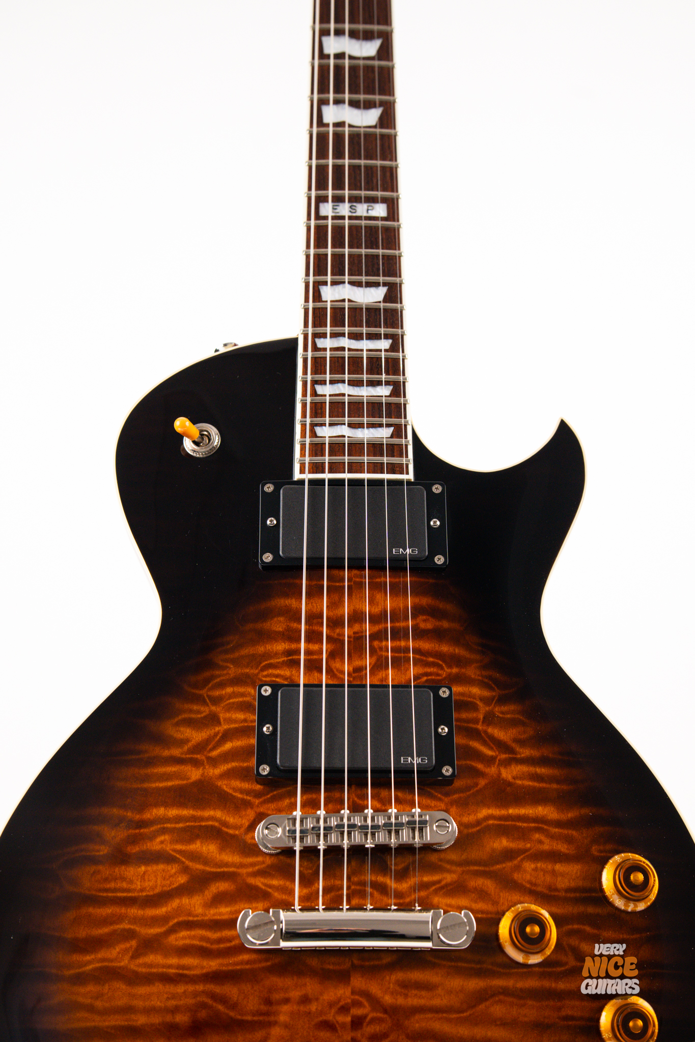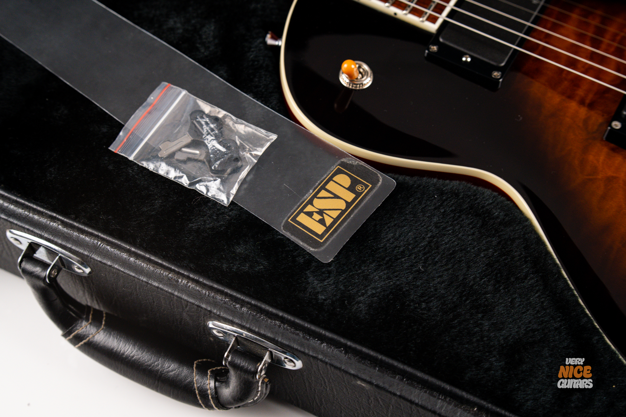 This unique and quite rare “pre-lawsuit” Eclipse is a Standard Series ESP made in Japan. It features a mahogany body and neck with a rosewood fingerboard. 22 extra jumbo frets make playing easy and comfortable. As in most LP shape guitars you get a tune-o-matic style bridge with stop tail. Tuners are high quality Spretzel locking. For the pickups you get a pair of active EMG 81s, delivering punchy tones suitable for everything from rock to the heaviest of metal genres. Unlike in current Eclipse models, here you get 4 knobs, volume and tone for each pickup, making it more akin to the old school single cut models. This guitar features a very elegant looking Dark Brown Sunburst finish and amber top hat knobs, making the whole guitar look classy but with a bit of edginess.