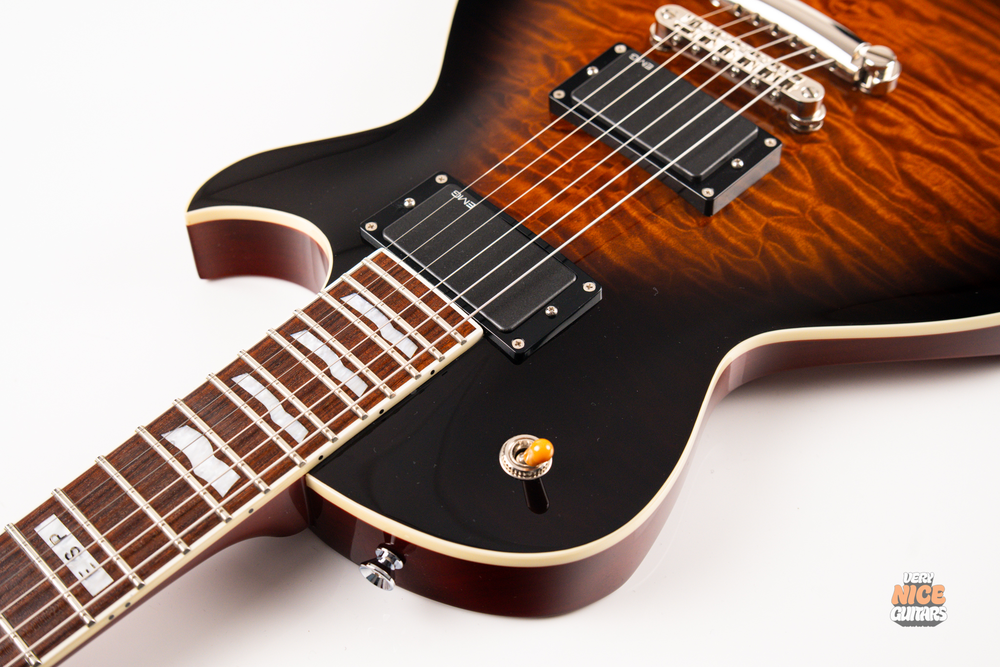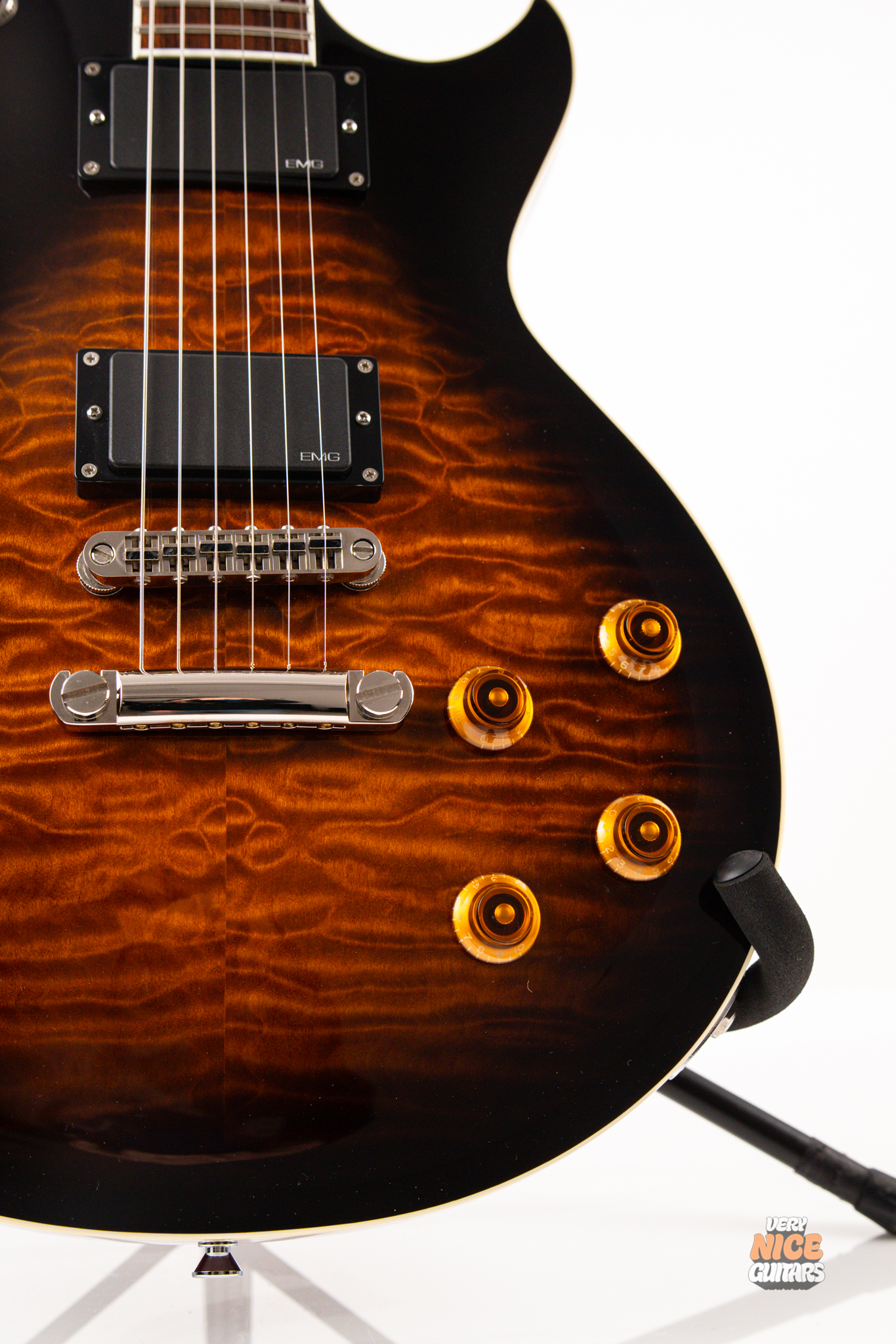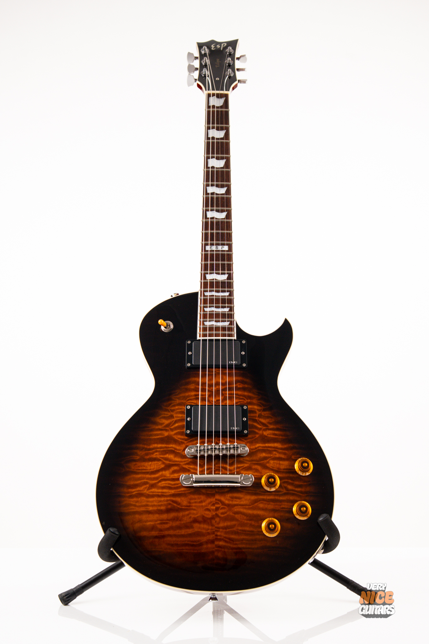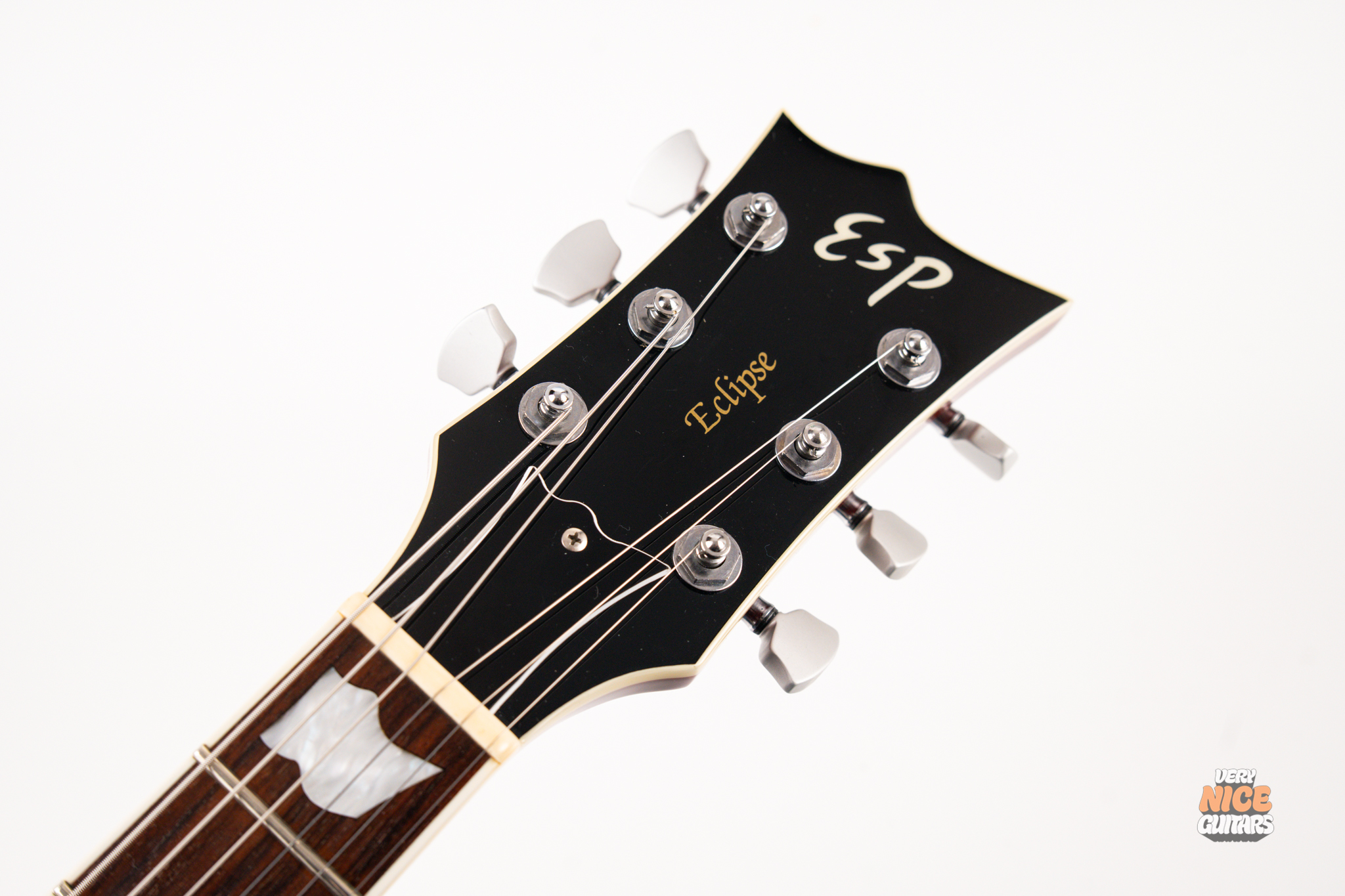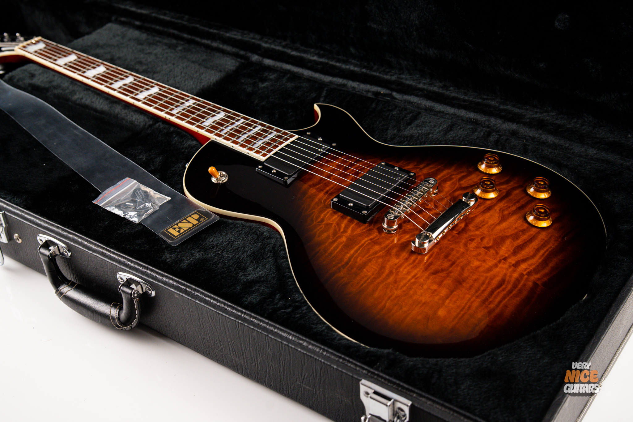 This unique and quite rare “pre-lawsuit” Eclipse is a Standard Series ESP made in Japan. It features a mahogany body and neck with a rosewood fingerboard. 22 extra jumbo frets make playing easy and comfortable. As in most LP shape guitars you get a tune-o-matic style bridge with stop tail. Tuners are high quality Spretzel locking. For the pickups you get a pair of active EMG 81s, delivering punchy tones suitable for everything from rock to the heaviest of metal genres. Unlike in current Eclipse models, here you get 4 knobs, volume and tone for each pickup, making it more akin to the old school single cut models. This guitar features a very elegant looking Dark Brown Sunburst finish and amber top hat knobs, making the whole guitar look classy but with a bit of edginess.