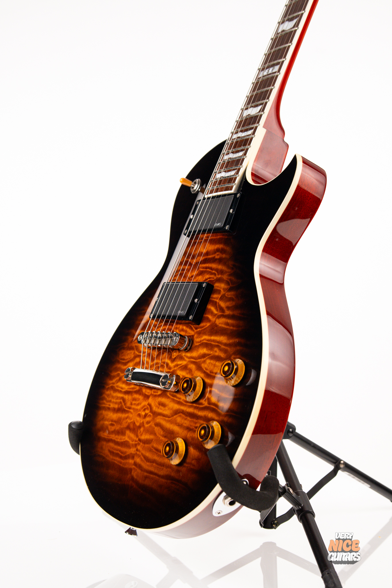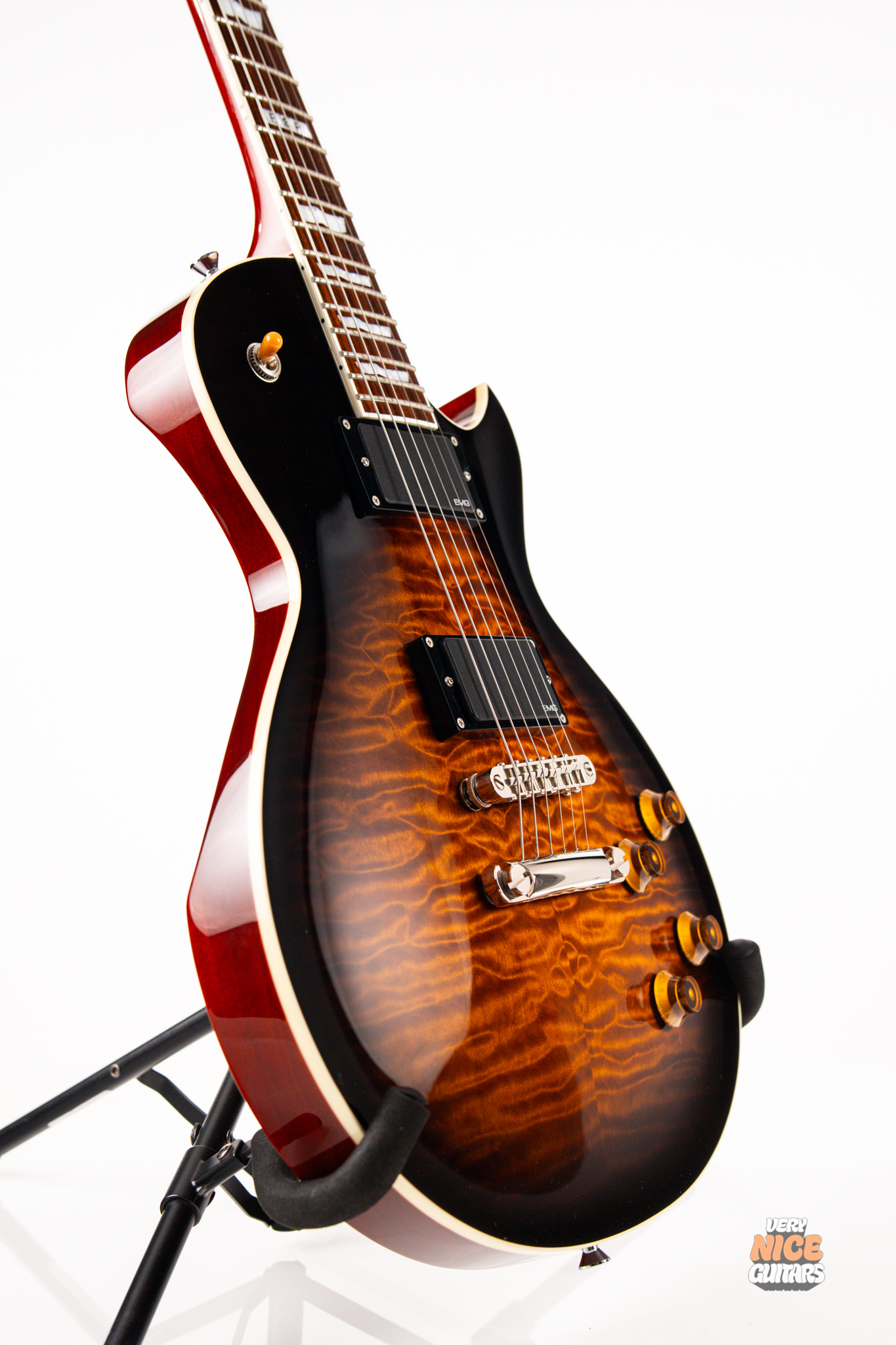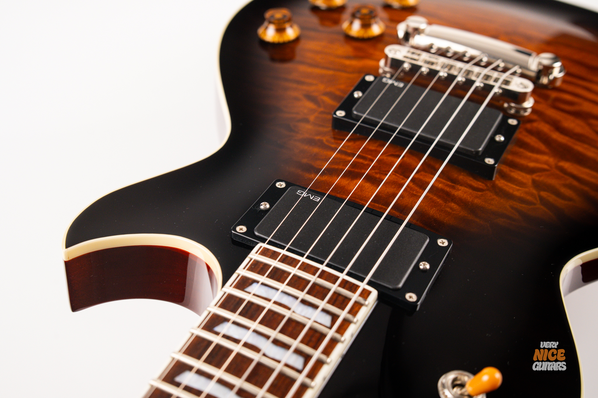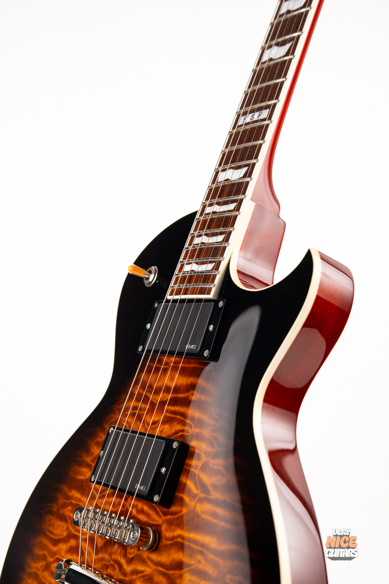 This unique and quite rare “pre-lawsuit” Eclipse is a Standard Series ESP made in Japan. It features a mahogany body and neck with a rosewood fingerboard. 22 extra jumbo frets make playing easy and comfortable. As in most LP shape guitars you get a tune-o-matic style bridge with stop tail. Tuners are high quality Spretzel locking. For the pickups you get a pair of active EMG 81s, delivering punchy tones suitable for everything from rock to the heaviest of metal genres. Unlike in current Eclipse models, here you get 4 knobs, volume and tone for each pickup, making it more akin to the old school single cut models. This guitar features a very elegant looking Dark Brown Sunburst finish and amber top hat knobs, making the whole guitar look classy but with a bit of edginess.