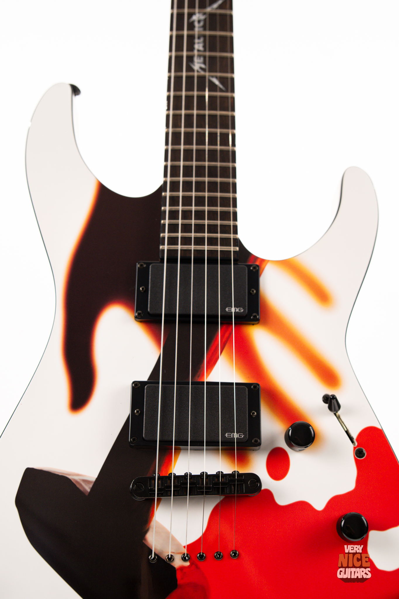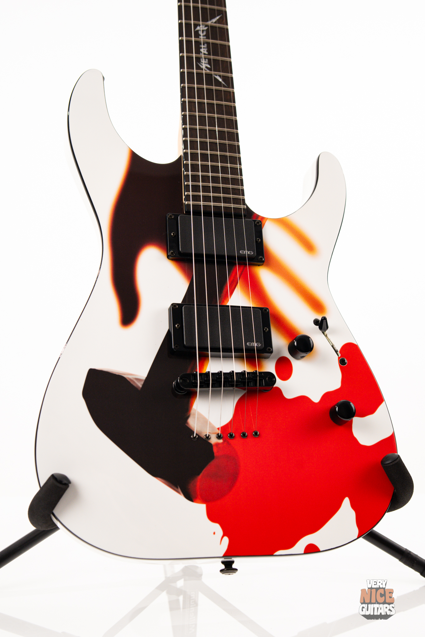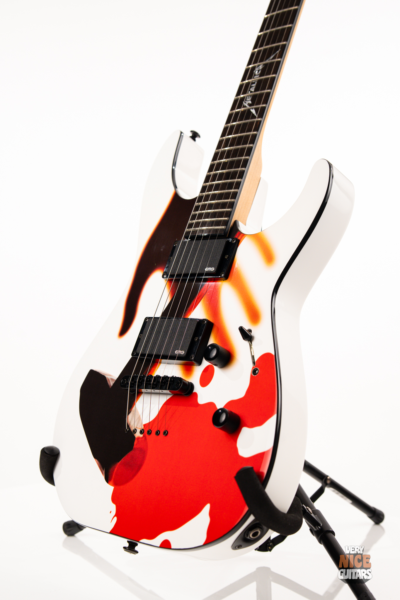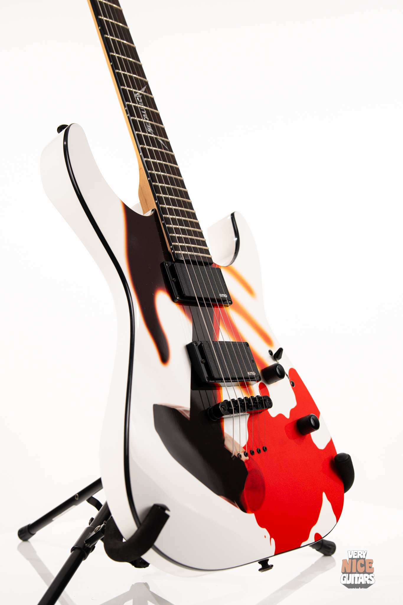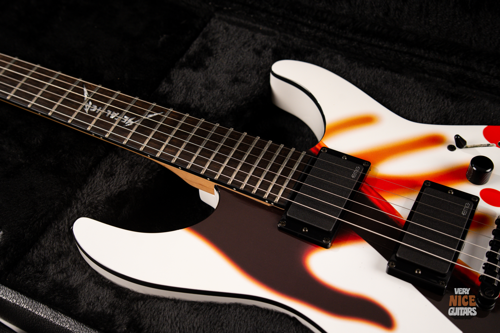 Metallica fans, rejoice! Beyond its wild visuals that pay homage to the legendary Kill ’Em All album, this guitar is, at its core, a modern Superstrat built for performance. It features a bolt-on neck construction, a sleek ebony fretboard with a custom Metallica inlay, and a lightweight alder body paired with a super-comfy C-shaped neck. Loaded with an EMG 81 set of active pickups, this axe is built to tear through your favorite Metallica riffs and solos with precision and power. Don’t be fooled by its collector’s status – this guitar is ready to perform and record, whether on stage or in the studio.