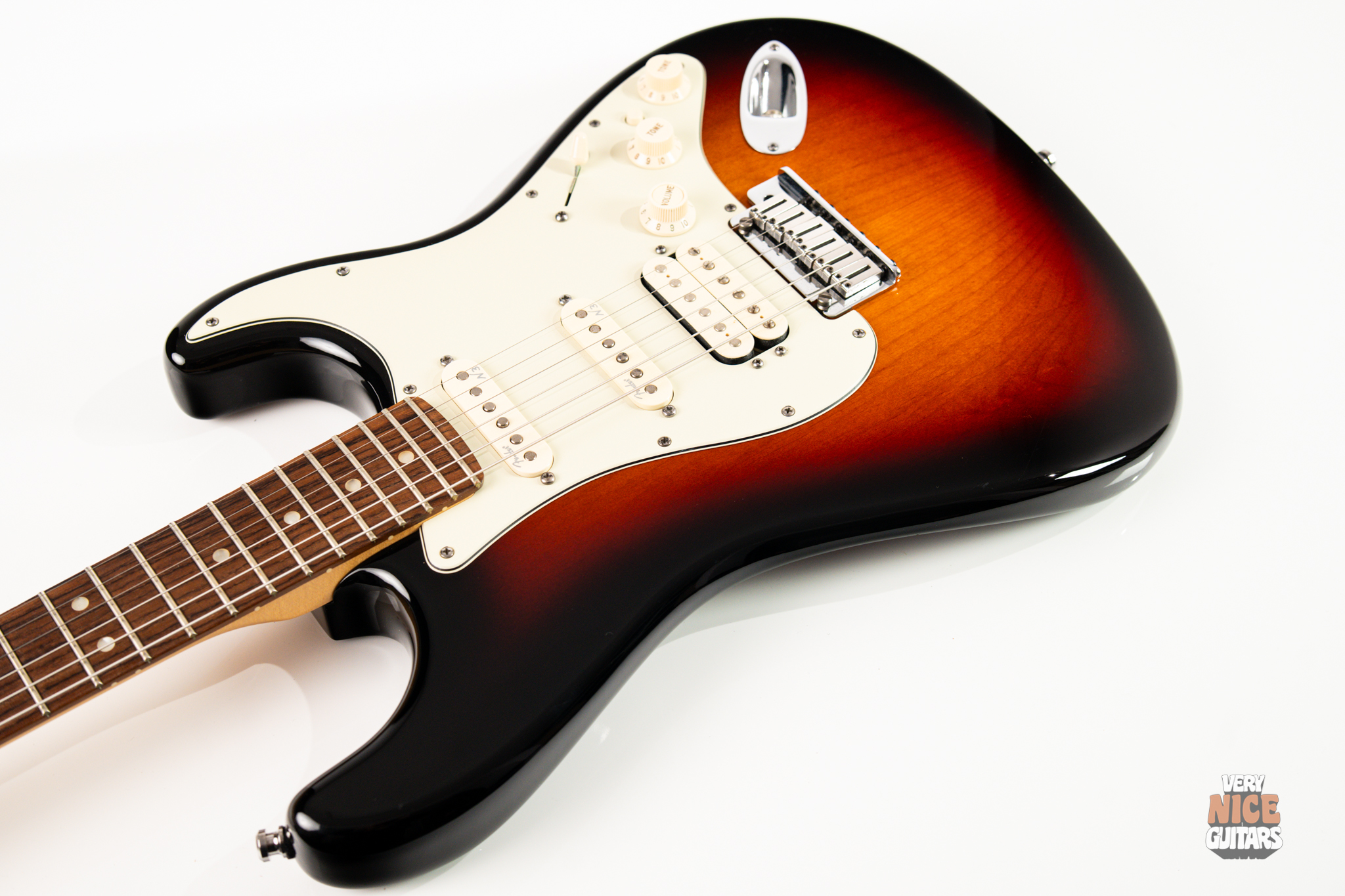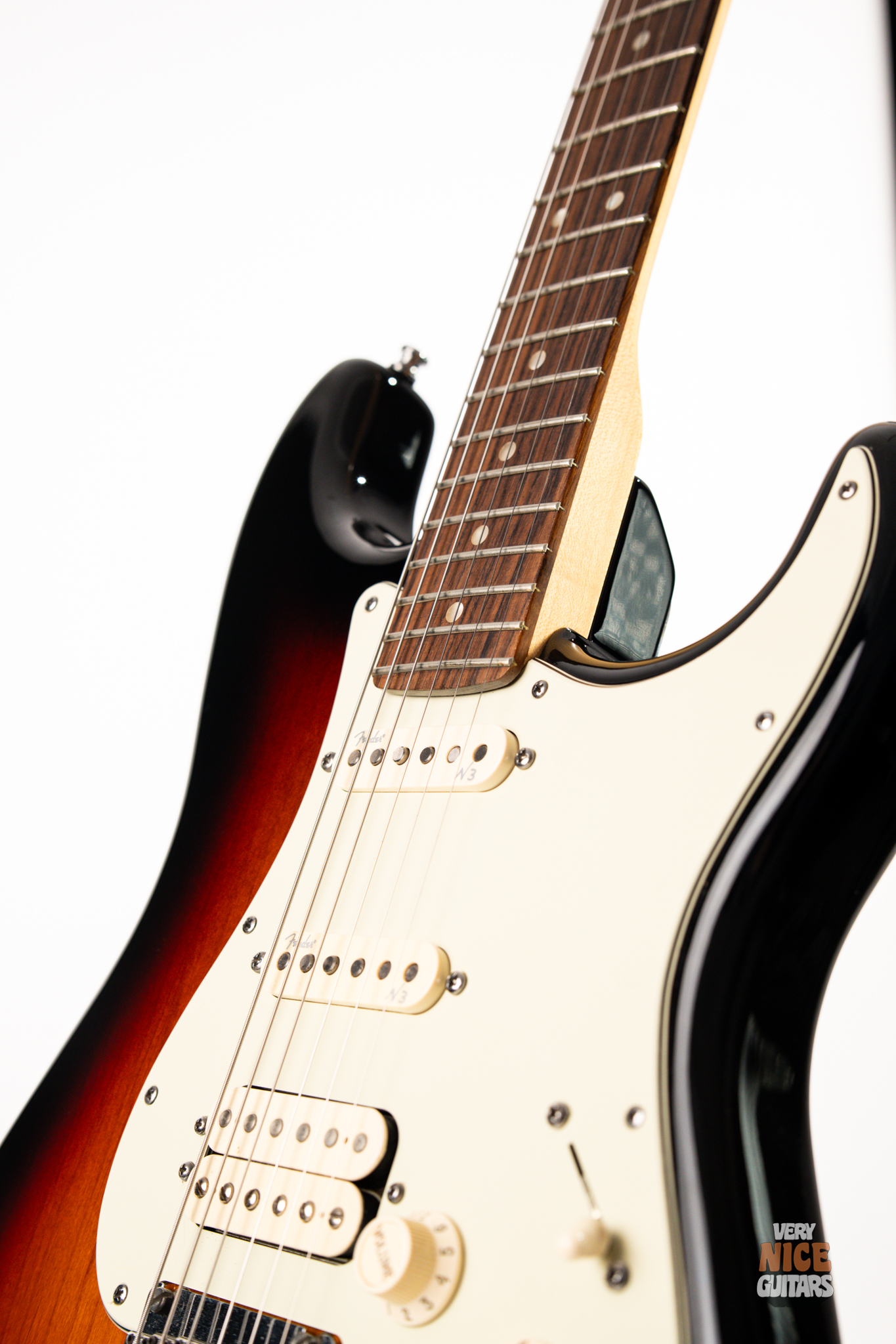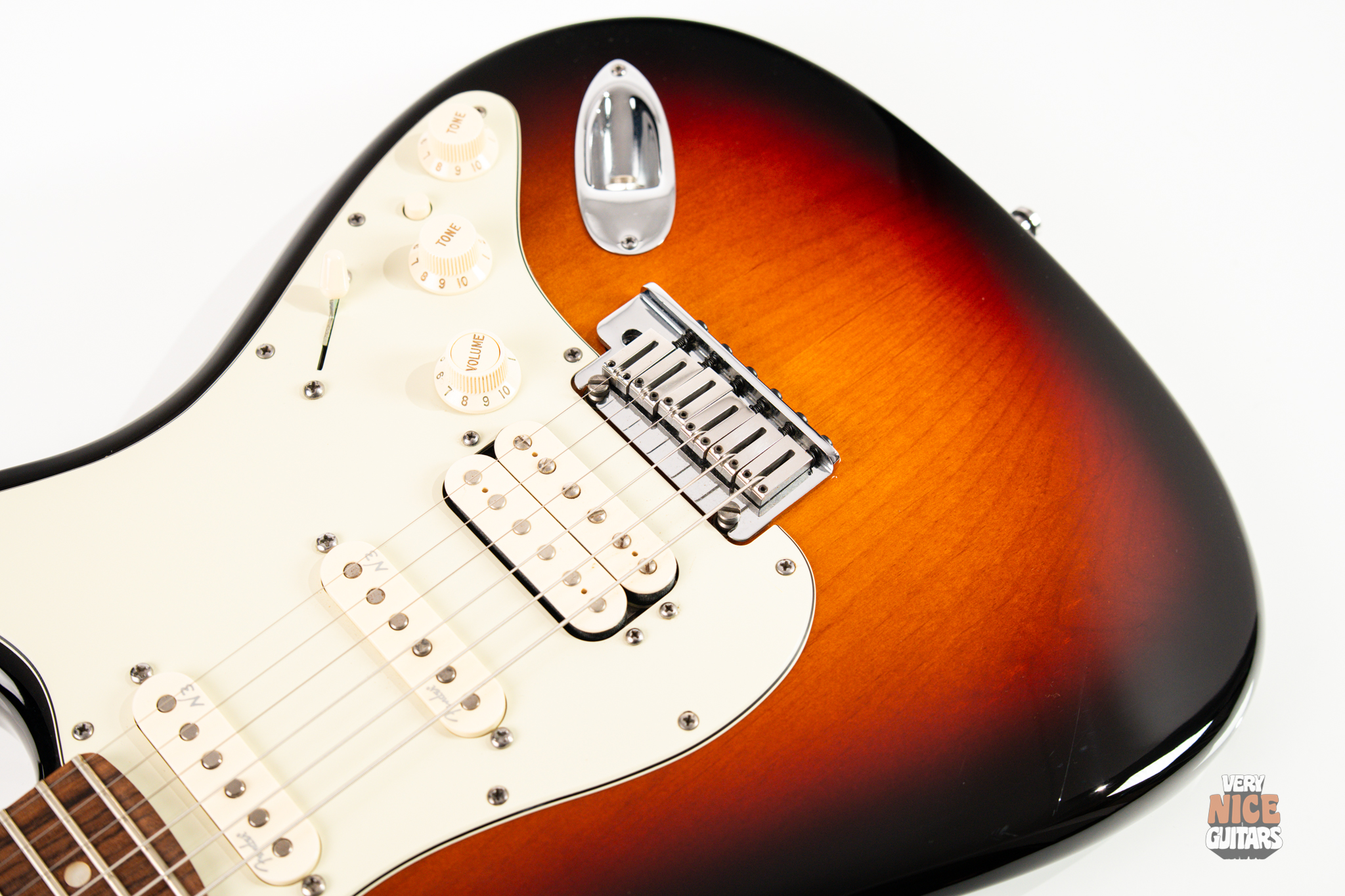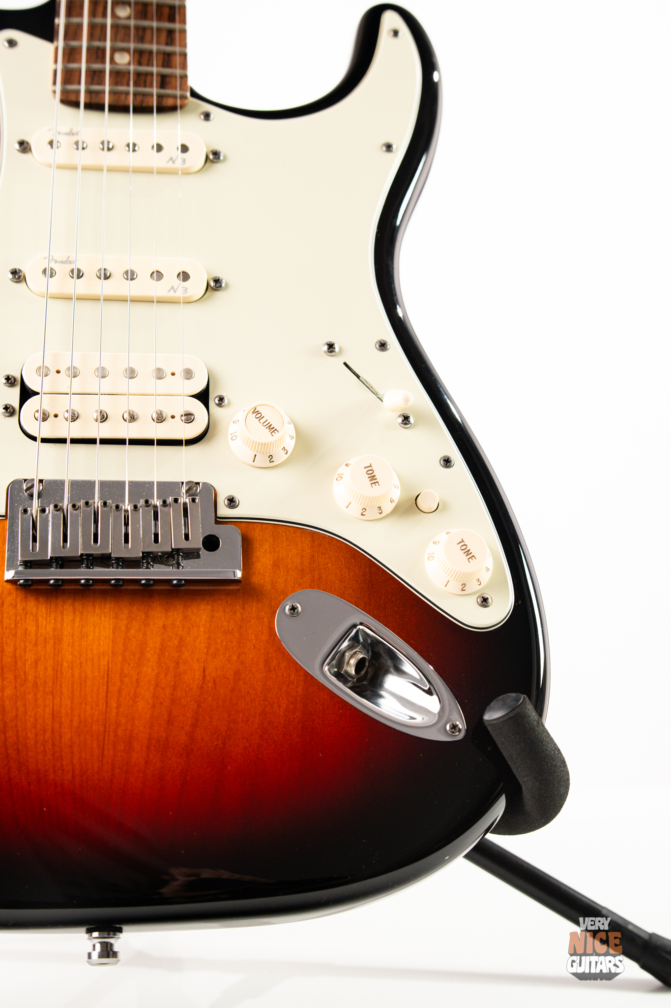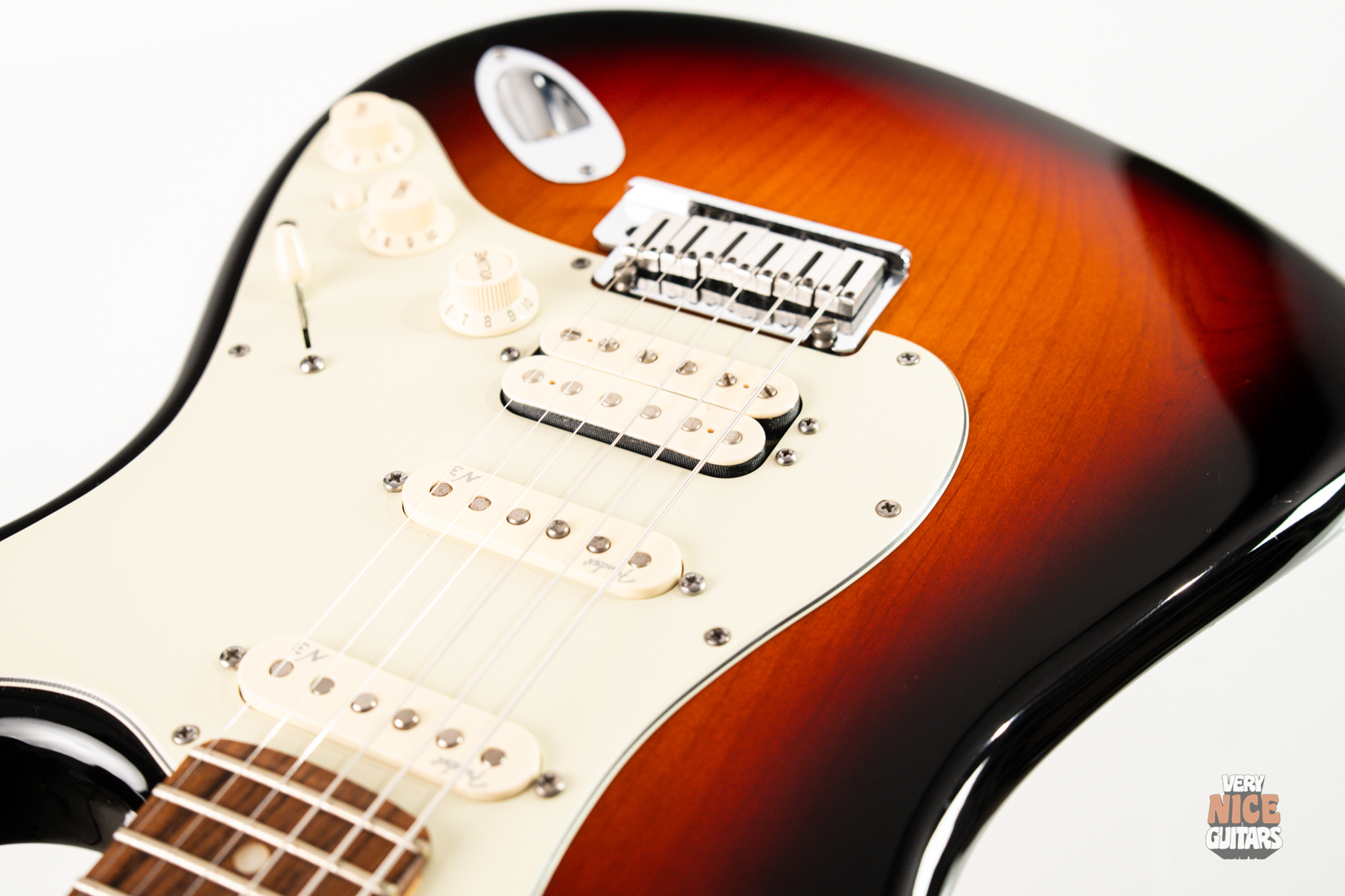 This American Deluxe Strat merges two worlds of traditional design and modern, sophisticated features. Alder body finished in 3 tone sunburst and a maple neck with rosewood fingerboard are things you’d expect to see on a regular strat but what’s under the hood is more special. Deluxe Synchronised Tremolo, LSR Roller nut and locking tuners provide ultimate tuning stability even with an extensive tremolo use. The sweet sounding set of HSS pickups consists of two Noiseless N3 single coils in the neck and middle position and a powerful Atomic Humbucking pickup in the bridge. The controls are master volume with an S-1 Switch, tone for the neck and tone for the middle and bridge pickups.