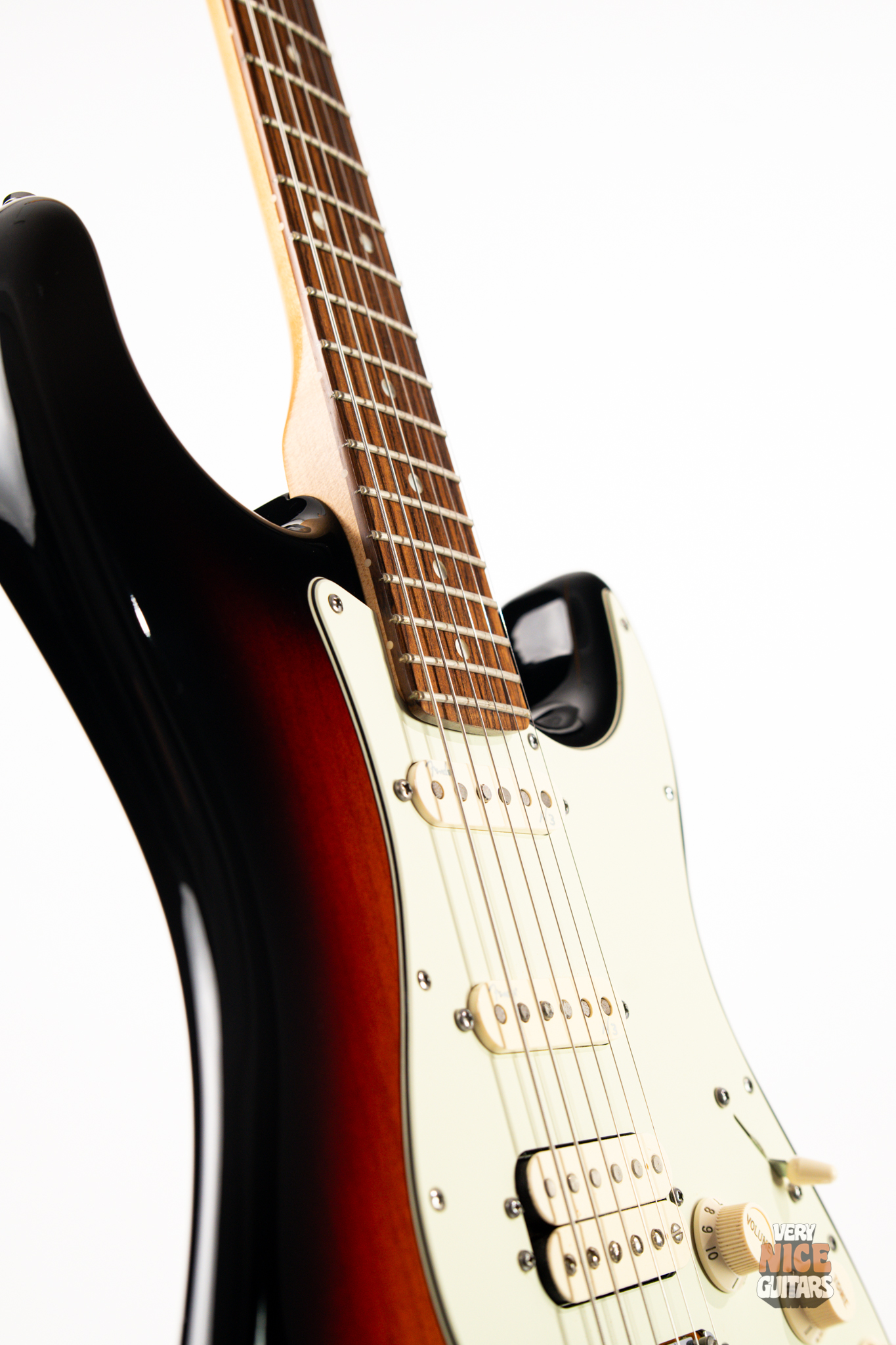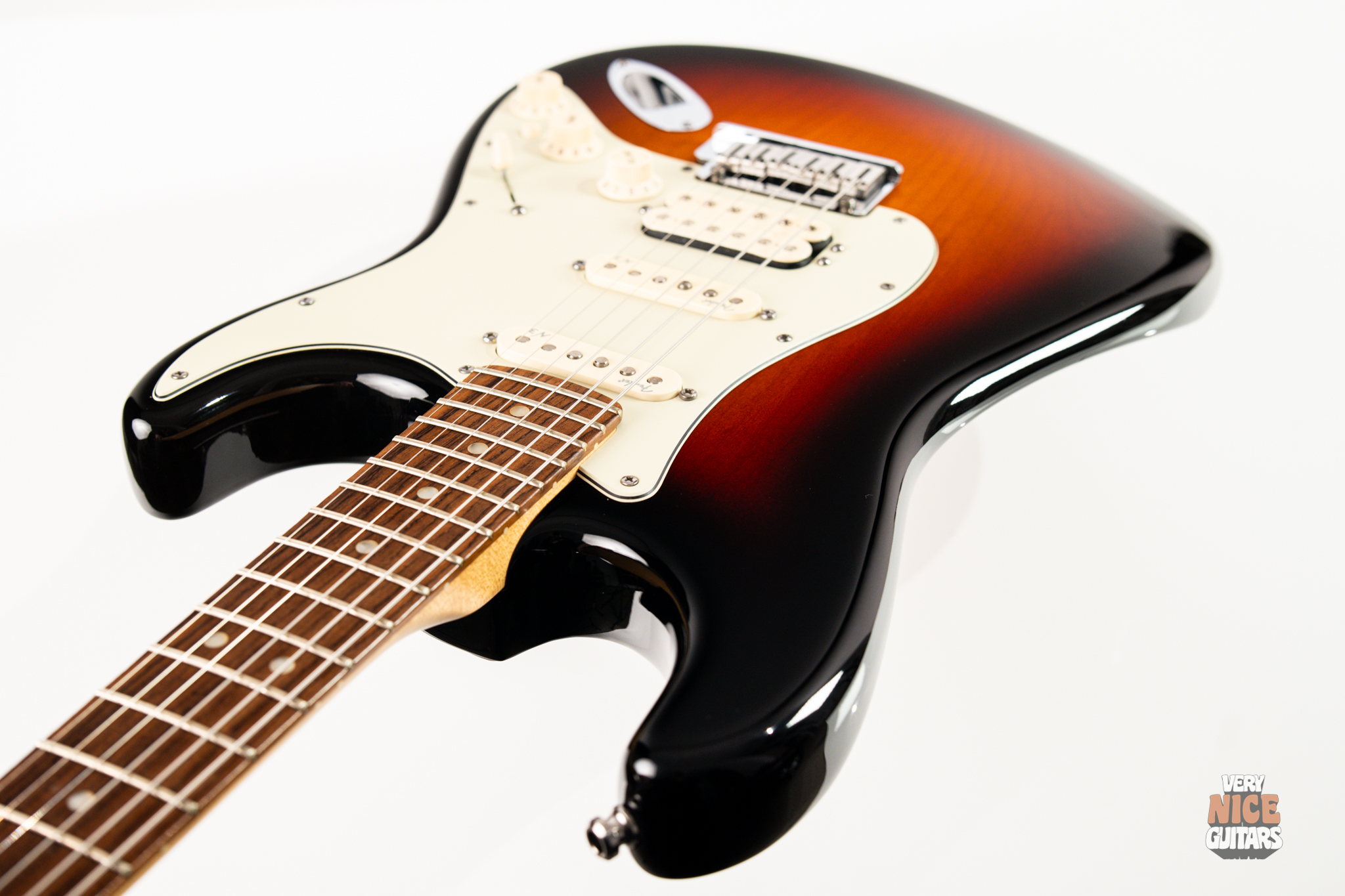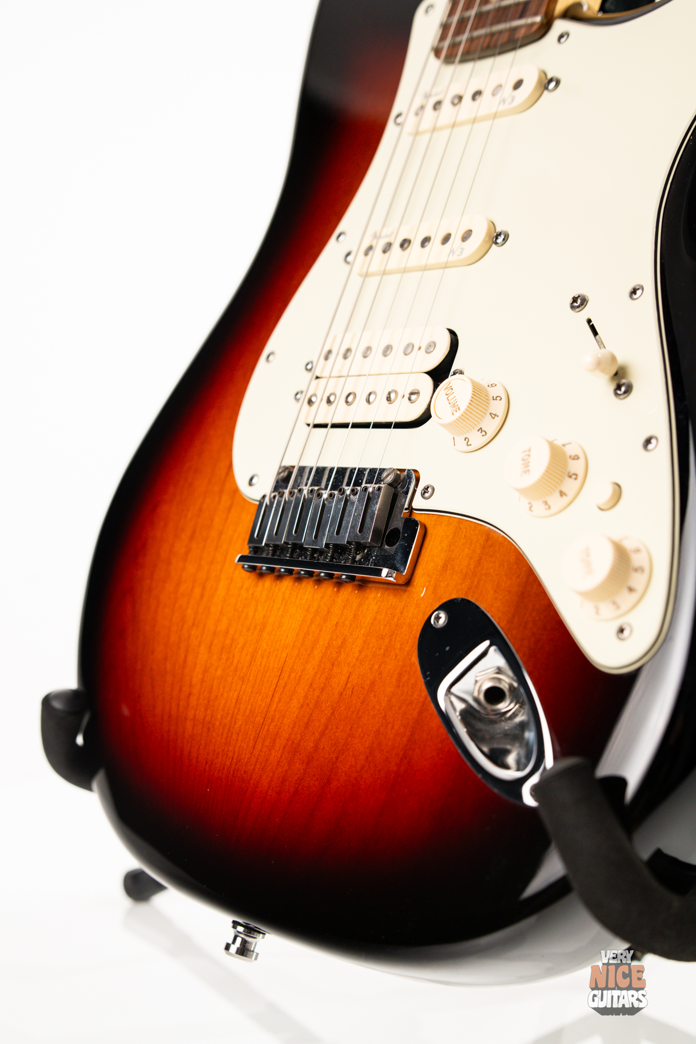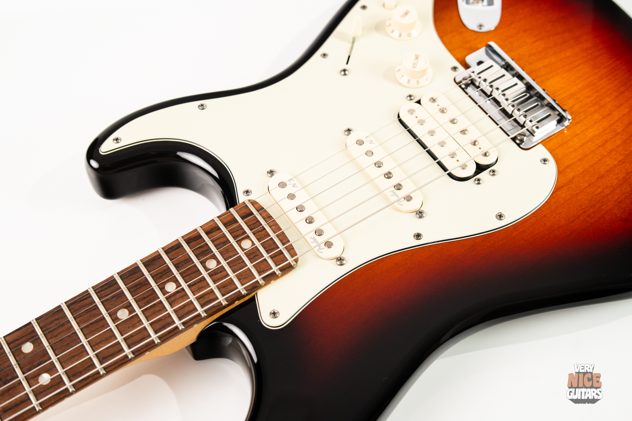 This American Deluxe Strat merges two worlds of traditional design and modern, sophisticated features. Alder body finished in 3 tone sunburst and a maple neck with rosewood fingerboard are things you’d expect to see on a regular strat but what’s under the hood is more special. Deluxe Synchronised Tremolo, LSR Roller nut and locking tuners provide ultimate tuning stability even with an extensive tremolo use. The sweet sounding set of HSS pickups consists of two Noiseless N3 single coils in the neck and middle position and a powerful Atomic Humbucking pickup in the bridge. The controls are master volume with an S-1 Switch, tone for the neck and tone for the middle and bridge pickups.