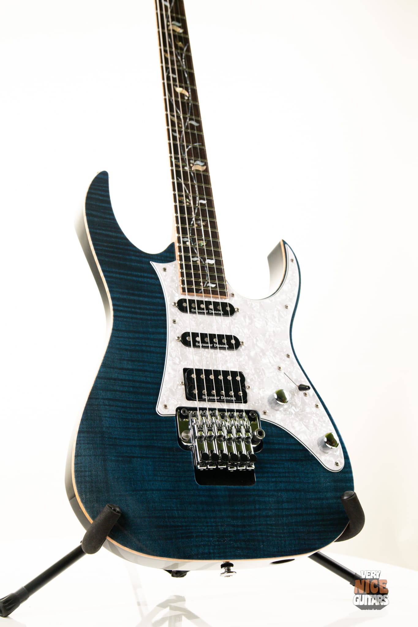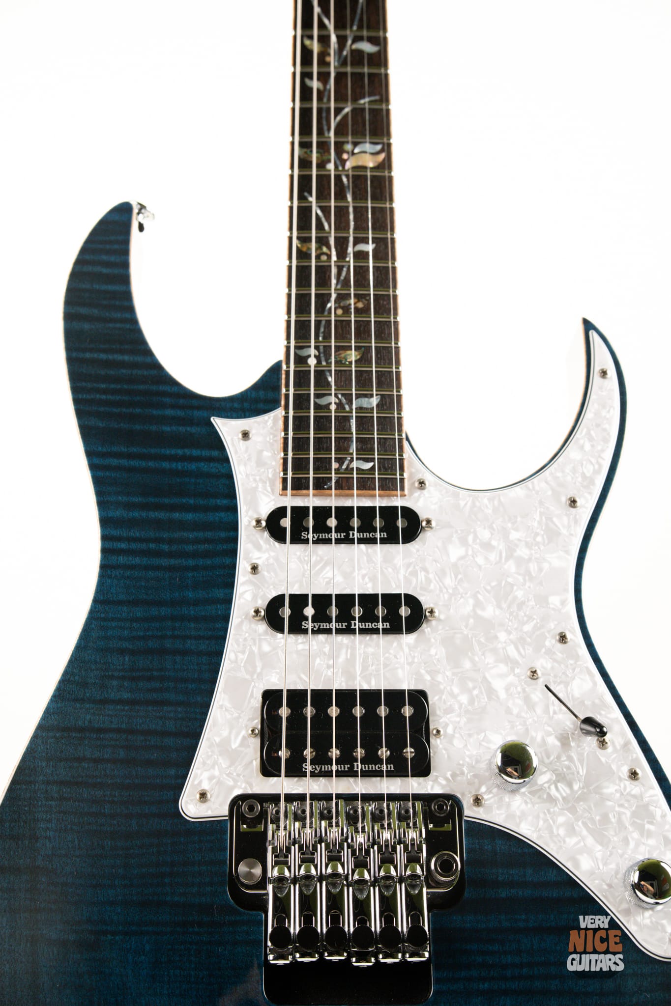 If you’re looking for a perfectly crafted Ibanez that showcases top-tier hardware and meticulous attention to detail, this guitar delivers – and then some. The craftsmanship is taken even further with stainless steel frets, ensuring a smooth, durable, and effortless playing experience. The Seymour Duncan pickups provide that classic Ibanez soar, balancing clarity and power. The Edge Zero tremolo system with the ZPS3 stabilizer allows for precise bends while preventing unwanted flutter. Prefer a more traditional feel? The stabilizer can easily be removed for that classic floating tremolo response. Every detail has been carefully considered – the tremolo features a built-in intonation adjustment screw and a convenient wheel for trem tension adjustment. The iconic Wizard neck is incredibly comfortable, built for effortless shredding and fluid playability. Of course, the Tree of Life inlay is proudly present, and the addition of Flame Maple binding makes this instrument as visually striking as it is sonically impressive.