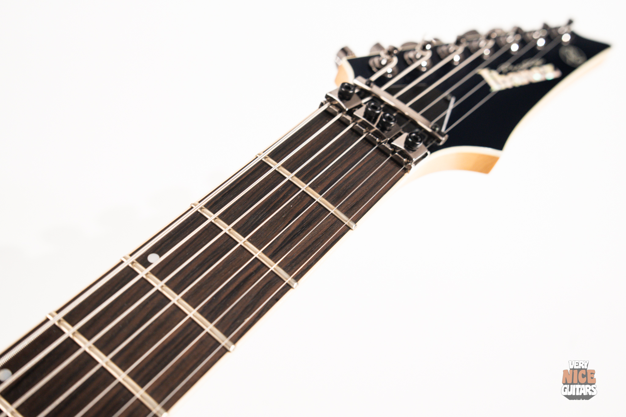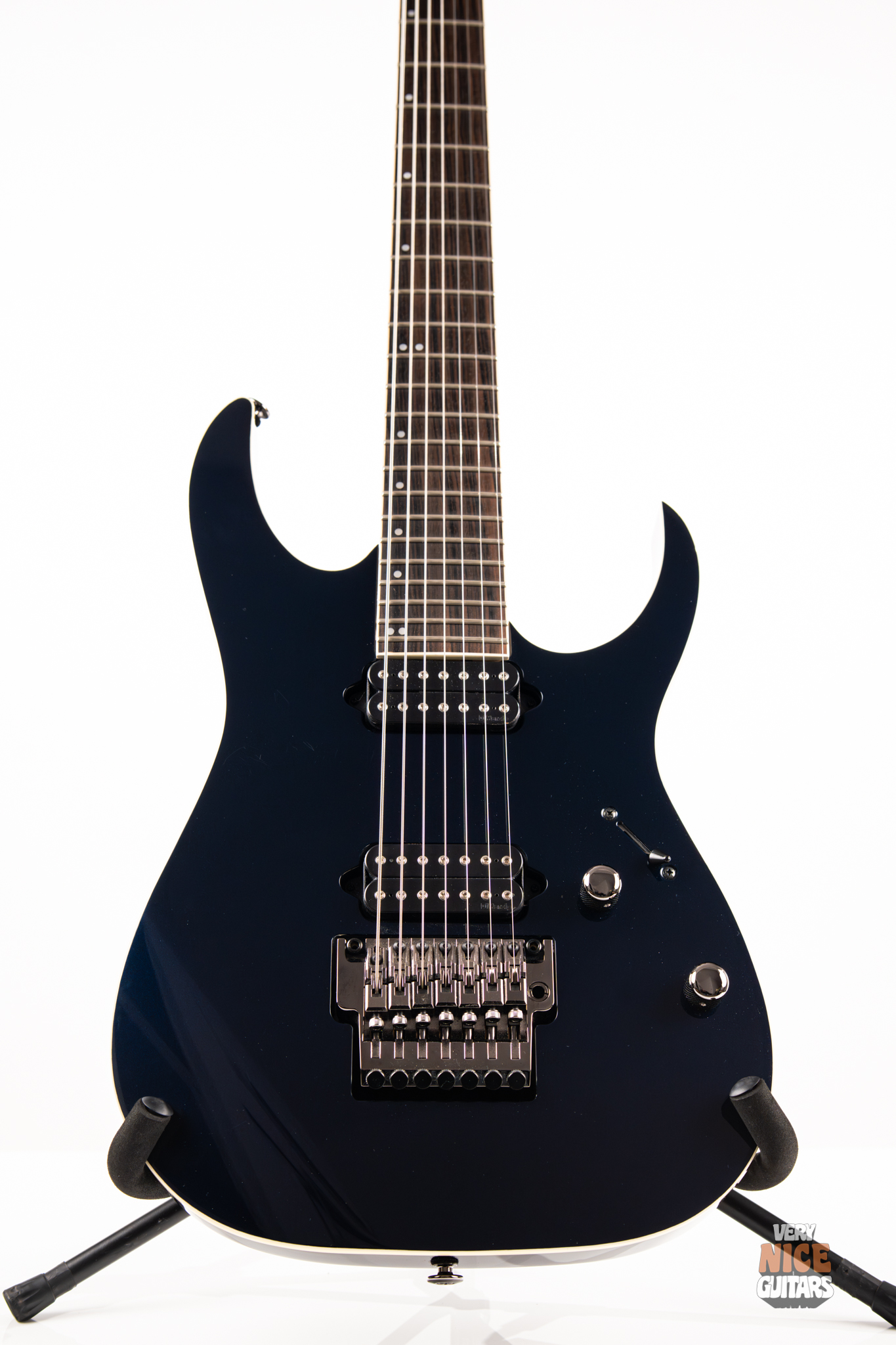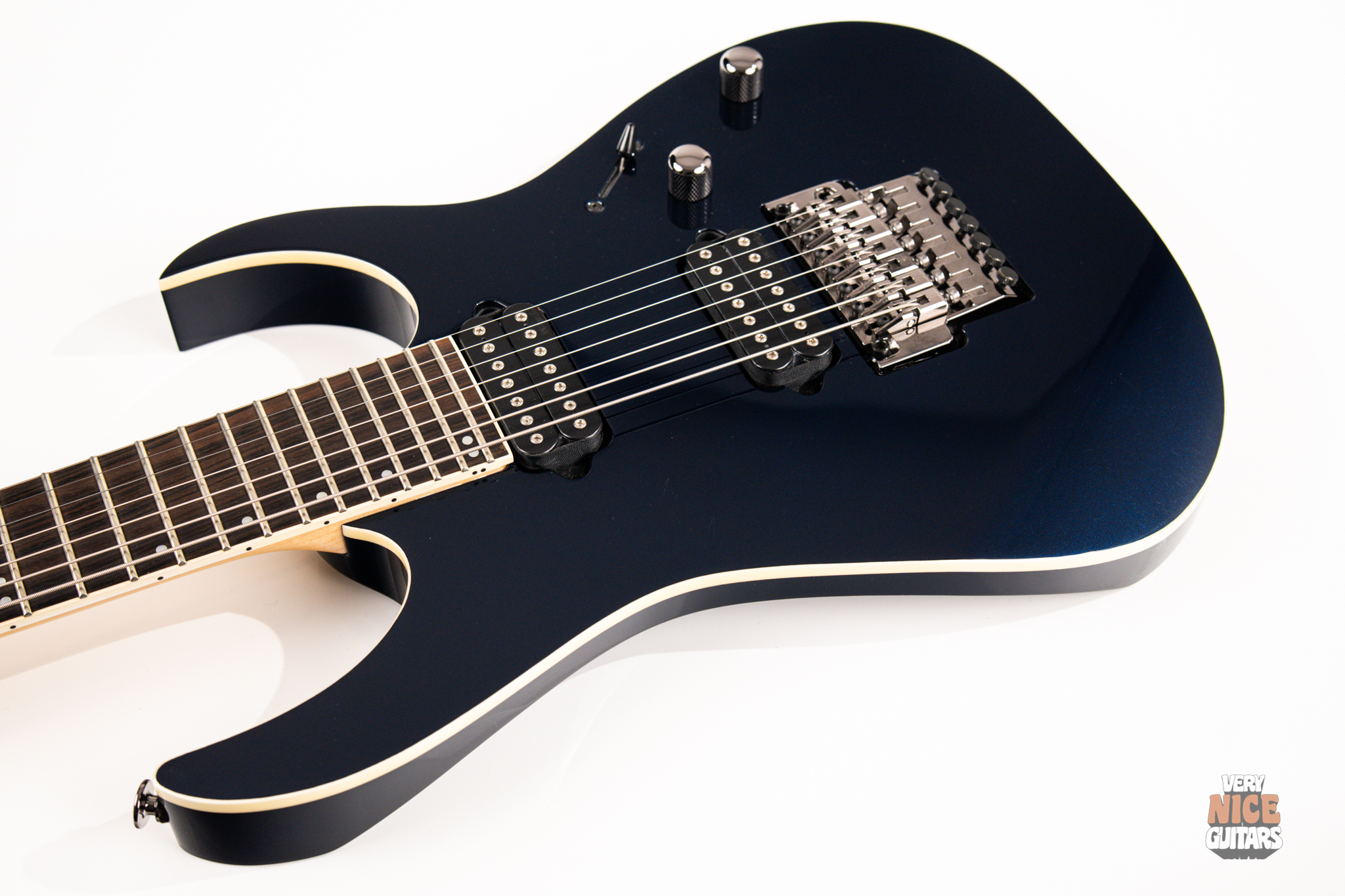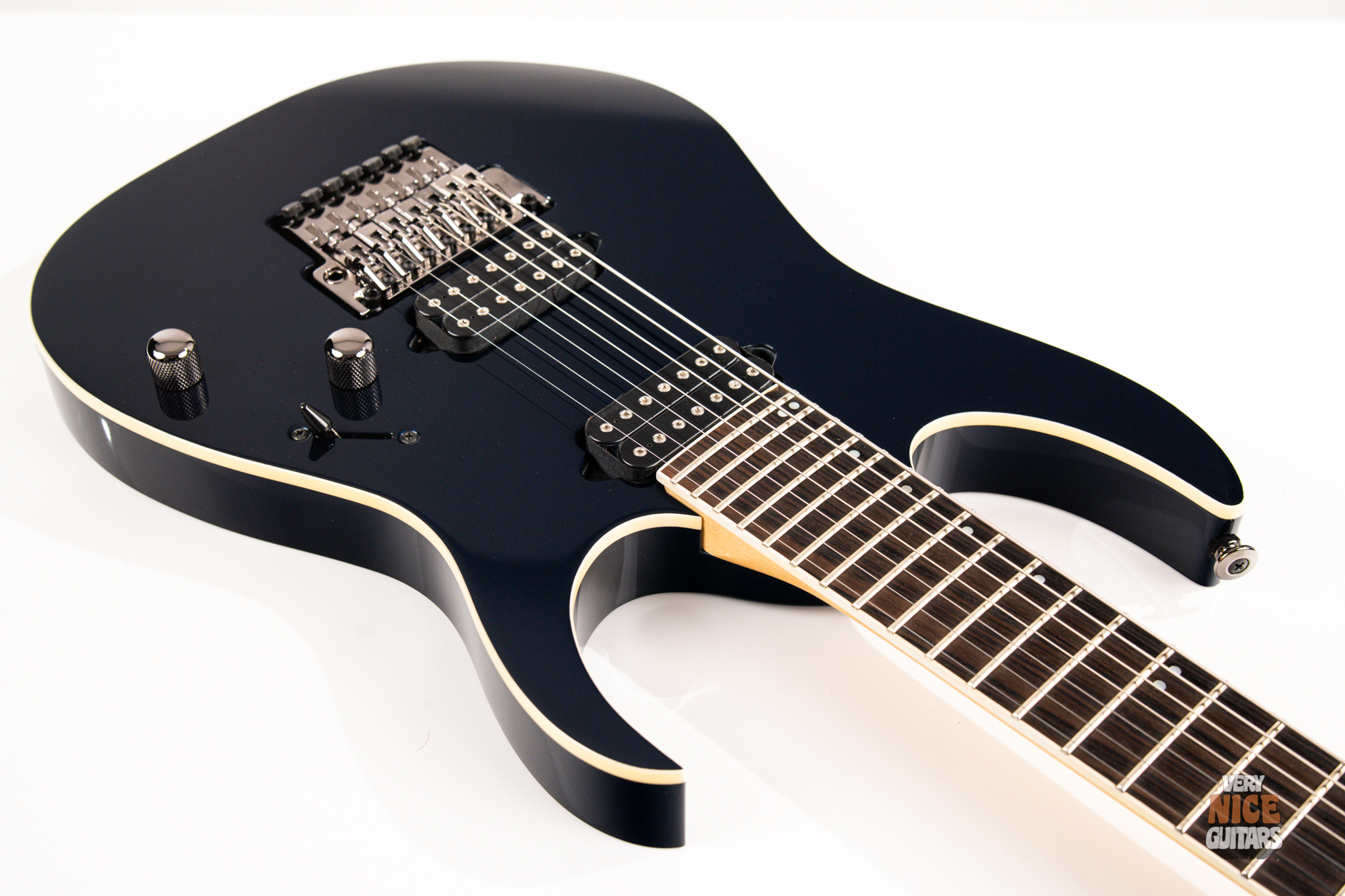 This Japanese-made RG features a basswood body and a five-piece maple and wenge neck with an XL scale of 27”. A macassar ebony fretboard features 24 frets with prestige edge treatment. Electronics consist of a pair of DiMarzio Fusion Edge 7 humbuckers, delivering clear, articulate, and versatile tones. A five-way selector switch provides additional tonal options, including coil-split combinations for expressive in-between sounds. Hardware includes the ultra-stable Lo-Pro Edge 7 double-locking tremolo, a locking nut, and Gotoh SG381 tuning machines, all working together to maintain precise tuning stability.