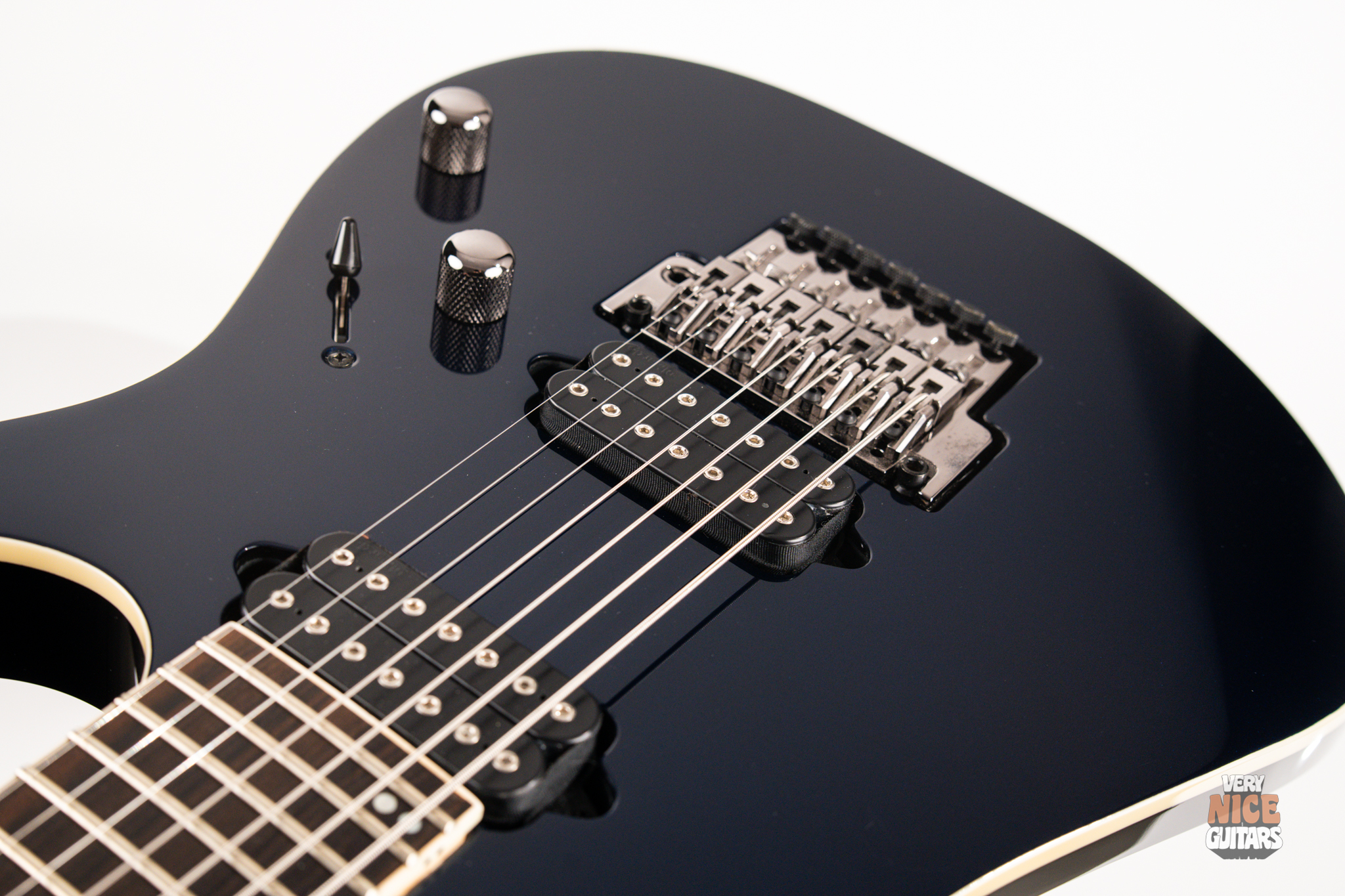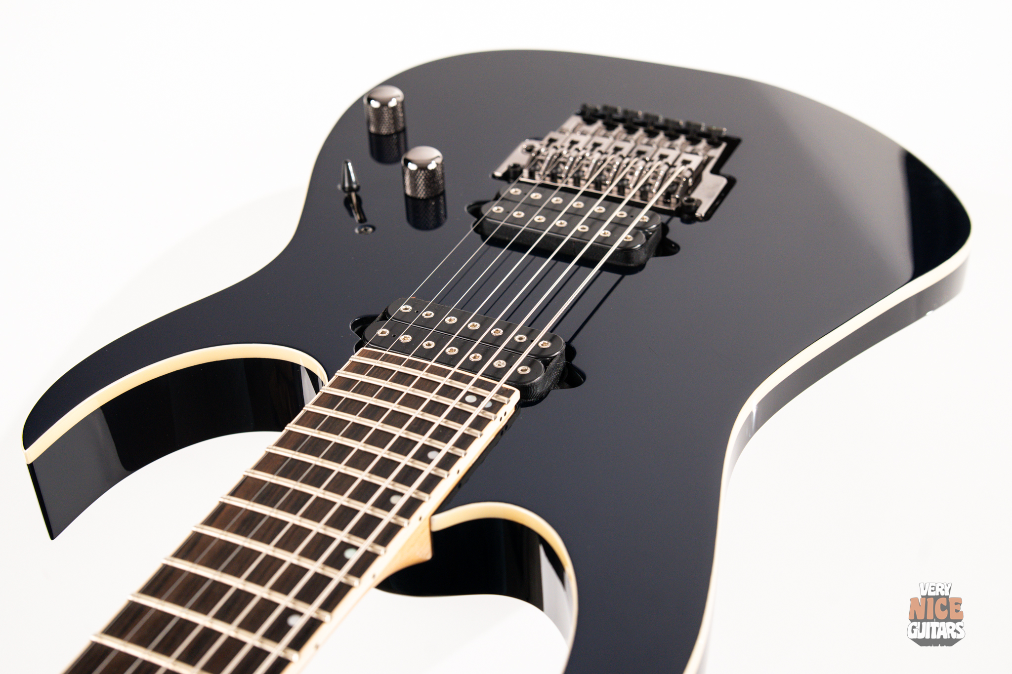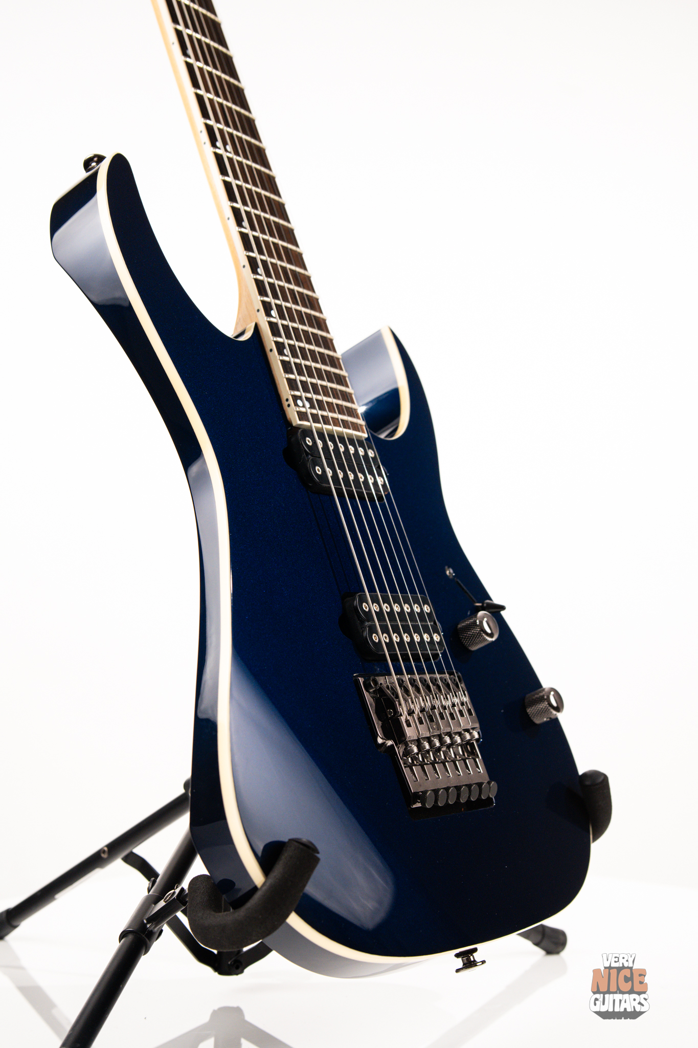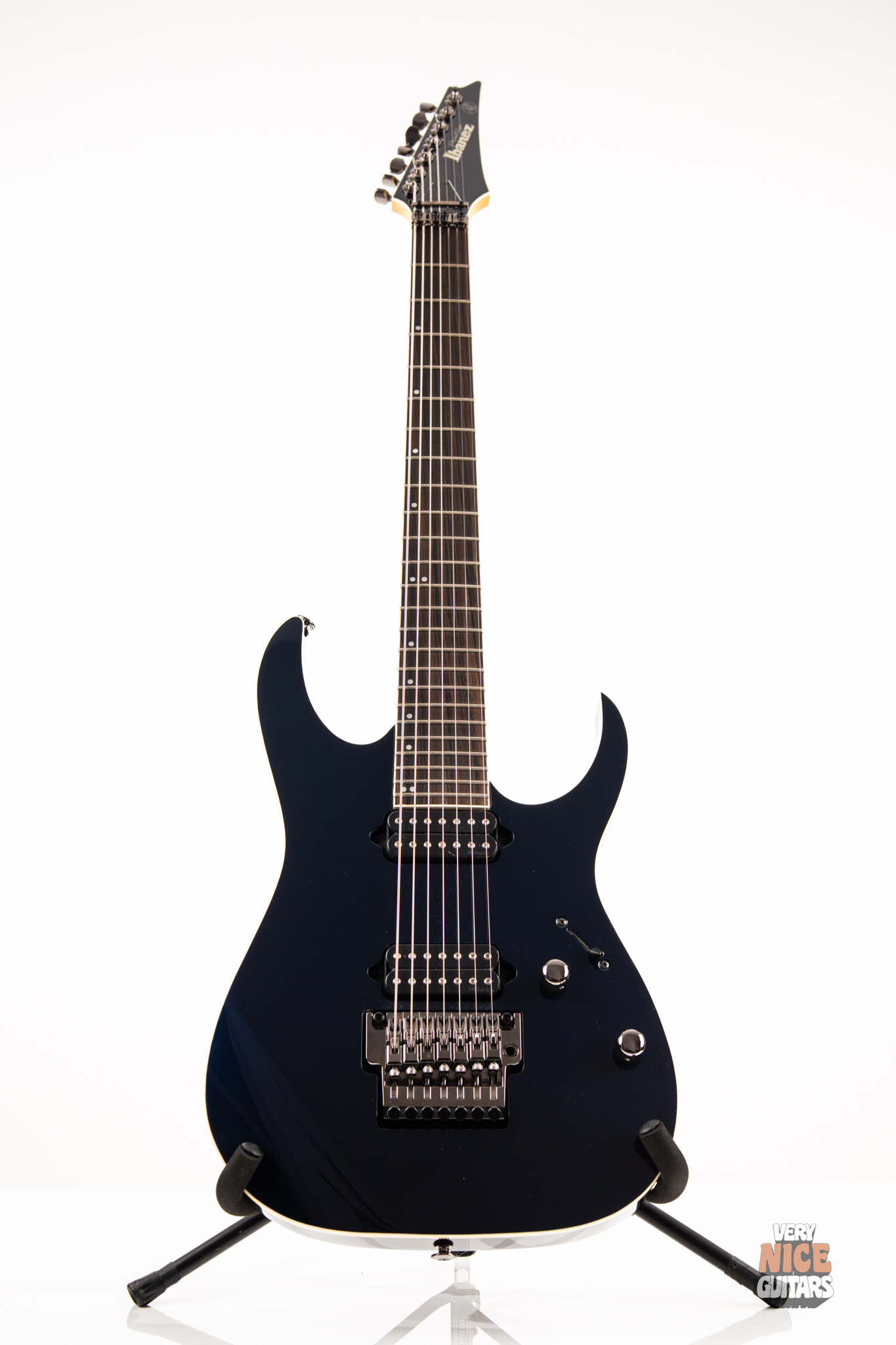 This Japanese-made RG features a basswood body and a five-piece maple and wenge neck with an XL scale of 27”. A macassar ebony fretboard features 24 frets with prestige edge treatment. Electronics consist of a pair of DiMarzio Fusion Edge 7 humbuckers, delivering clear, articulate, and versatile tones. A five-way selector switch provides additional tonal options, including coil-split combinations for expressive in-between sounds. Hardware includes the ultra-stable Lo-Pro Edge 7 double-locking tremolo, a locking nut, and Gotoh SG381 tuning machines, all working together to maintain precise tuning stability.