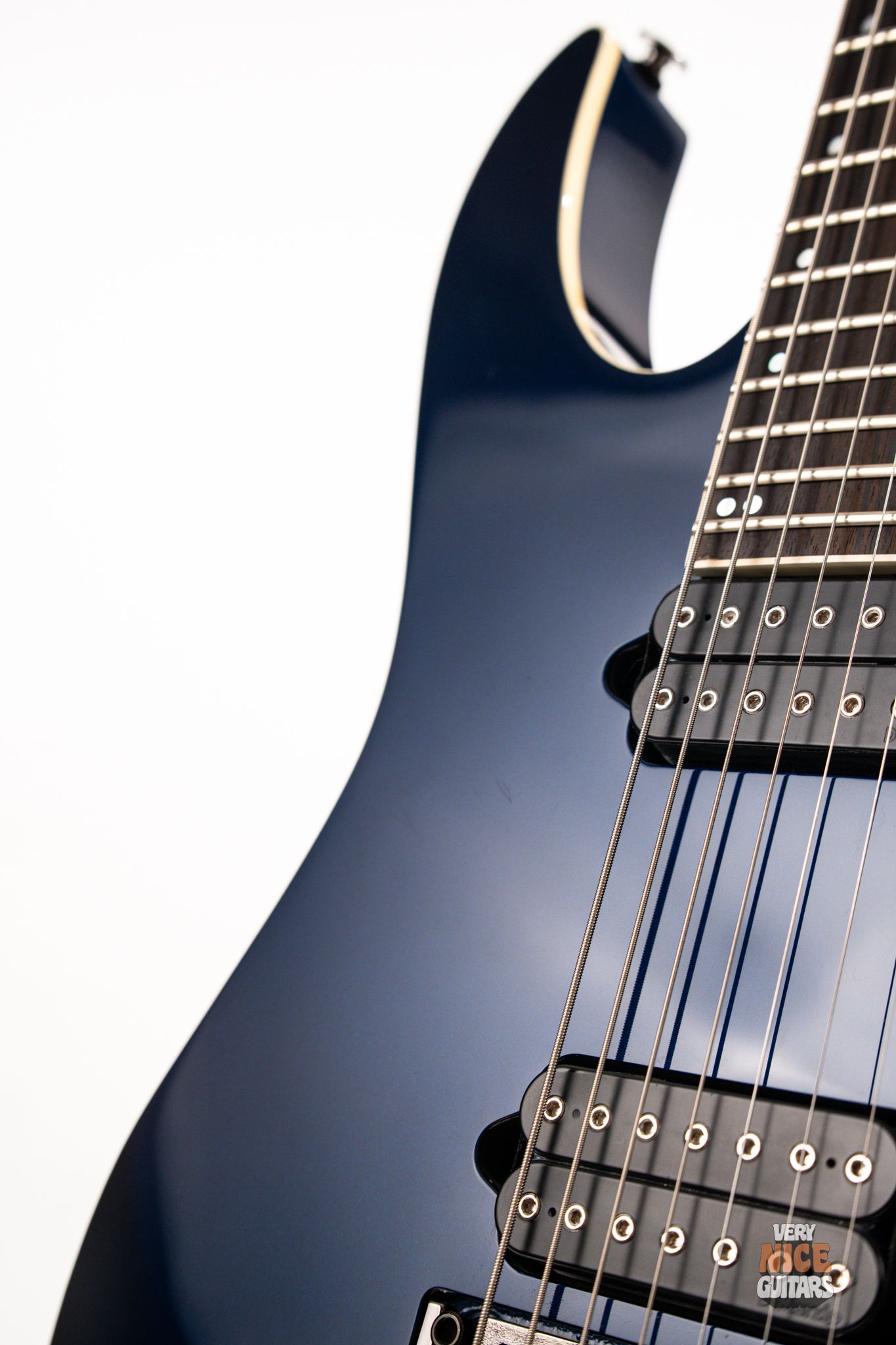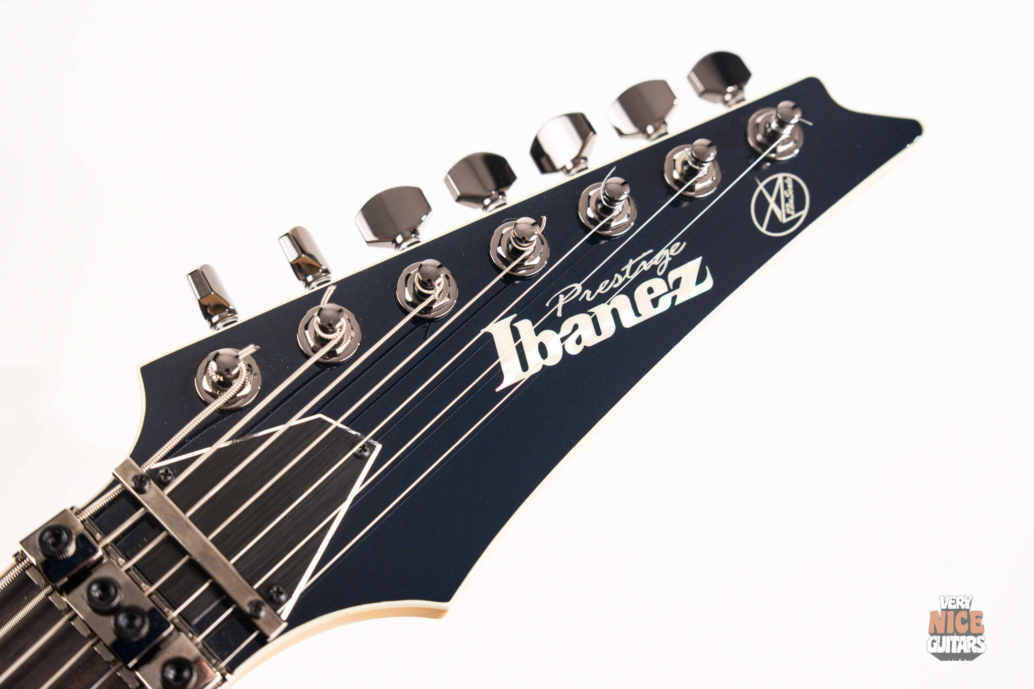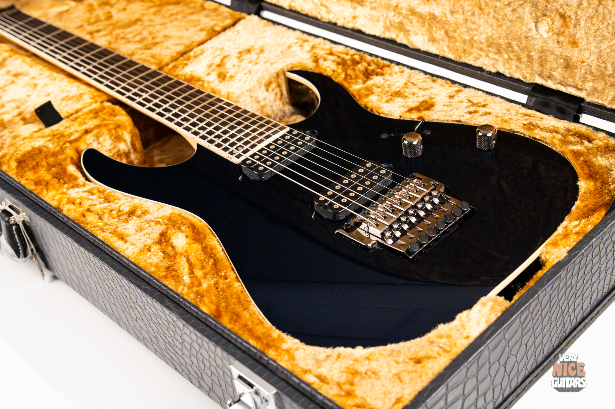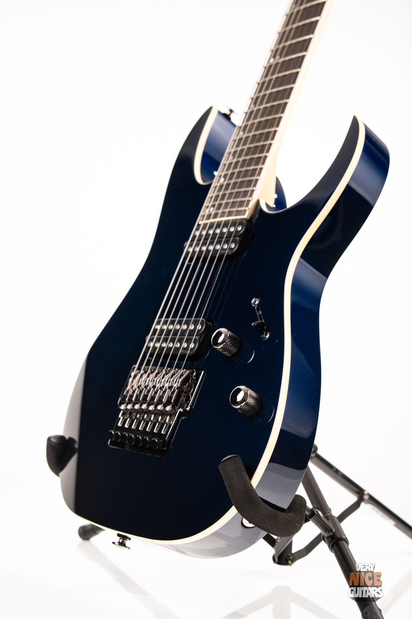This Japanese-made RG features a basswood body and a five-piece maple and wenge neck with an XL scale of 27”. A macassar ebony fretboard features 24 frets with prestige edge treatment. Electronics consist of a pair of DiMarzio Fusion Edge 7 humbuckers, delivering clear, articulate, and versatile tones. A five-way selector switch provides additional tonal options, including coil-split combinations for expressive in-between sounds. Hardware includes the ultra-stable Lo-Pro Edge 7 double-locking tremolo, a locking nut, and Gotoh SG381 tuning machines, all working together to maintain precise tuning stability.