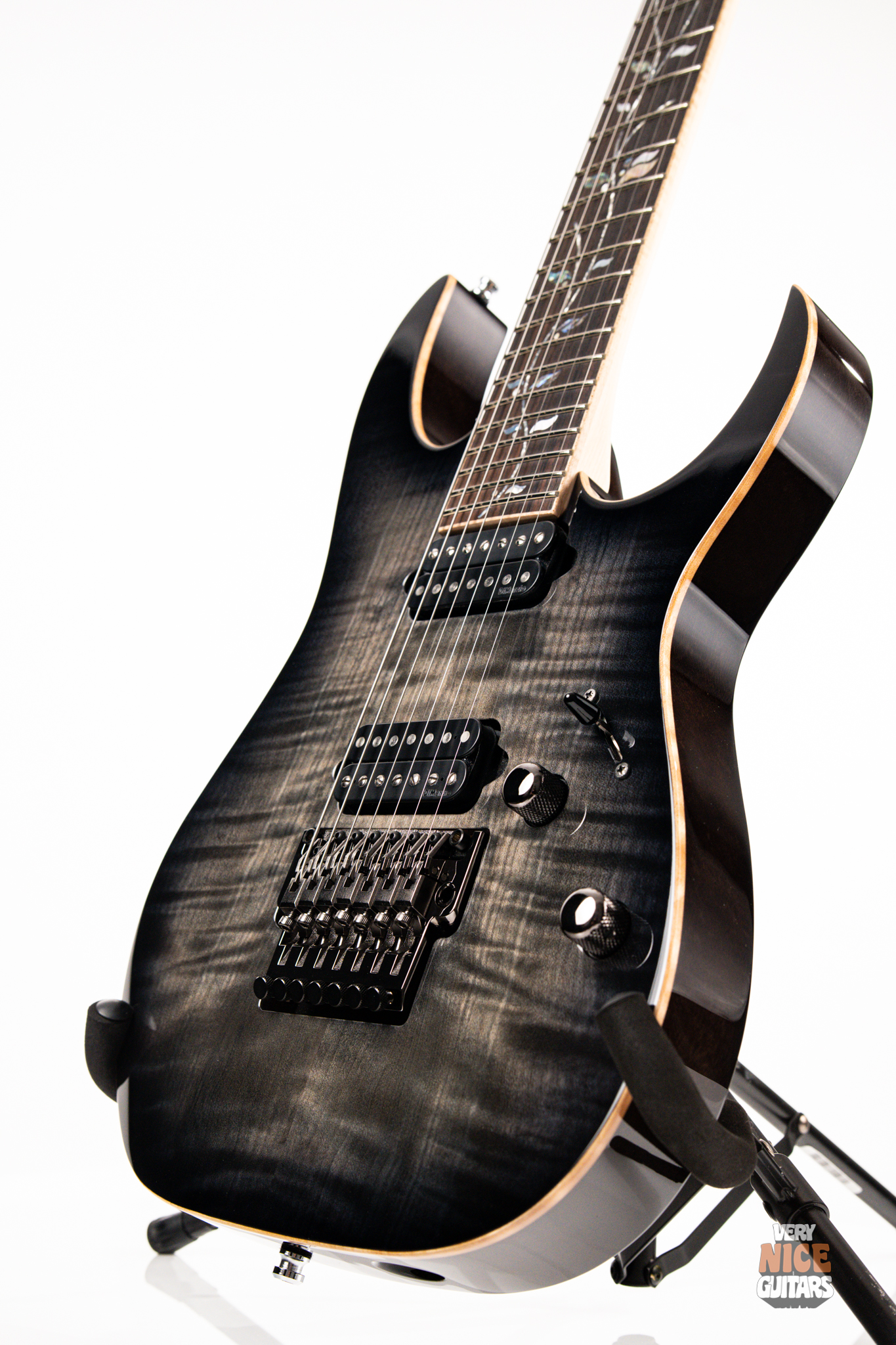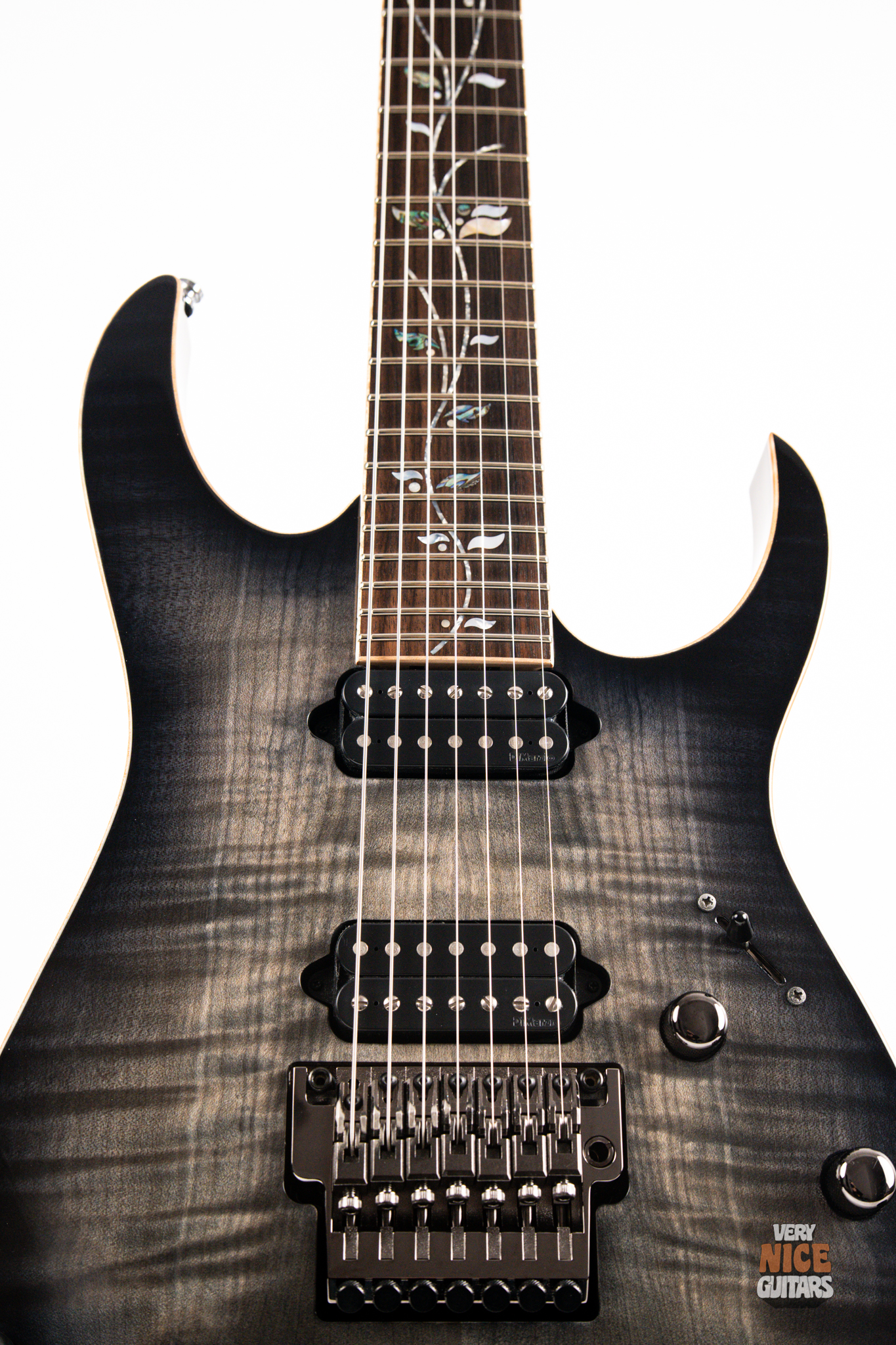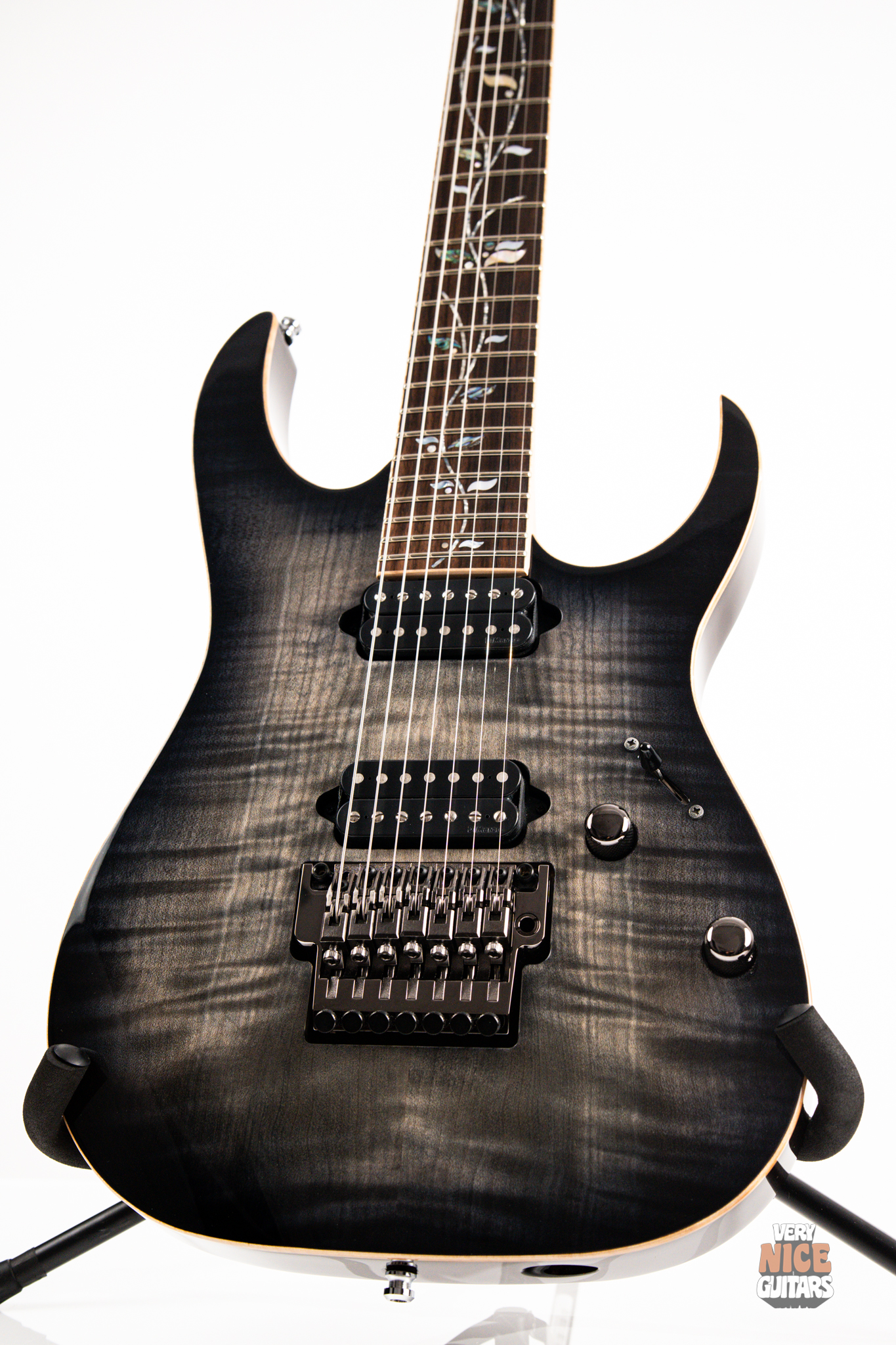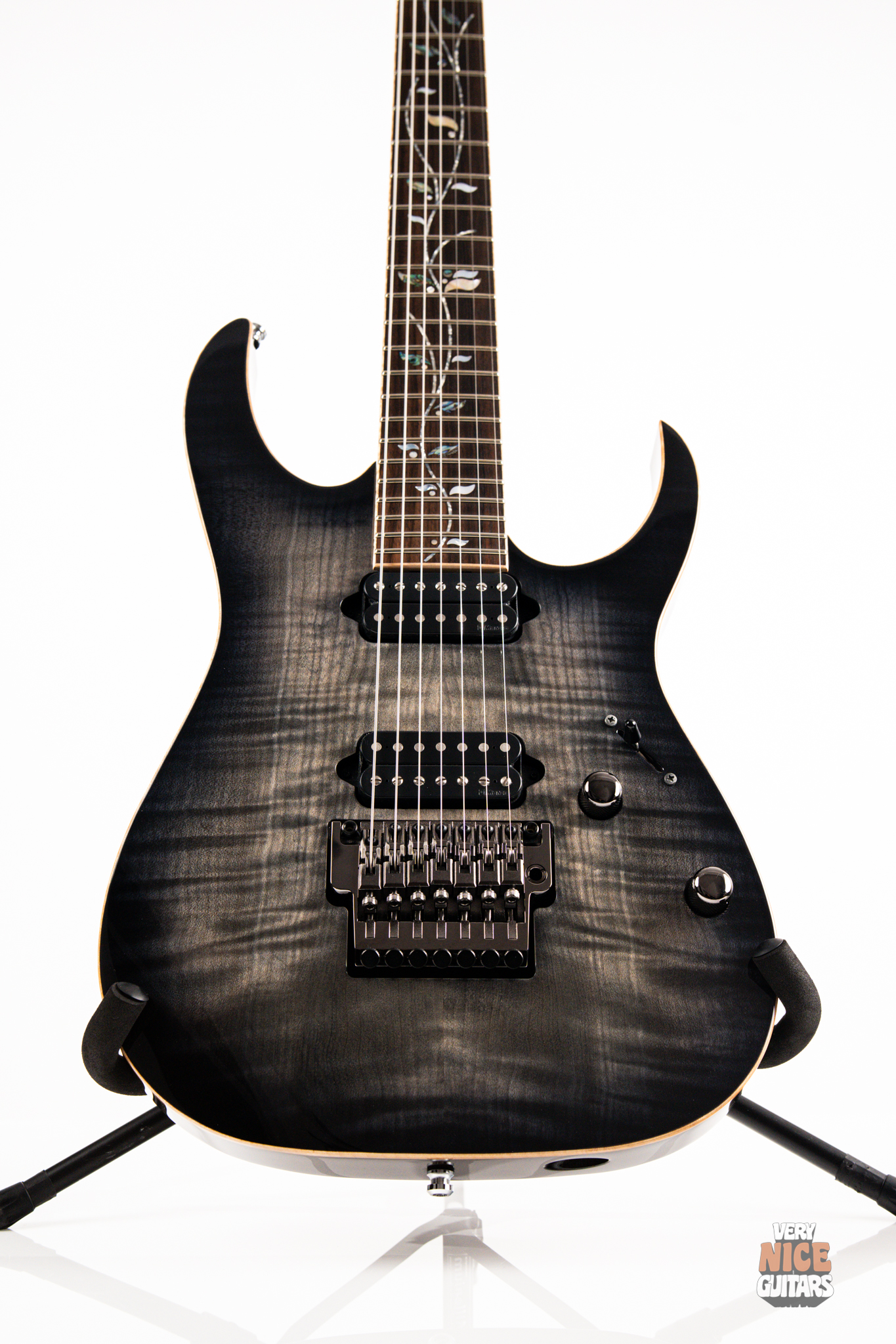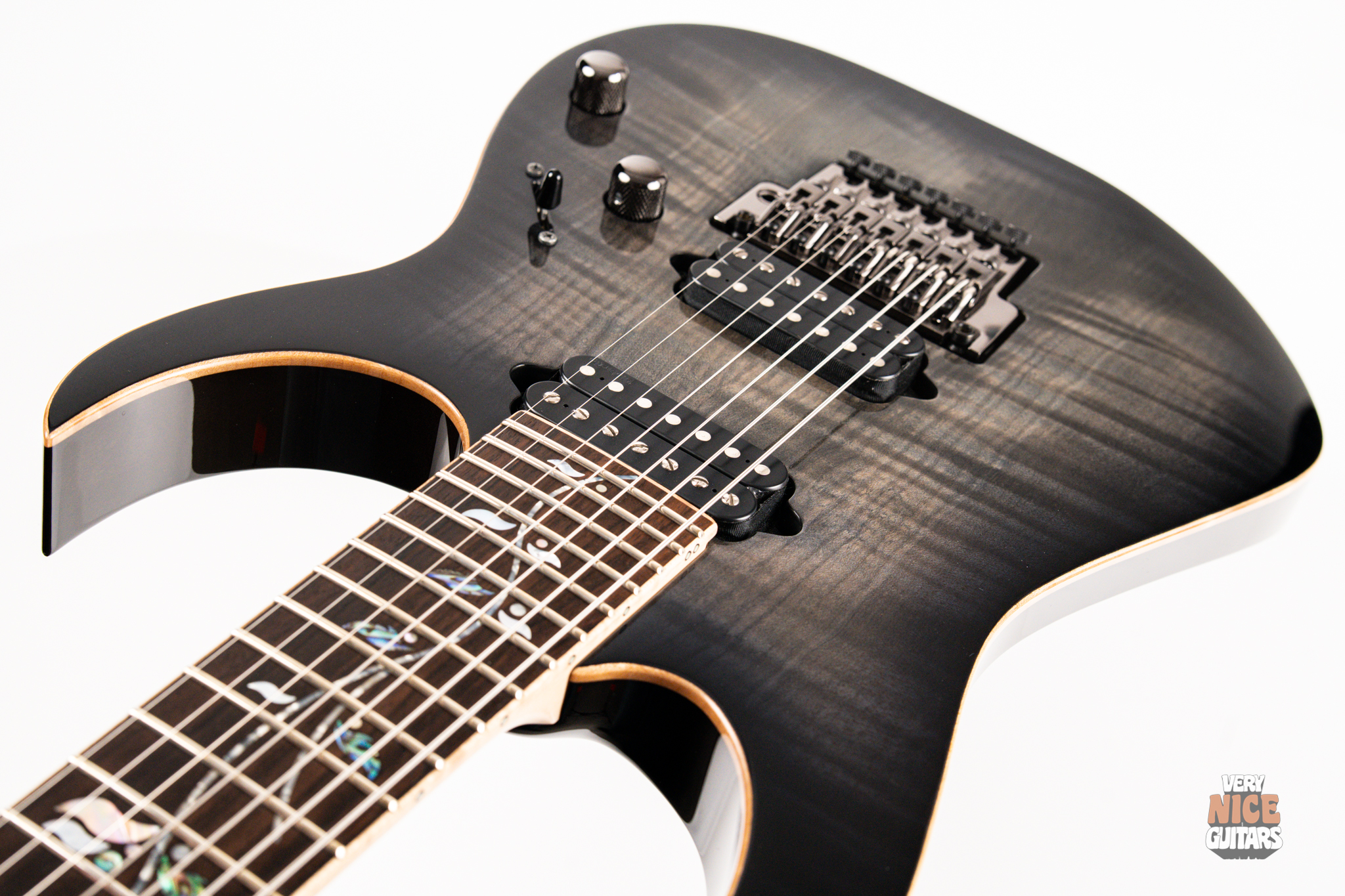This Japanese-made RG features a handcrafted African mahogany body with a thick 4 mm AAA flame maple top. The neck is constructed from a five-piece maple and wenge laminate. A dark ebony fingerboard showcases the signature Tree of Life inlay, while 24 jumbo nickel-silver frets with J.Custom fret edge treatment ensure effortless playability and exceptional comfort. Electronics consist of a pair of DiMarzio PAF 7 humbuckers, delivering clear, articulate, and versatile tones. A five-way selector switch provides additional tonal options, including coil-split combinations for expressive in-between sounds. Hardware includes the ultra-stable Lo-Pro Edge 7 double-locking tremolo, a locking nut, and Gotoh SG381 tuning machines, all working together to maintain precise tuning stability.