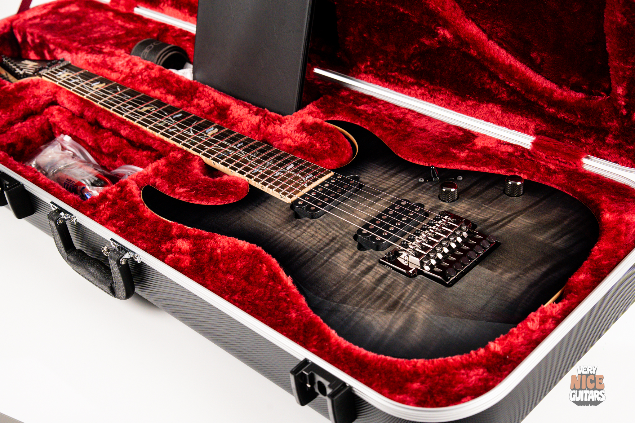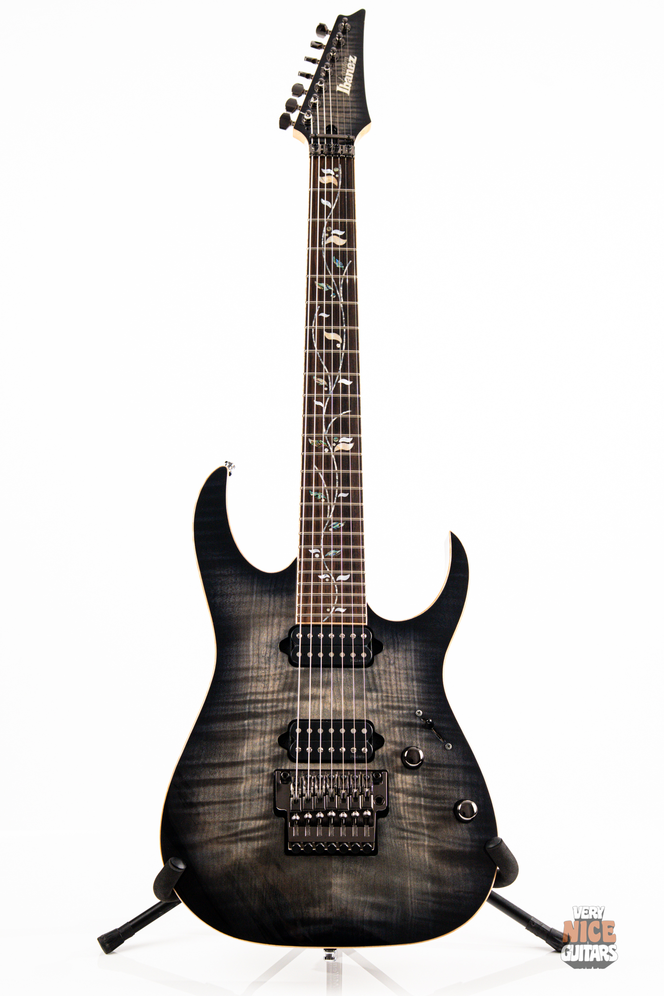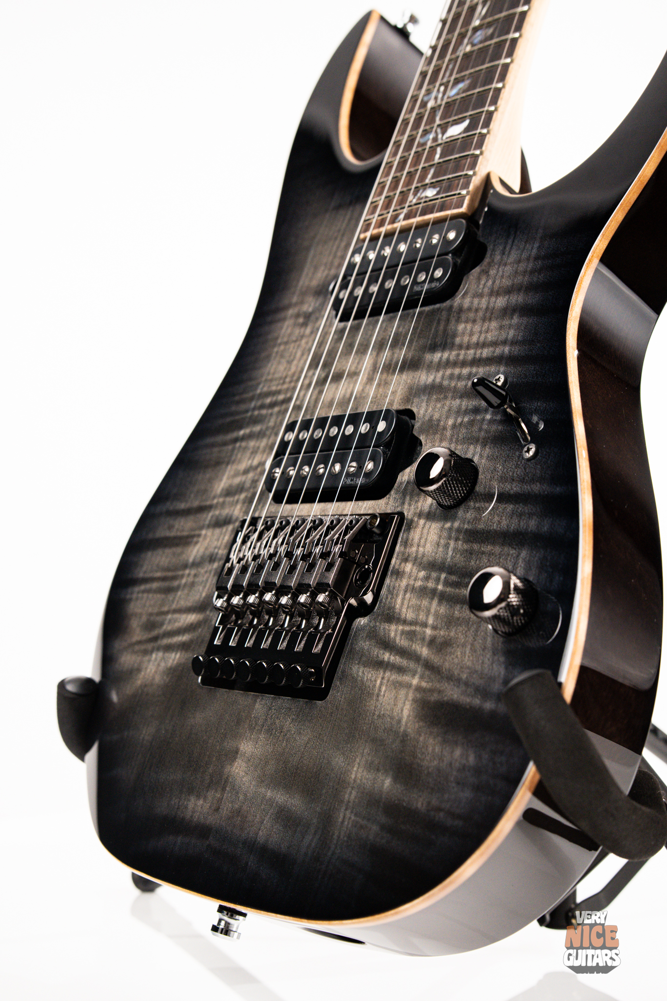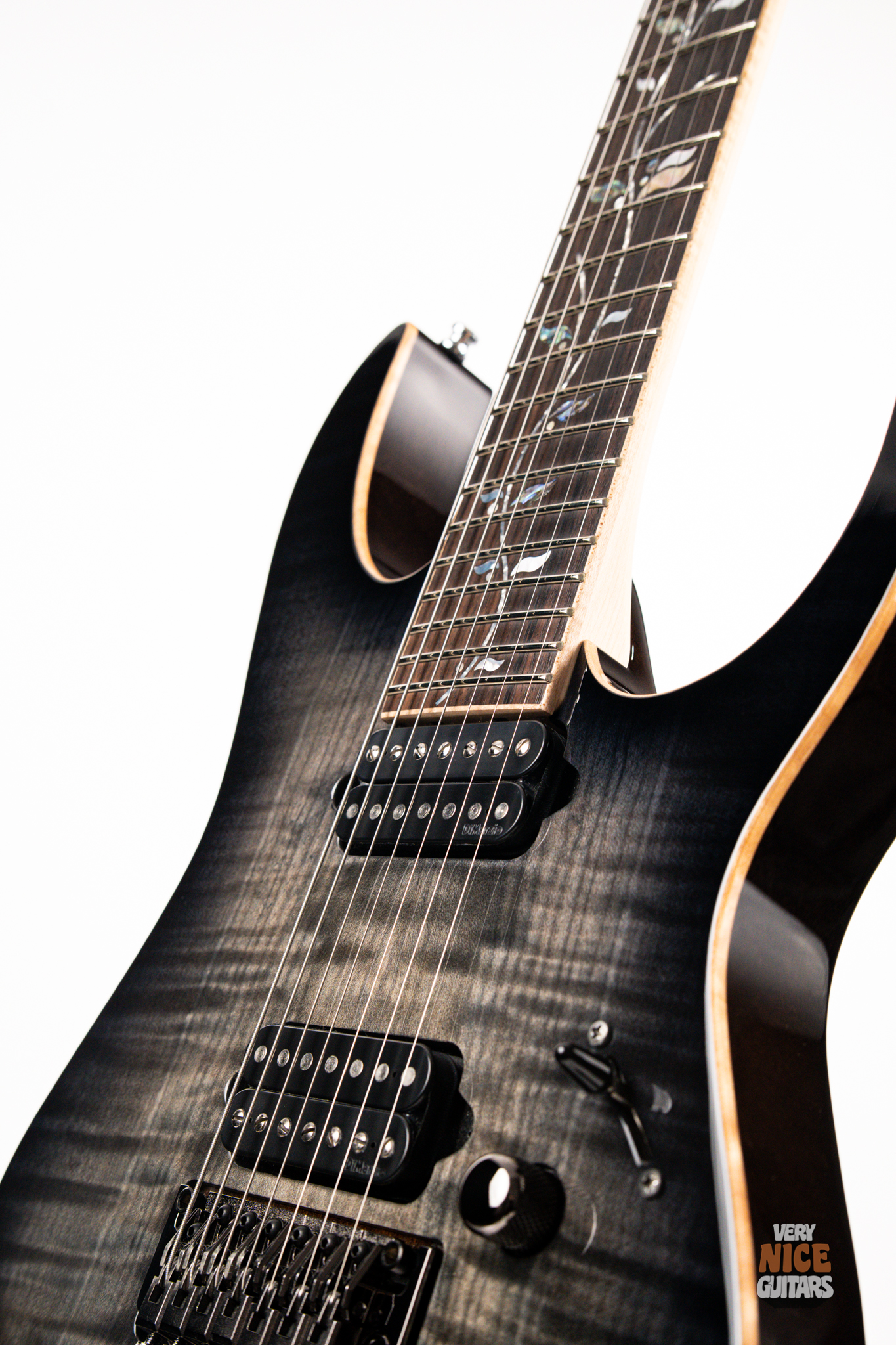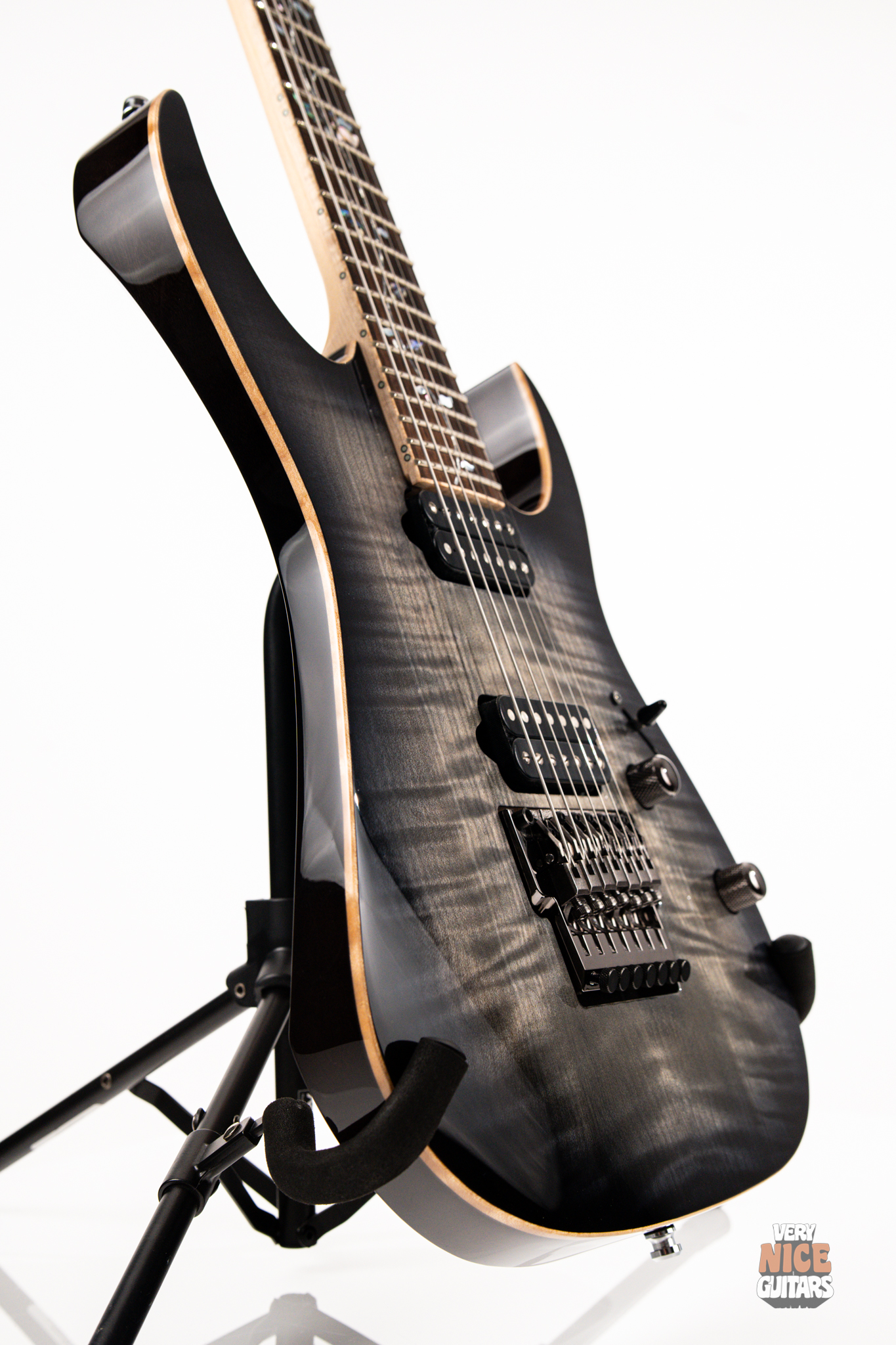 This Japanese-made RG features a handcrafted African mahogany body with a thick 4 mm AAA flame maple top. The neck is constructed from a five-piece maple and wenge laminate. A dark ebony fingerboard showcases the signature Tree of Life inlay, while 24 jumbo nickel-silver frets with J.Custom fret edge treatment ensure effortless playability and exceptional comfort. Electronics consist of a pair of DiMarzio PAF 7 humbuckers, delivering clear, articulate, and versatile tones. A five-way selector switch provides additional tonal options, including coil-split combinations for expressive in-between sounds. Hardware includes the ultra-stable Lo-Pro Edge 7 double-locking tremolo, a locking nut, and Gotoh SG381 tuning machines, all working together to maintain precise tuning stability.