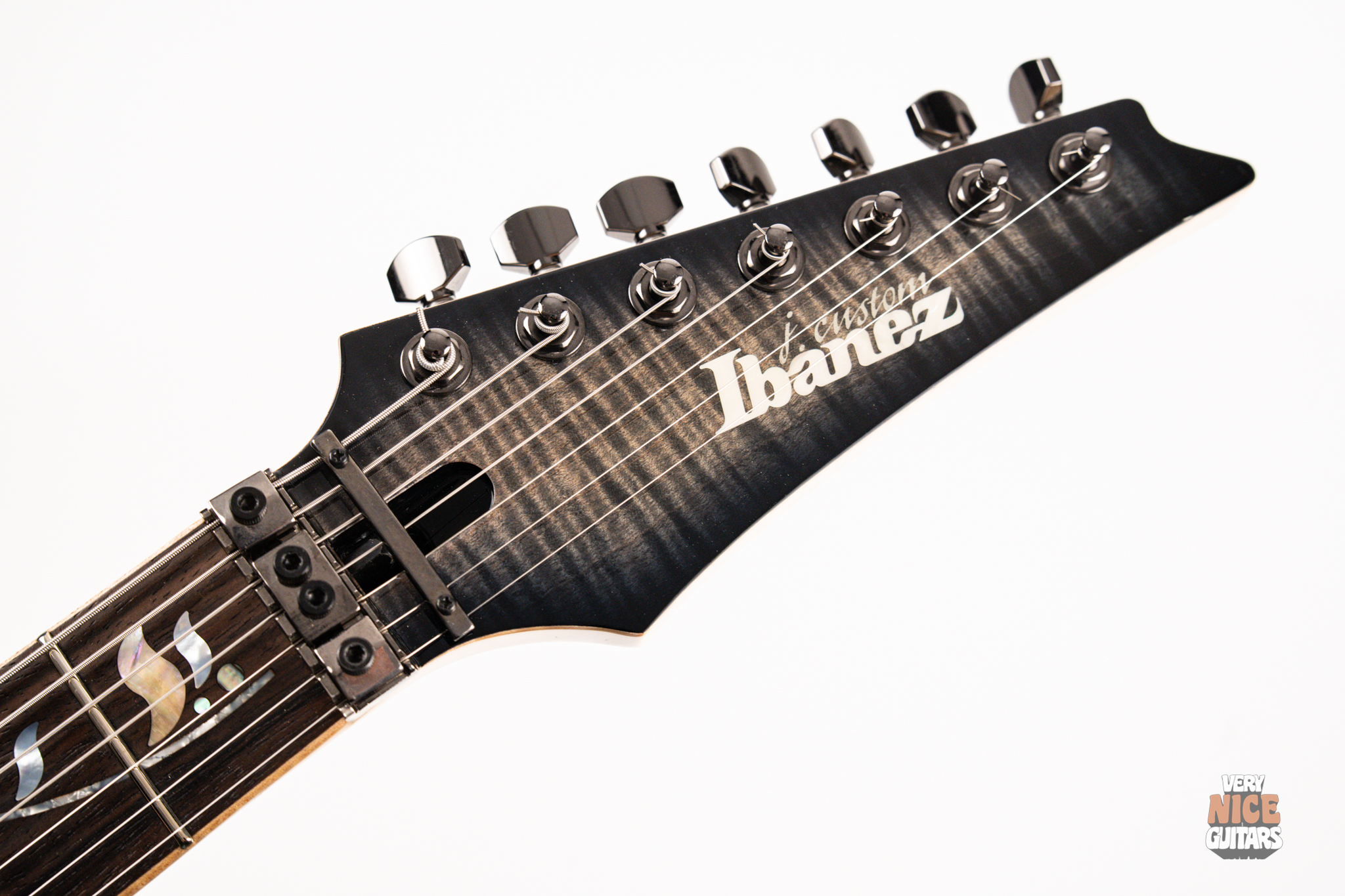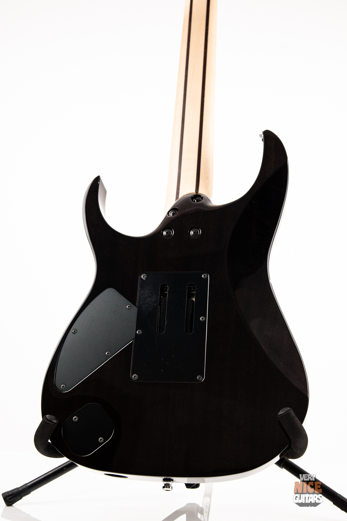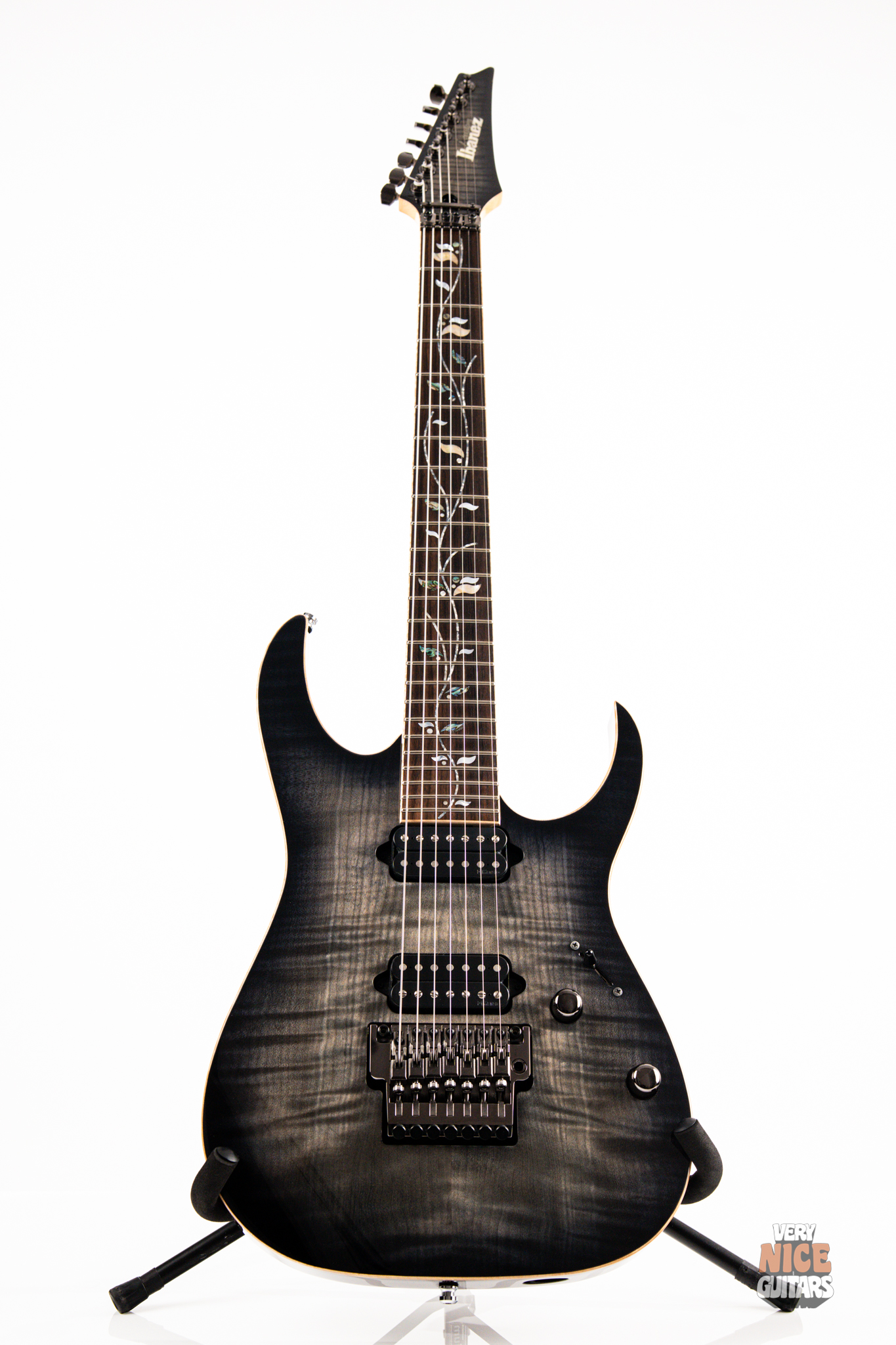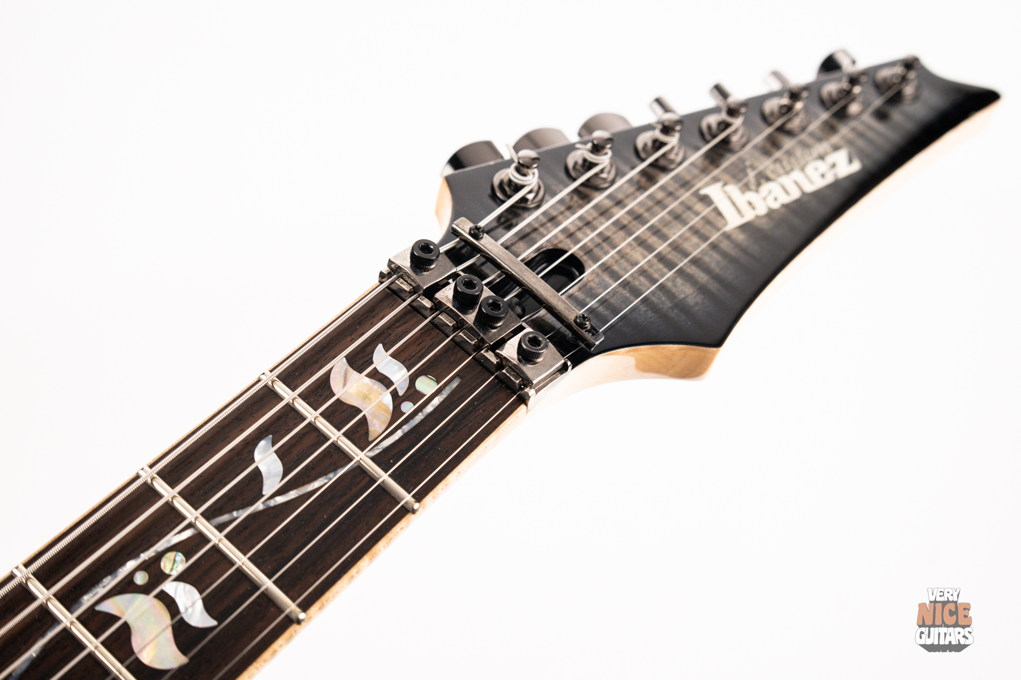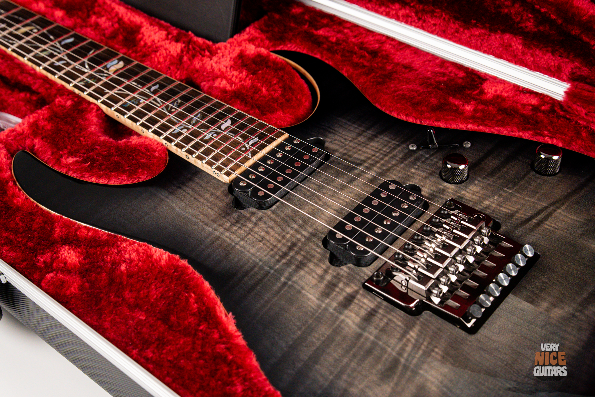 This Japanese-made RG features a handcrafted African mahogany body with a thick 4 mm AAA flame maple top. The neck is constructed from a five-piece maple and wenge laminate. A dark ebony fingerboard showcases the signature Tree of Life inlay, while 24 jumbo nickel-silver frets with J.Custom fret edge treatment ensure effortless playability and exceptional comfort. Electronics consist of a pair of DiMarzio PAF 7 humbuckers, delivering clear, articulate, and versatile tones. A five-way selector switch provides additional tonal options, including coil-split combinations for expressive in-between sounds. Hardware includes the ultra-stable Lo-Pro Edge 7 double-locking tremolo, a locking nut, and Gotoh SG381 tuning machines, all working together to maintain precise tuning stability.