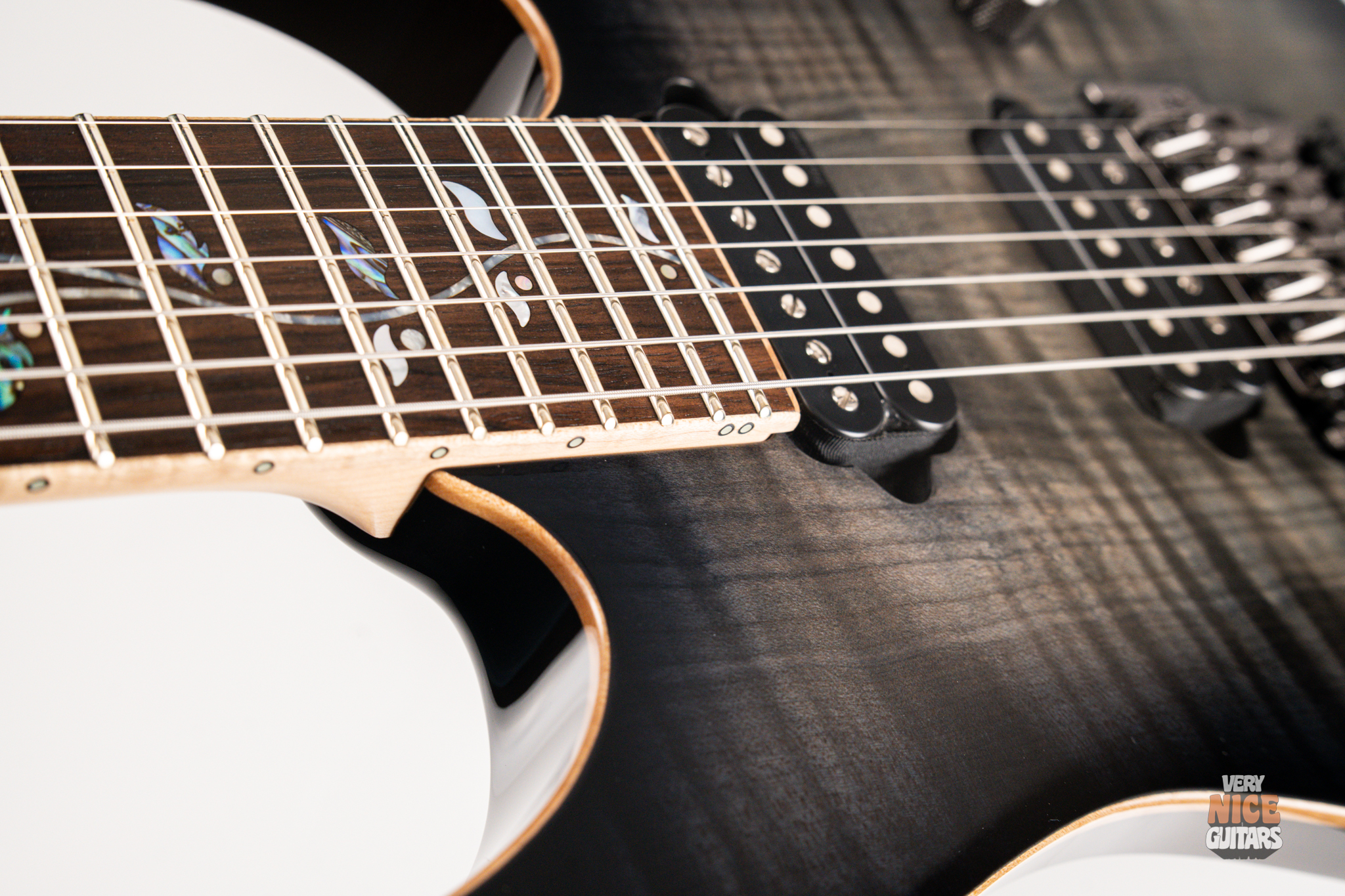- Fingerboard: Macassar Ebony with flame maple binding
