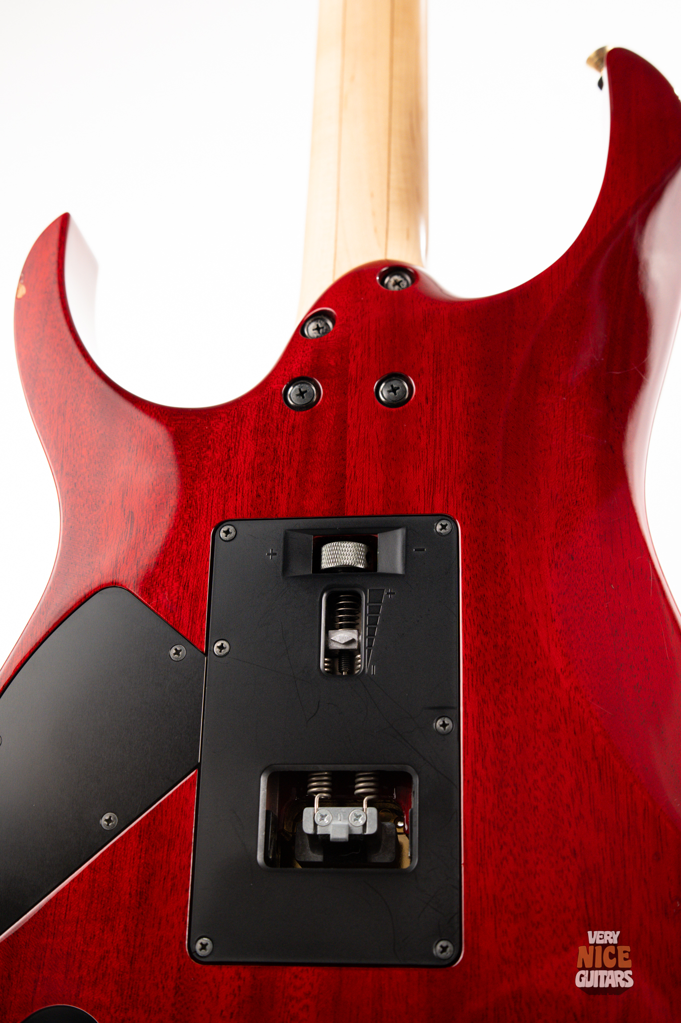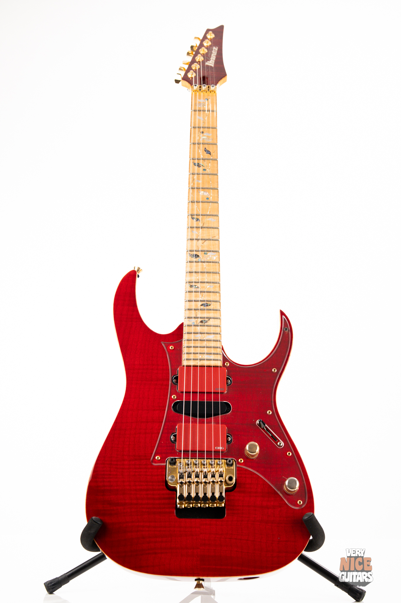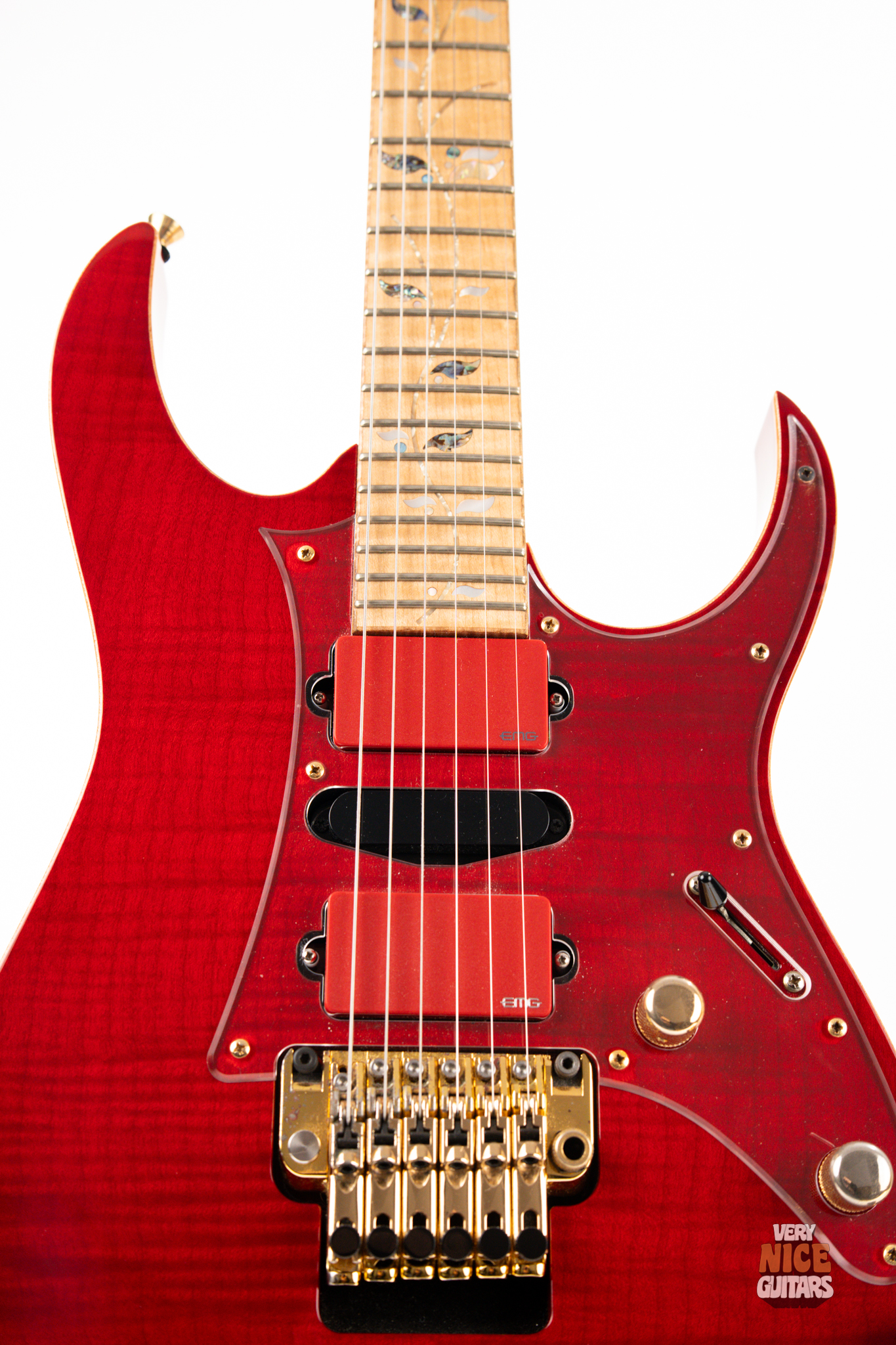 Its body is made of mahogany with a flame maple top and binding. Bolted to it, is a 5 piece maple and walnut neck featuring maple fingerboard with the usual J Custom tree of life inlay. This model features a clear pickguard on the surface of the body to prevent scratches while still showcasing that beautiful top. It has been modified by a previous owner who fitted it with a full active EMG electronics set in a matching red color. For controls you get a typical master volume and tone knobs with a 3 way selector switch for the pickups. The bridge is a double locking Edge Zero tremolo. At the headstock it’s fitted with a locking nut and Gotoh SG381 tuners. All hardware is finished in a striking gold color.