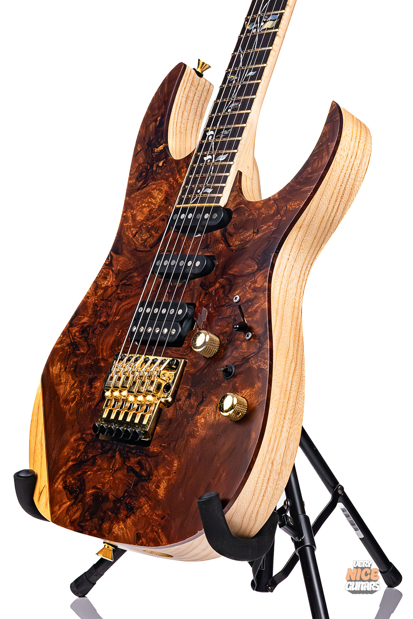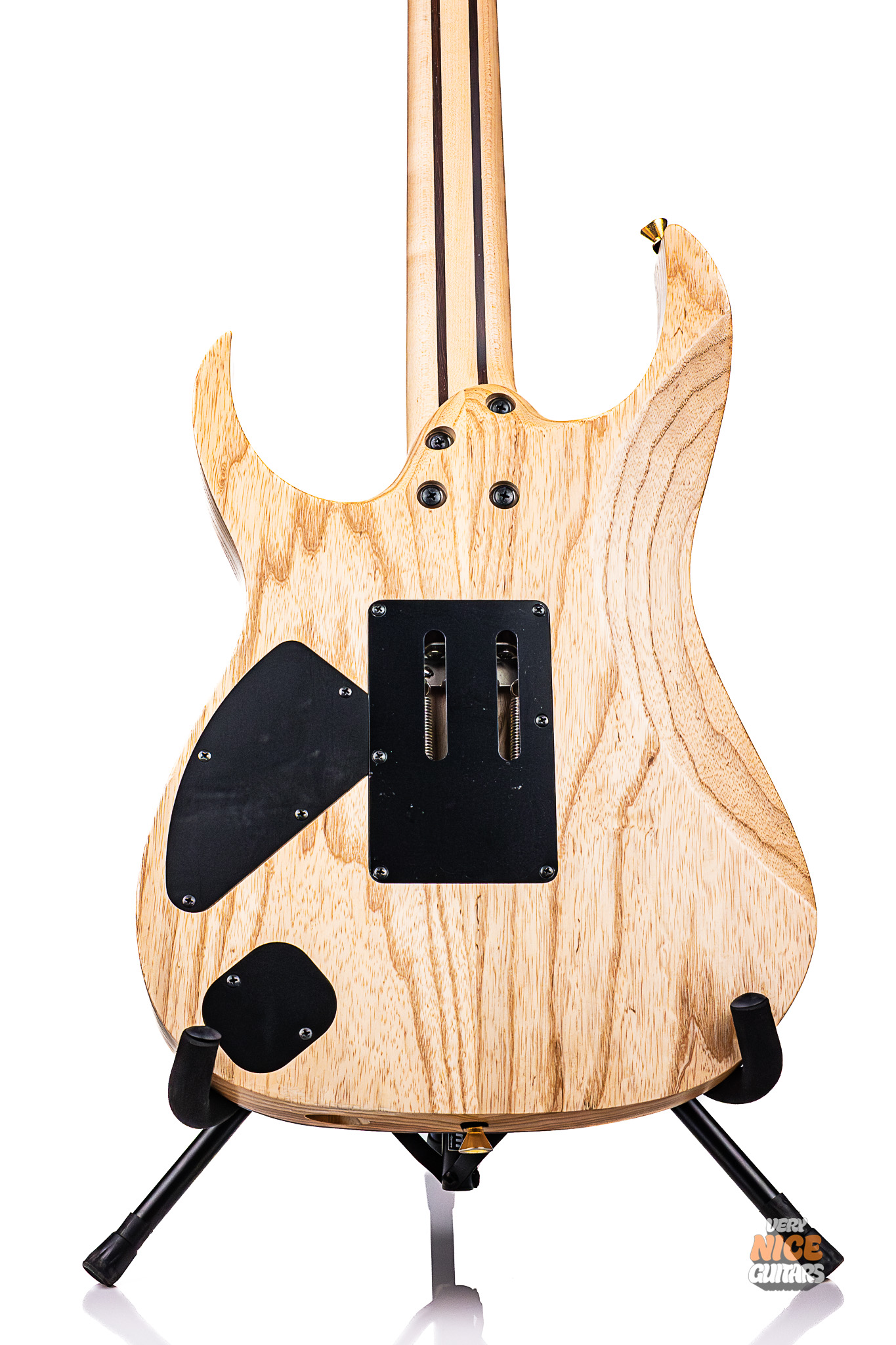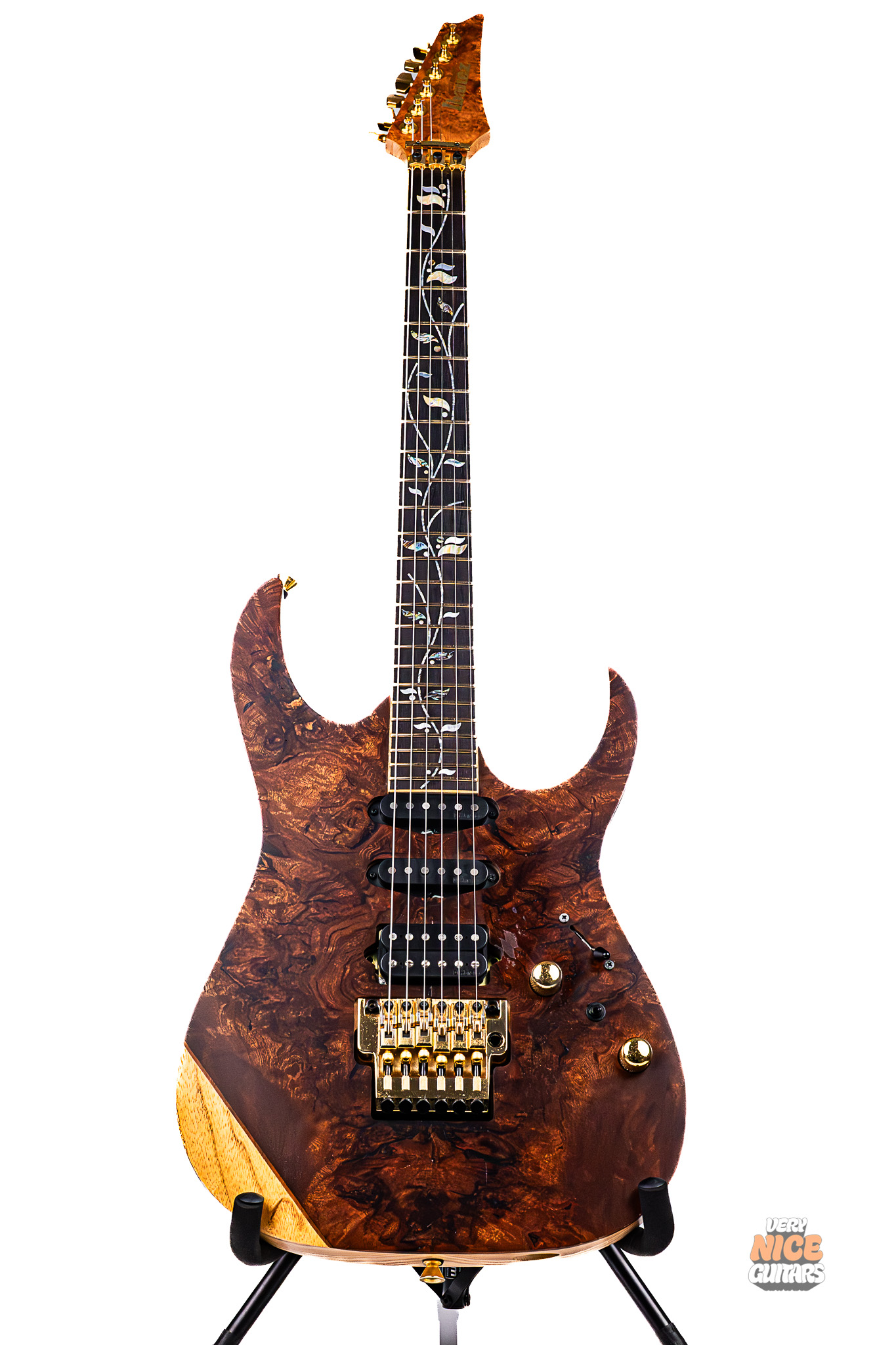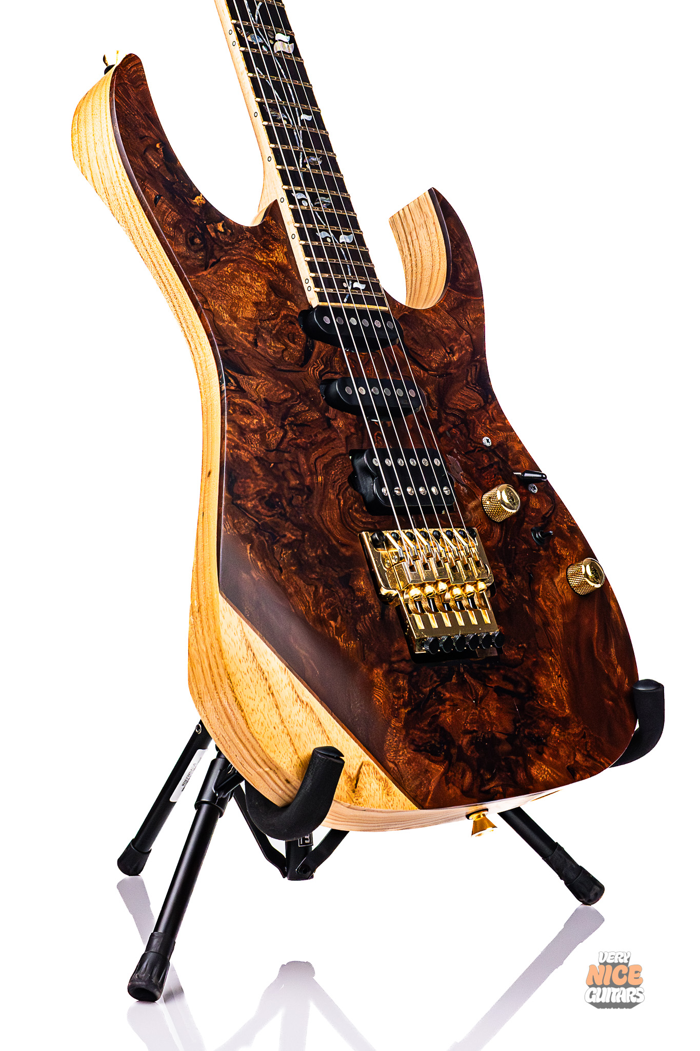 This Ibanez RG8560SLTD NTF is a highly limited model from the Japanese Ibanez J-custom line, with only 20 models made worldwide to commemorate the 45th anniversary of Japanese retailer Ikebe Gakki. This model features an exotic sapele top on an ash body with a 5-piece maple/wenge neck. Loaded with DiMarzio pickups in a H/S/S configuration, this instrument is capable of delivering crushing rhythm parts, Strat-like cleans, and fluid leads. This makes for an excellent all-round instrument that will find itself comfortable in everything between speedy, technical riffs and jazzy passages. This guitar comes equipped with a Lo-Pro Edge tremolo and Gotoh tuners, to ensure perfect tuning stability even with extreme whammy bar use. This guitar is perfect for you if you are looking for an instrument as beautiful as it is lethal. If you have ever wanted to own a piece of Ibanez history, this guitar will be perfect for you.