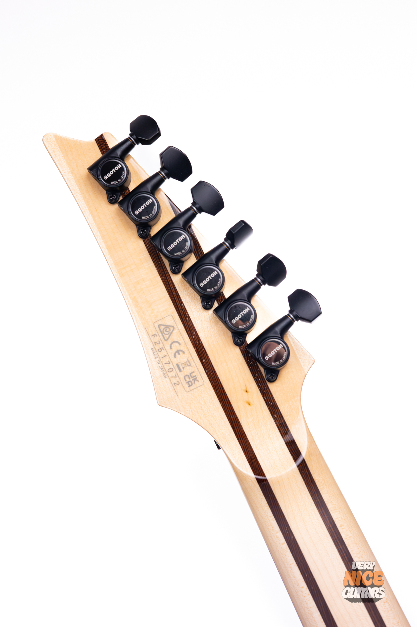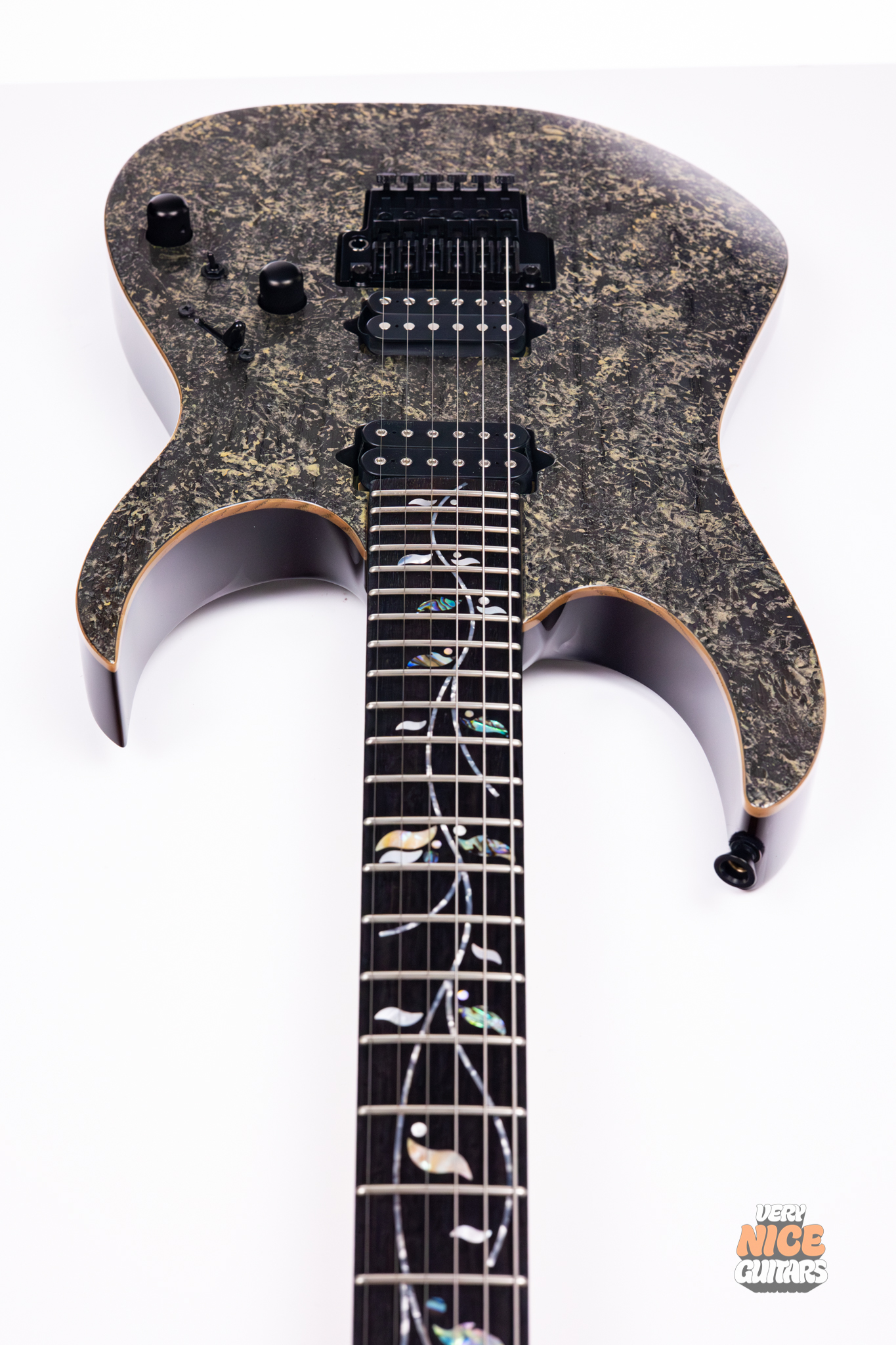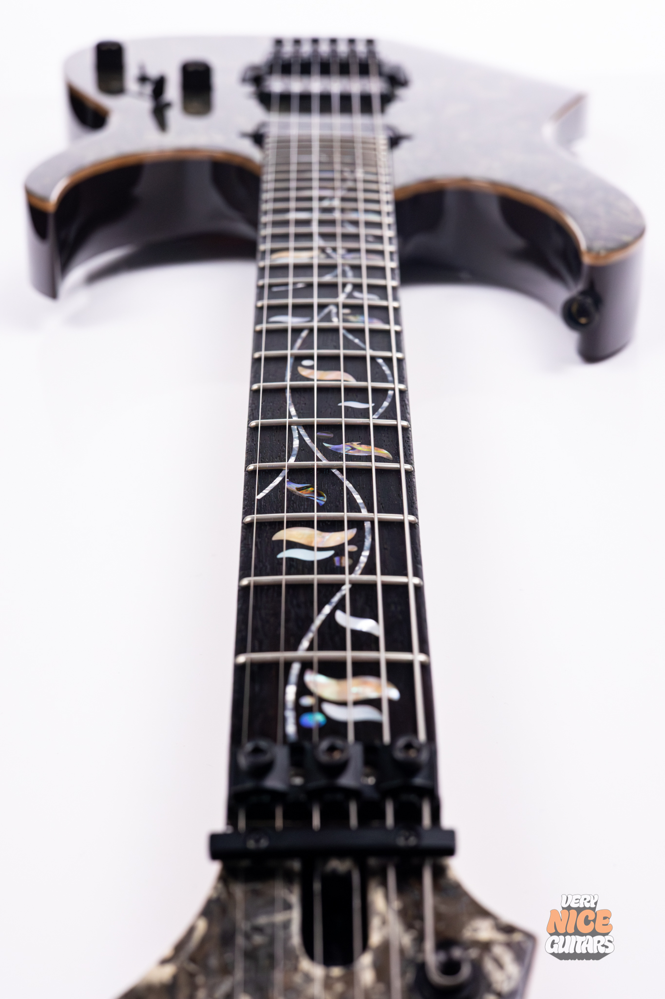 Handcrafted in Japan by FujiGen as part of the high-end J Custom line, this stunning guitar features an African mahogany body with an ash top with a bolt-on maple and wenge neck with an ultra thin Super Wizard asymmetric profile, a matching headstock, and a rosewood fingerboard with 24 stainless steel frets, abalone & mother of pearl Tree of Life inlays, and Luminlay side dots. Components include DiMarzio The Tone Zone and PAF Pro pickups, a Lo-Pro Edge double locking tremolo bridge, Gotoh SG381 machine heads, and Gotoh Strap Locker pins. The hardware is satin black.