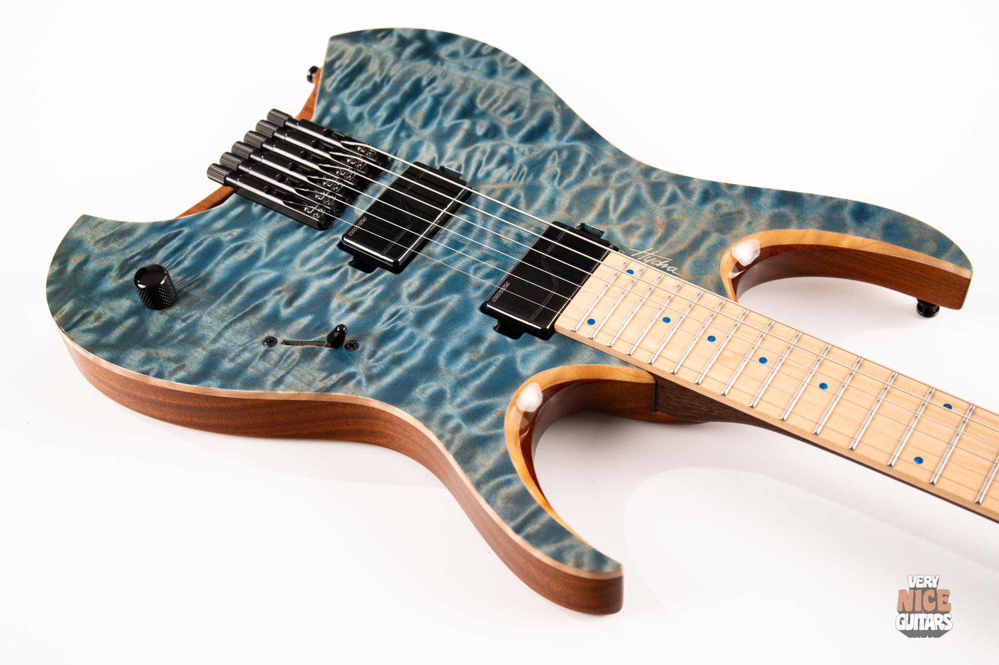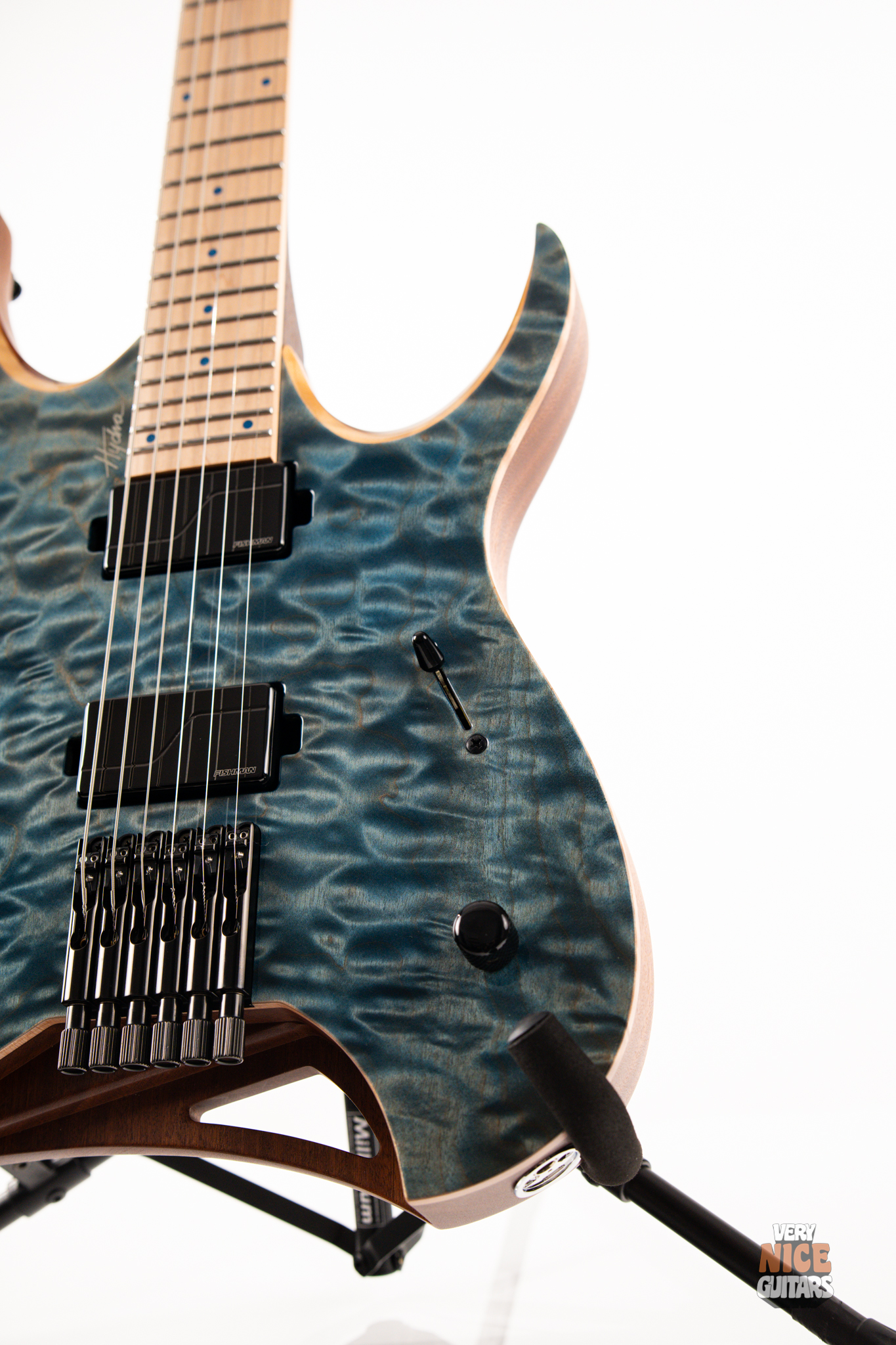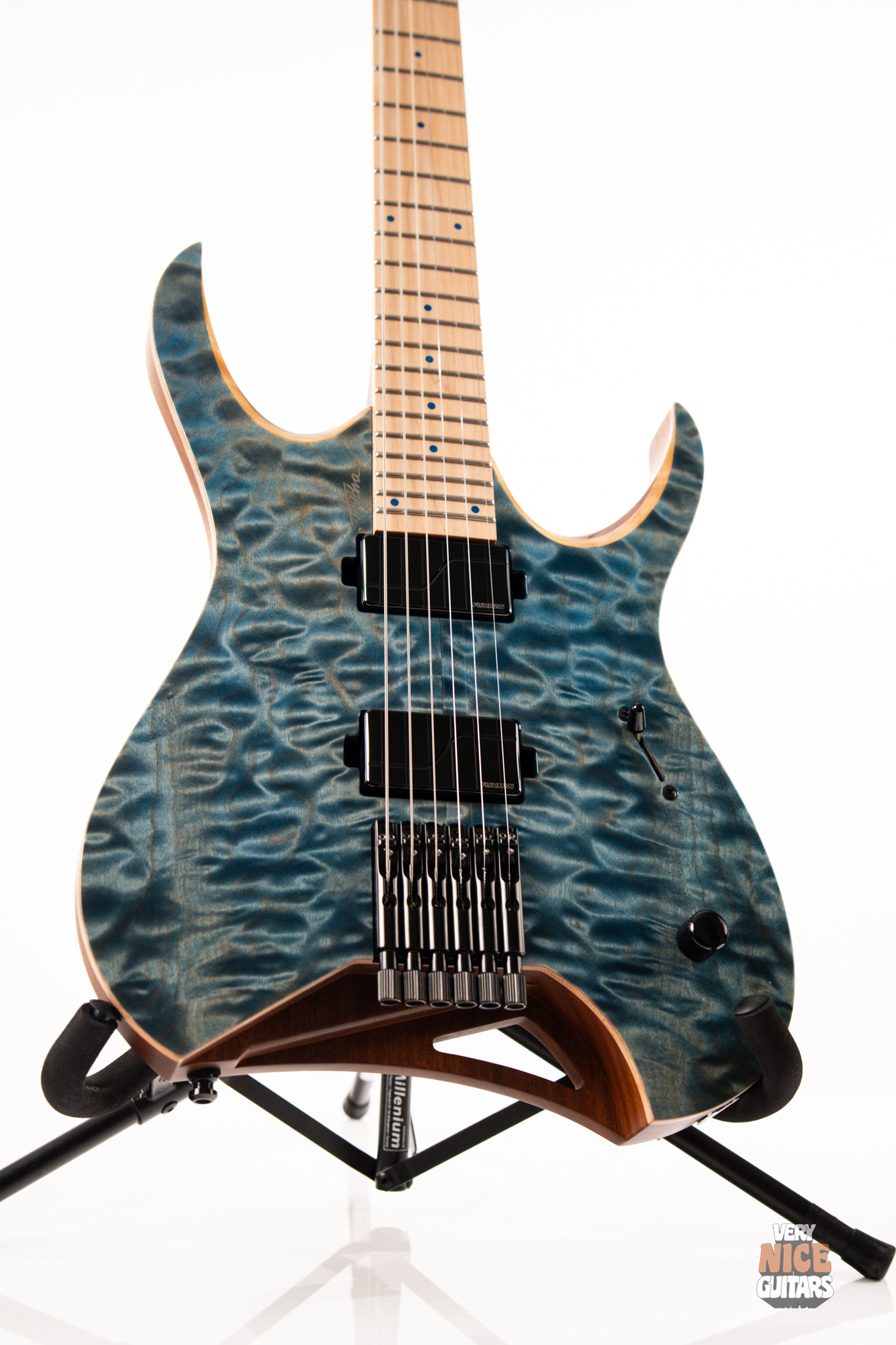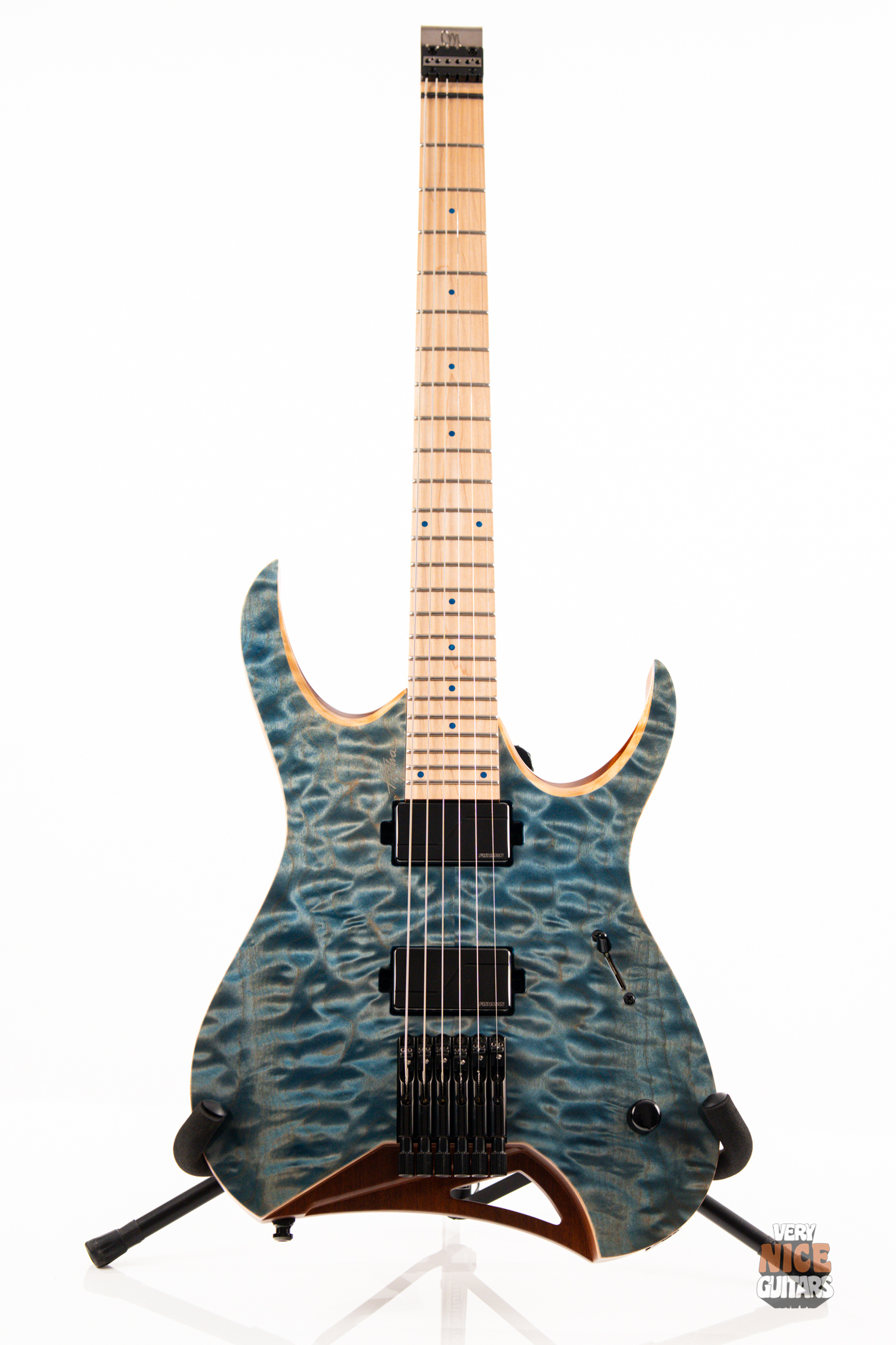 This Hydra is made of Mahogany body fitted with a stunning piece of a 4A grade quilted maple top. The neck is a 5 piece wenge and purpleheart with a hard rock maple fingerboard featuring 24 extra jumbo stainless steel frets. Fingerboard also features matching aqua marine dot markers on the front and Luminlay SB-20 dots on the side. Bridge of this headless Mayones is an ABM 3801, an exceptional piece of hardware effortlessly taking care of the tuning stability. At the top of the neck it was equipped with Graph Tech Black Tusq nut. Under the hood, this beast is fitted with a pair of Fishman Fluence Modern humbuckers, delivering great tones in every scenario. For controls you get master volume with a push/pull for voicings and a 5 way pickup selector, allowing for even more variety of sounds.