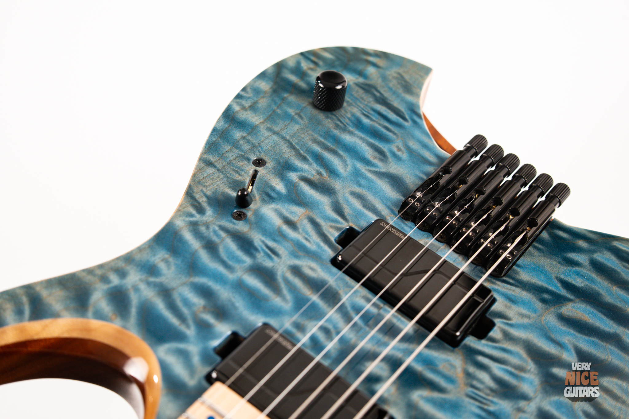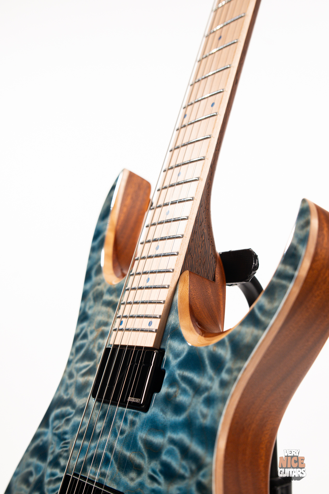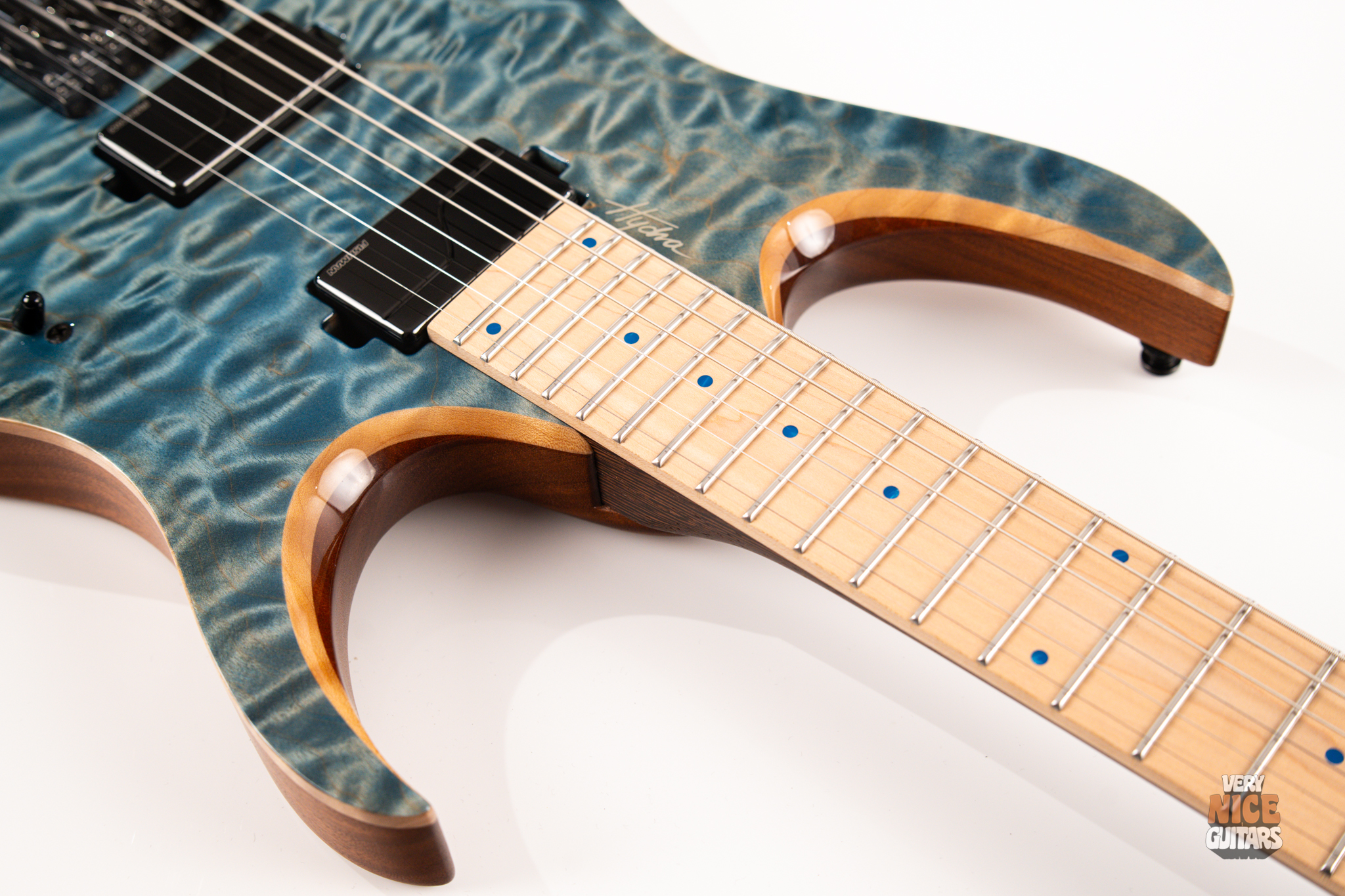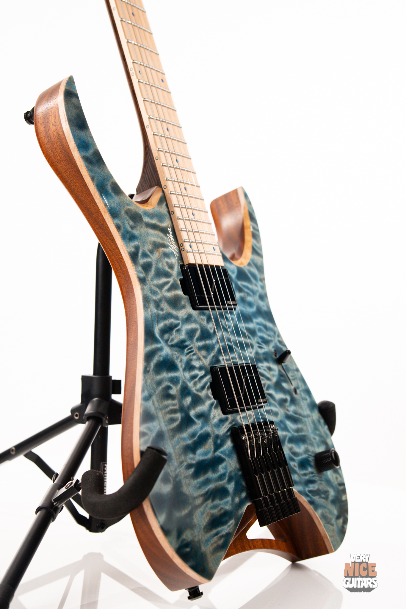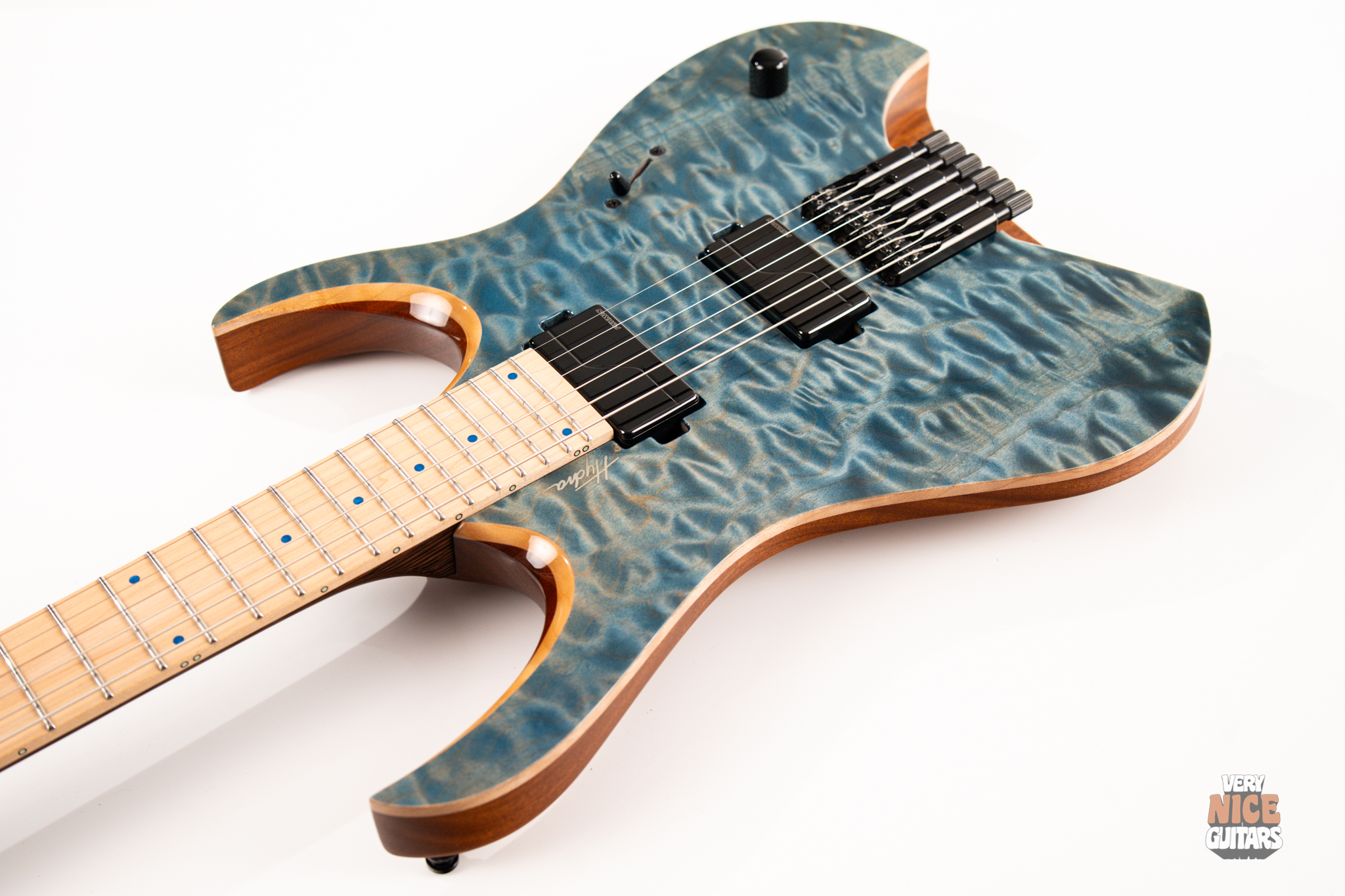 This Hydra is made of Mahogany body fitted with a stunning piece of a 4A grade quilted maple top. The neck is a 5 piece wenge and purpleheart with a hard rock maple fingerboard featuring 24 extra jumbo stainless steel frets. Fingerboard also features matching aqua marine dot markers on the front and Luminlay SB-20 dots on the side. Bridge of this headless Mayones is an ABM 3801, an exceptional piece of hardware effortlessly taking care of the tuning stability. At the top of the neck it was equipped with Graph Tech Black Tusq nut. Under the hood, this beast is fitted with a pair of Fishman Fluence Modern humbuckers, delivering great tones in every scenario. For controls you get master volume with a push/pull for voicings and a 5 way pickup selector, allowing for even more variety of sounds.