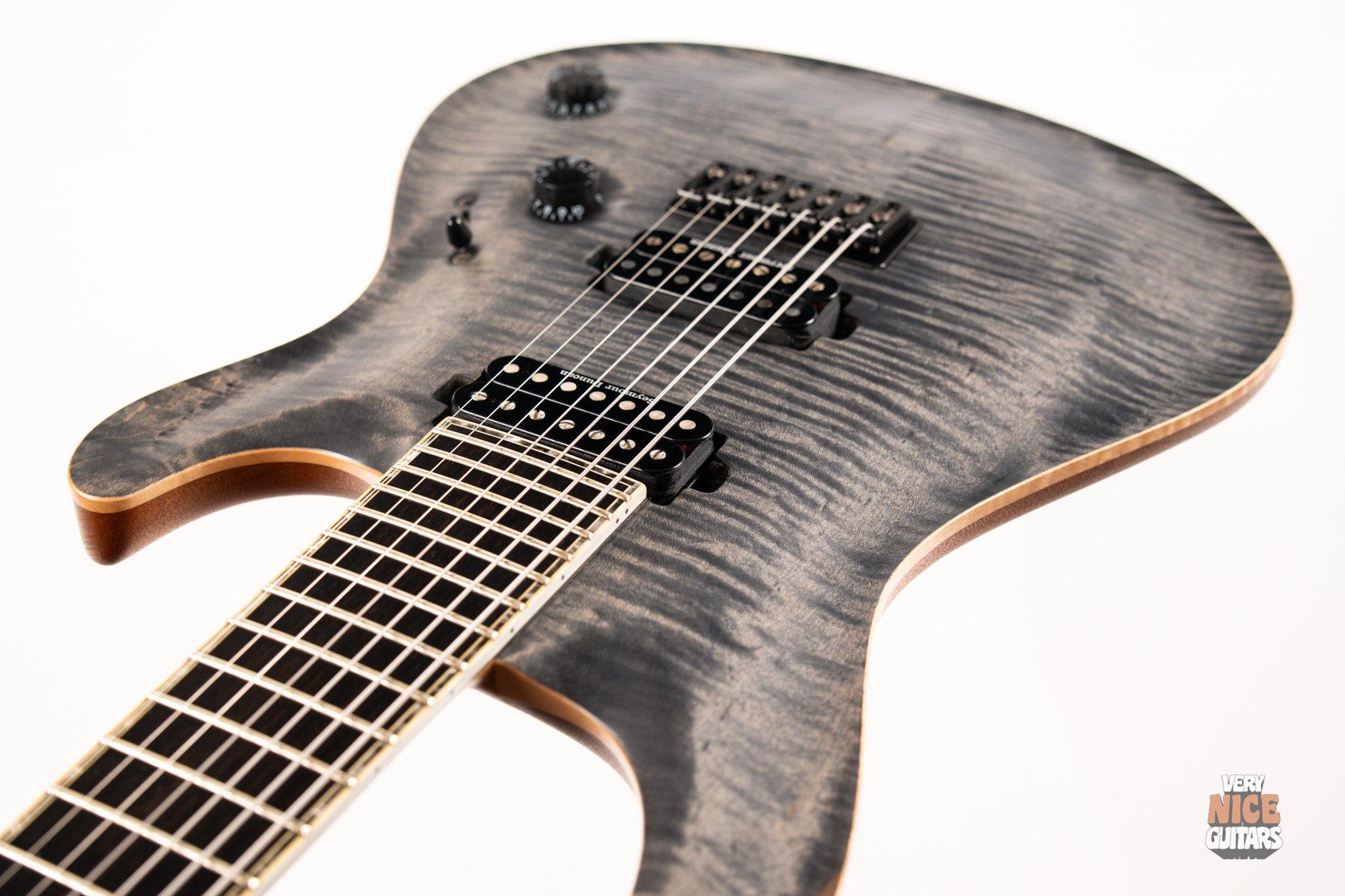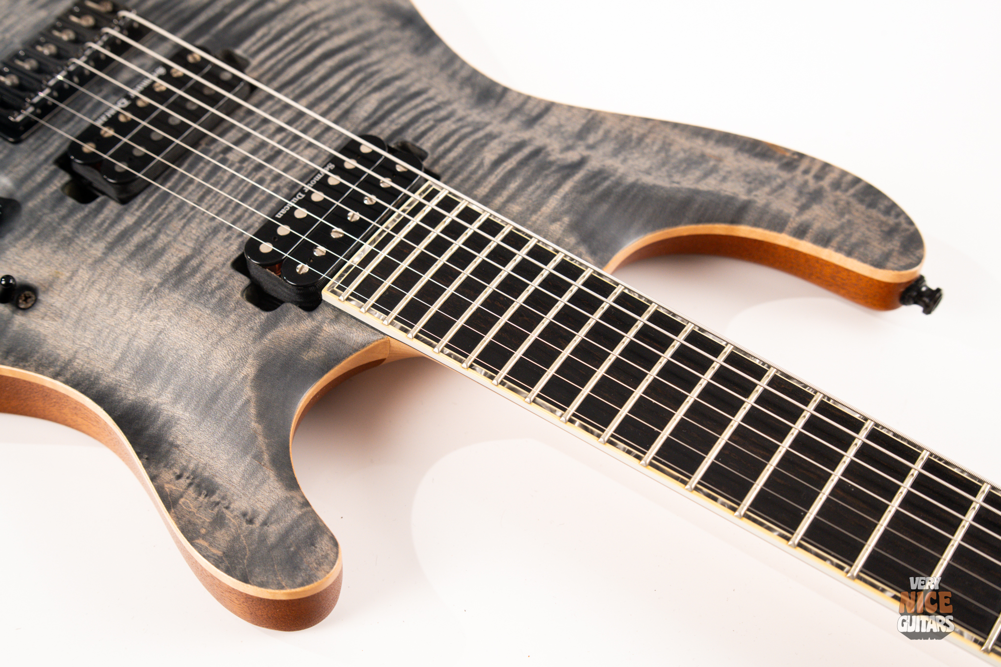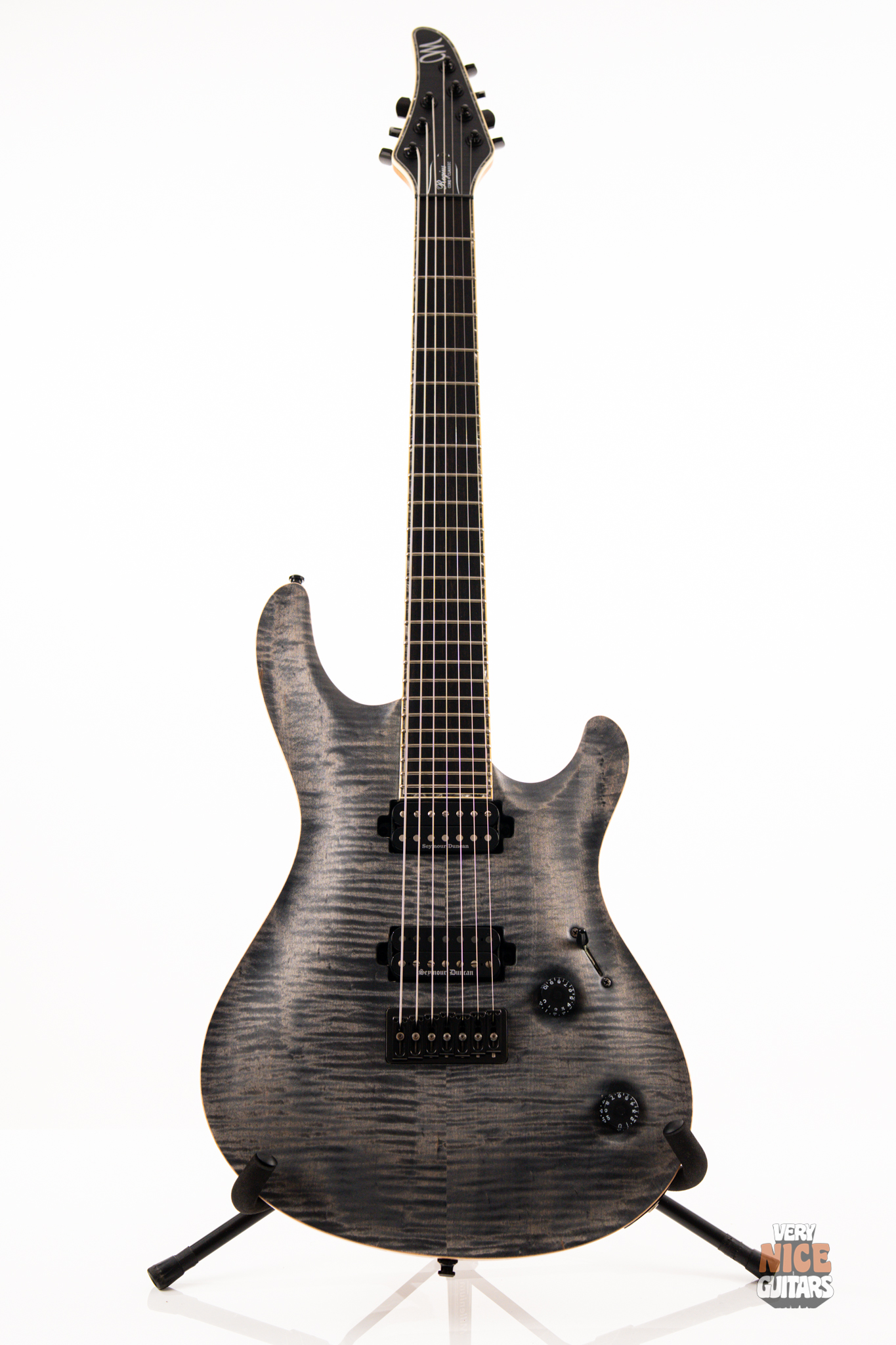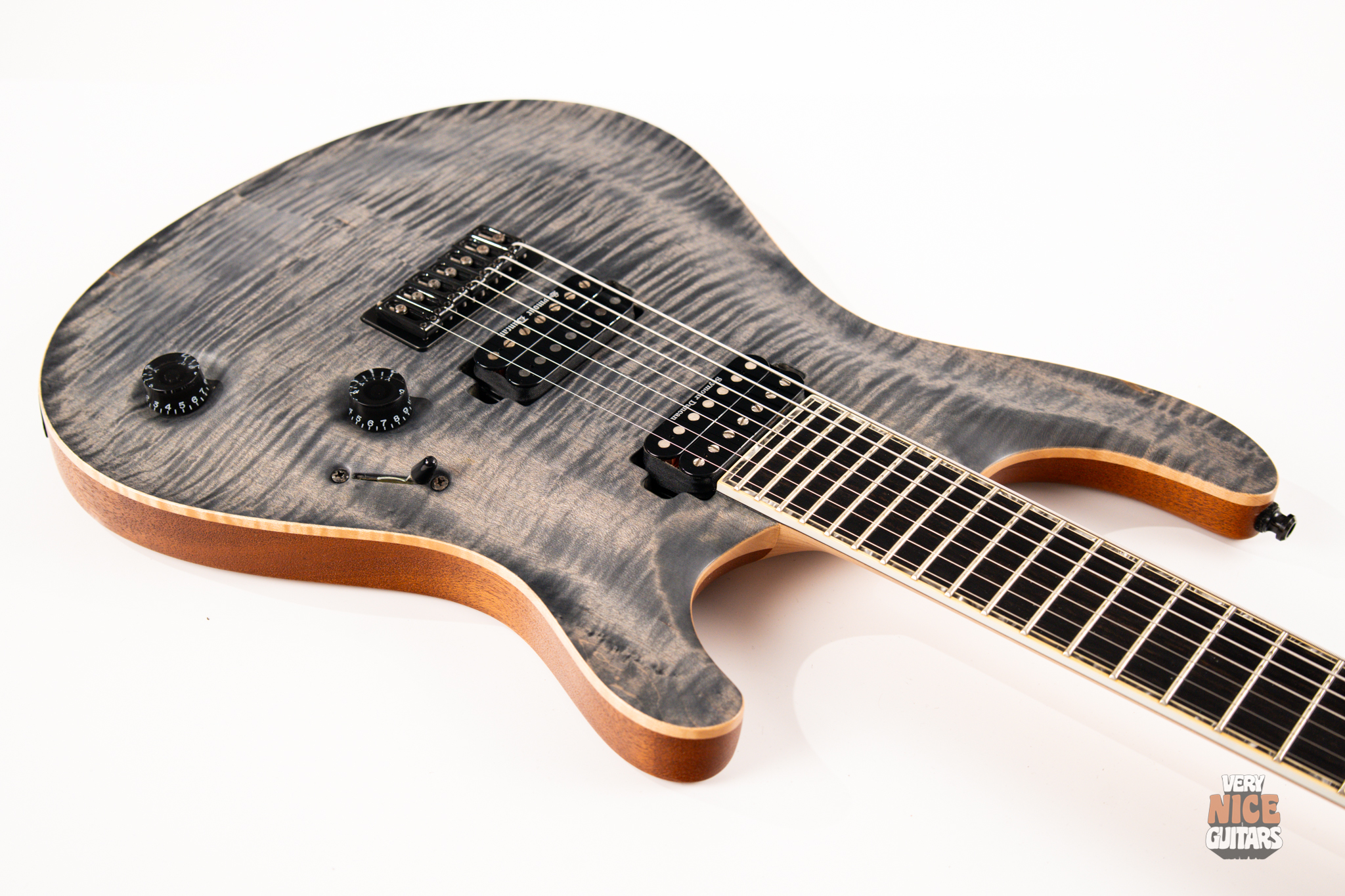 This Regius 7 model features neck through body construction and a stunning flamed maple carve top in Trans Graphite satin finish. The body is mahogany with an 11 piece neck made of maple, mahogany, amazakoe and wenge. Fingerboard is ebony with 3 ply pearloid binding and 24 nickel silver frets. A longer 26,5 inch scale allows for proper tension for the 7th string even in lower tunings. ABM Hardtail bridge and Hipshot Grip-Lock tuners keep the tuning stability in check. Under the hood of this beast you’ll find a pair of Seymour Duncan pickups – Jazz 7 in the neck and Blackwinter in the bridge position. For controls it features master volume, master tone and 3 way selector switch.