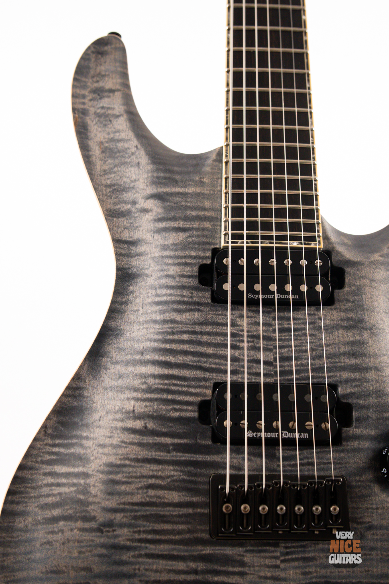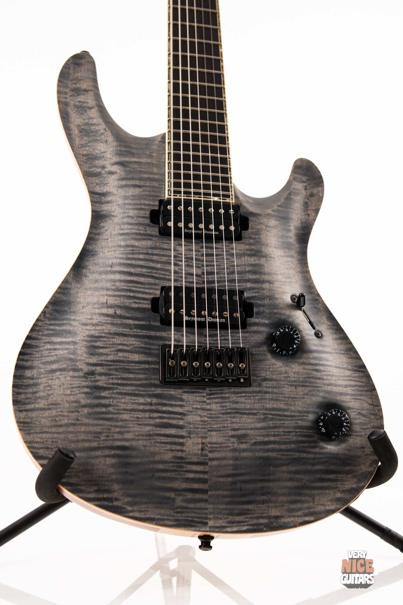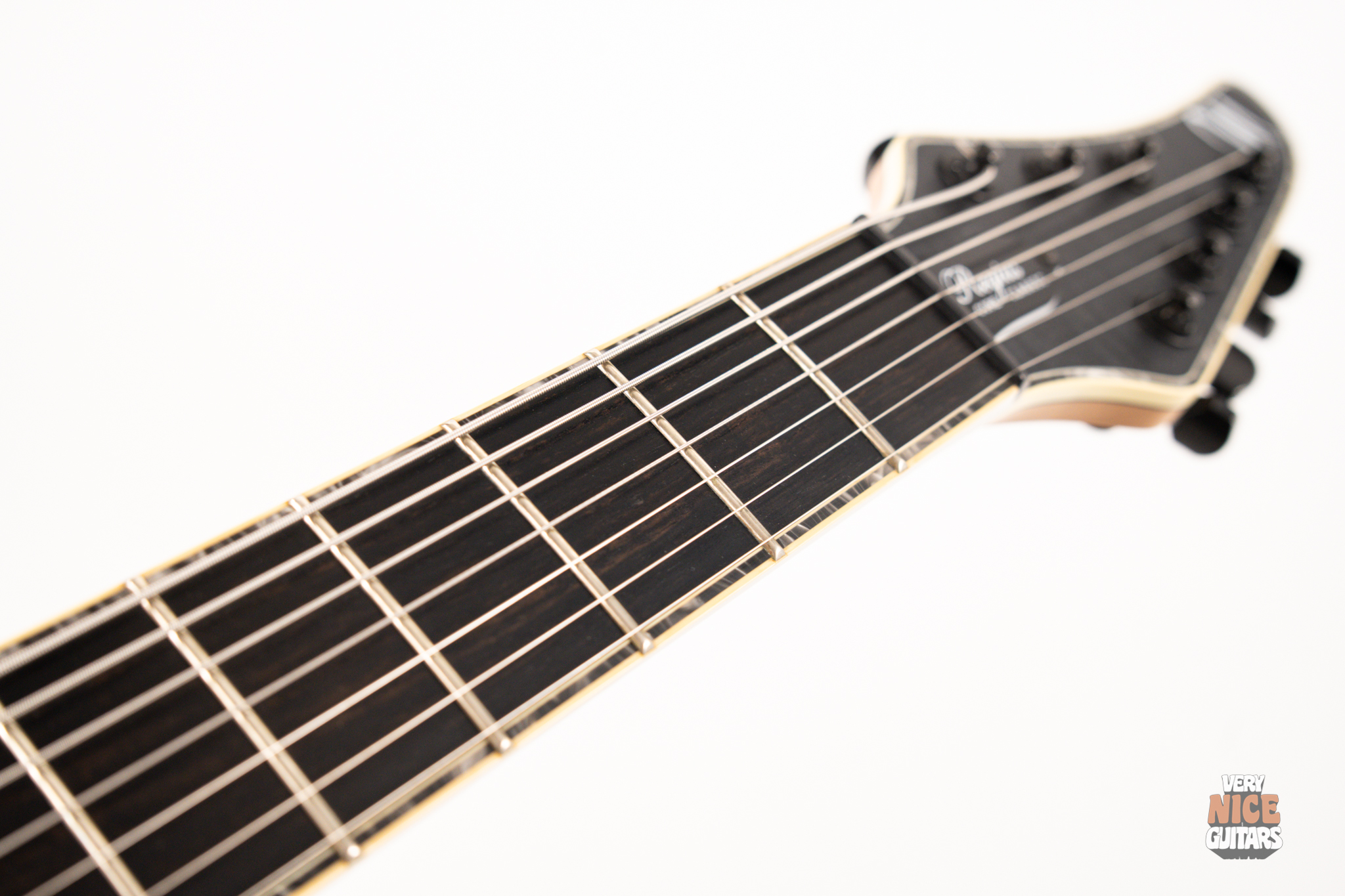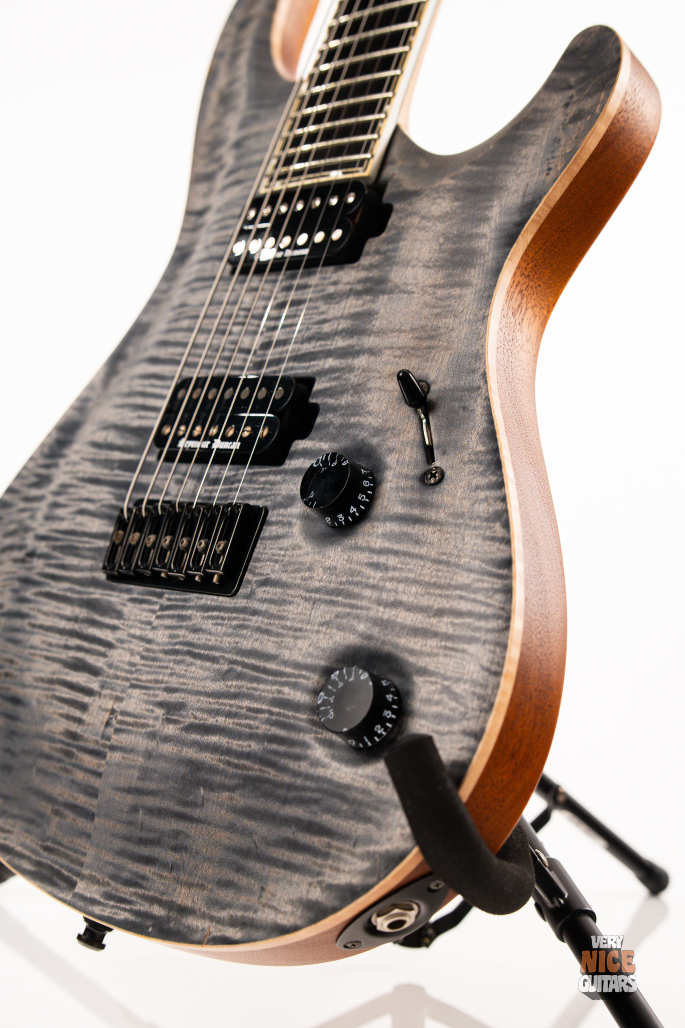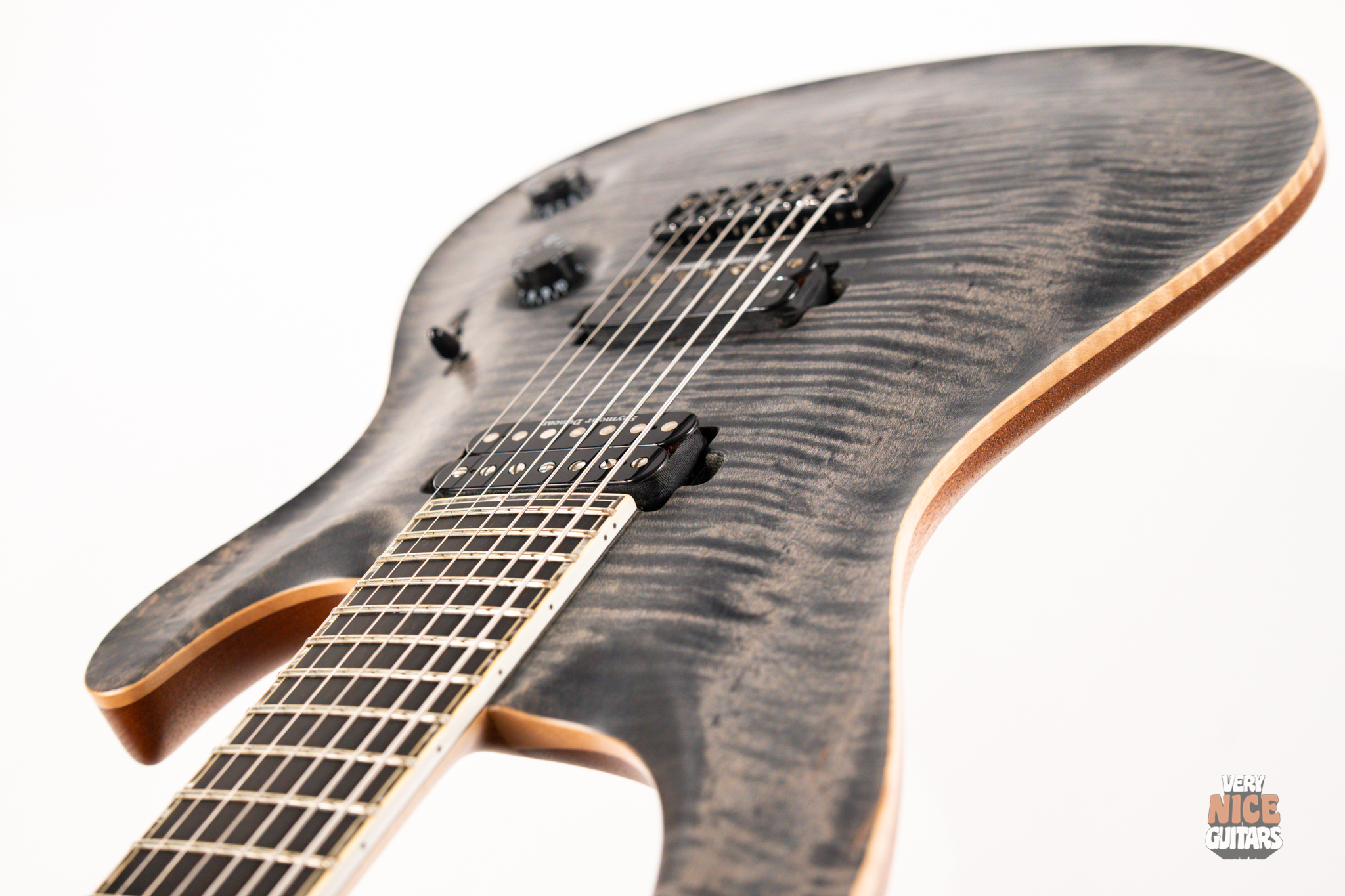 This Regius 7 model features neck through body construction and a stunning flamed maple carve top in Trans Graphite satin finish. The body is mahogany with an 11 piece neck made of maple, mahogany, amazakoe and wenge. Fingerboard is ebony with 3 ply pearloid binding and 24 nickel silver frets. A longer 26,5 inch scale allows for proper tension for the 7th string even in lower tunings. ABM Hardtail bridge and Hipshot Grip-Lock tuners keep the tuning stability in check. Under the hood of this beast you’ll find a pair of Seymour Duncan pickups – Jazz 7 in the neck and Blackwinter in the bridge position. For controls it features master volume, master tone and 3 way selector switch.