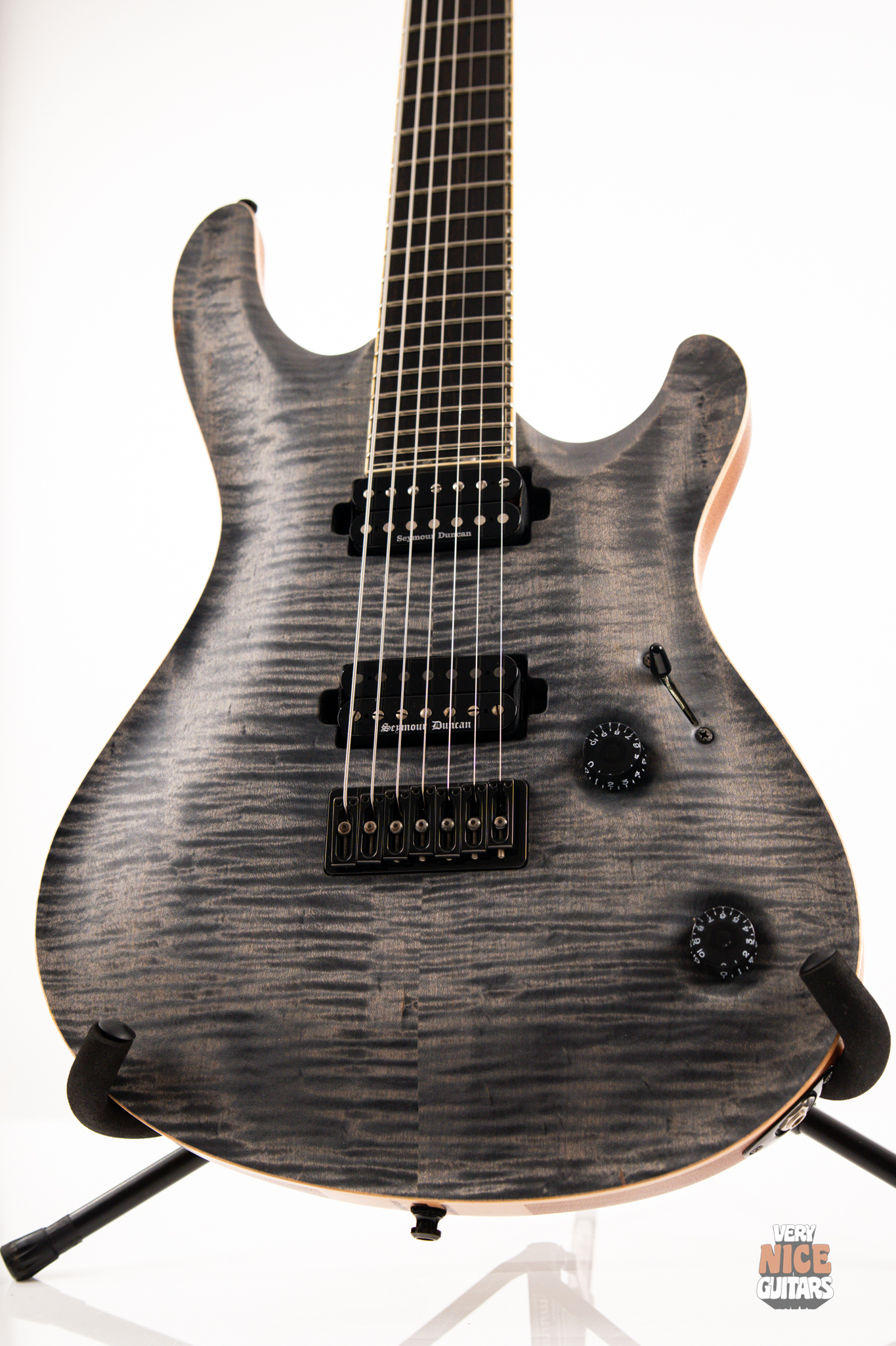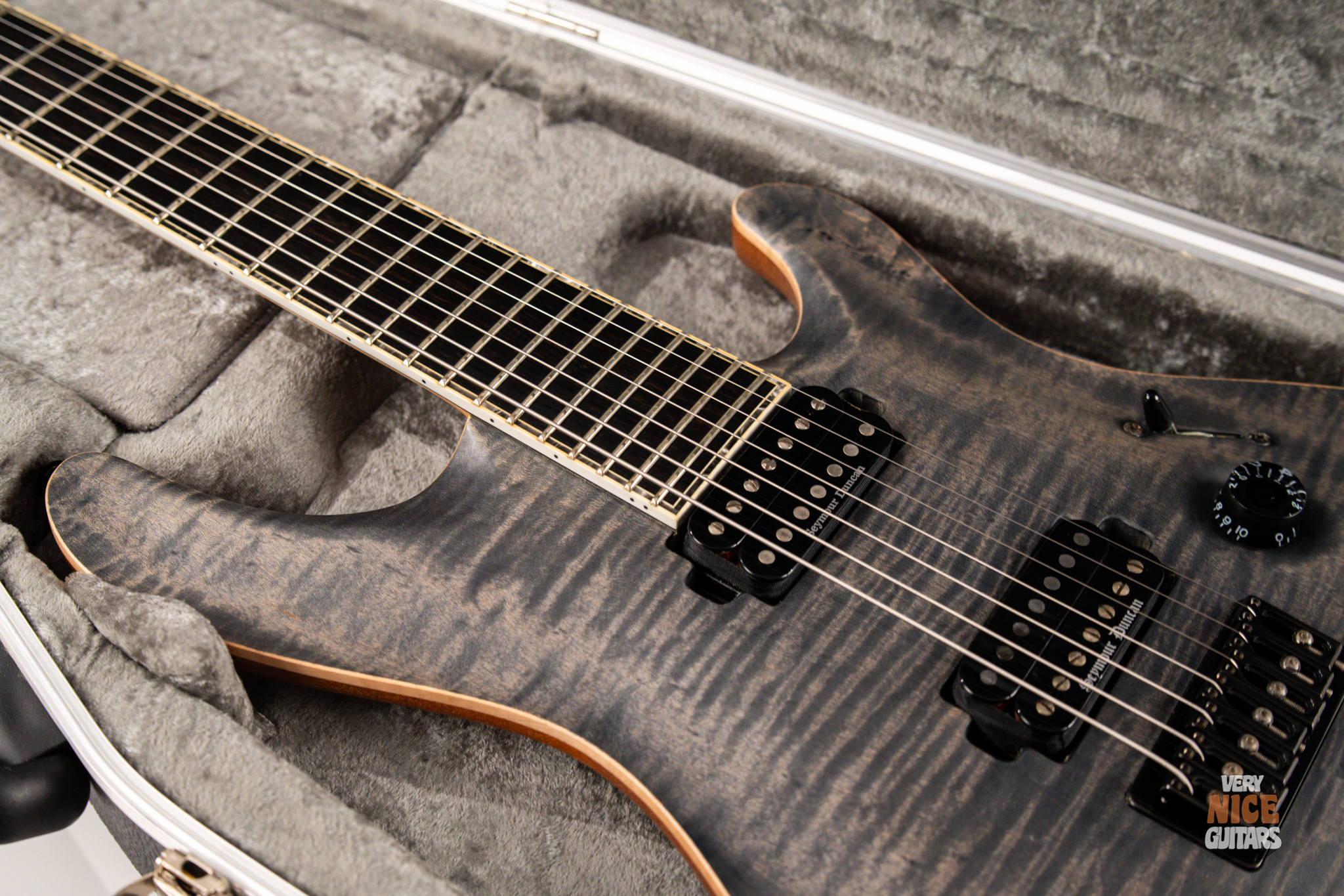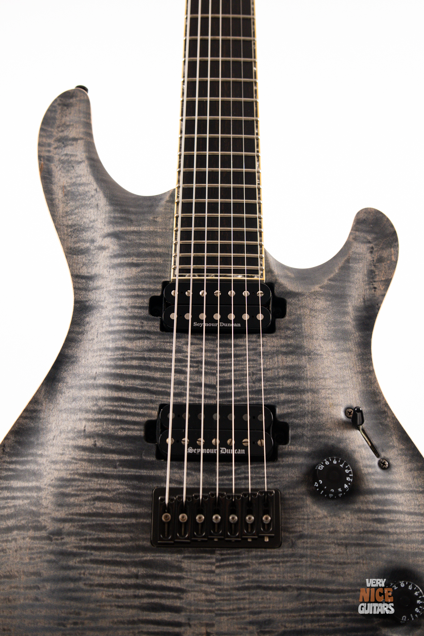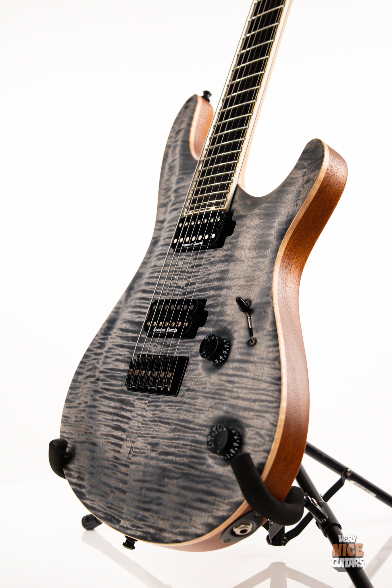 This Regius 7 model features neck through body construction and a stunning flamed maple carve top in Trans Graphite satin finish. The body is mahogany with an 11 piece neck made of maple, mahogany, amazakoe and wenge. Fingerboard is ebony with 3 ply pearloid binding and 24 nickel silver frets. A longer 26,5 inch scale allows for proper tension for the 7th string even in lower tunings. ABM Hardtail bridge and Hipshot Grip-Lock tuners keep the tuning stability in check. Under the hood of this beast you’ll find a pair of Seymour Duncan pickups – Jazz 7 in the neck and Blackwinter in the bridge position. For controls it features master volume, master tone and 3 way selector switch.