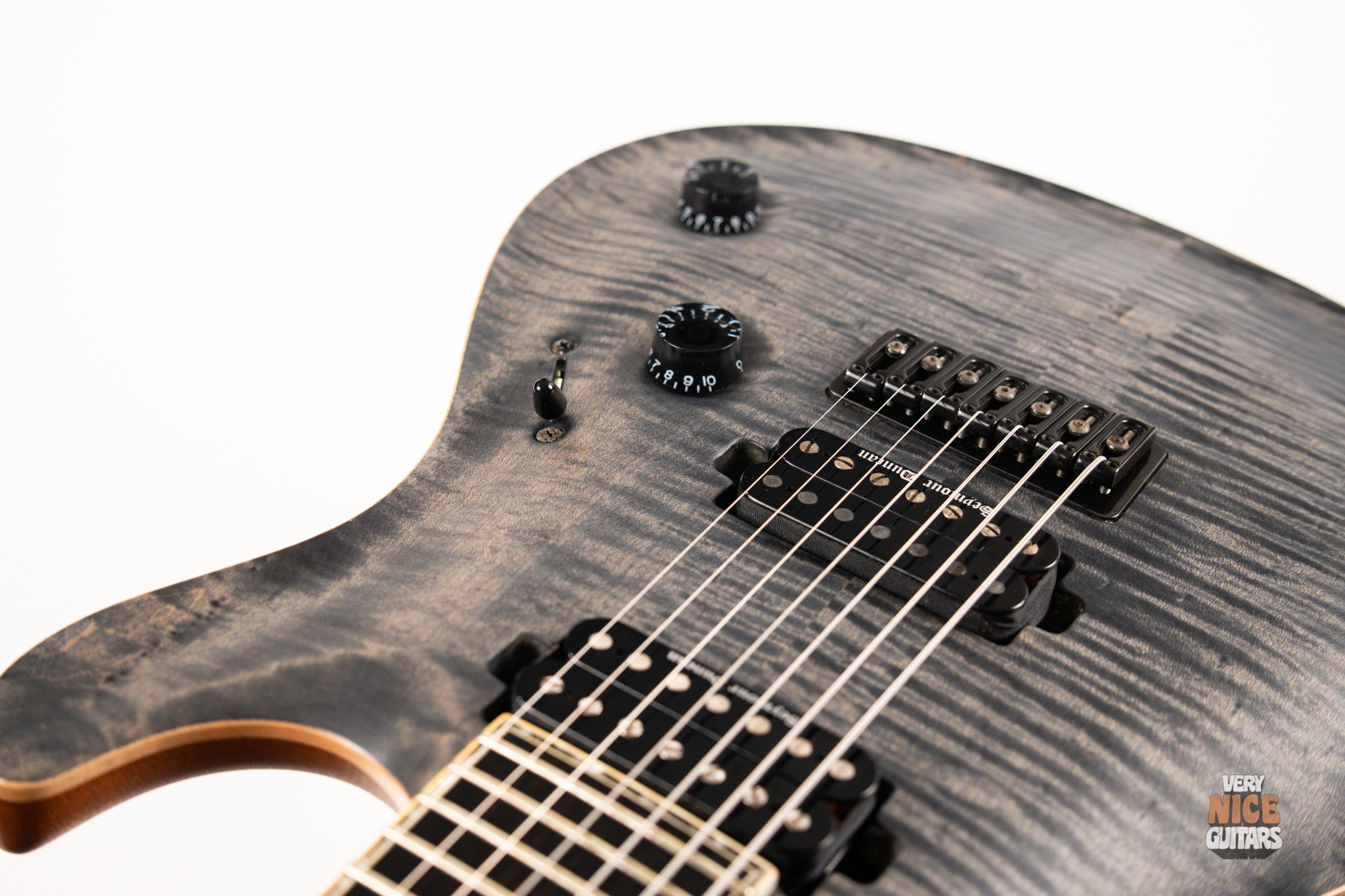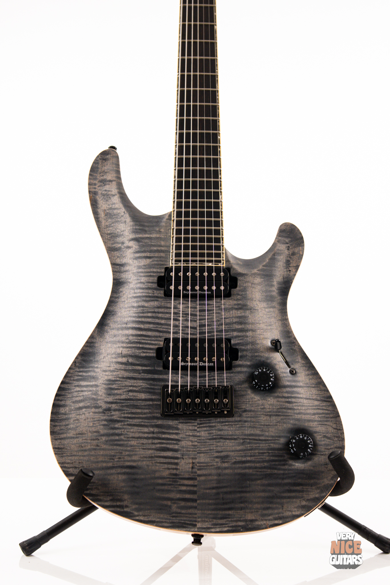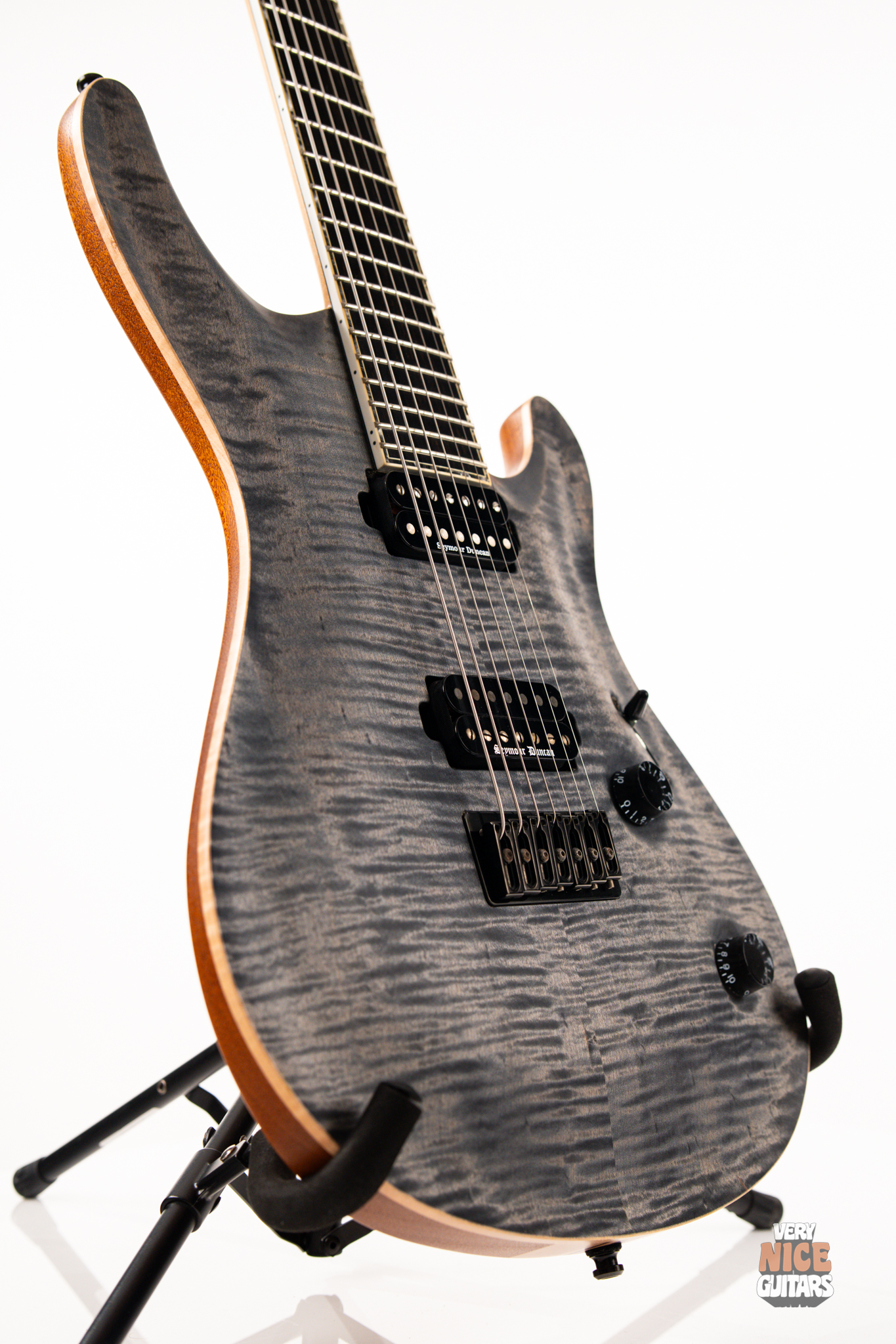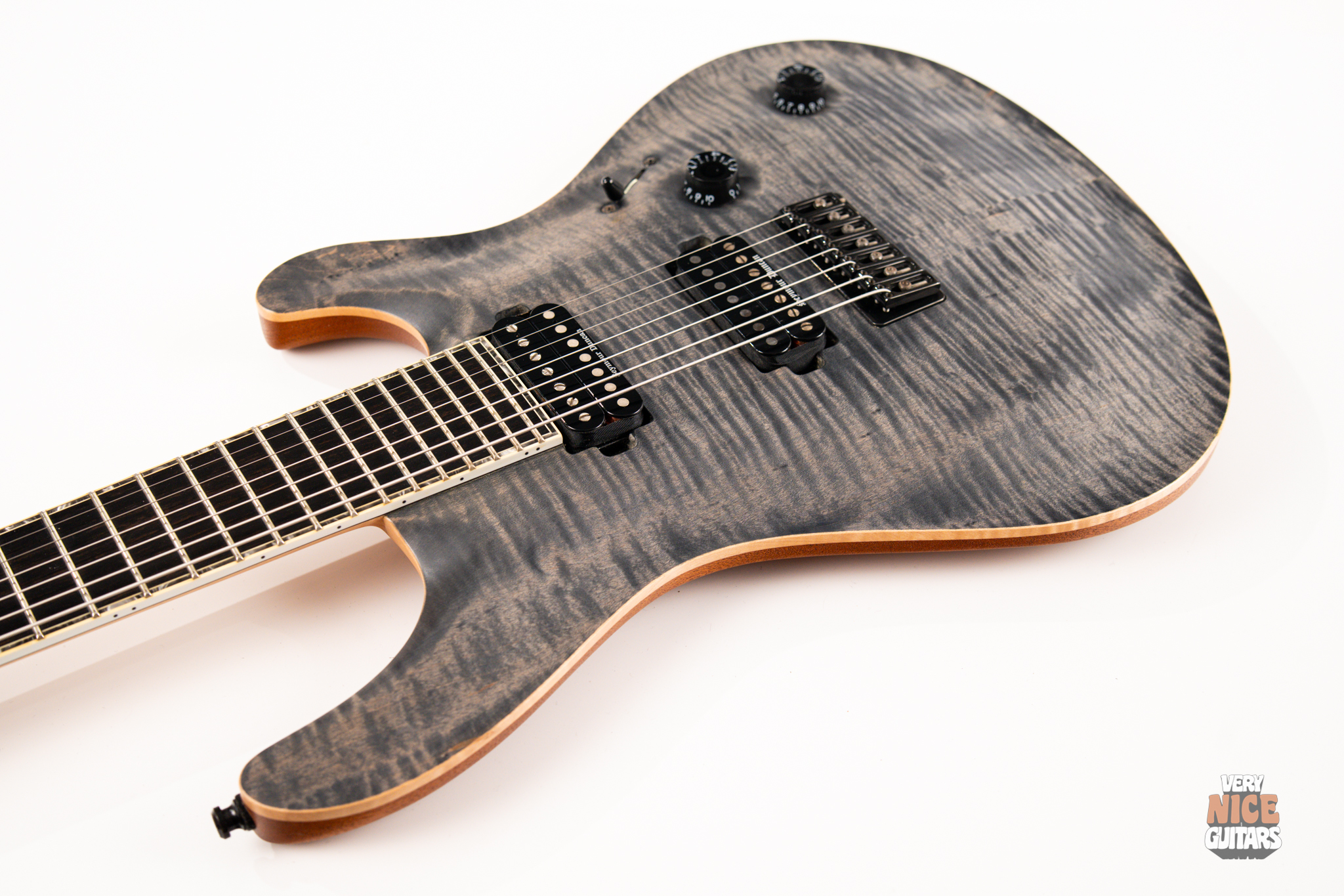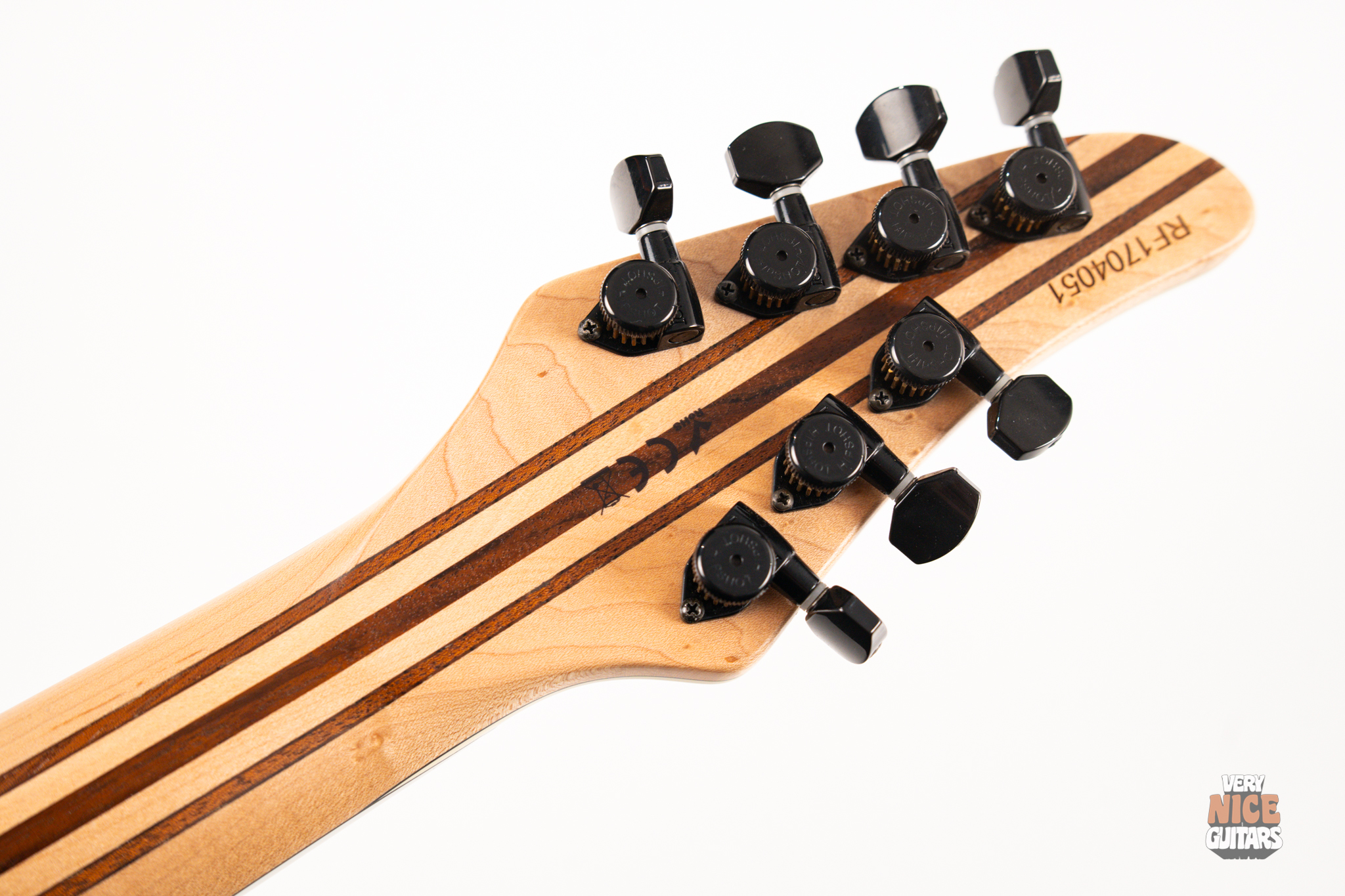 This Regius 7 model features neck through body construction and a stunning flamed maple carve top in Trans Graphite satin finish. The body is mahogany with an 11 piece neck made of maple, mahogany, amazakoe and wenge. Fingerboard is ebony with 3 ply pearloid binding and 24 nickel silver frets. A longer 26,5 inch scale allows for proper tension for the 7th string even in lower tunings. ABM Hardtail bridge and Hipshot Grip-Lock tuners keep the tuning stability in check. Under the hood of this beast you’ll find a pair of Seymour Duncan pickups – Jazz 7 in the neck and Blackwinter in the bridge position. For controls it features master volume, master tone and 3 way selector switch.