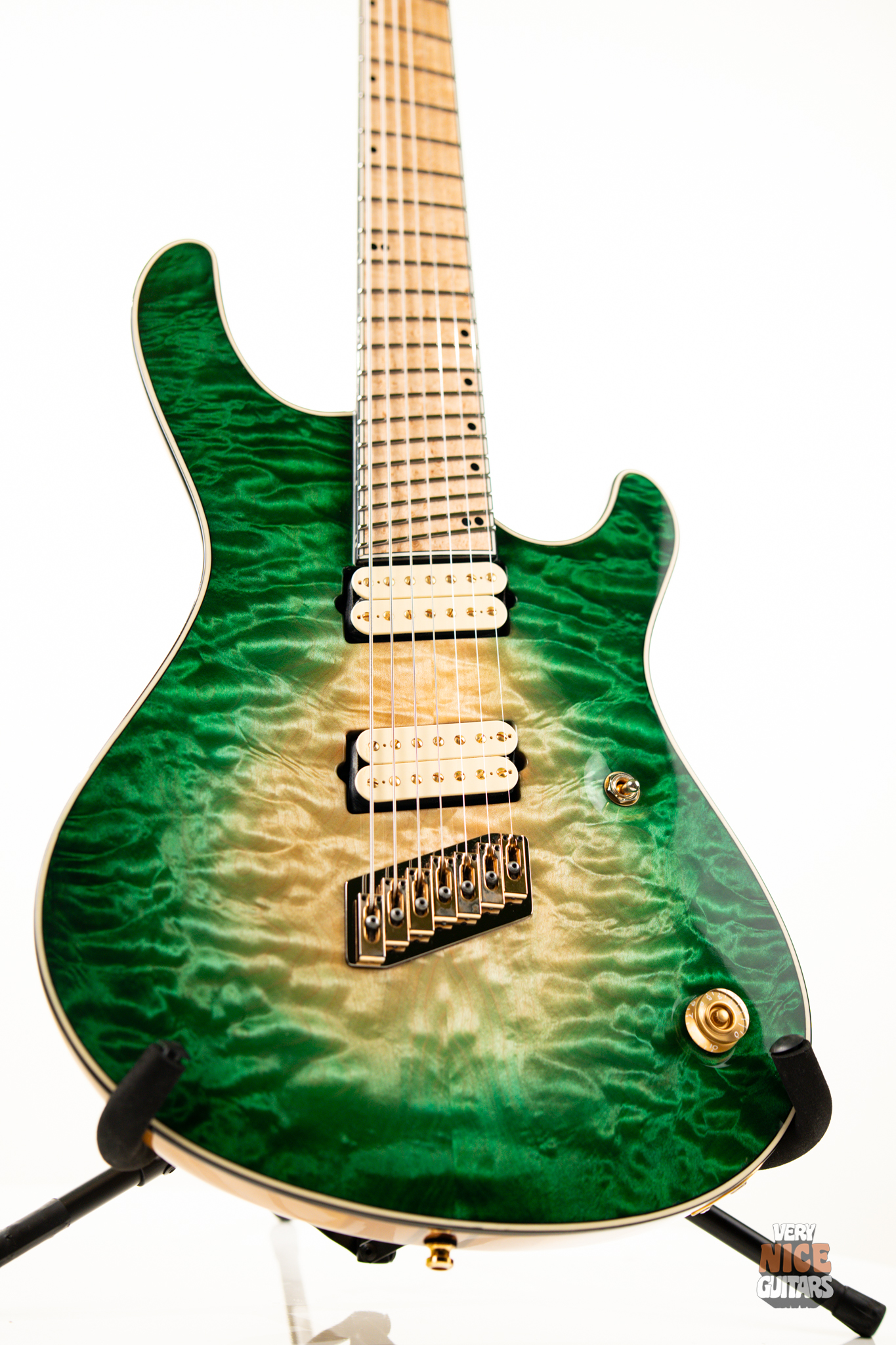 This Mayones looks simply stunning – Combination of AAAA Quilted maple top and green Fade Burst really pops! Add a Birdseye Maple neck to this equation and you get a truly modern looking chug machine. 25.4″ – 27″ Multiscale allows you to use baritone tunings, while maintaining high notes for your soloing needs. Famous 11-piece Mayones neck-through design results in amazing easy high fret access and unprecedented tuning stability. The guitar is loaded with Custom Mayones Multiscale bridge, Sperzel locking tuners and slanted Bare Knuckle Juggernaut 7 humbuckers. Needless to say that the guitar is crafted with meticulous attention to detail.