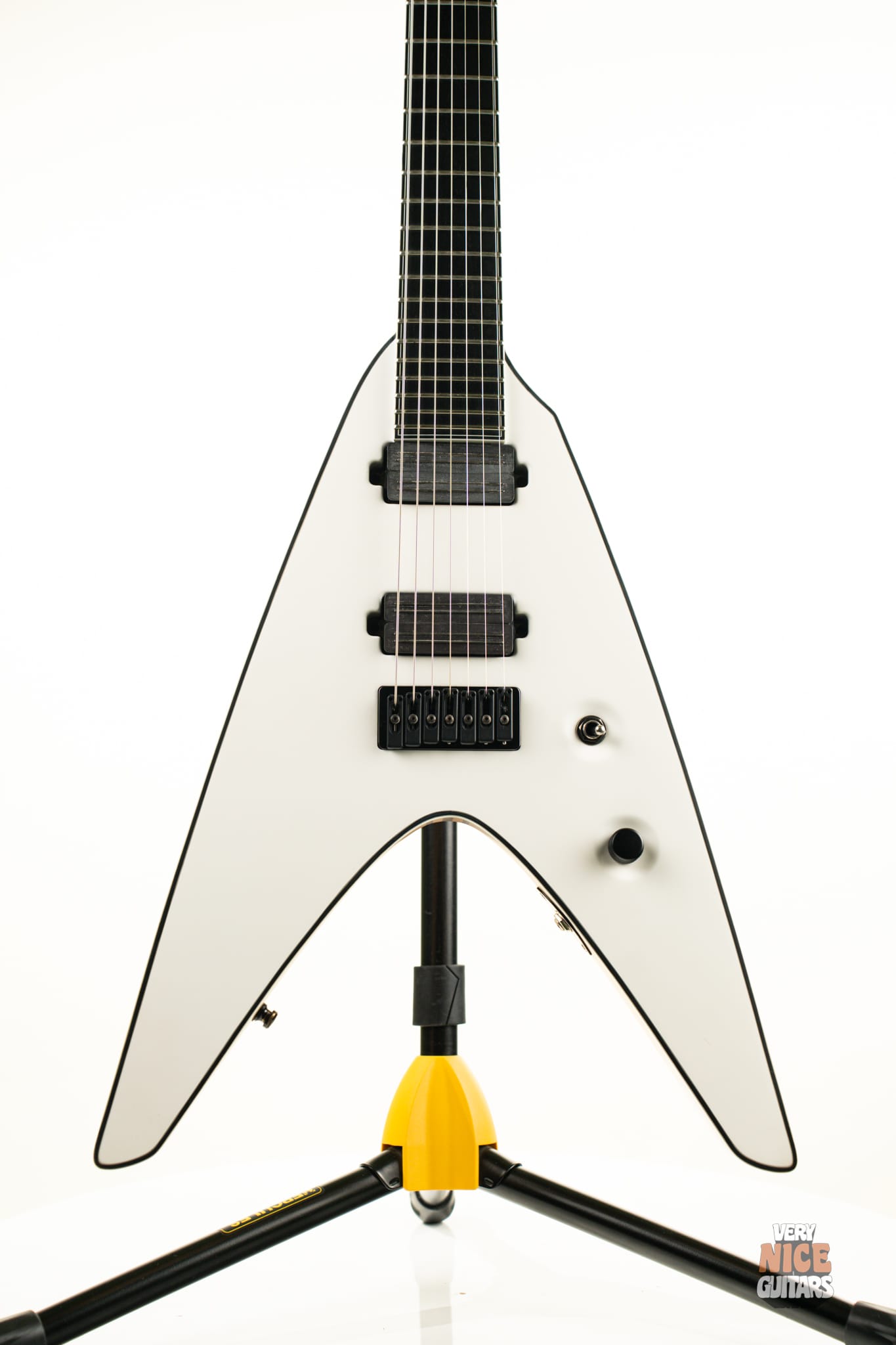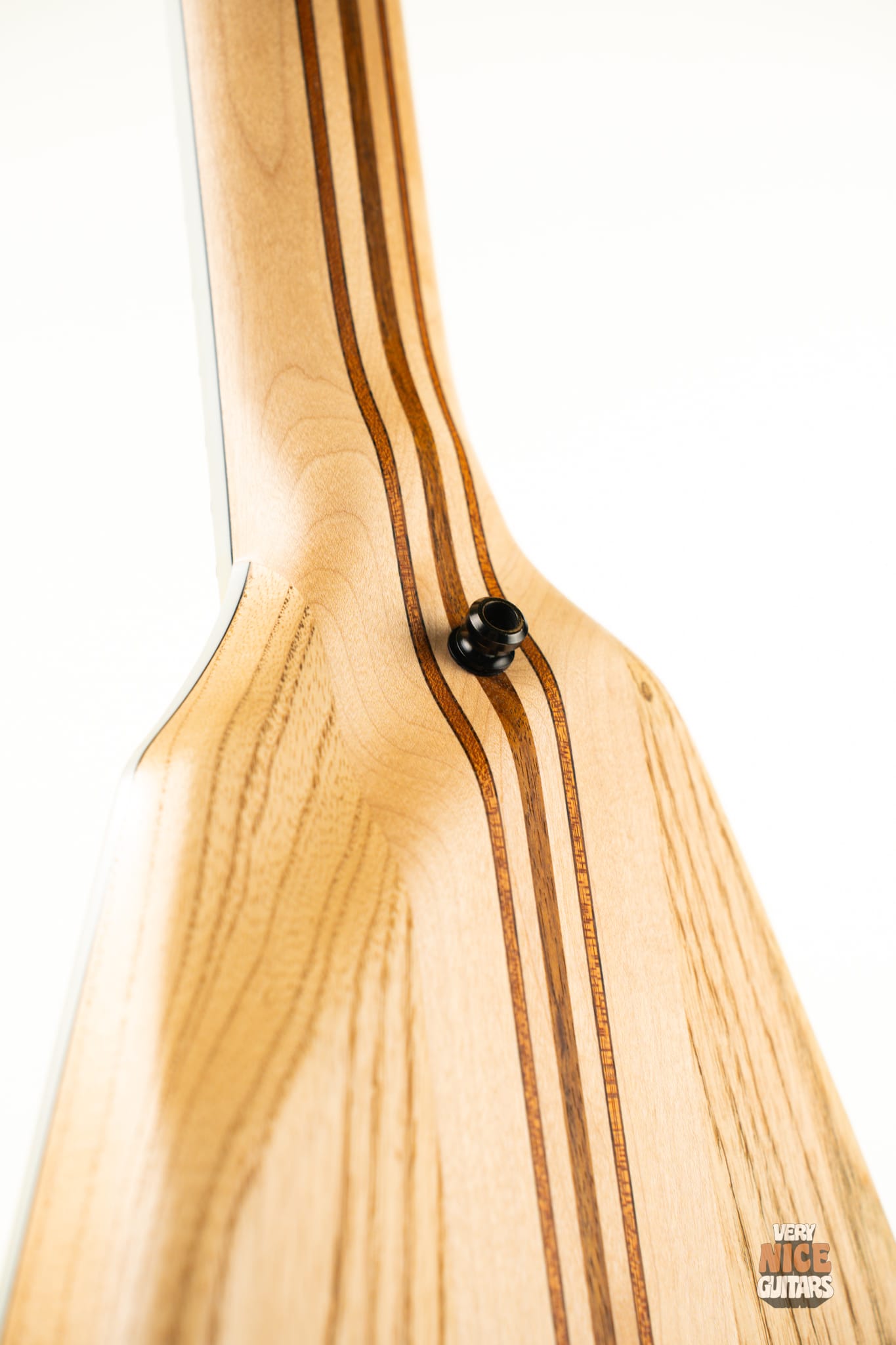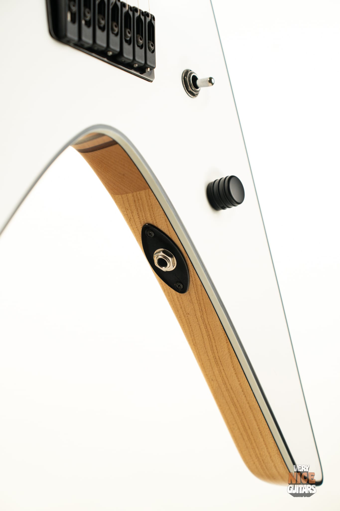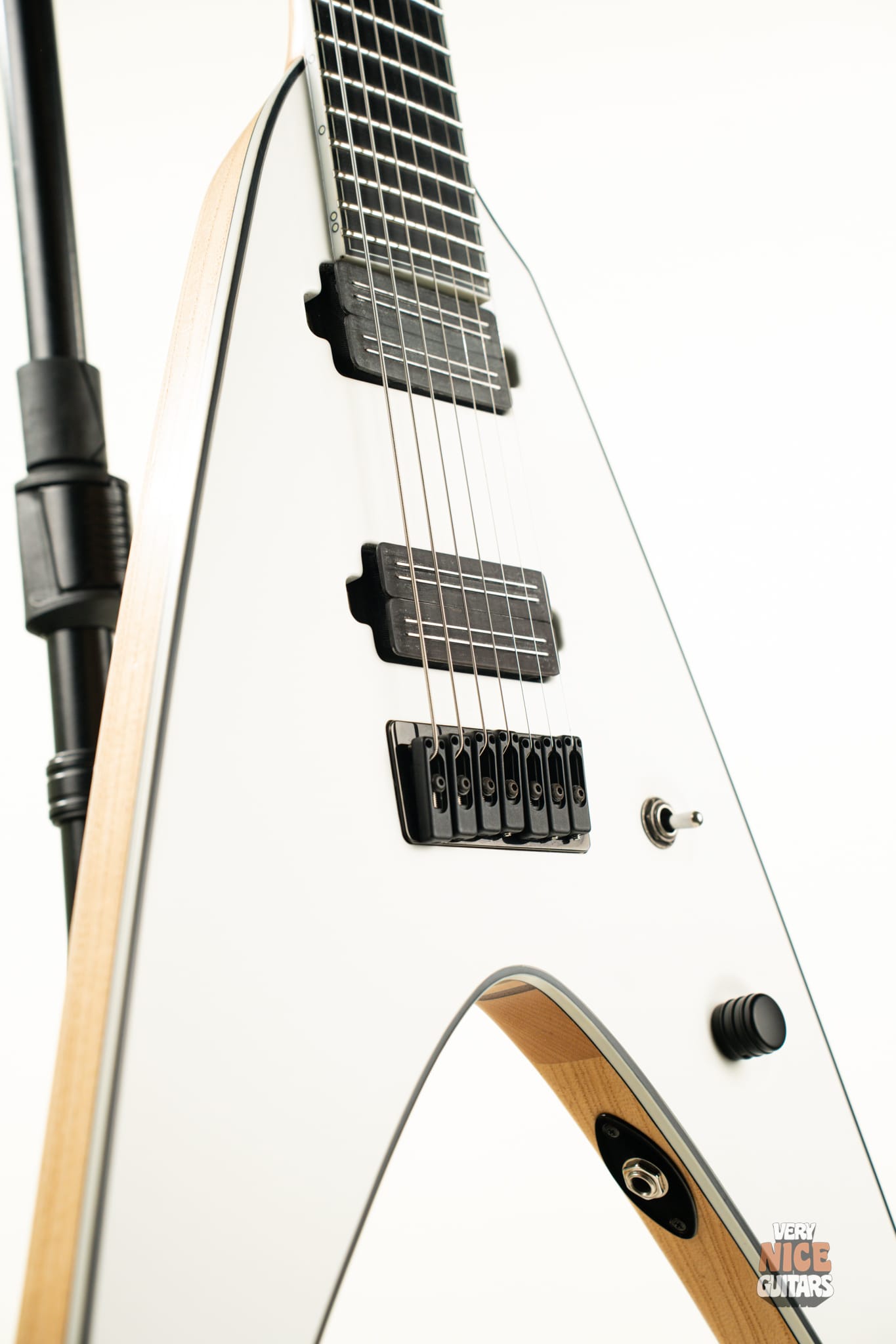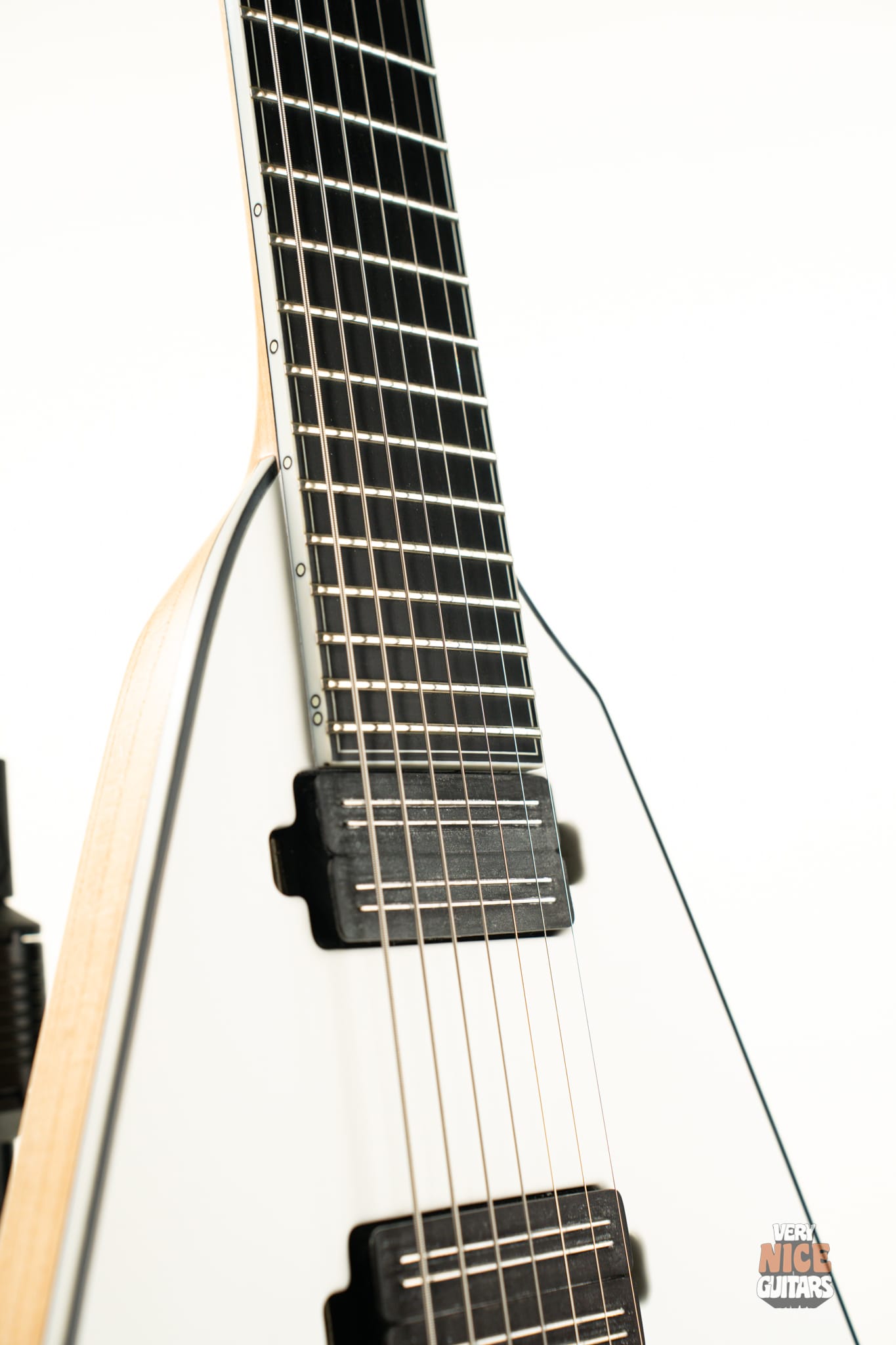 This guitar is sleek and elegant – yet undeniably metal. The neck-thru-body construction delivers exceptional sustain and resonance, while locking Hipshot tuners and a hardtail AMB bridge ensure rock-solid tuning stability and hassle-free maintenance. Equipped with a pair of top-tier Black Hawk Bare Knuckle pickups, it produces a powerful, articulate, and warm tone – even under intense high-gain saturation. The chunky neck profile, paired with excellent upper-fret access (a signature of the V-shaped design), offers outstanding precision and playability, even during the fastest, most demanding runs.
