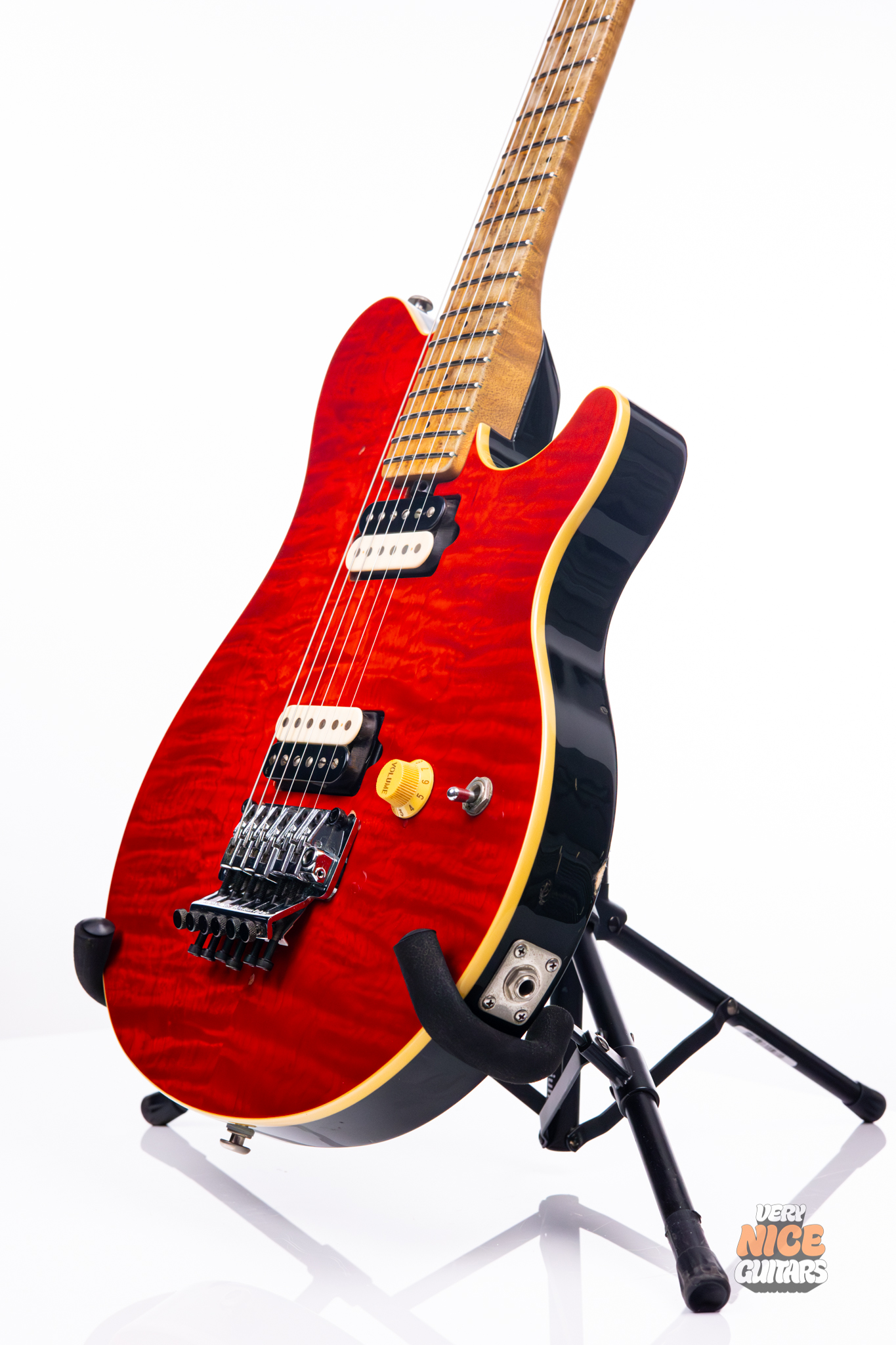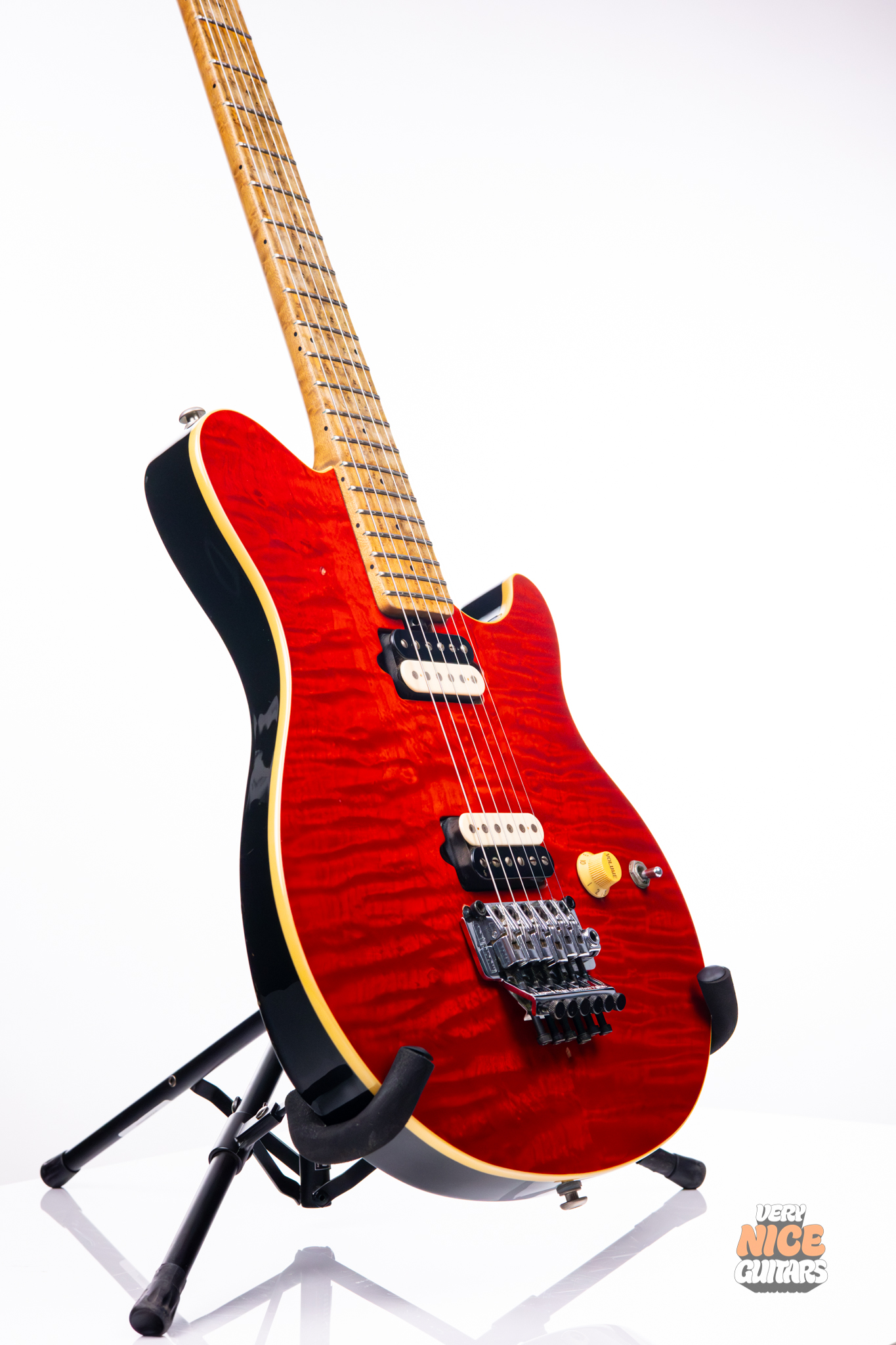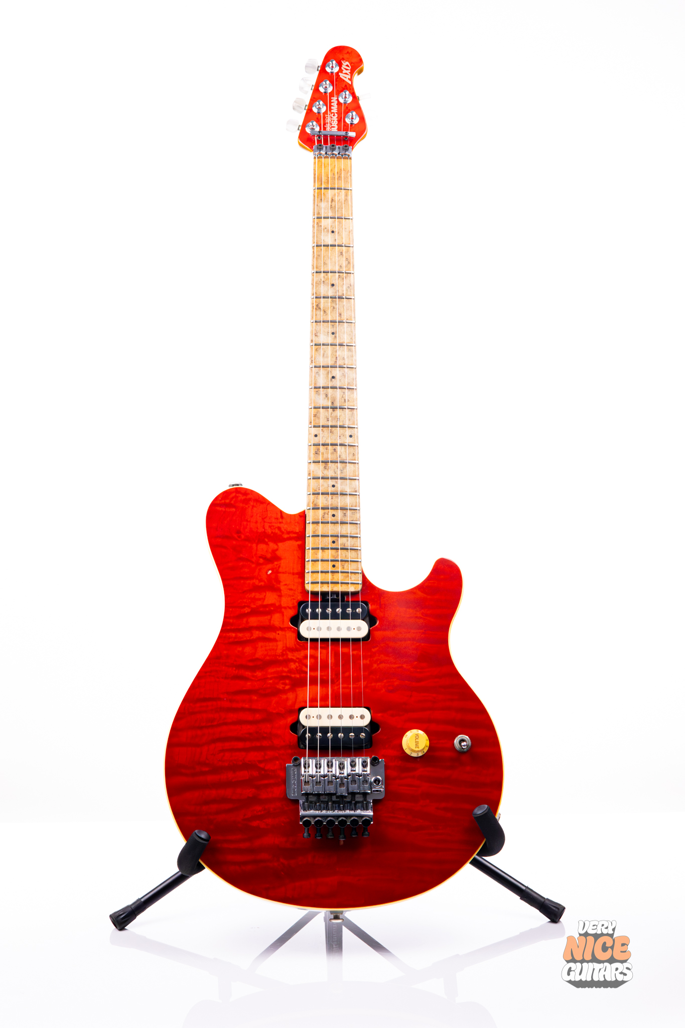 This guitar features a mahogany body with a quilted maple top, which while subtle, comes to life under natural light. The neck really steals the spotlight on this one though; a beautiful piece of birdseye maple was chosen for the neck and fingerboard. With 22 frets, this guitar will feel familiar to fans of classic guitar shapes. For the hardware, this guitar was equipped with chrome Schaller tuners with pearloid tips, and a chrome Music Man Floyd Rose. The locking nut assures tuning stability even under heavy tremolo bar use. This guitar is rounded out by two direct-mount DiMarzio Custom pickups, which deliver punch without sacrificing clarity.