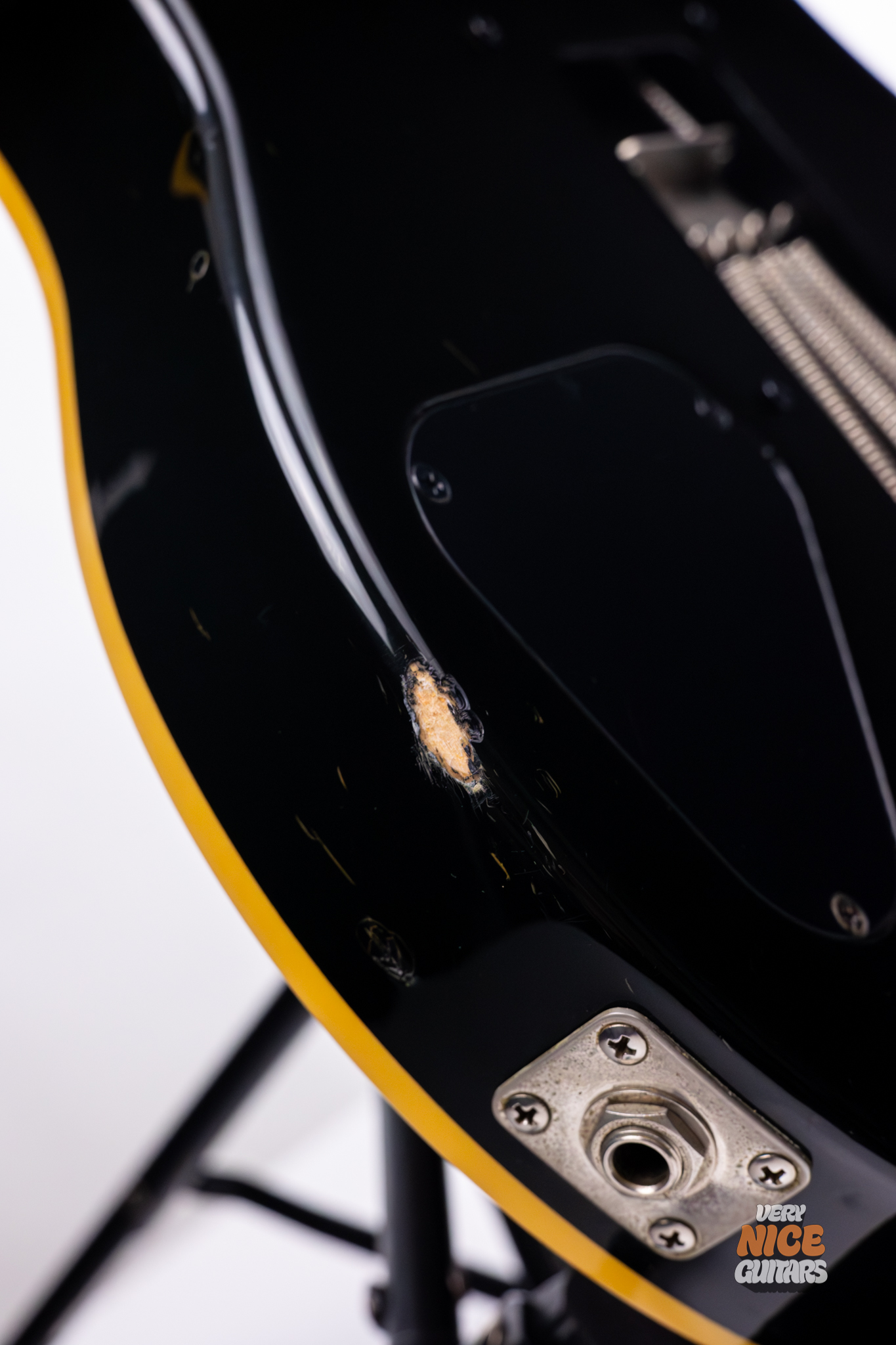 This guitar is used. The overall condition is decent, however the frets will soon need to be filed, as there are visible dents under the strings. There are multiple nicks and dings in the finish, with some of them protruding to the body wood. The fretboard also has signs of wear, mostly the dirt rubbed into it, however this is quite with unfinished necks.