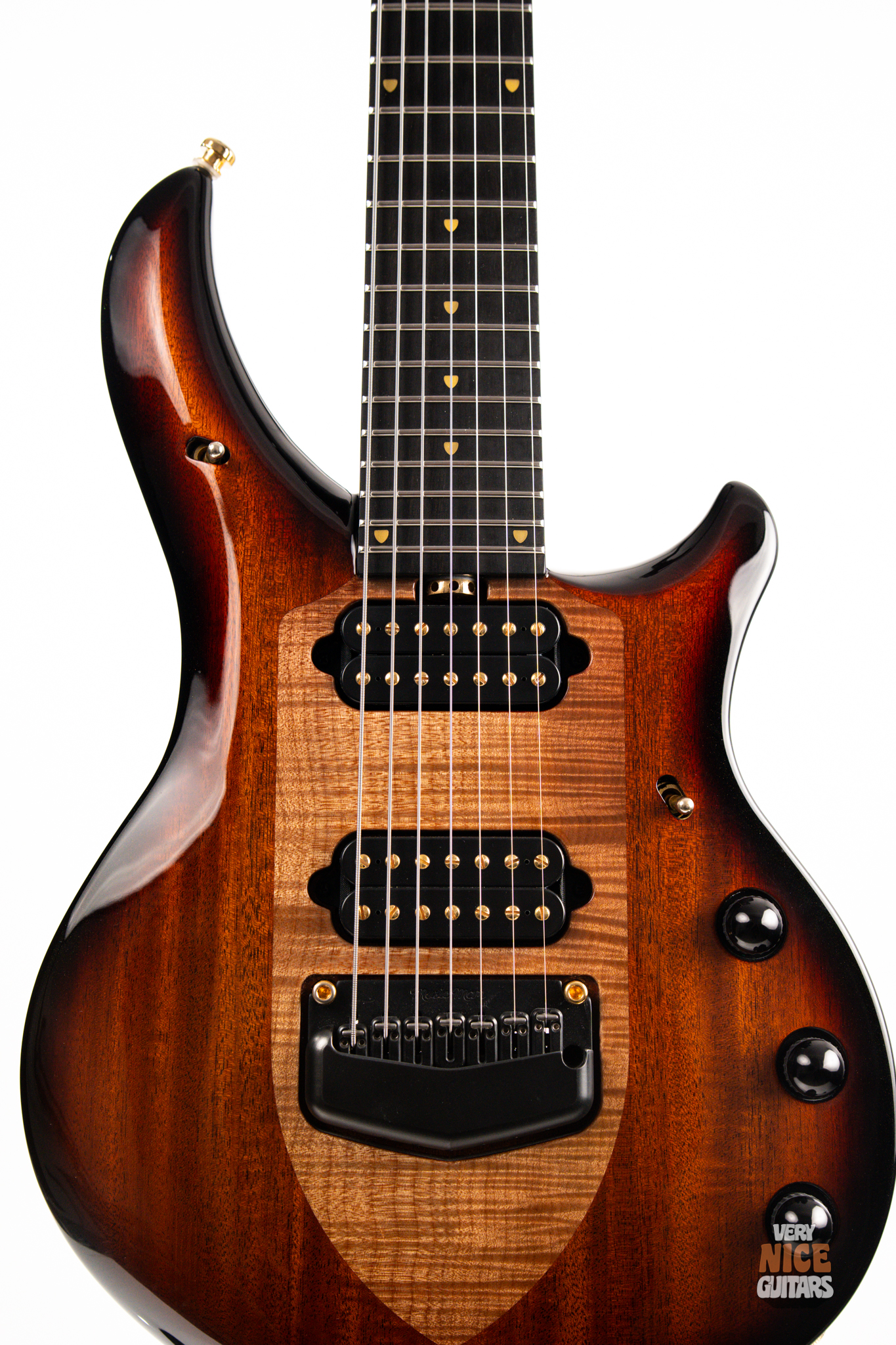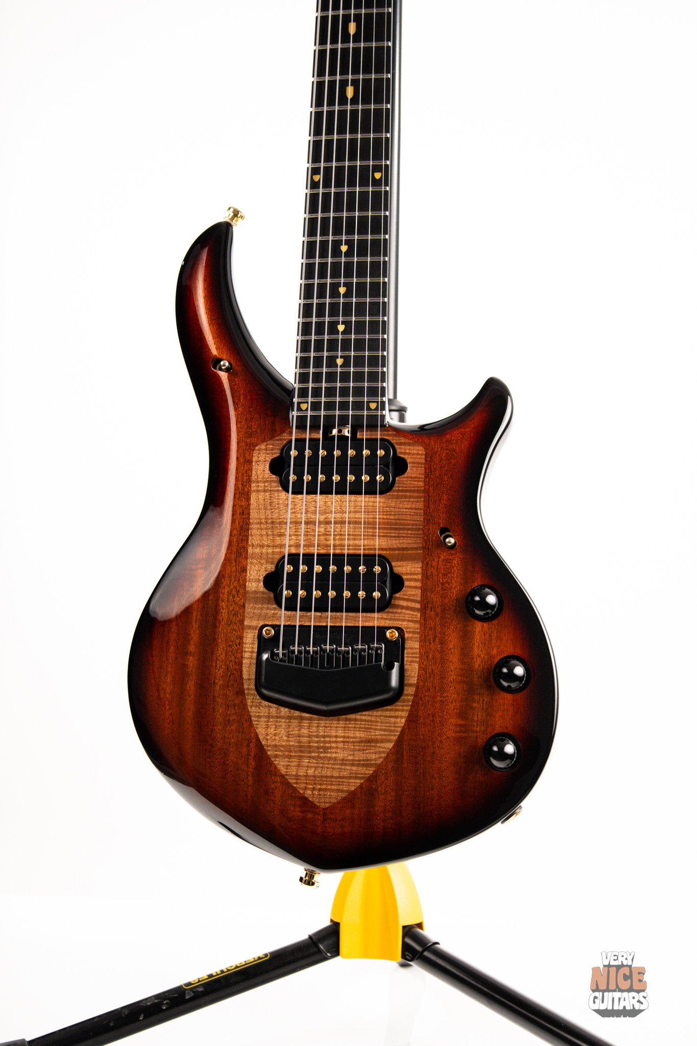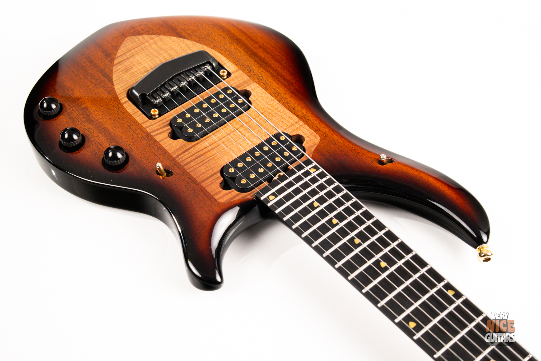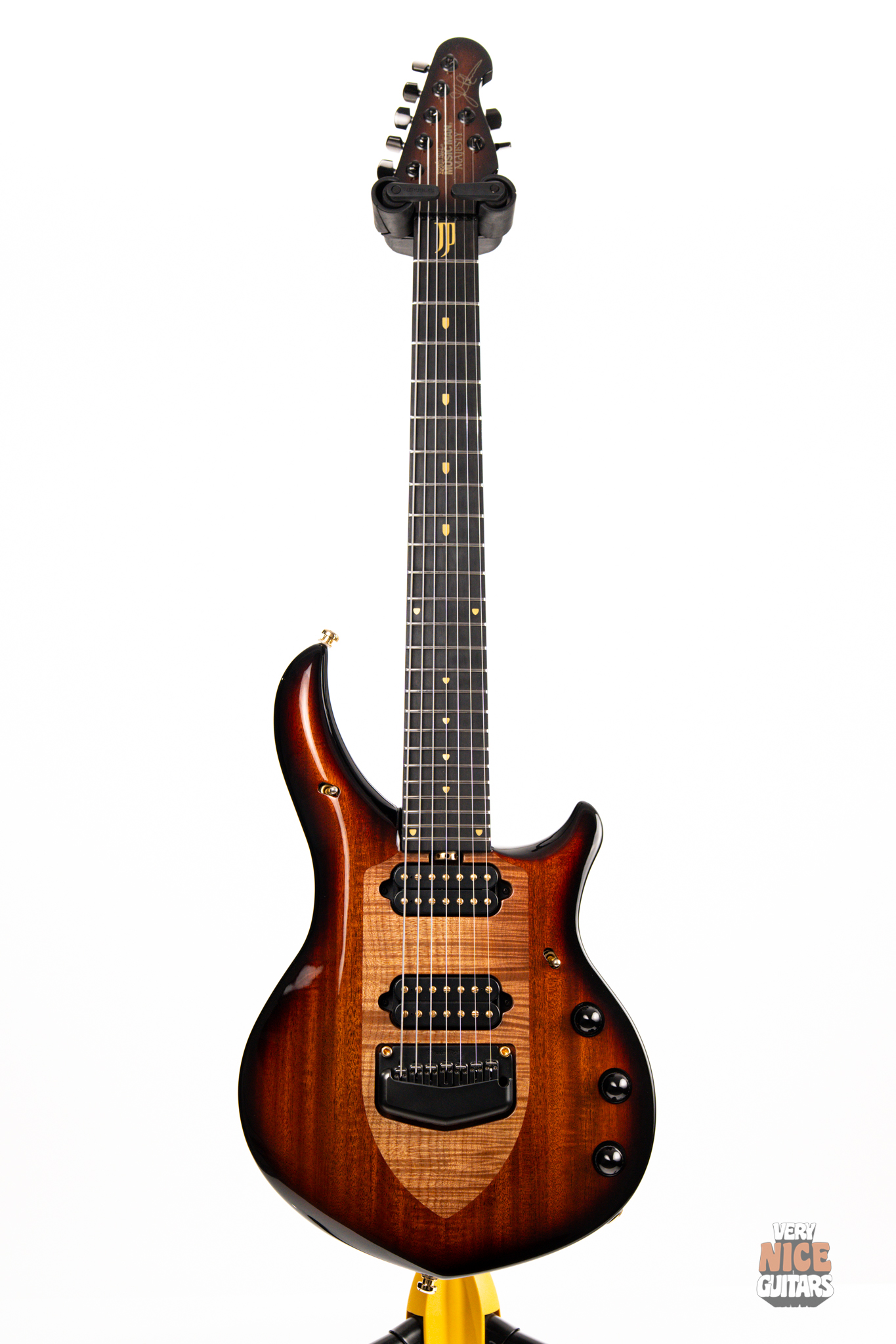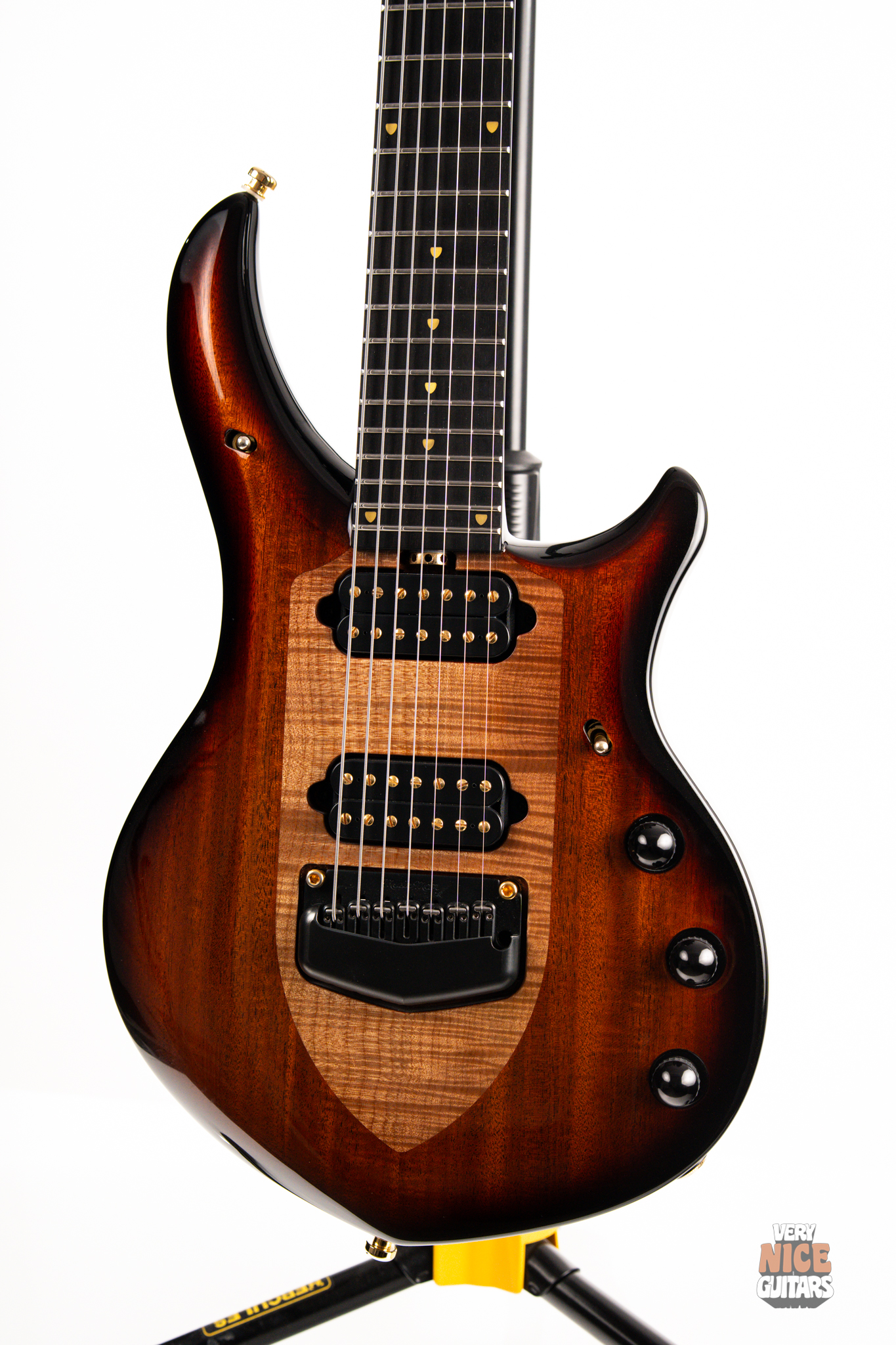 This 7 string Music Man Majesty 20th Anniversary features mahogany body, flame maple top with a through body mahogany neck and an ebony fingerboard. It’s finished in a classy looking Honey Butter Burst in high gloss. All of the 24 frets are easy to access due to the ergonomic nature of the guitar’s shape. Custom Music Man floating tremolo with Schaller locking tuners keep the tuning stability in check. John’s signature DiMarzio Dreamcatcher and Rainmaker combined with an onboard piezo pickup give you all the tonal options you might ever need.