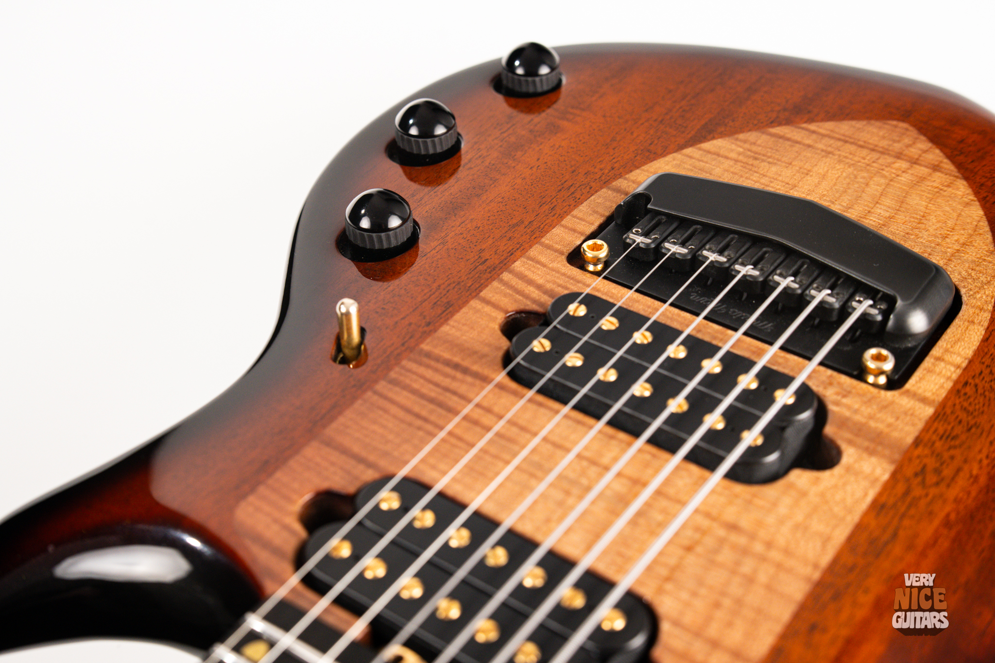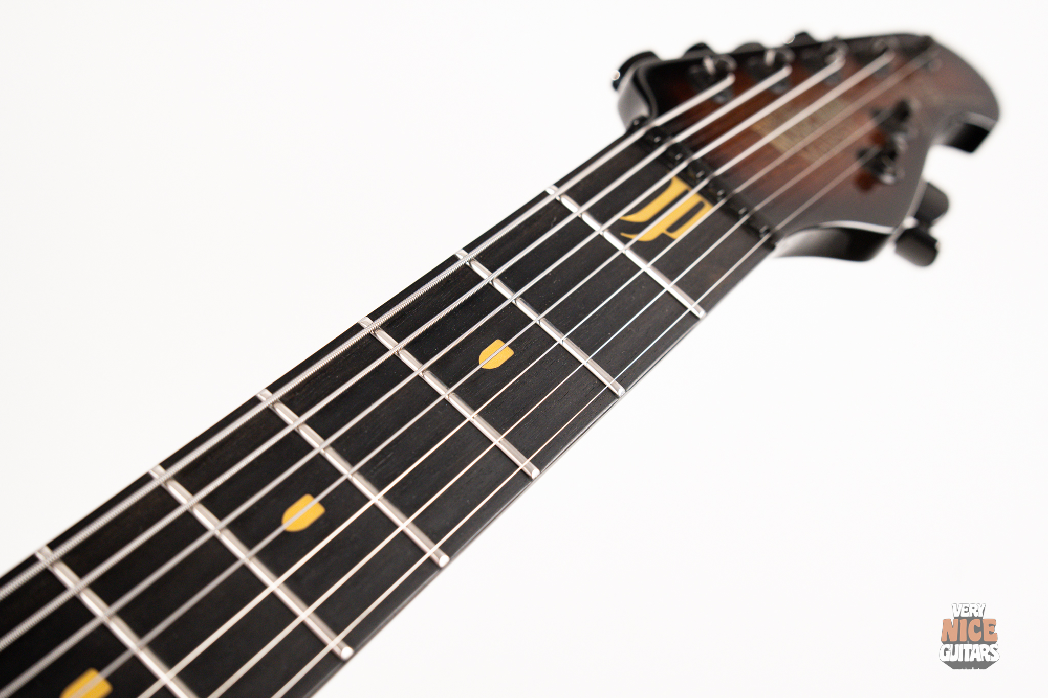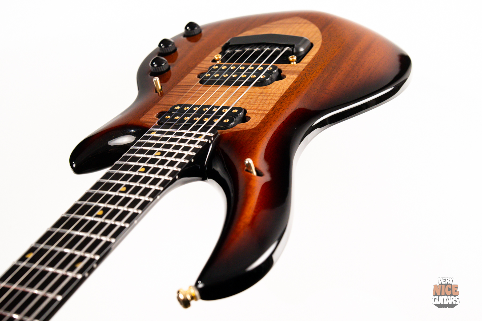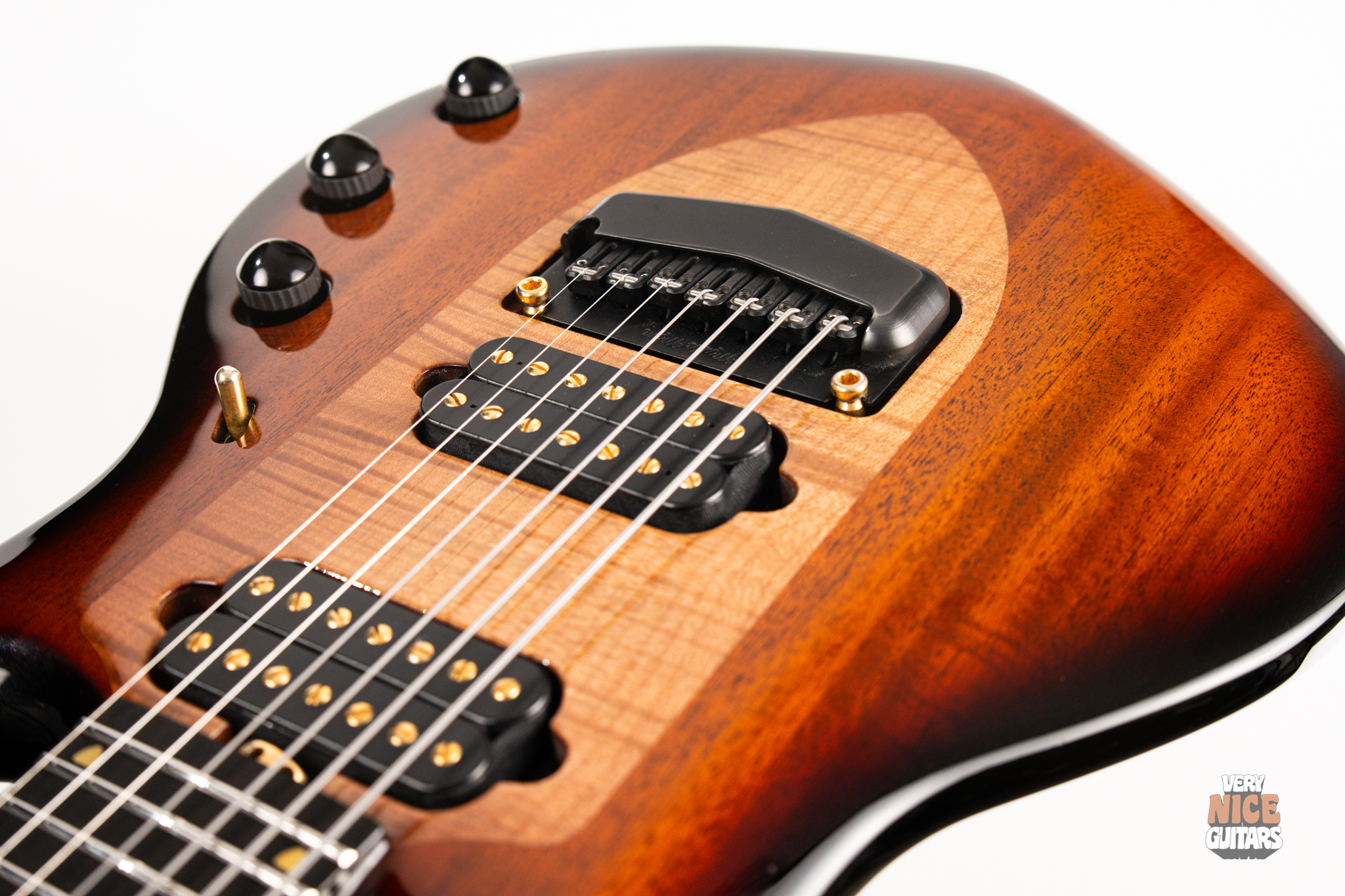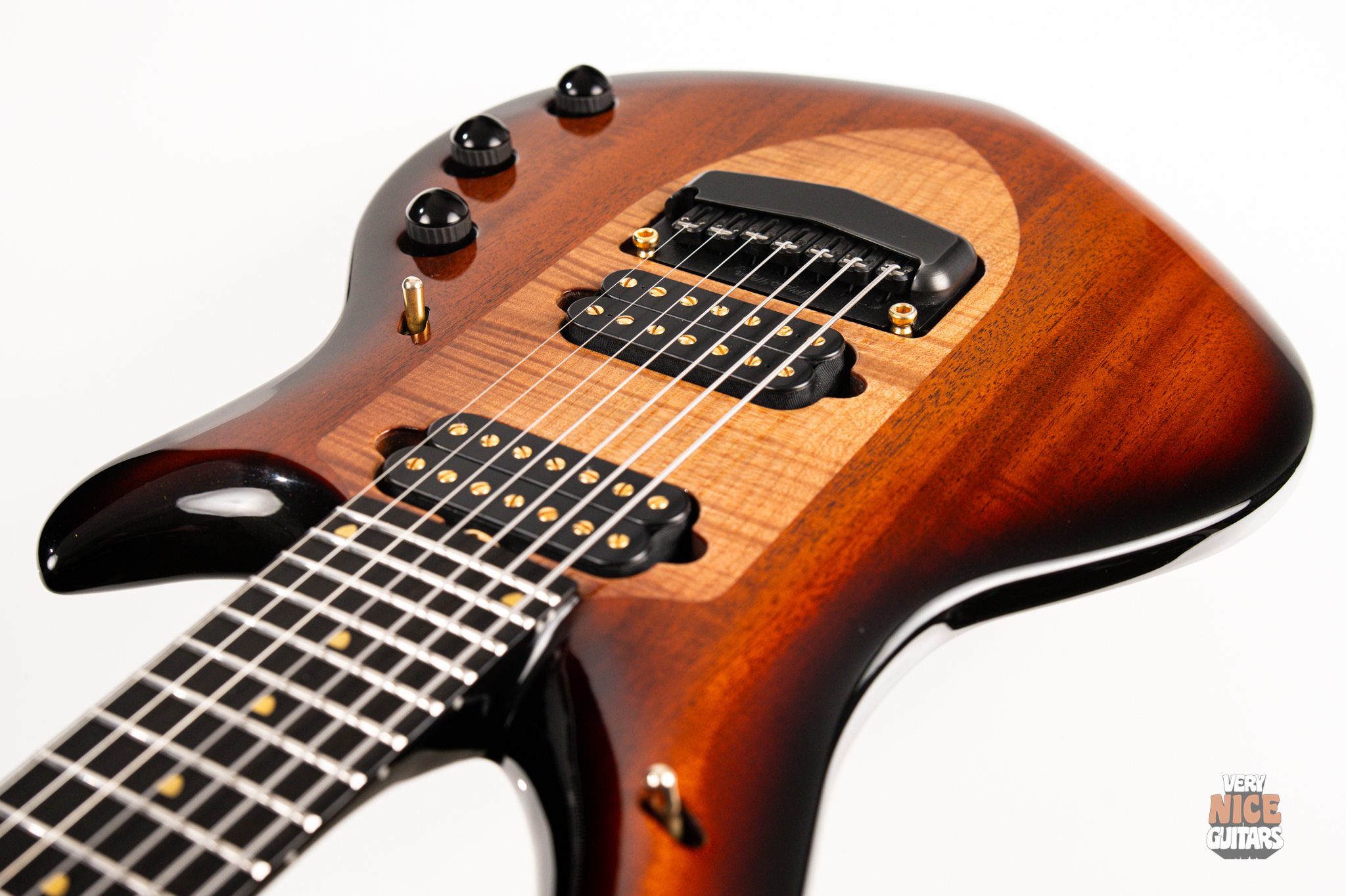 This 7 string Music Man Majesty 20th Anniversary features mahogany body, flame maple top with a through body mahogany neck and an ebony fingerboard. It’s finished in a classy looking Honey Butter Burst in high gloss. All of the 24 frets are easy to access due to the ergonomic nature of the guitar’s shape. Custom Music Man floating tremolo with Schaller locking tuners keep the tuning stability in check. John’s signature DiMarzio Dreamcatcher and Rainmaker combined with an onboard piezo pickup give you all the tonal options you might ever need.