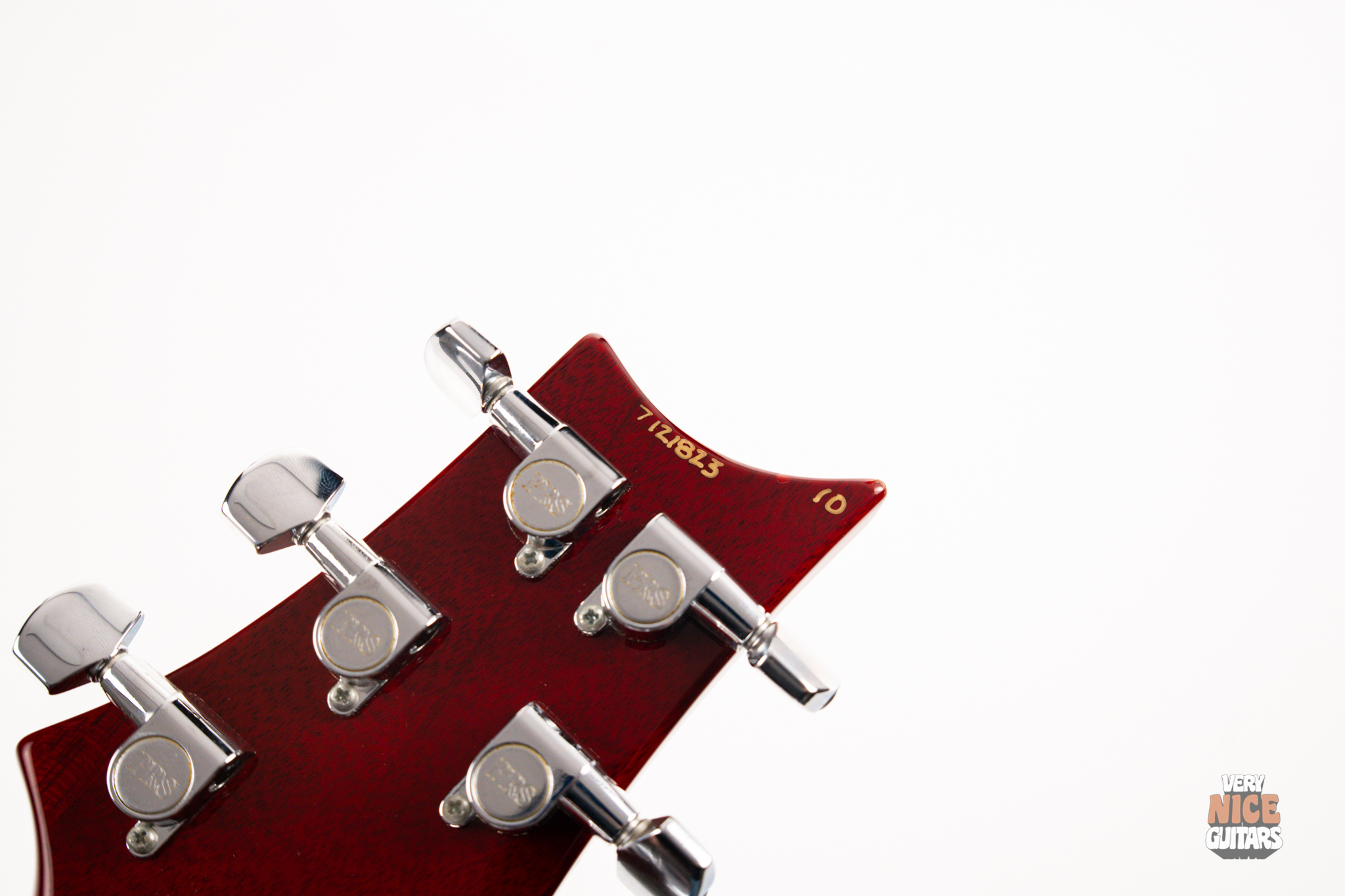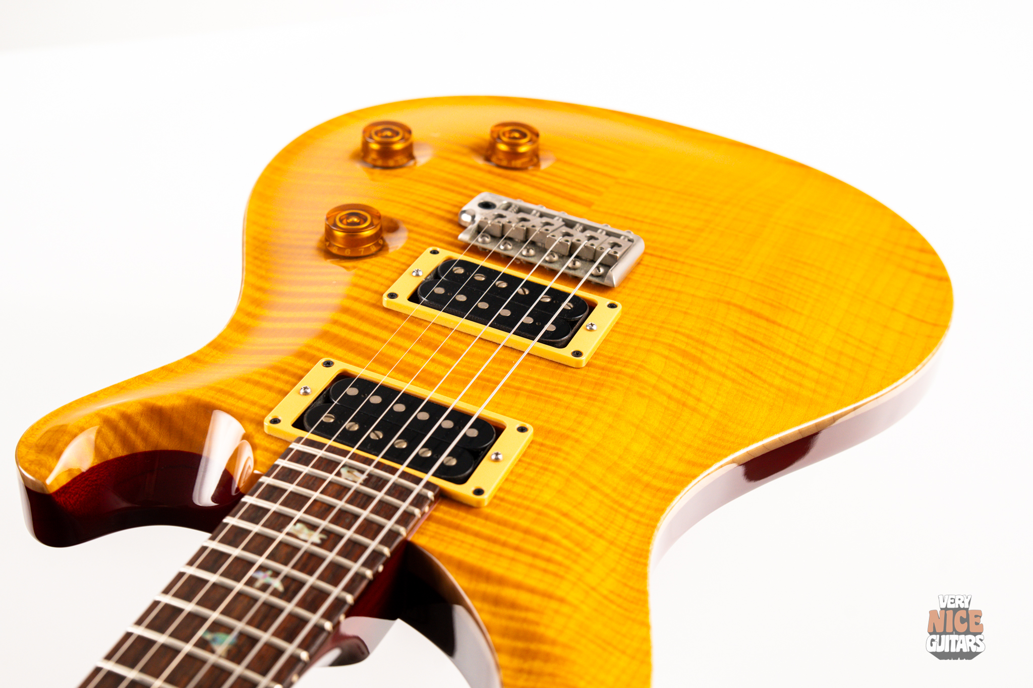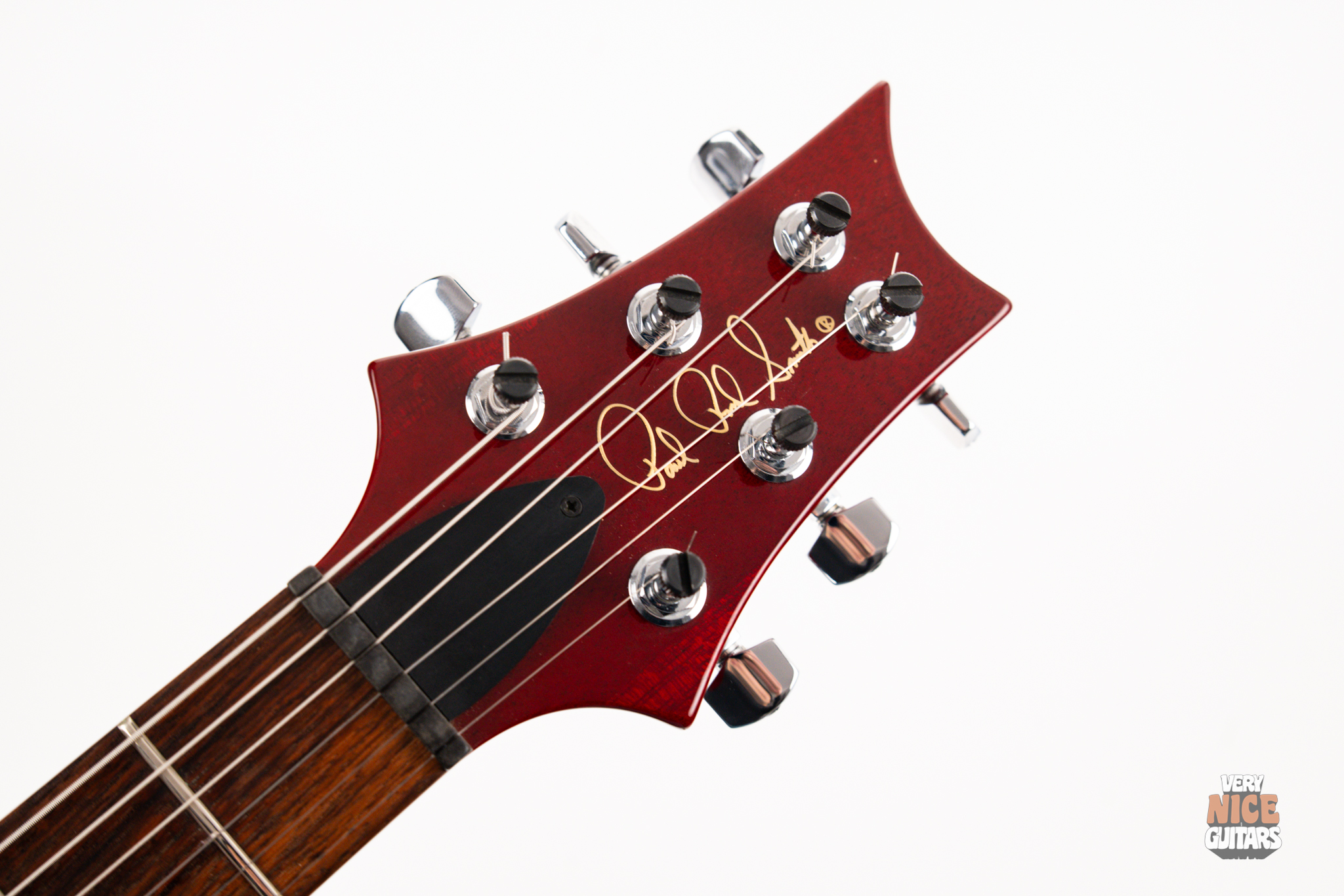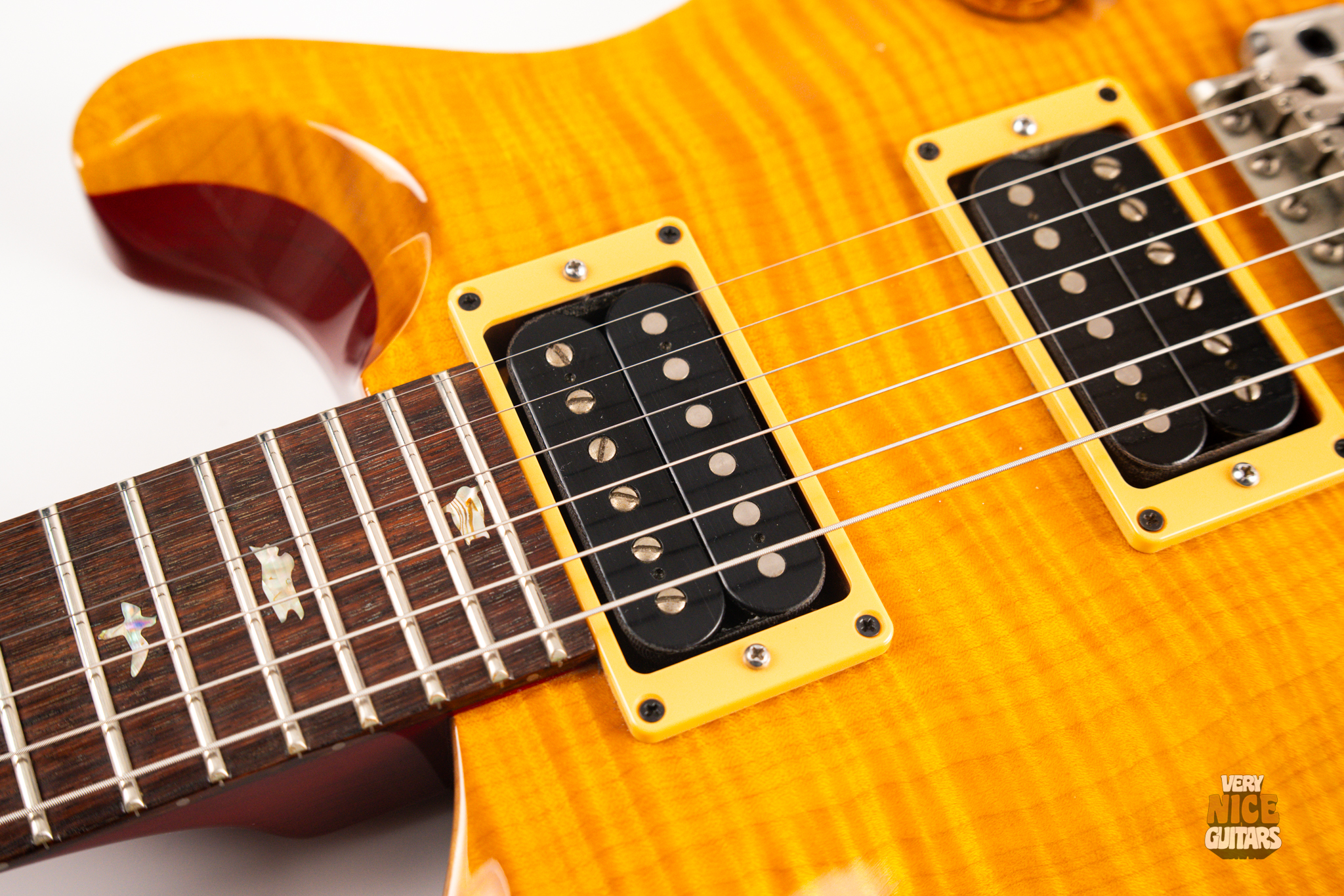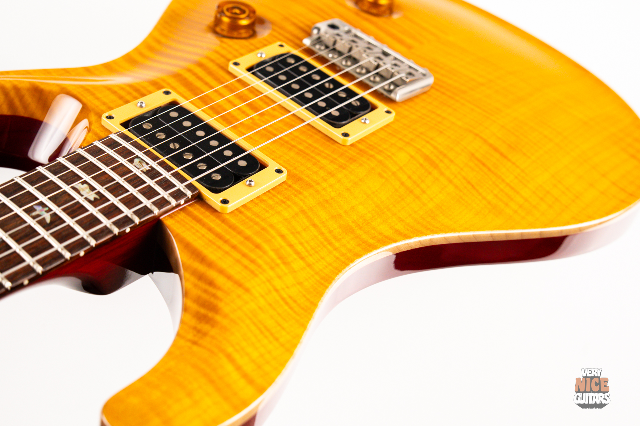 PRS guitars are well known for their build quality, superb materials (especially tops) and presence on stages all around the world. This Custom 24 features a mahogany body and neck, a controversial rotary switch, a very comfortable “Wide Thin” neck and a “10 Top” figured maple top. The top is a distinct feature here – you can see the maple grain going horizontally and vertically – please check out our photos!