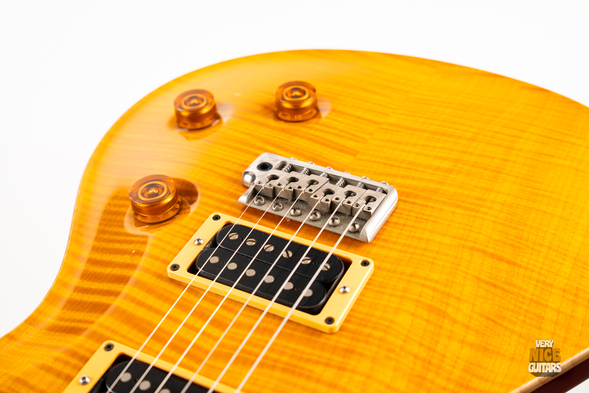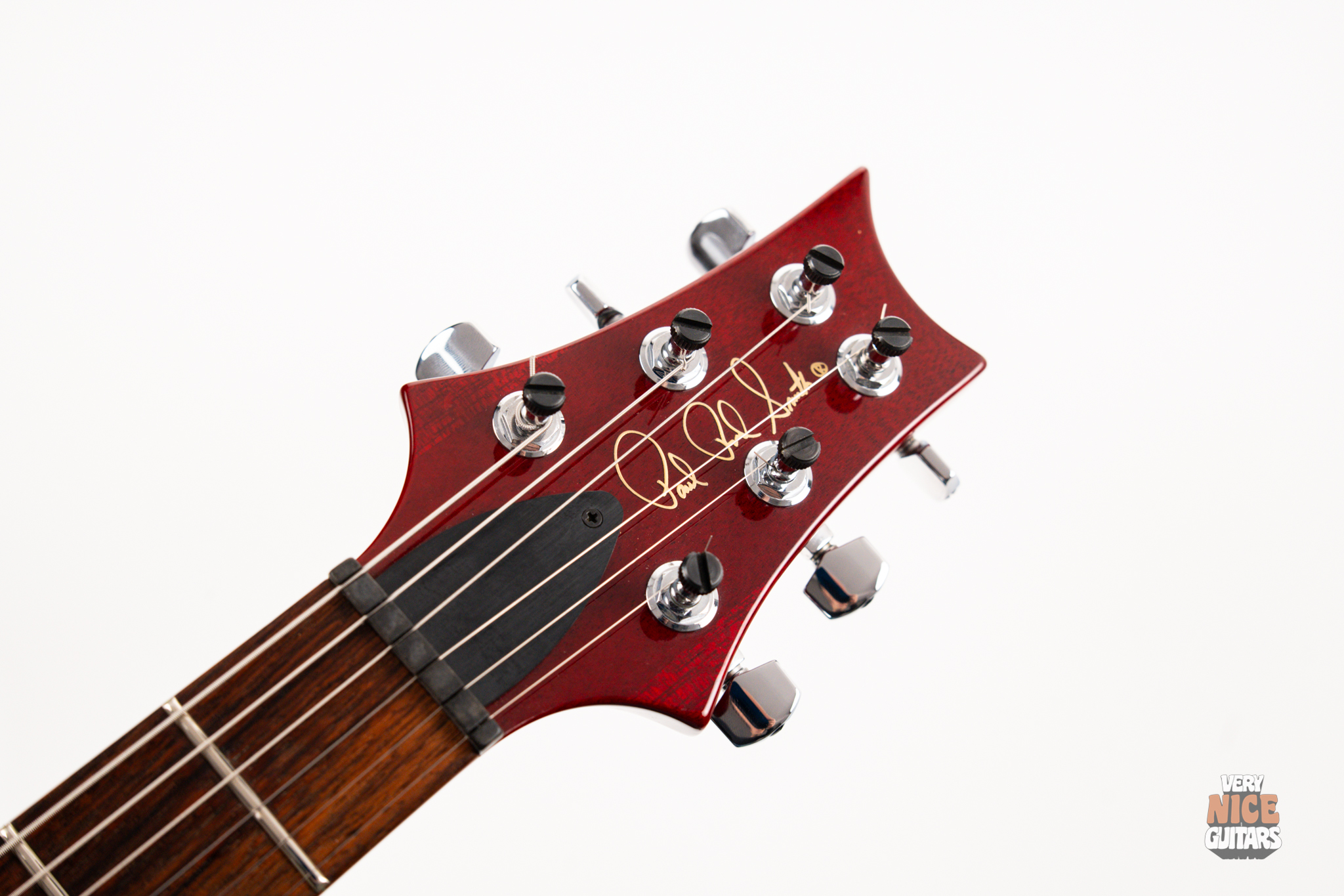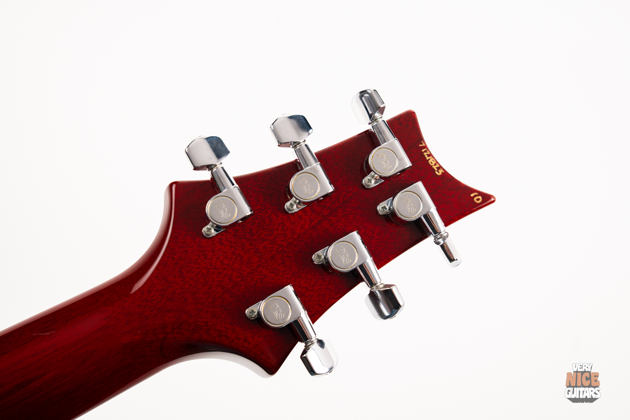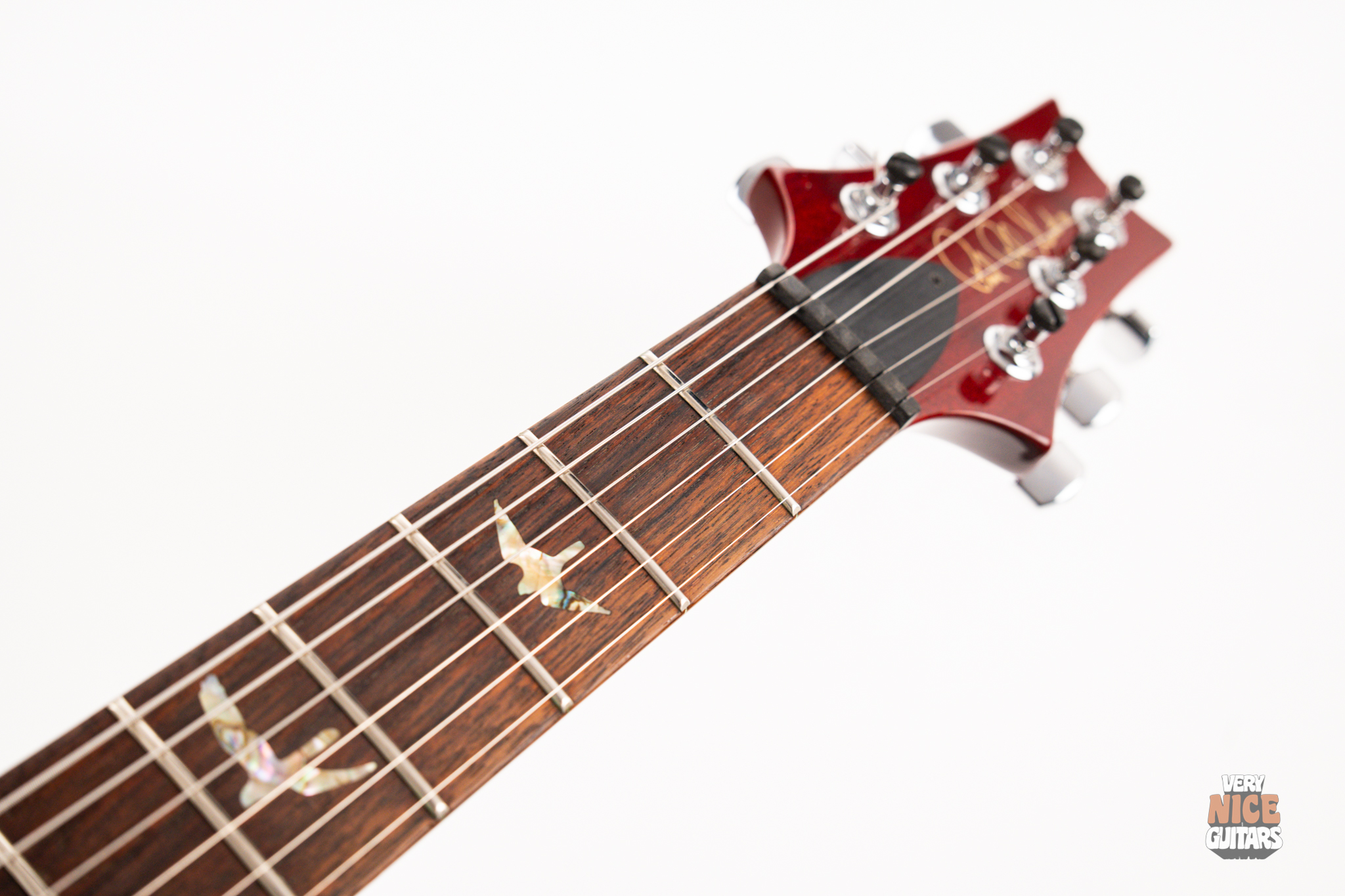 PRS guitars are well known for their build quality, superb materials (especially tops) and presence on stages all around the world. This Custom 24 features a mahogany body and neck, a controversial rotary switch, a very comfortable “Wide Thin” neck and a “10 Top” figured maple top. The top is a distinct feature here – you can see the maple grain going horizontally and vertically – please check out our photos!