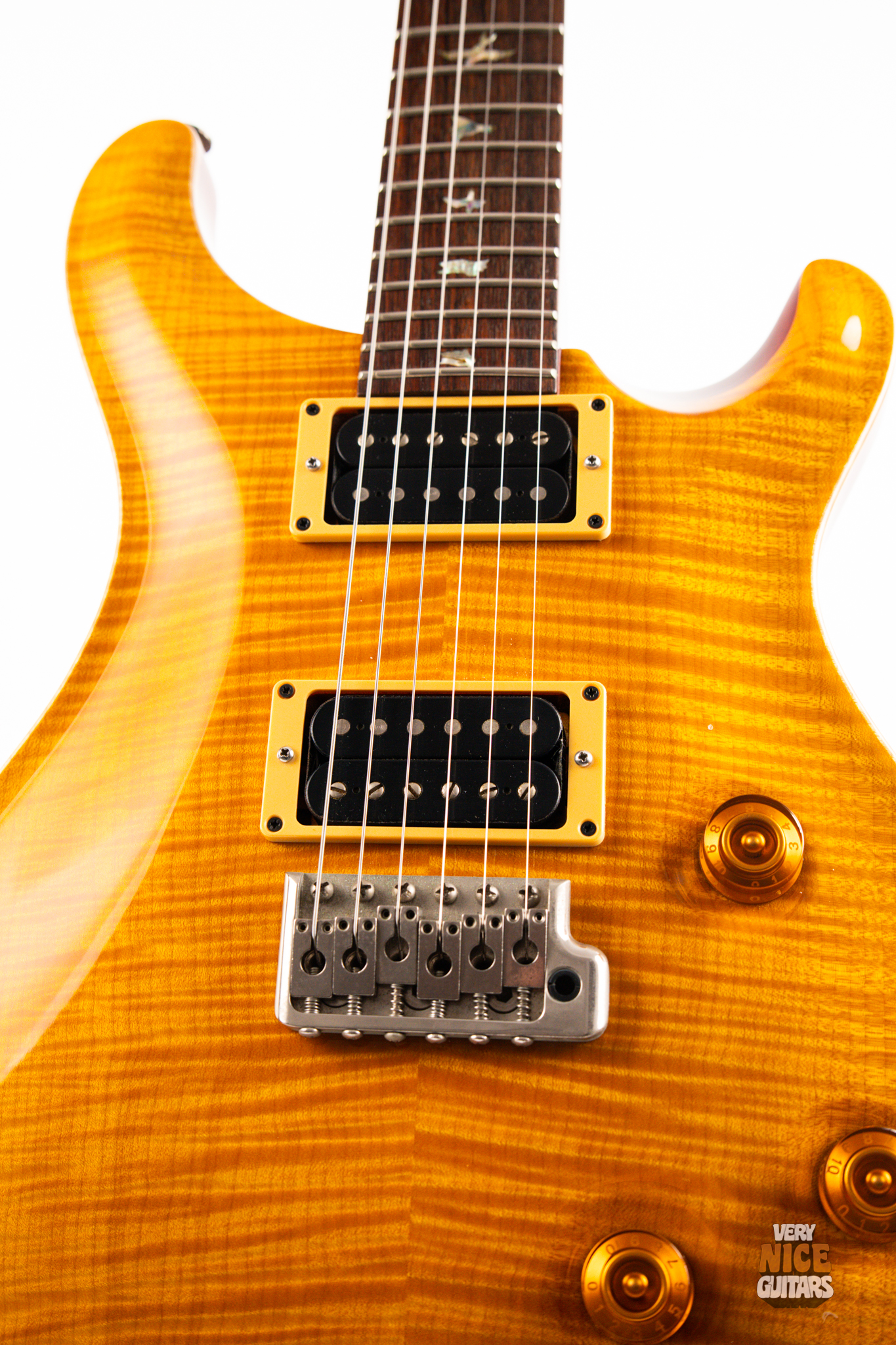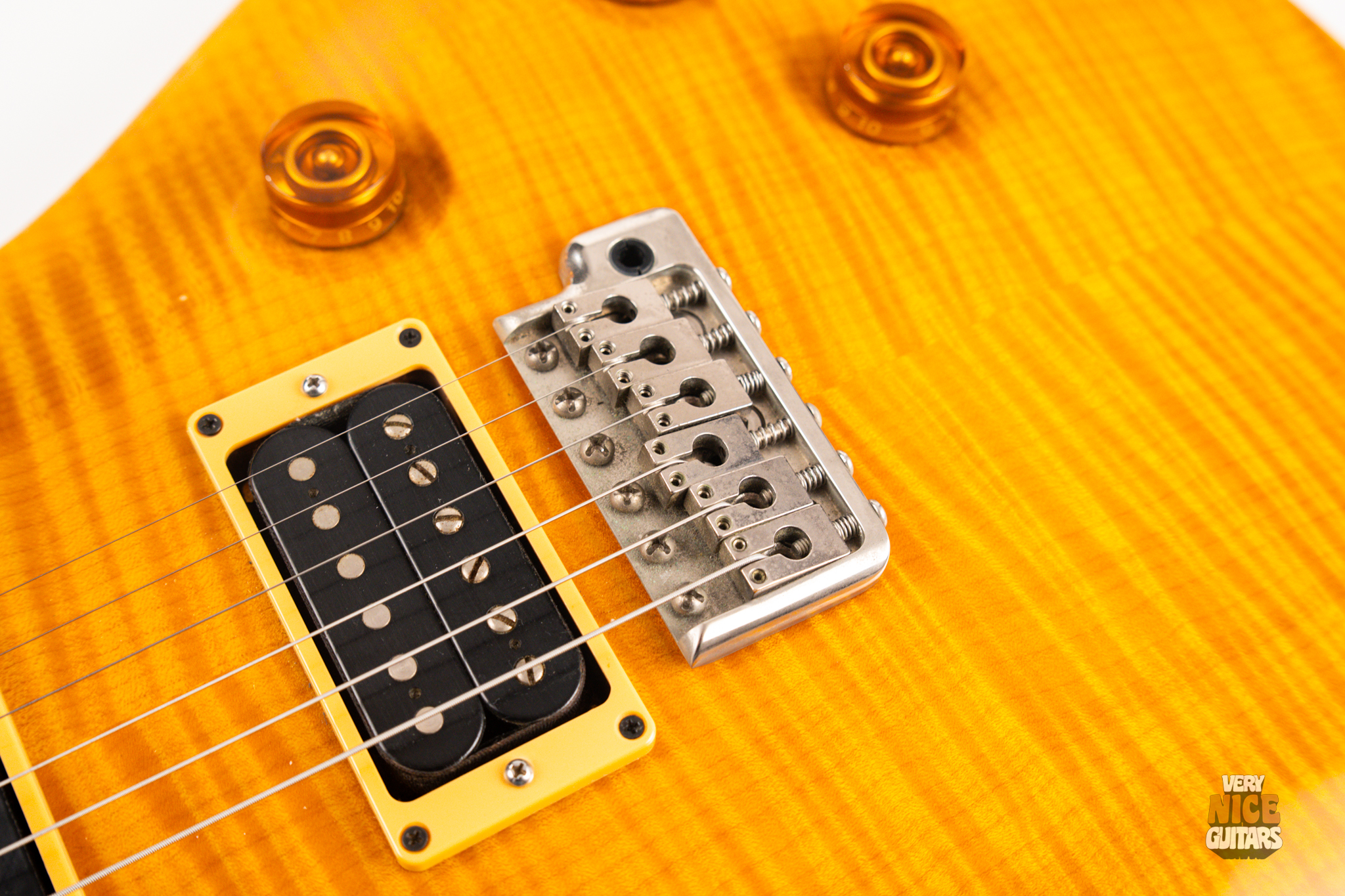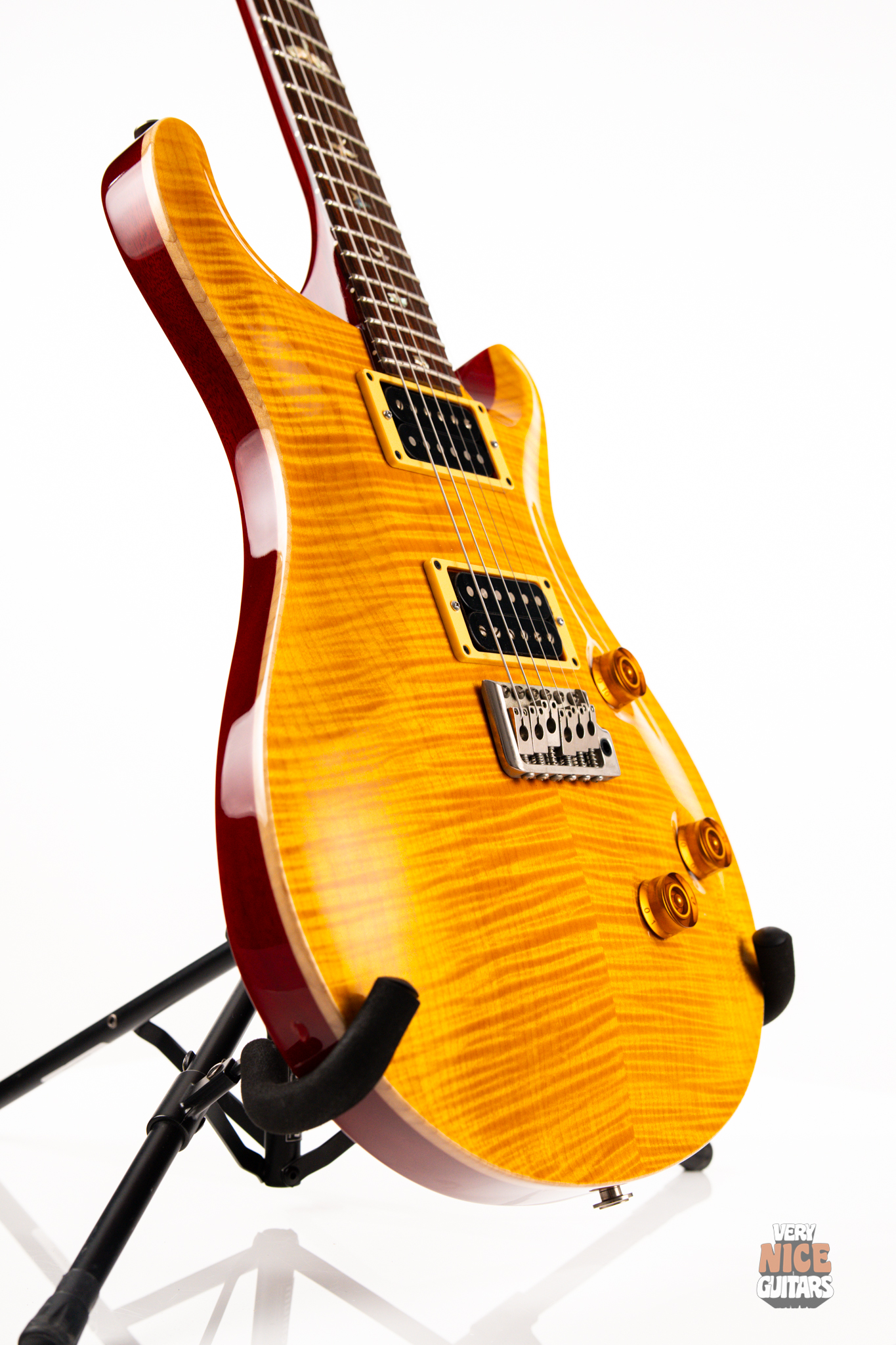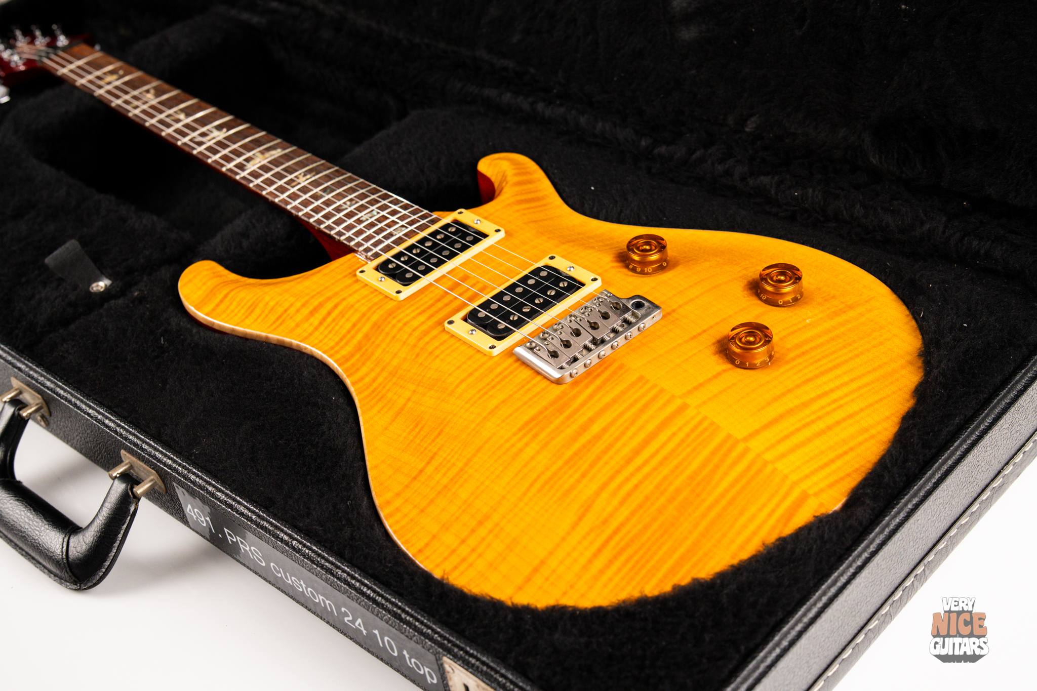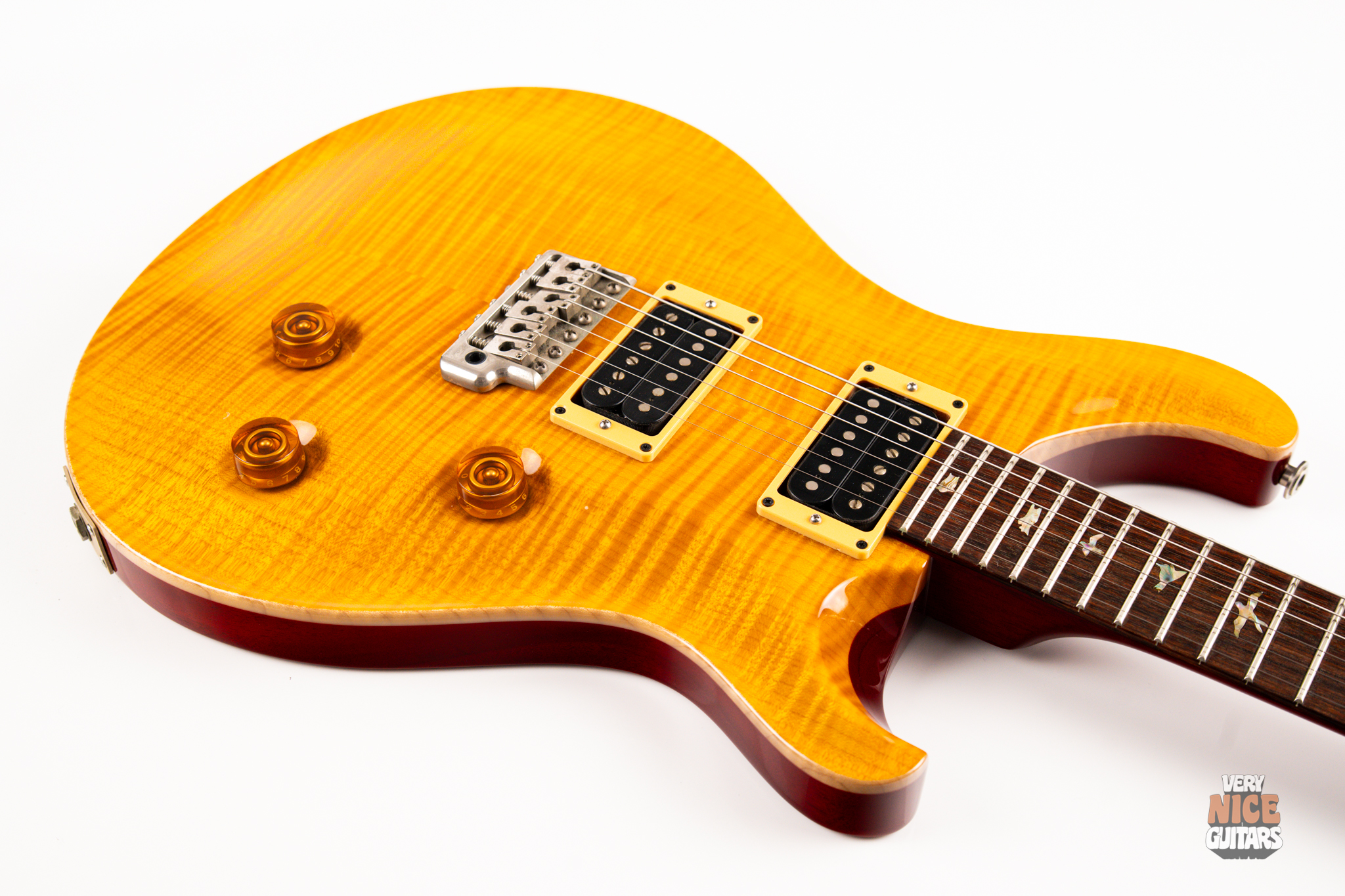 PRS guitars are well known for their build quality, superb materials (especially tops) and presence on stages all around the world. This Custom 24 features a mahogany body and neck, a controversial rotary switch, a very comfortable “Wide Thin” neck and a “10 Top” figured maple top. The top is a distinct feature here – you can see the maple grain going horizontally and vertically – please check out our photos!