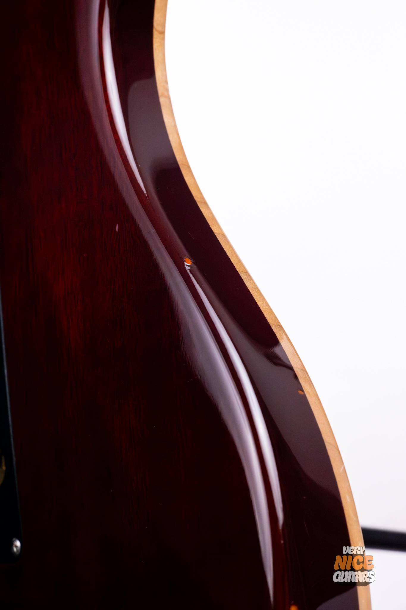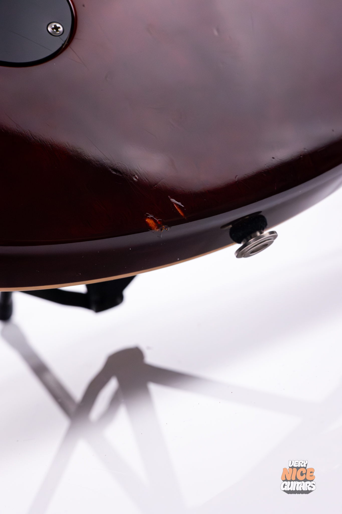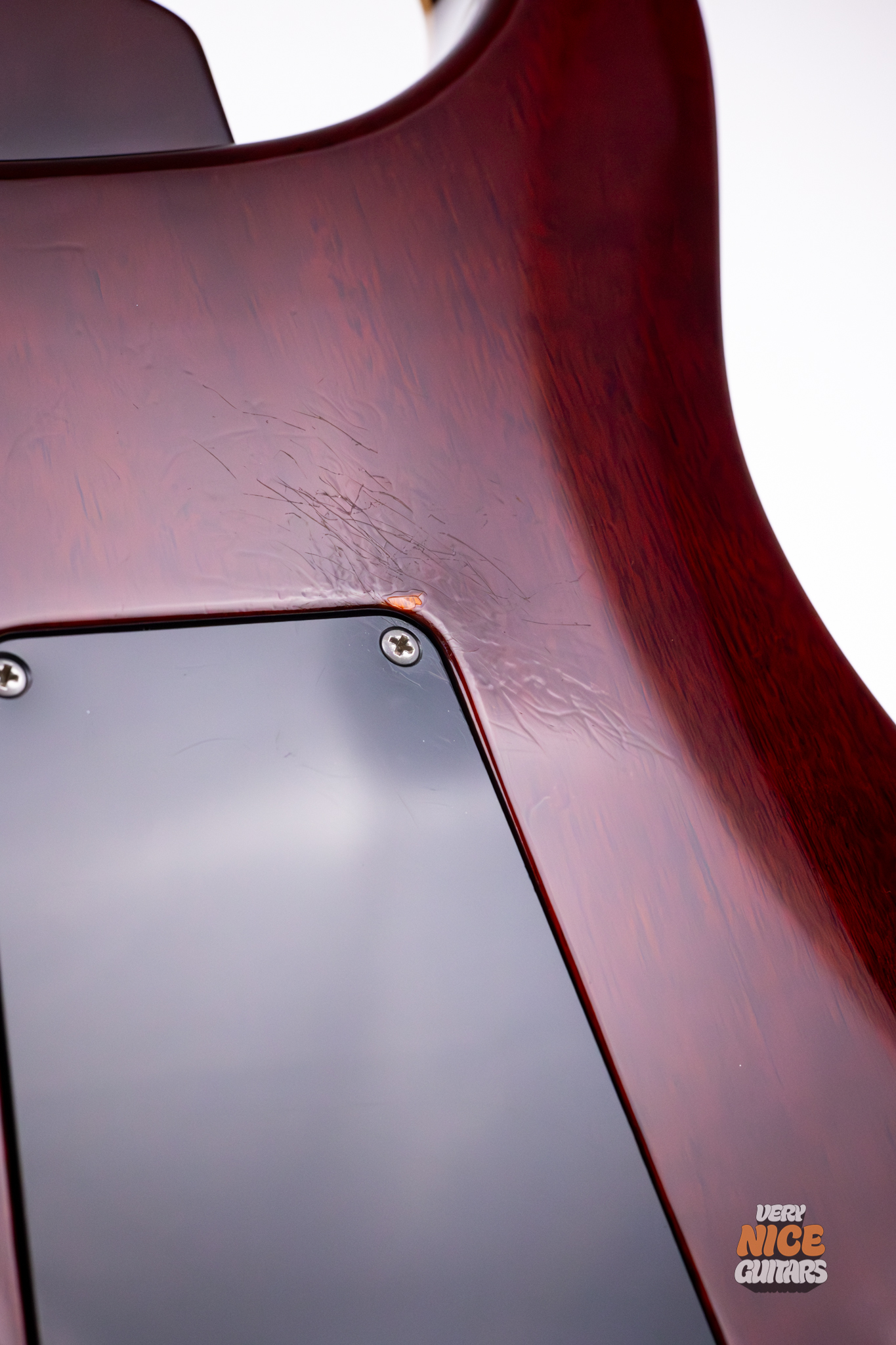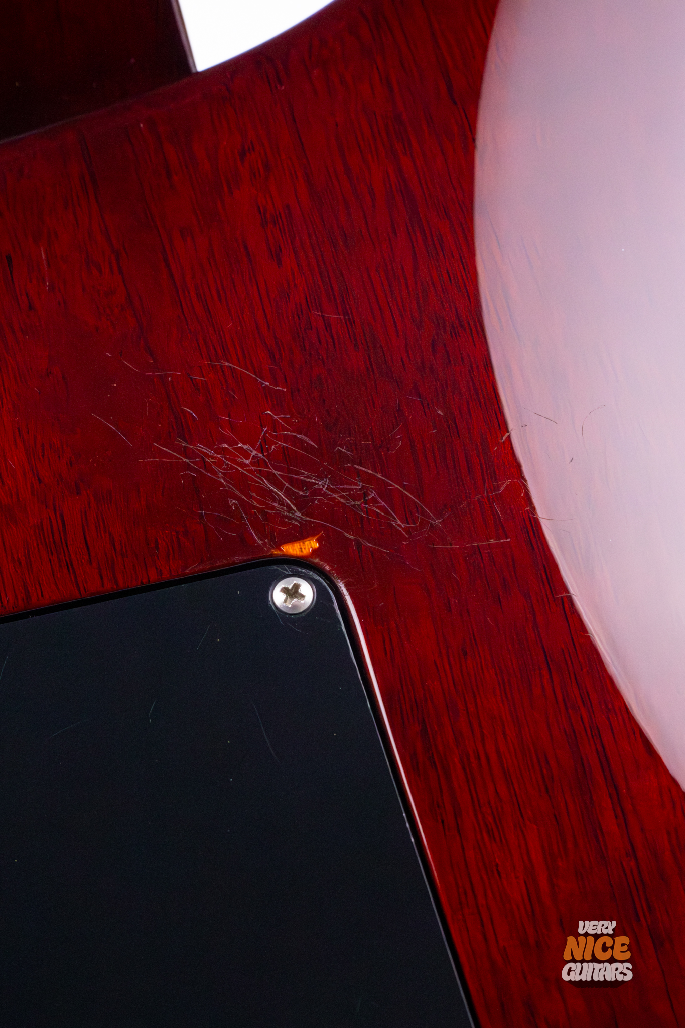 The guitar is in fair condition. The top has a couple tiny dents, which are hardly visible in most lighting situations; the back (besides one spot which has buckle rash) and sides have similar marks, some of which seem to have been covered over with lacquer to prevent further cracking. There are some faint signs of oxidation on the pickup covers. The neck is spotless, and the headstock is almost perfect, save for one small spot on the top of the headstock horn and a few micro indentations on the face of the headstock.